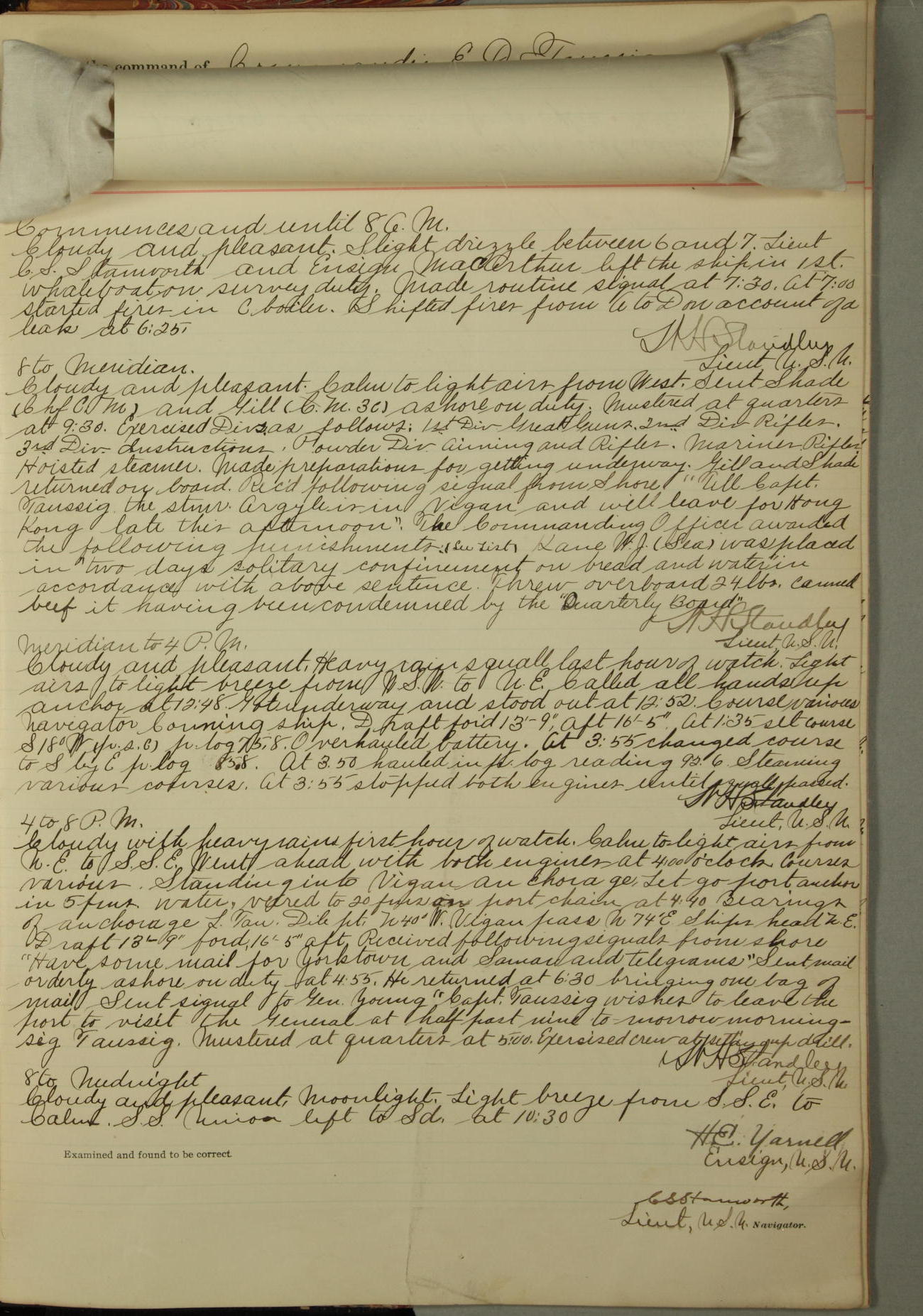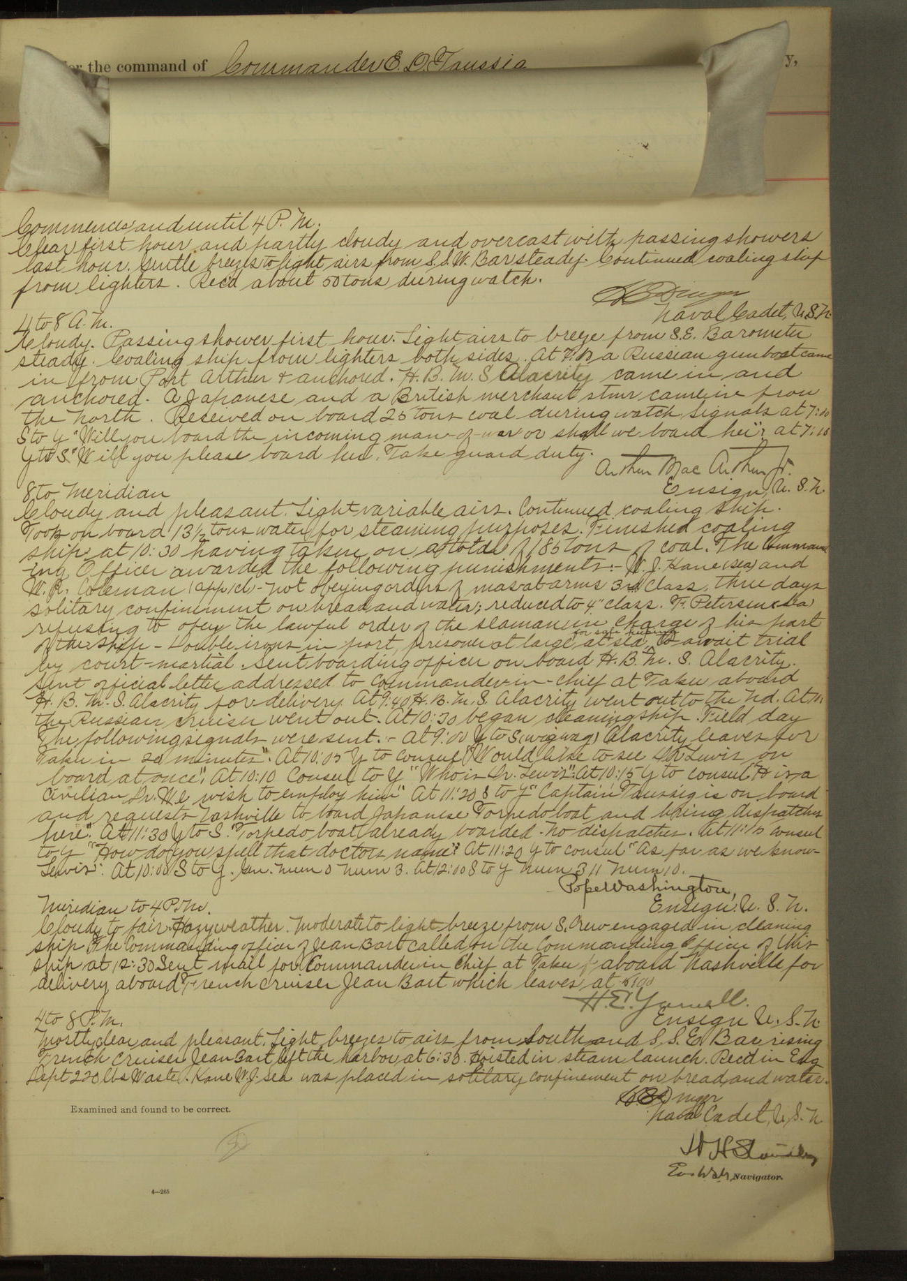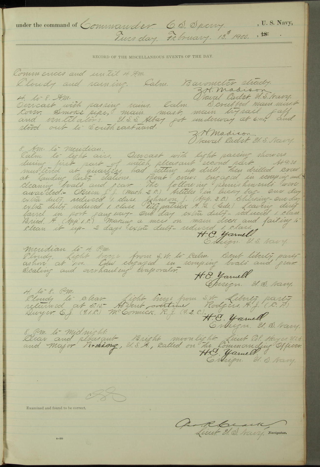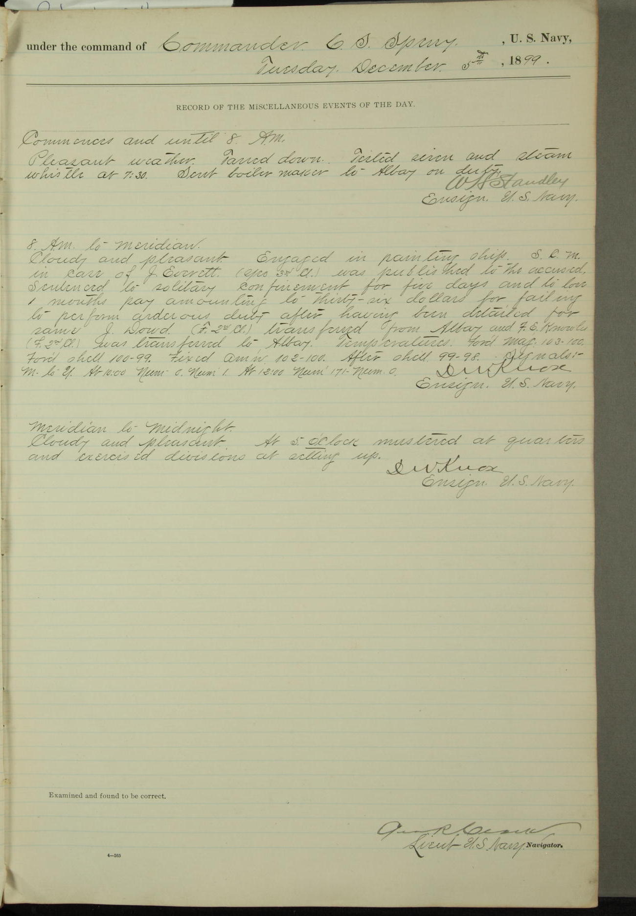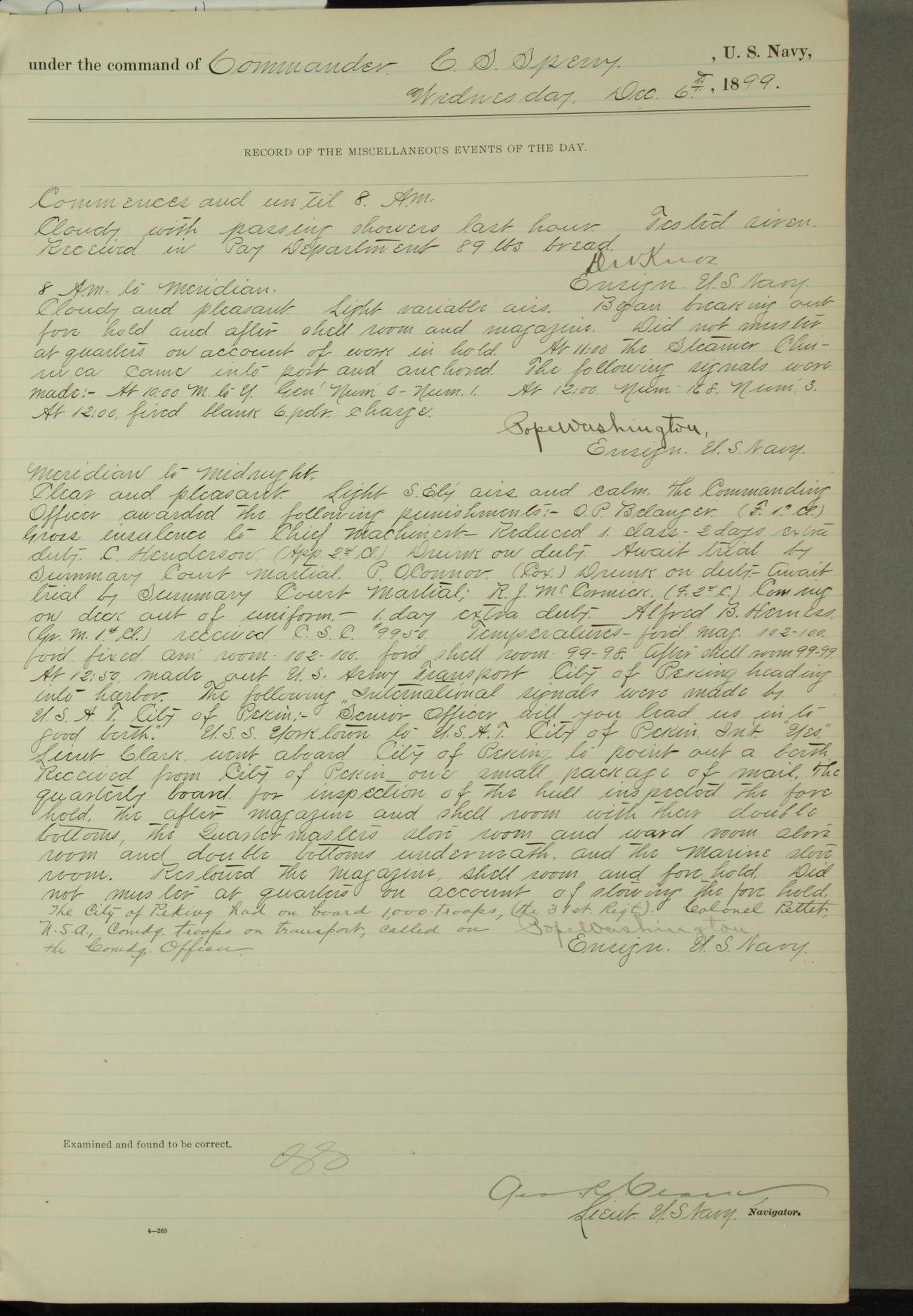 Commanding Officer awarded the following punishments: P.M. Anderson, Coal Passer, reduced to 2nd [conduct] class, for ½ hour over time; A. Kelly, Coxswain, 4th [conduct] class and 2 days' extra duty, for 12 hours over time and tight; H. Milan, Machinist First-class, 3rd [conduct] class and 1 day's extra duty, for 3 hours over time and drunk.