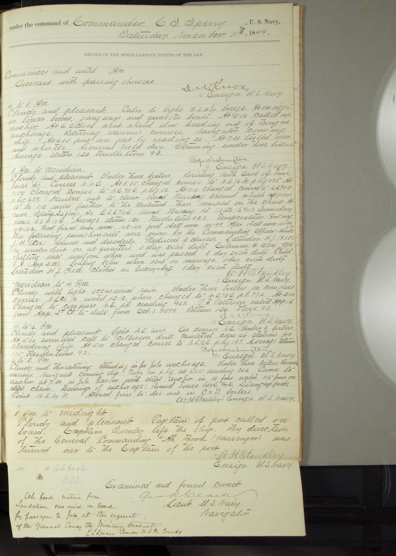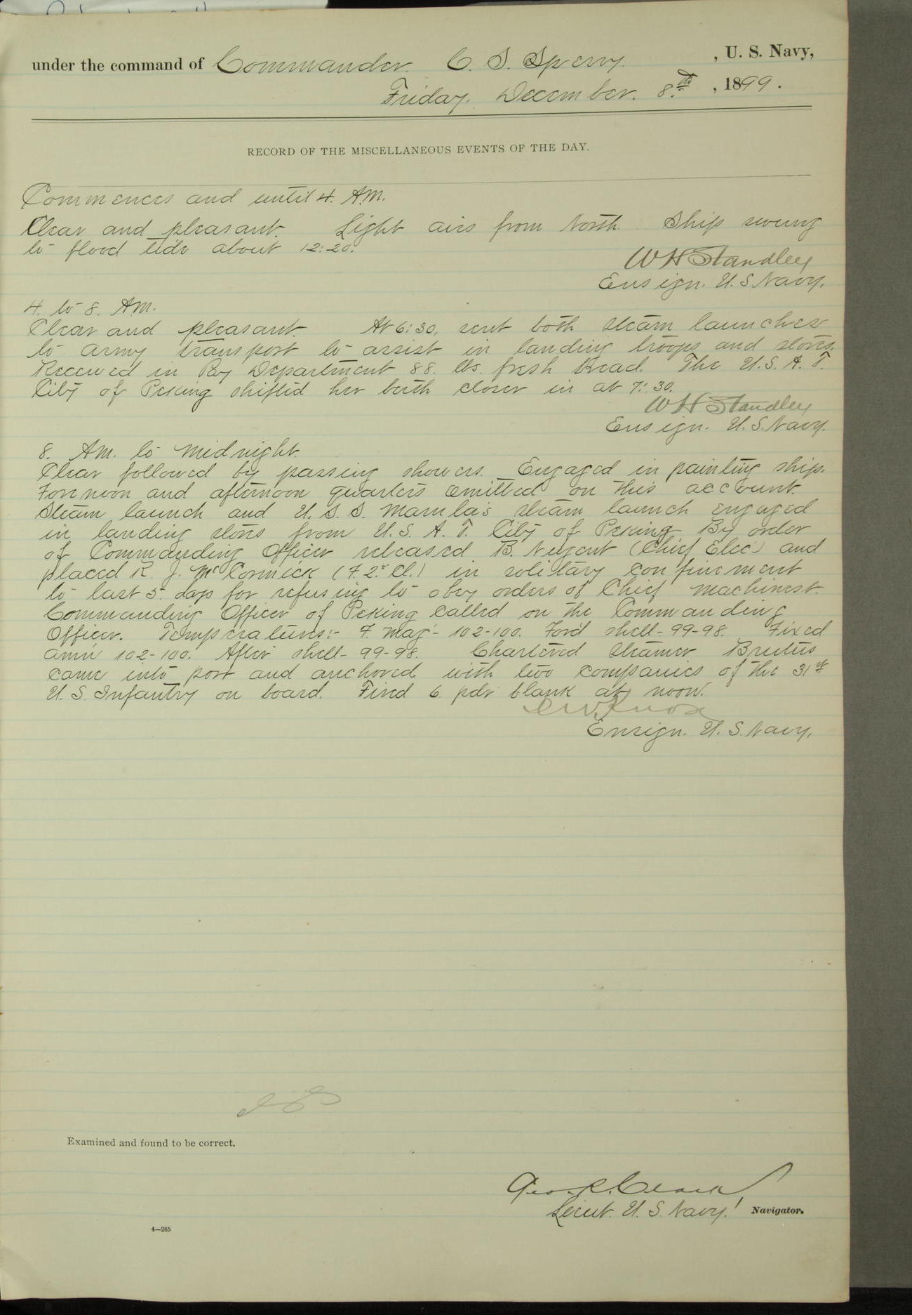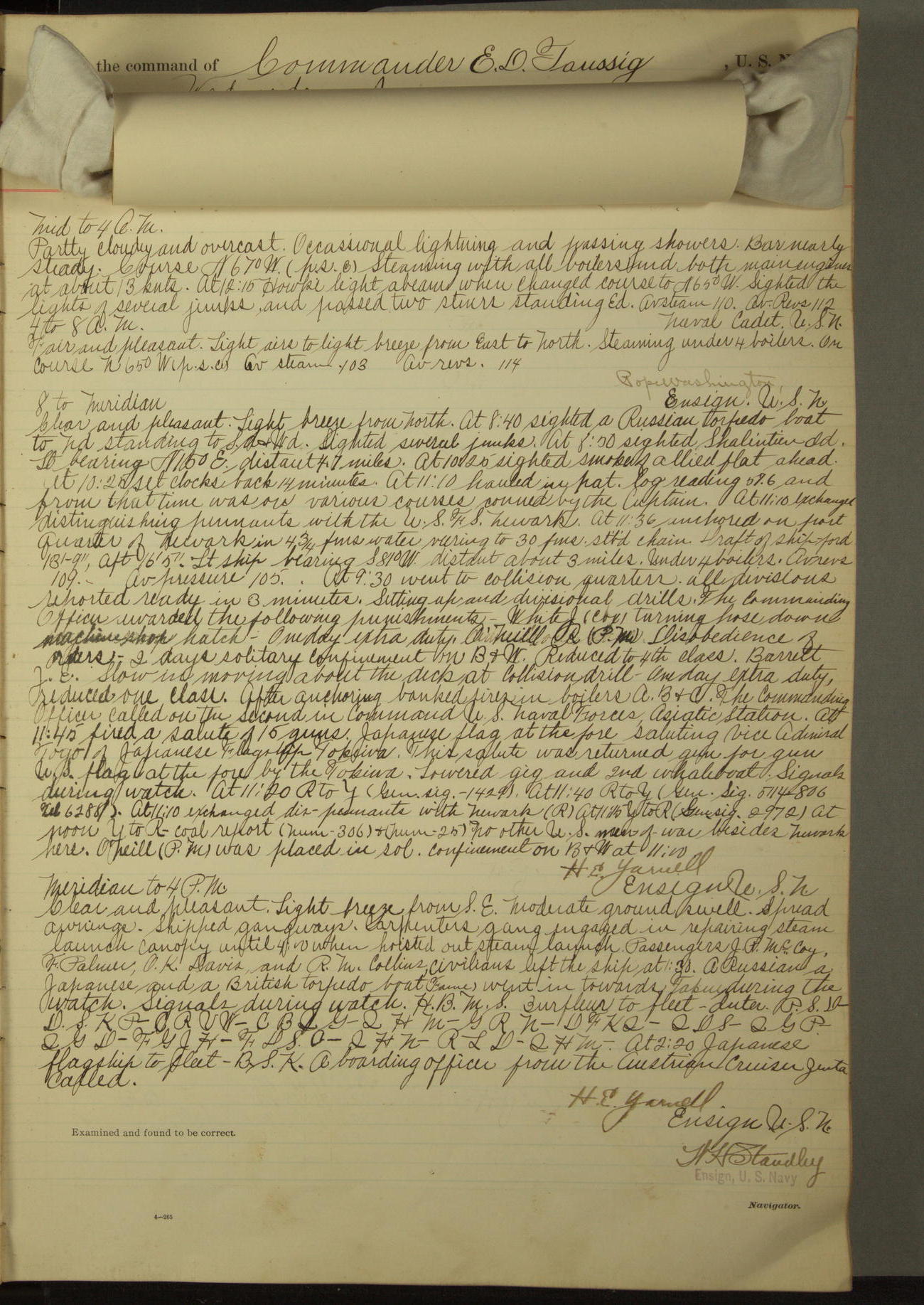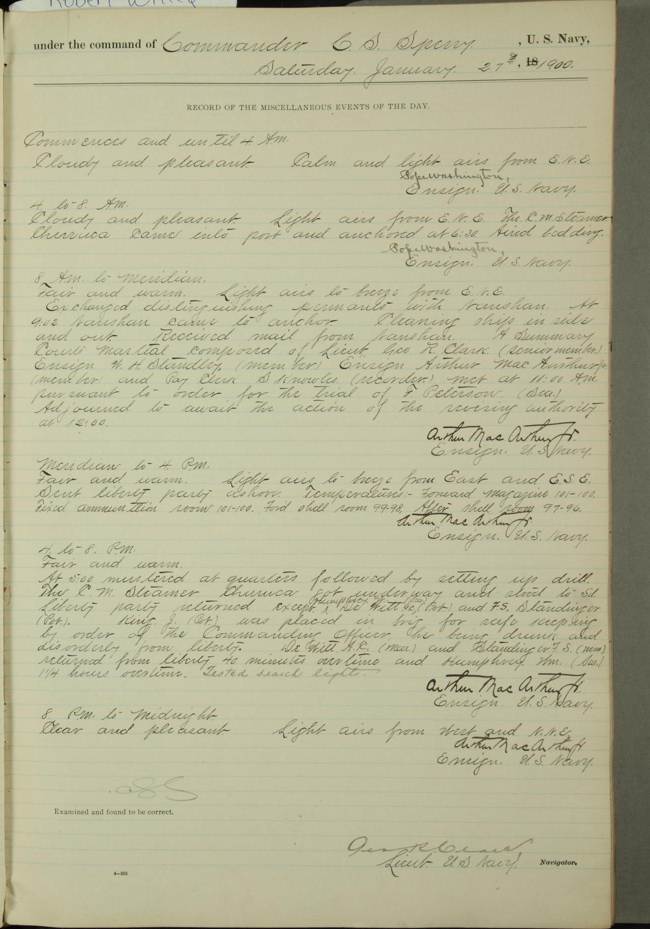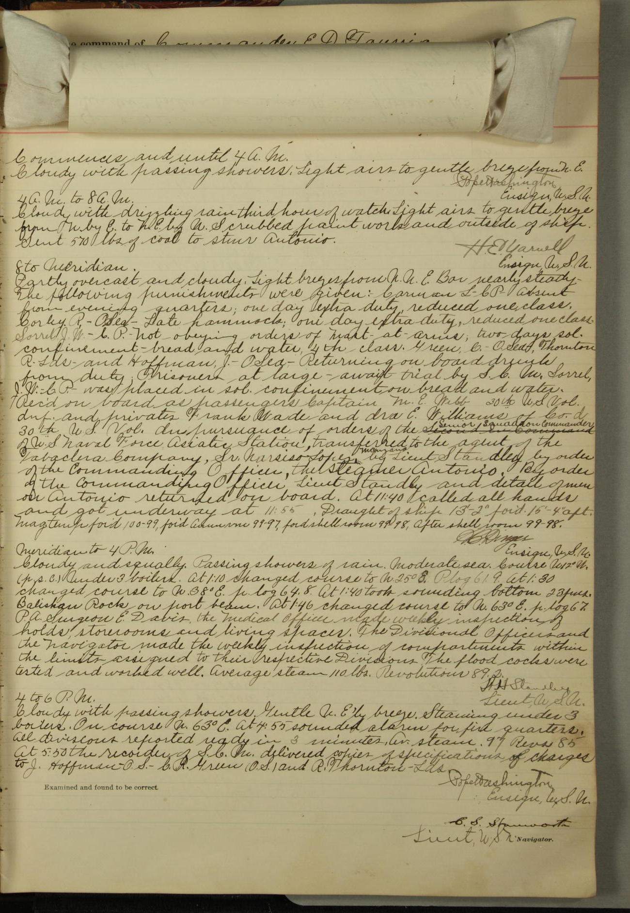 Commanding Officer awarded the following punishments: P.M. Anderson, Coal Passer, reduced to 2nd [conduct] class, for ½ hour over time; A. Kelly, Coxswain, 4th [conduct] class and 2 days' extra duty, for 12 hours over time and tight; H. Milan, Machinist First-class, 3rd [conduct] class and 1 day's extra duty, for 3 hours over time and drunk.