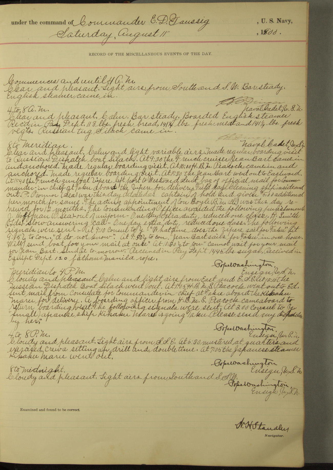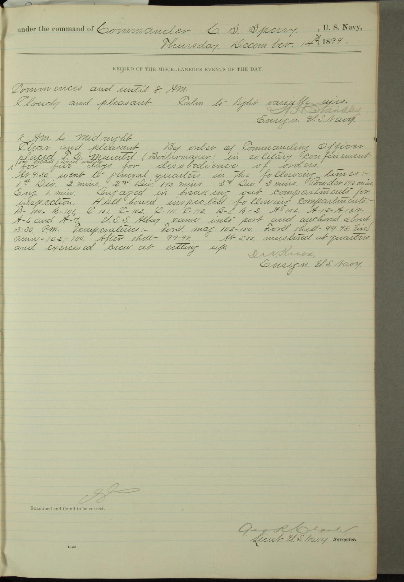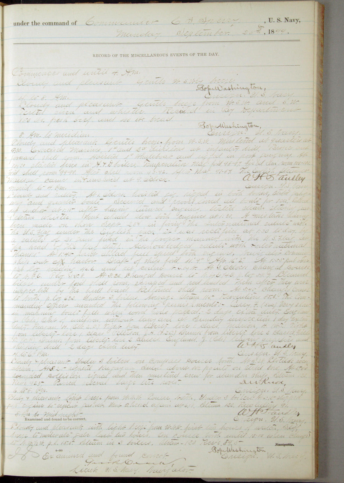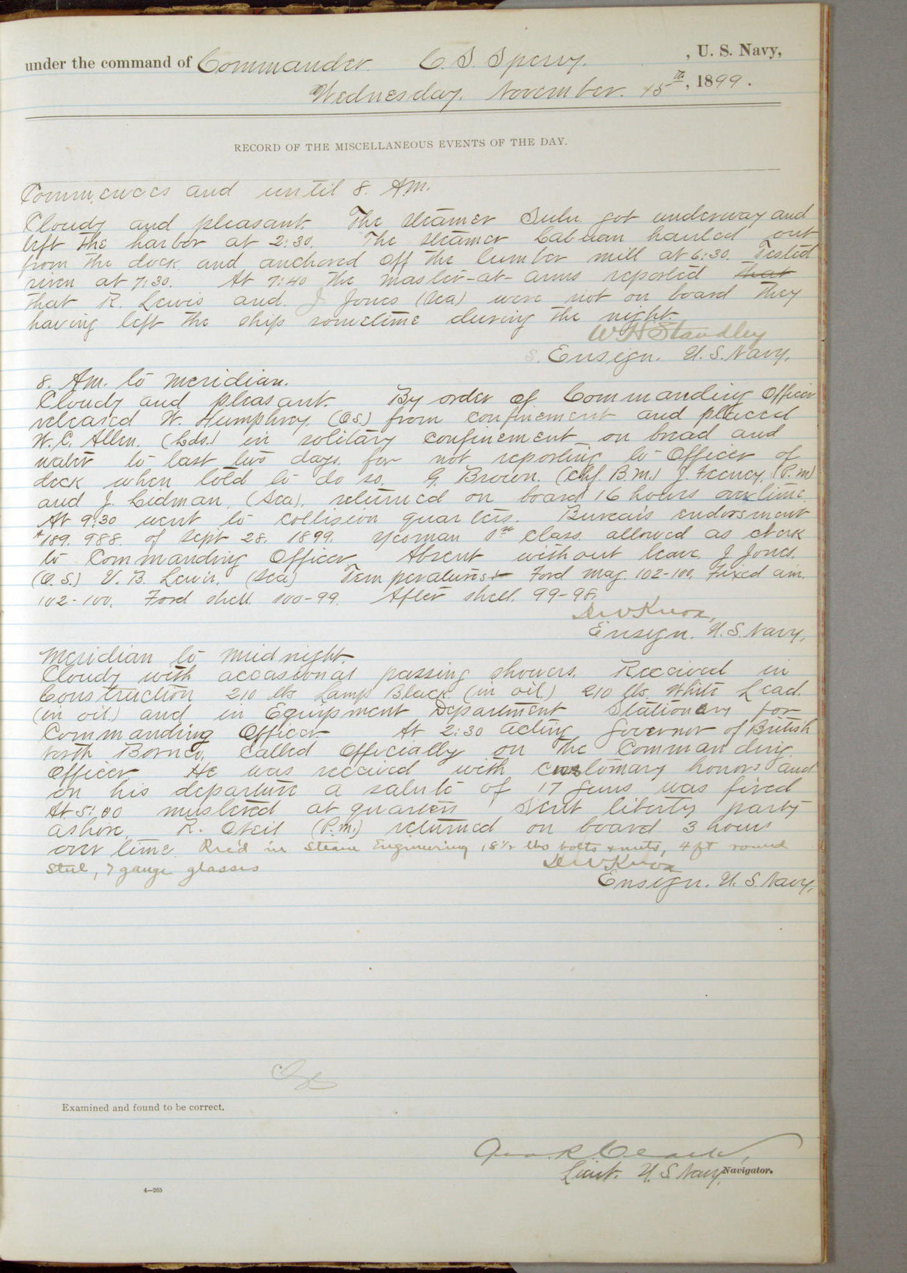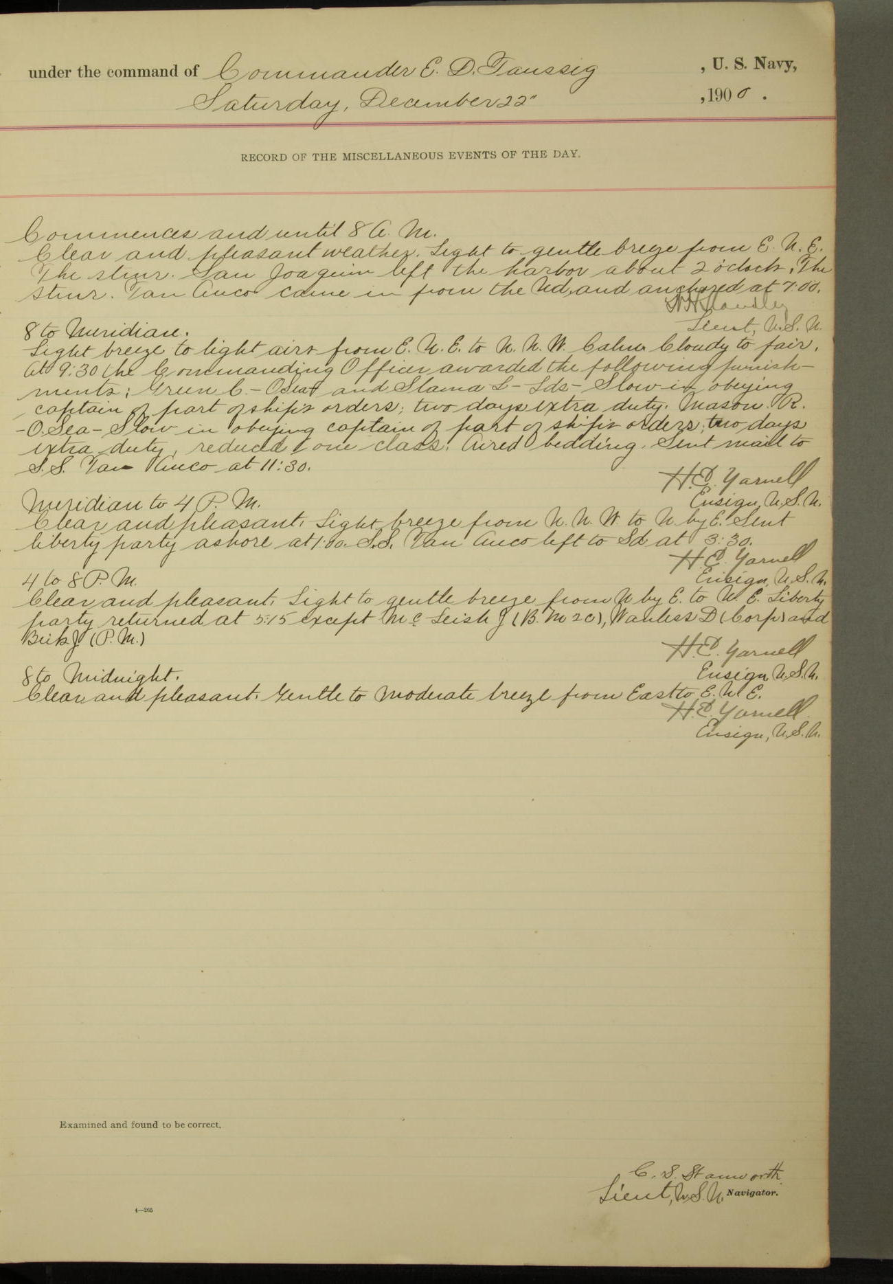 Commanding Officer awarded the following punishments: P.M. Anderson, Coal Passer, reduced to 2nd [conduct] class, for ½ hour over time; A. Kelly, Coxswain, 4th [conduct] class and 2 days' extra duty, for 12 hours over time and tight; H. Milan, Machinist First-class, 3rd [conduct] class and 1 day's extra duty, for 3 hours over time and drunk.