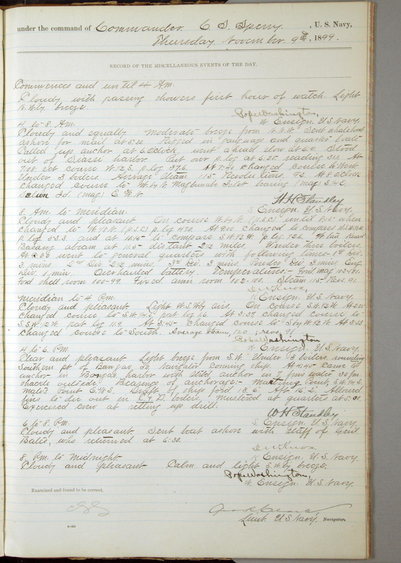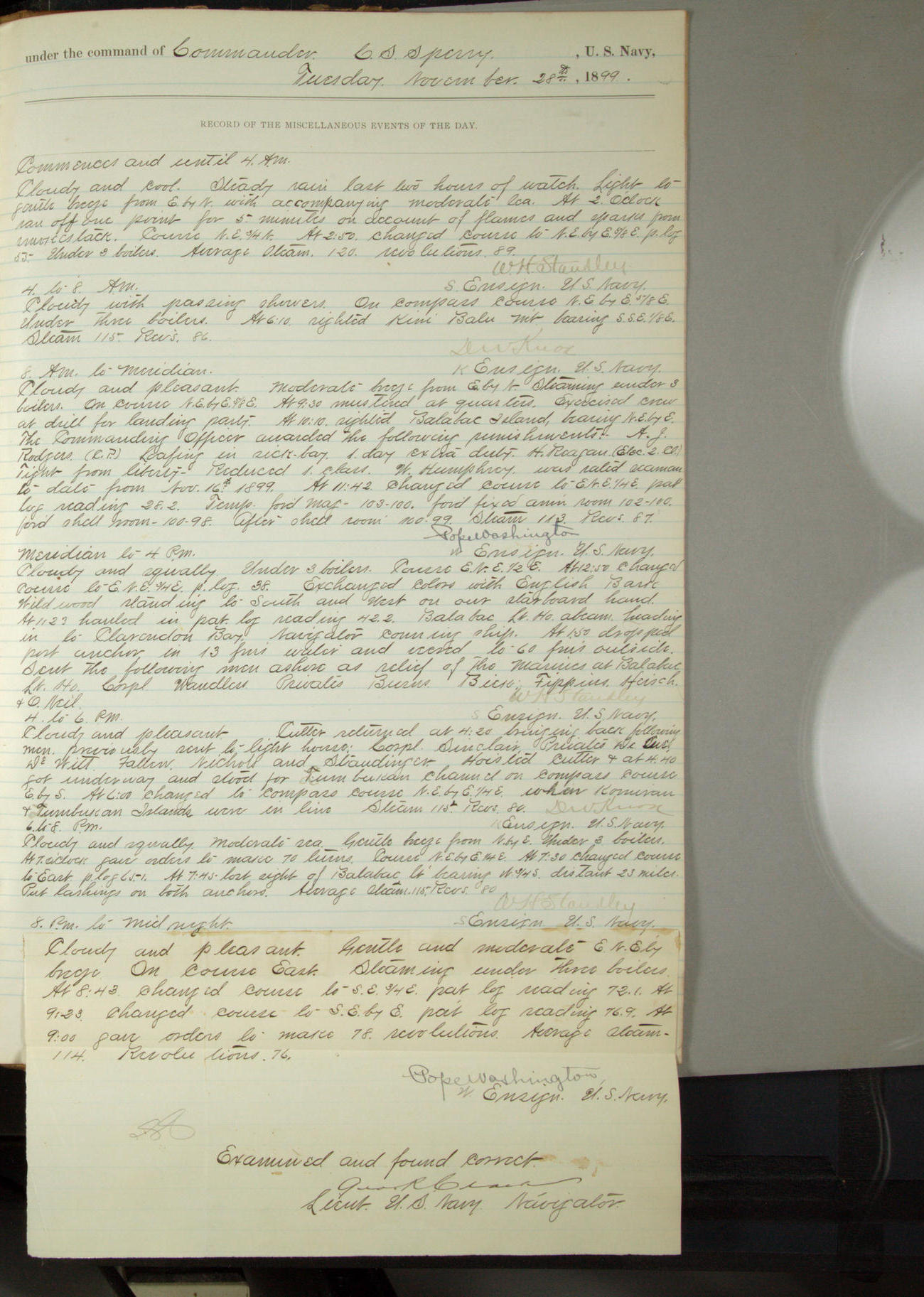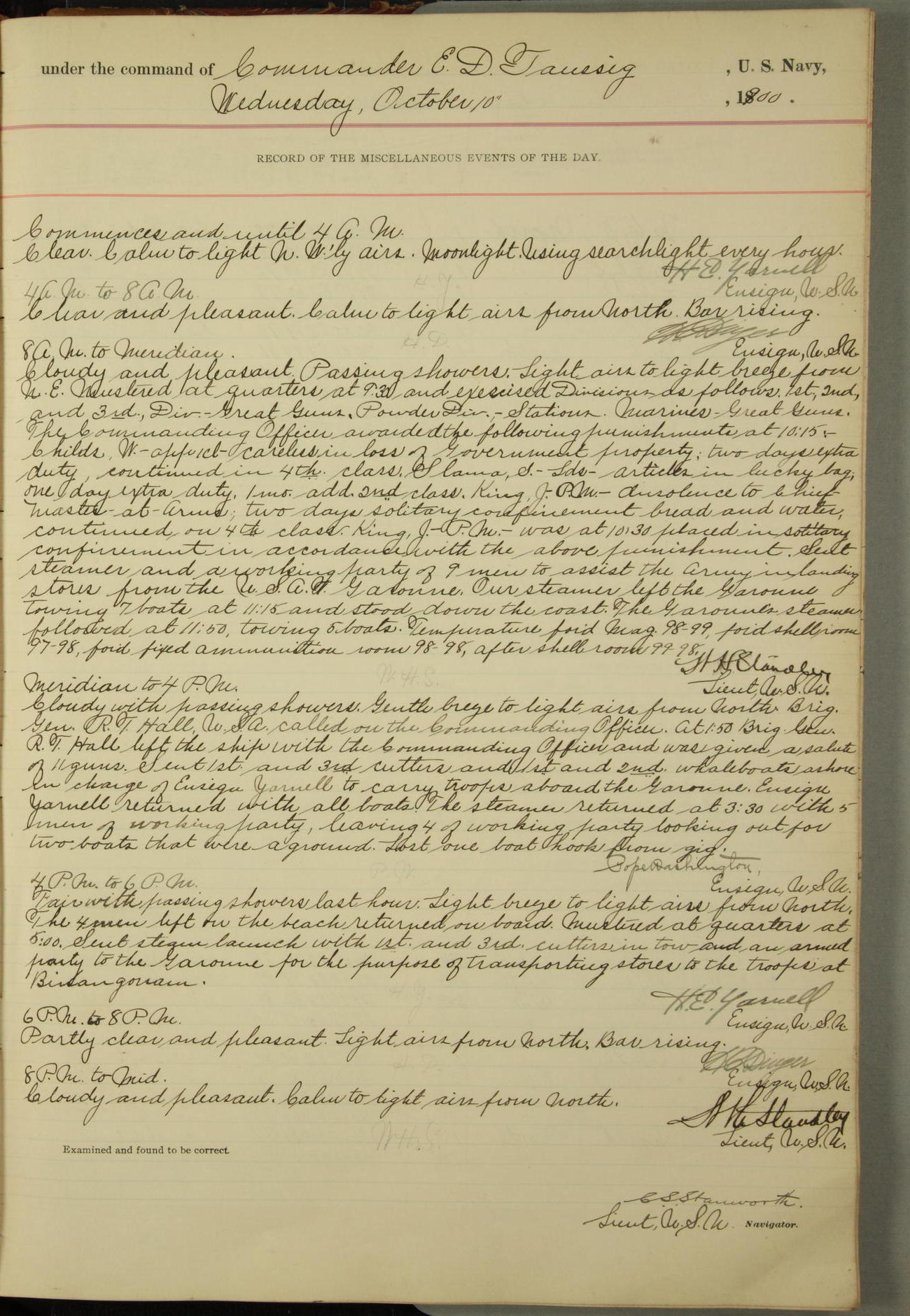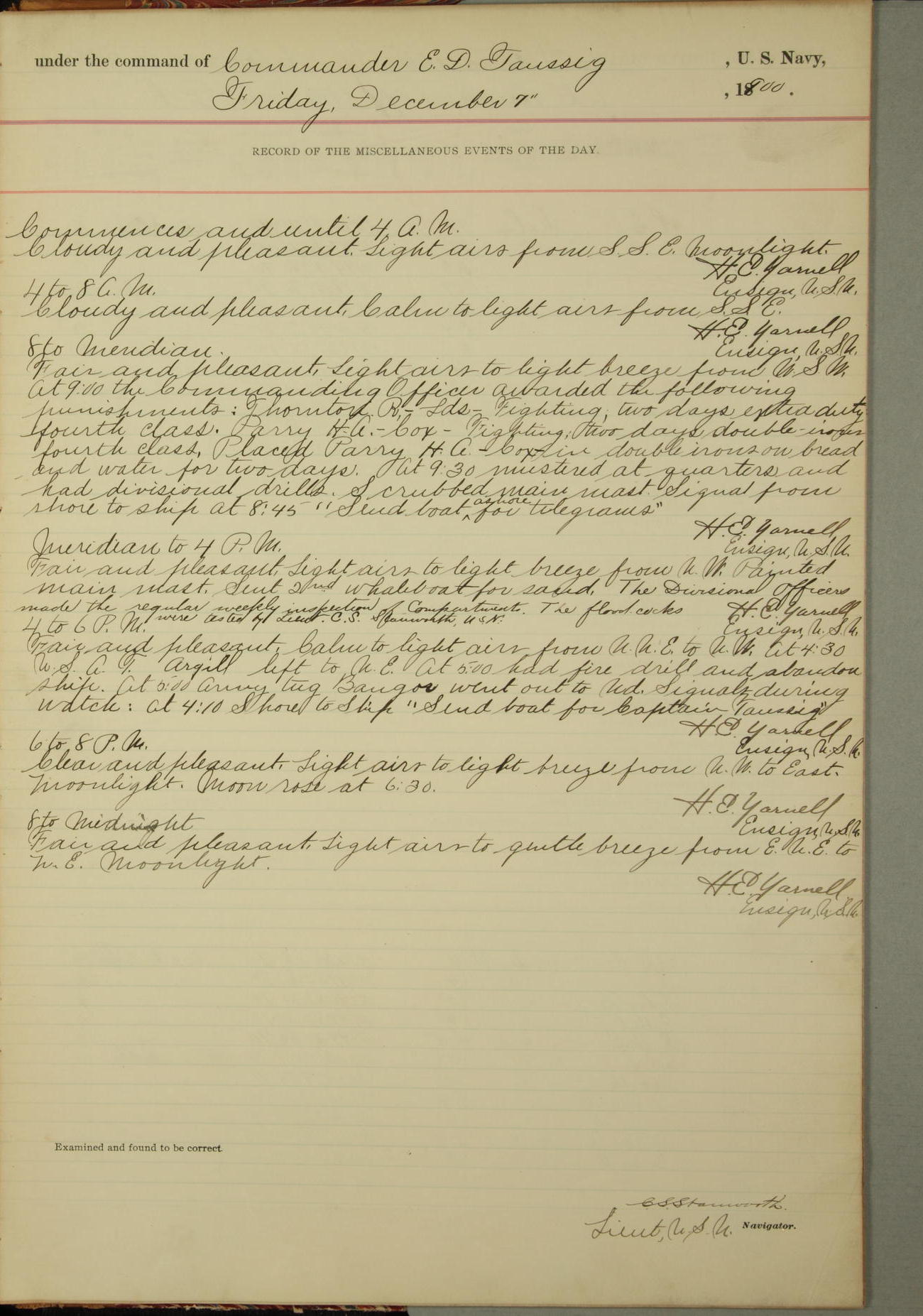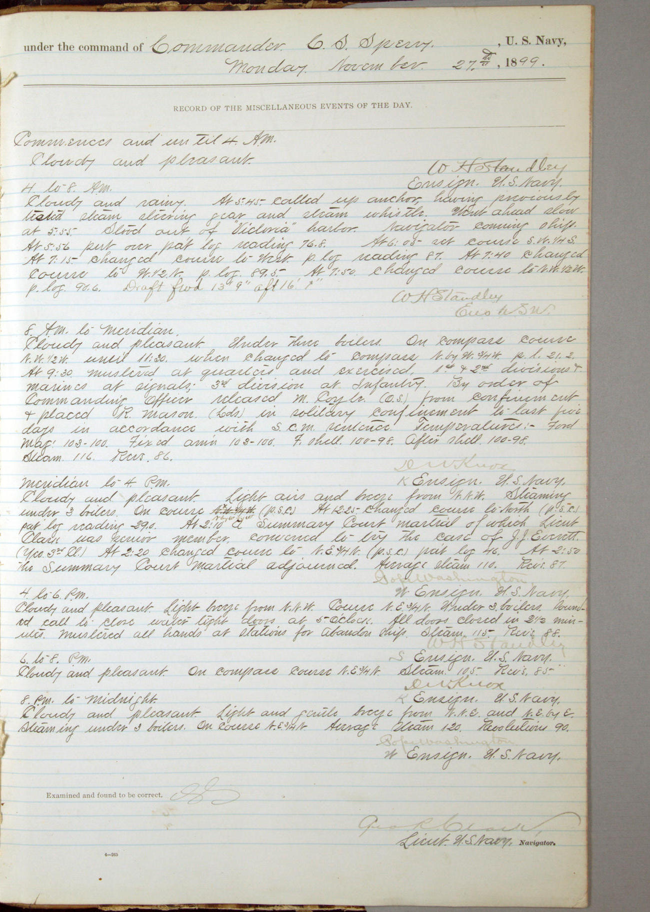 Commanding Officer awarded the following punishments: P.M. Anderson, Coal Passer, reduced to 2nd [conduct] class, for ½ hour over time; A. Kelly, Coxswain, 4th [conduct] class and 2 days' extra duty, for 12 hours over time and tight; H. Milan, Machinist First-class, 3rd [conduct] class and 1 day's extra duty, for 3 hours over time and drunk.