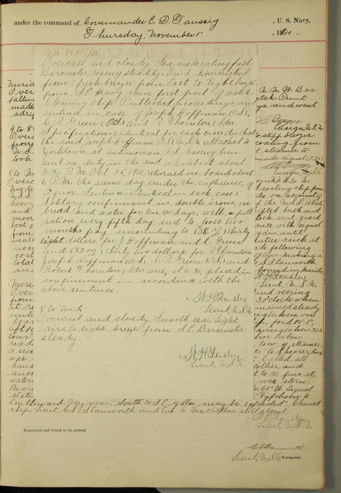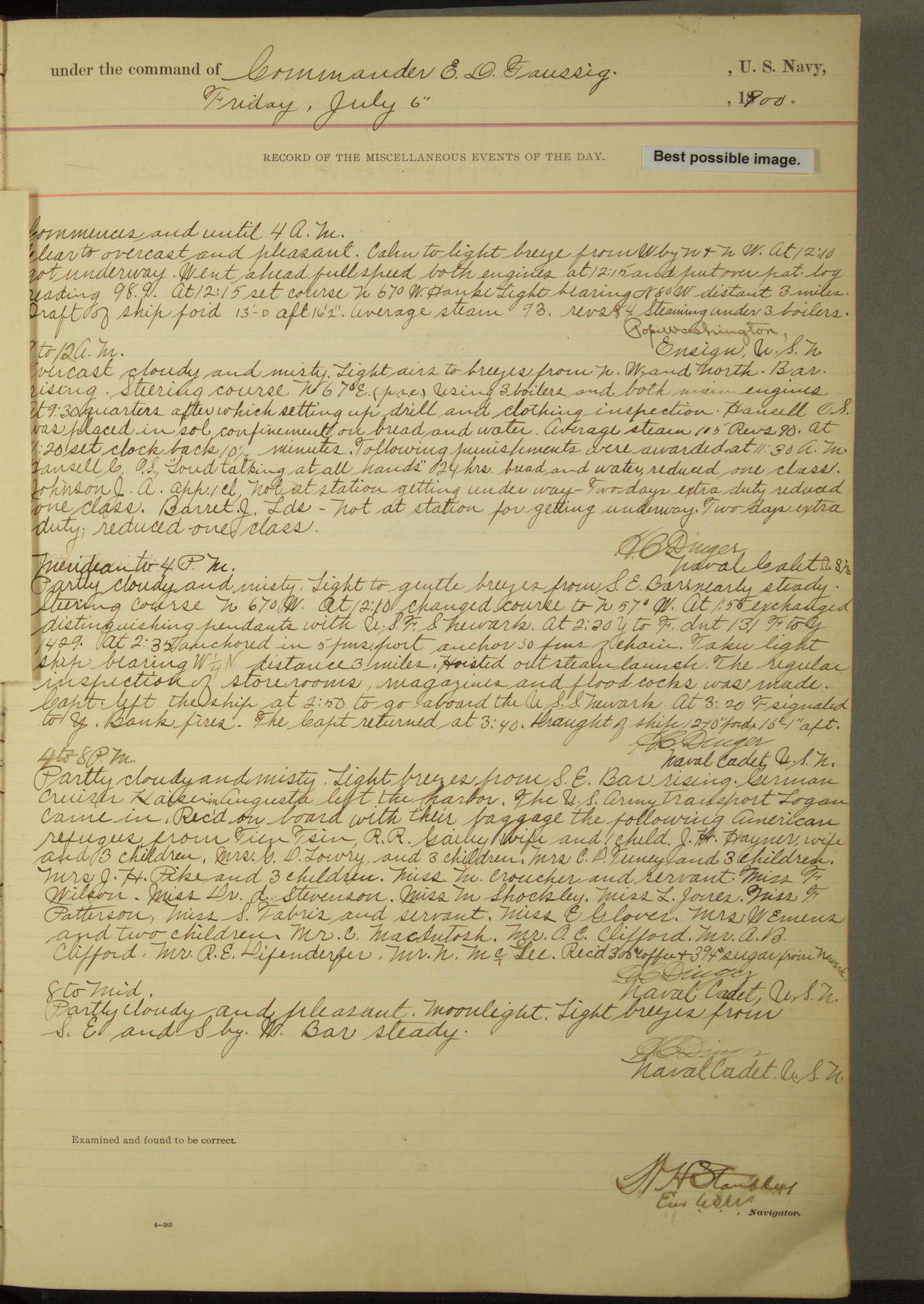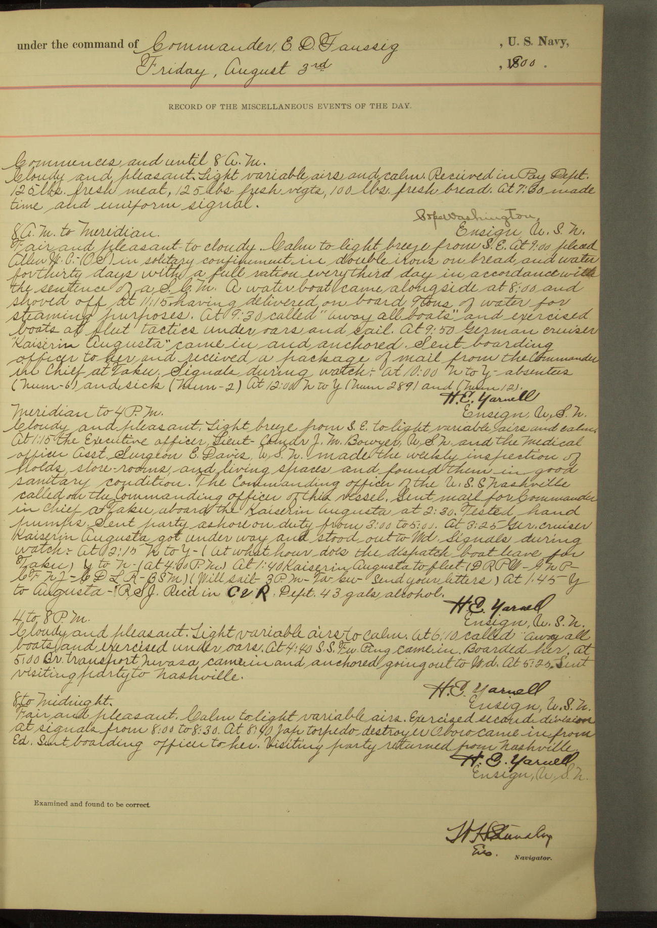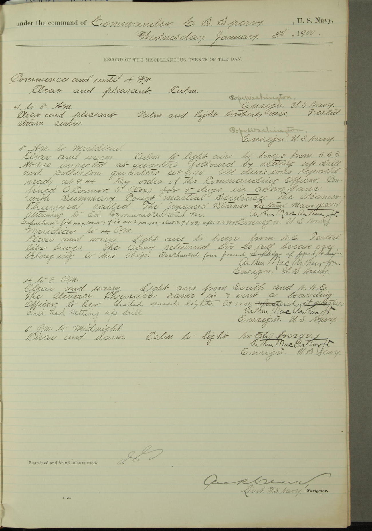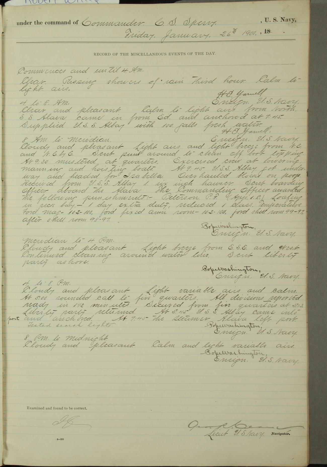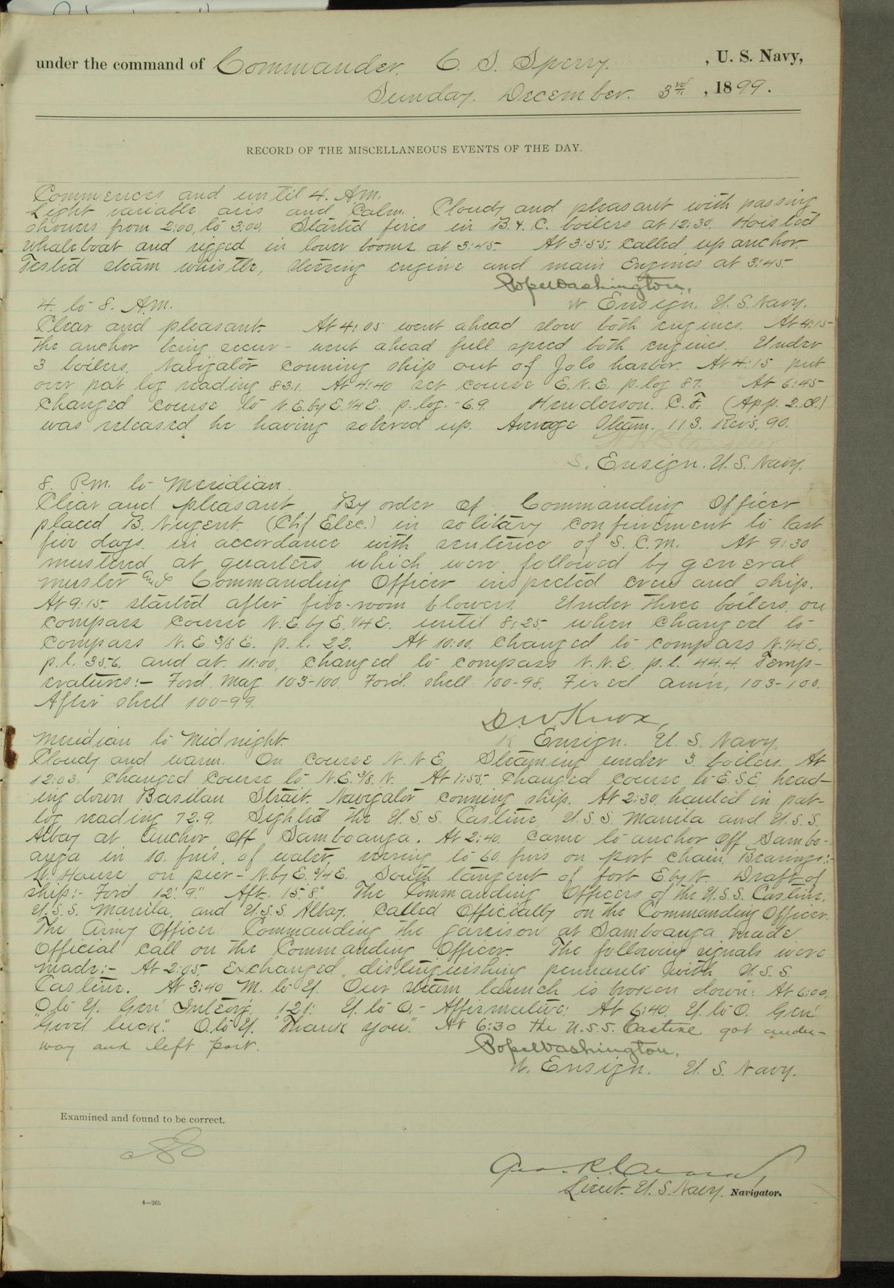 Commanding Officer awarded the following punishments: P.M. Anderson, Coal Passer, reduced to 2nd [conduct] class, for ½ hour over time; A. Kelly, Coxswain, 4th [conduct] class and 2 days' extra duty, for 12 hours over time and tight; H. Milan, Machinist First-class, 3rd [conduct] class and 1 day's extra duty, for 3 hours over time and drunk.