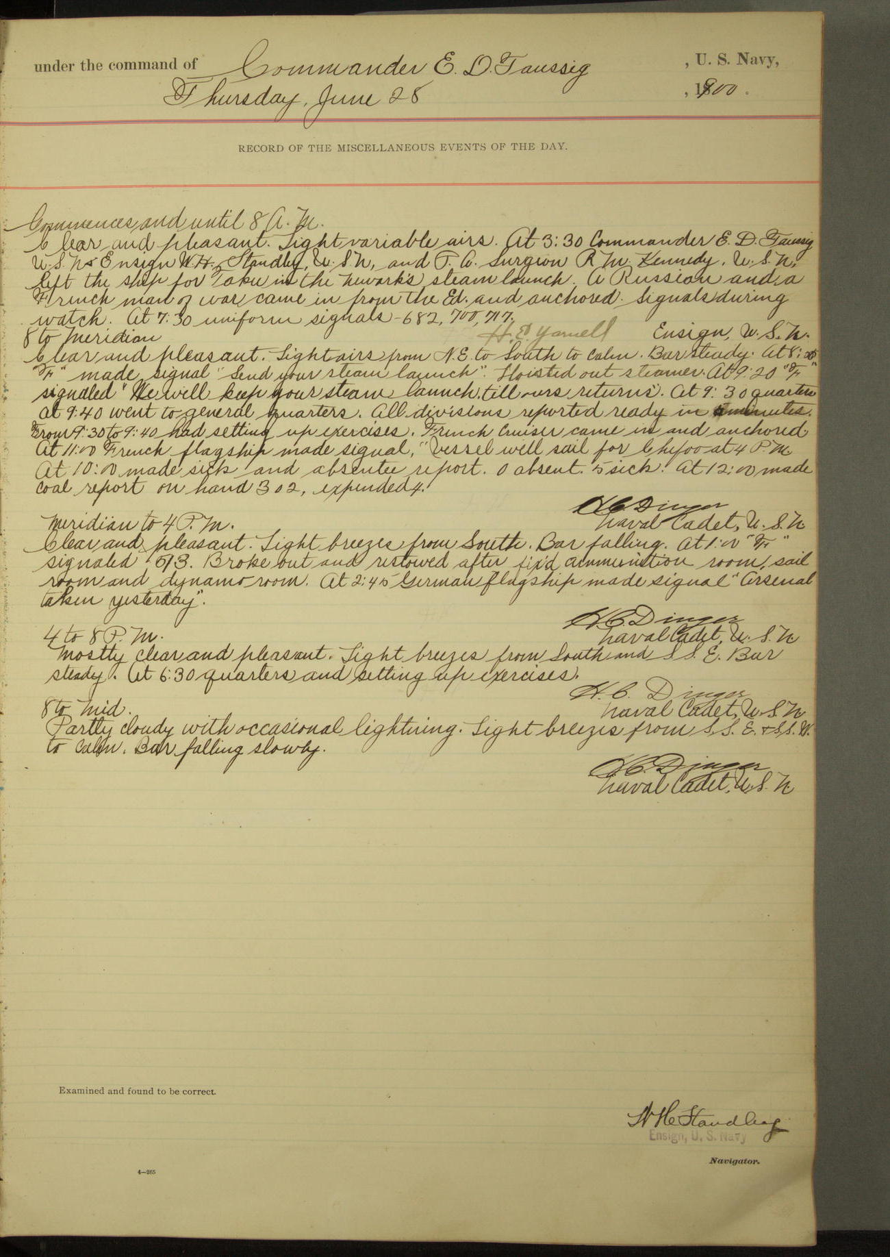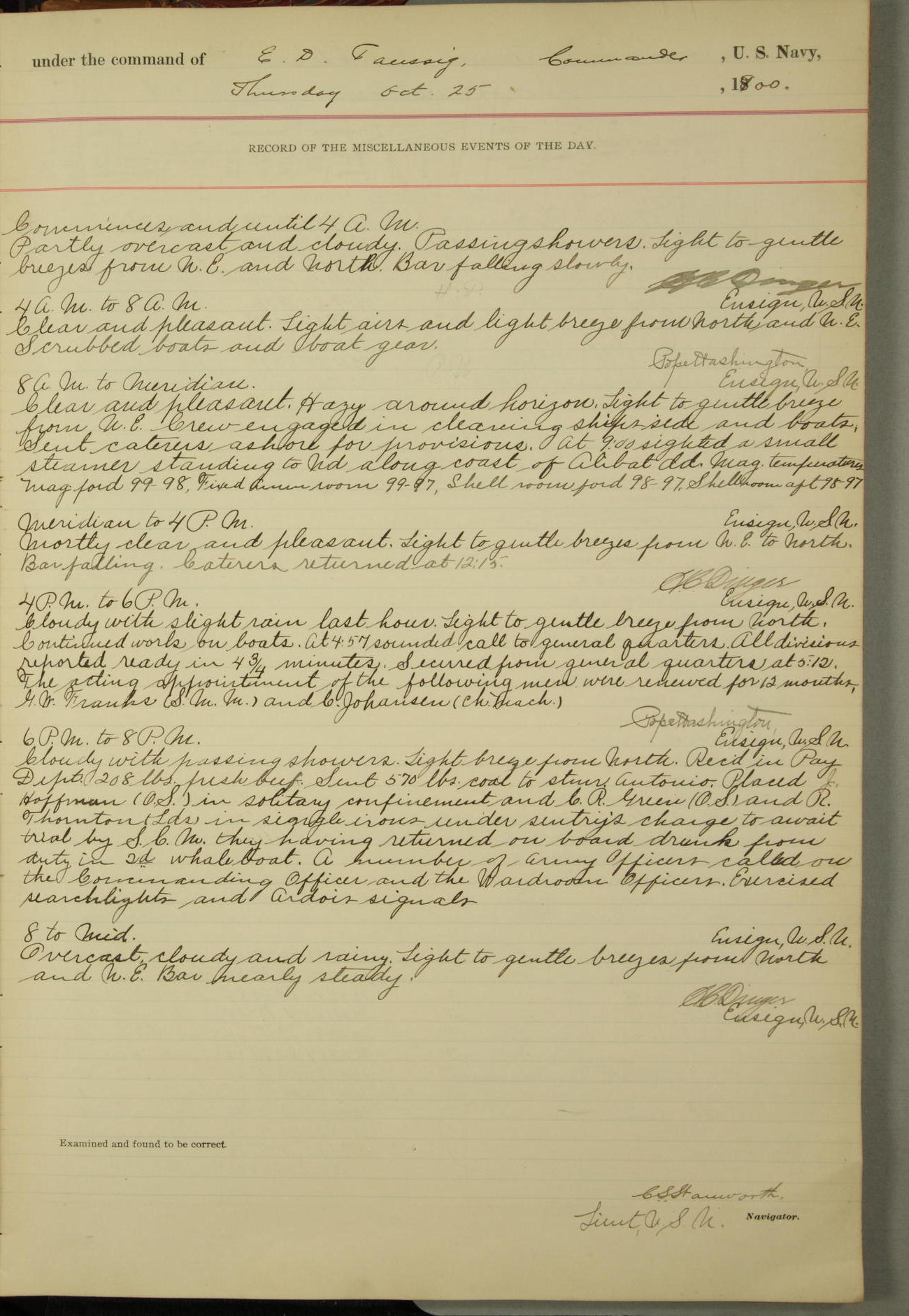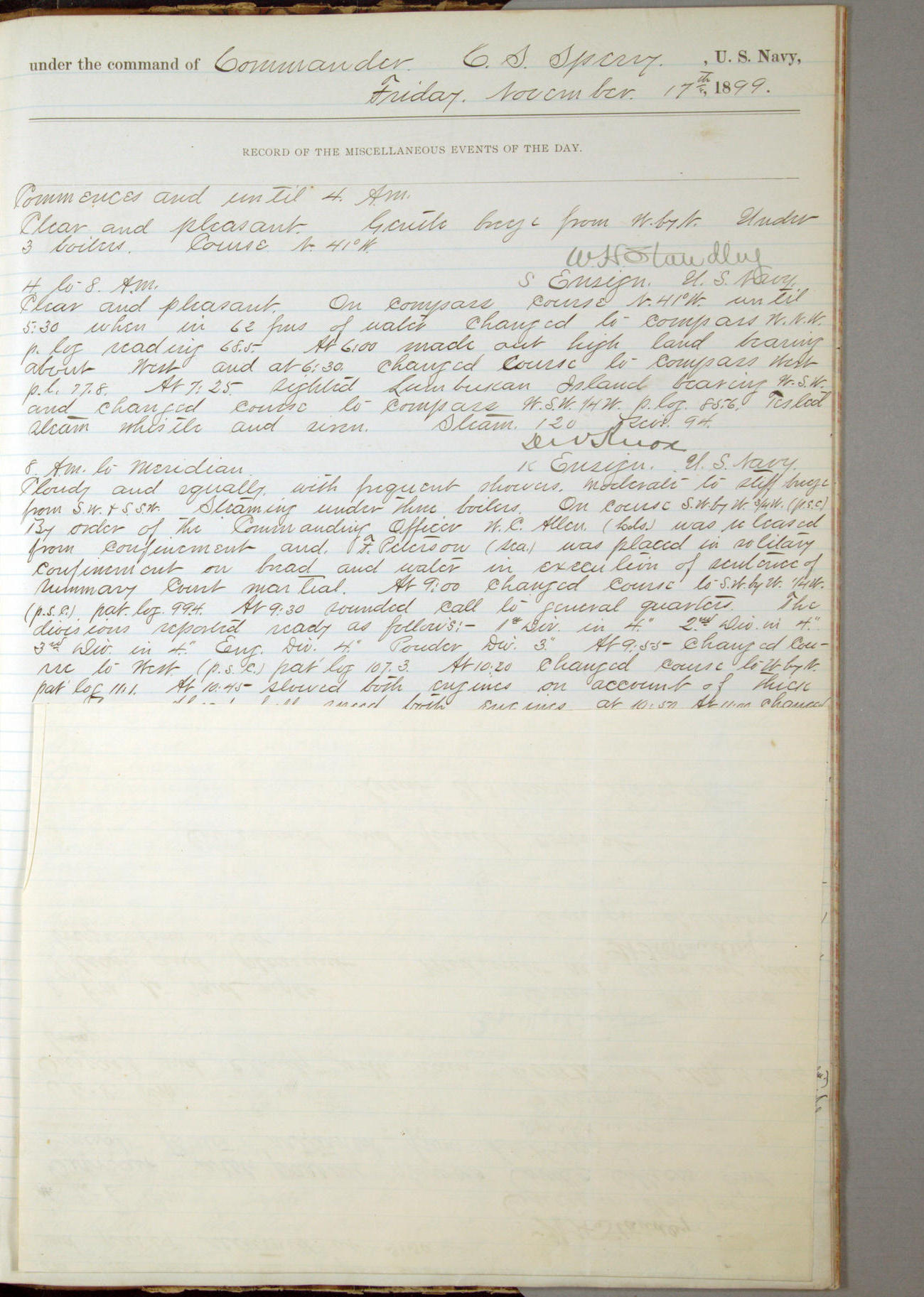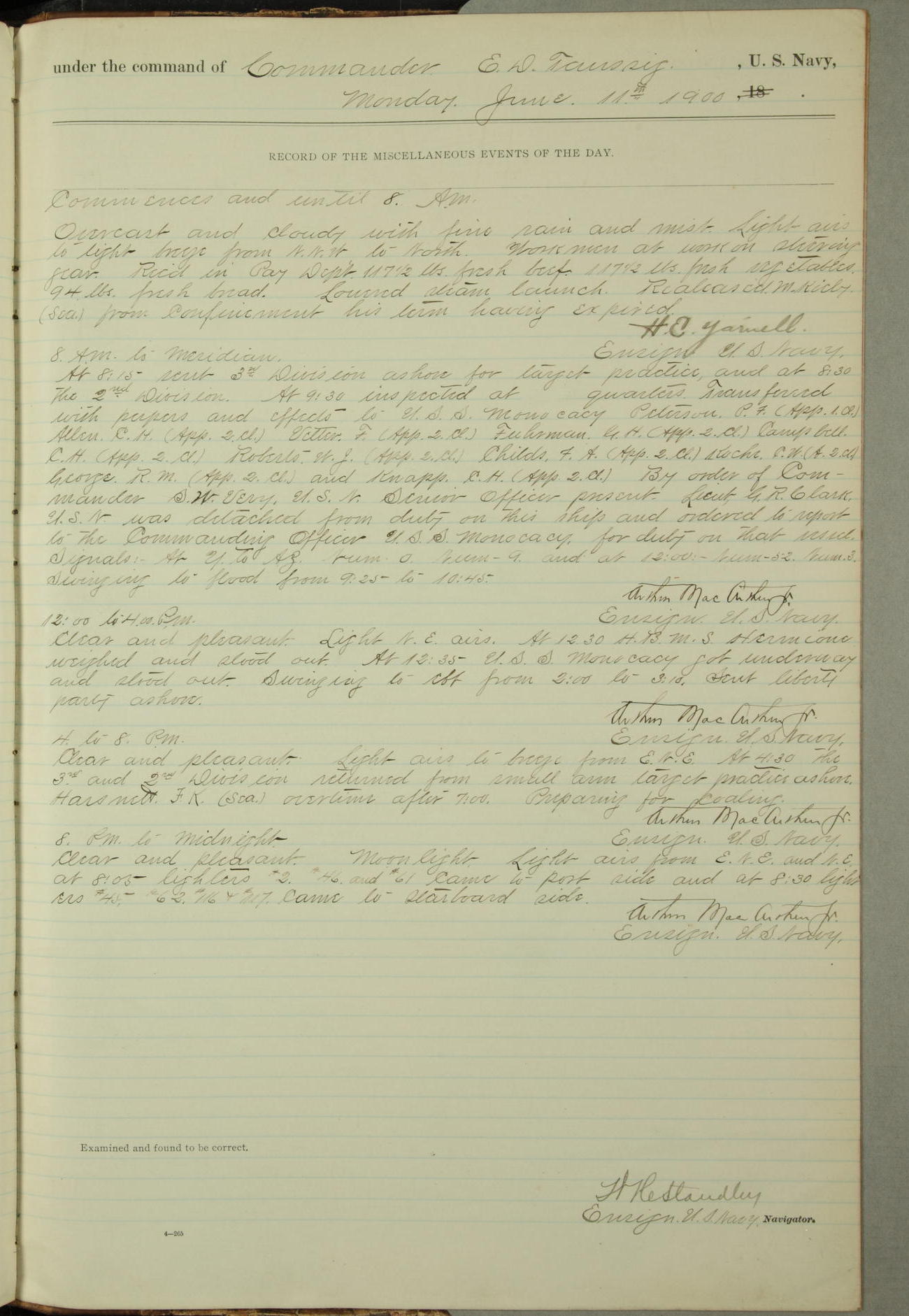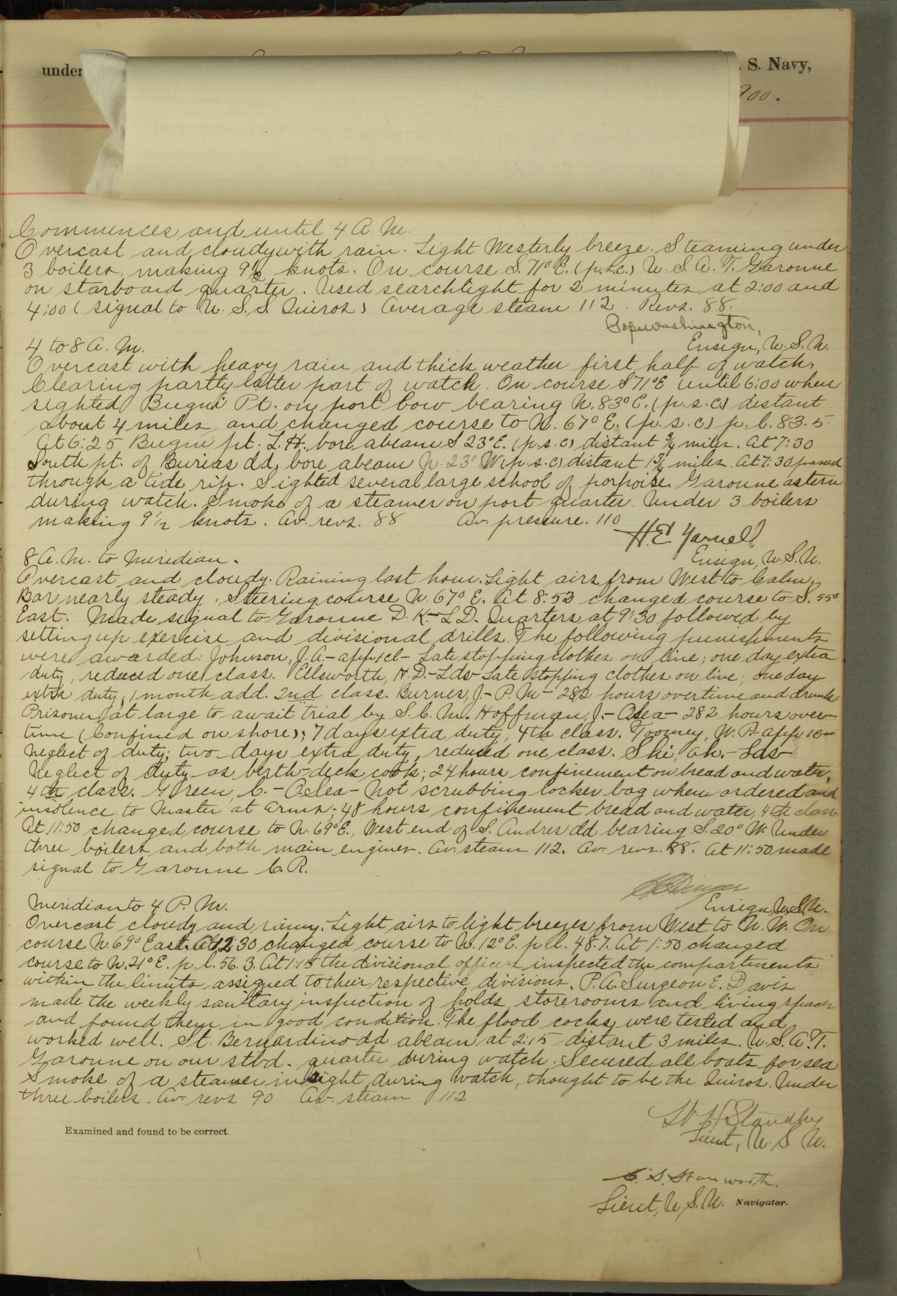 Commanding Officer awarded the following punishments: P.M. Anderson, Coal Passer, reduced to 2nd [conduct] class, for ½ hour over time; A. Kelly, Coxswain, 4th [conduct] class and 2 days' extra duty, for 12 hours over time and tight; H. Milan, Machinist First-class, 3rd [conduct] class and 1 day's extra duty, for 3 hours over time and drunk.