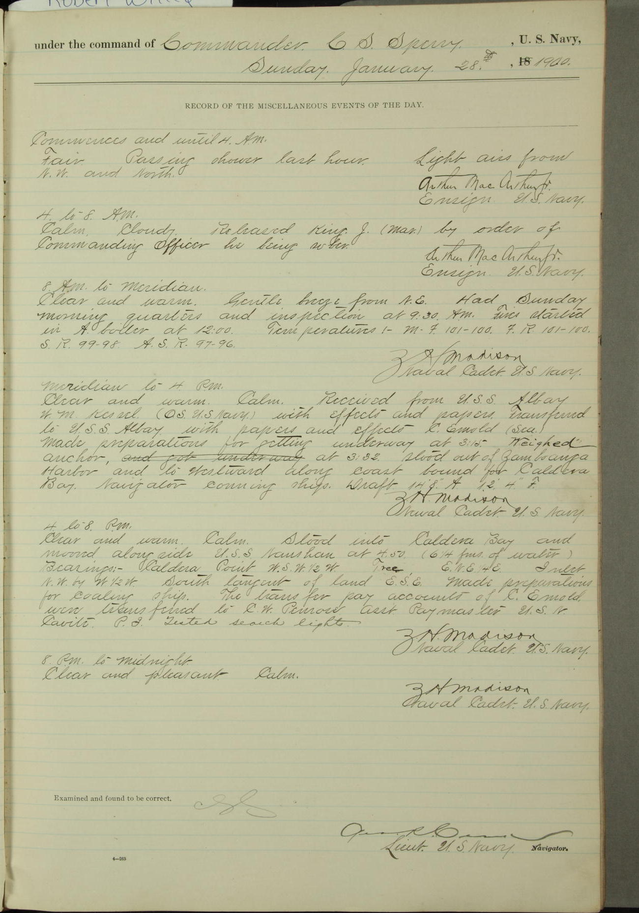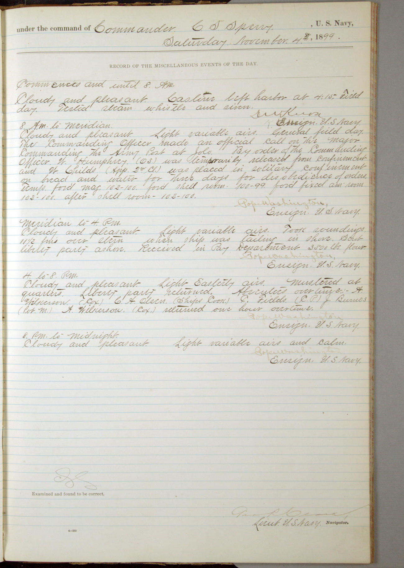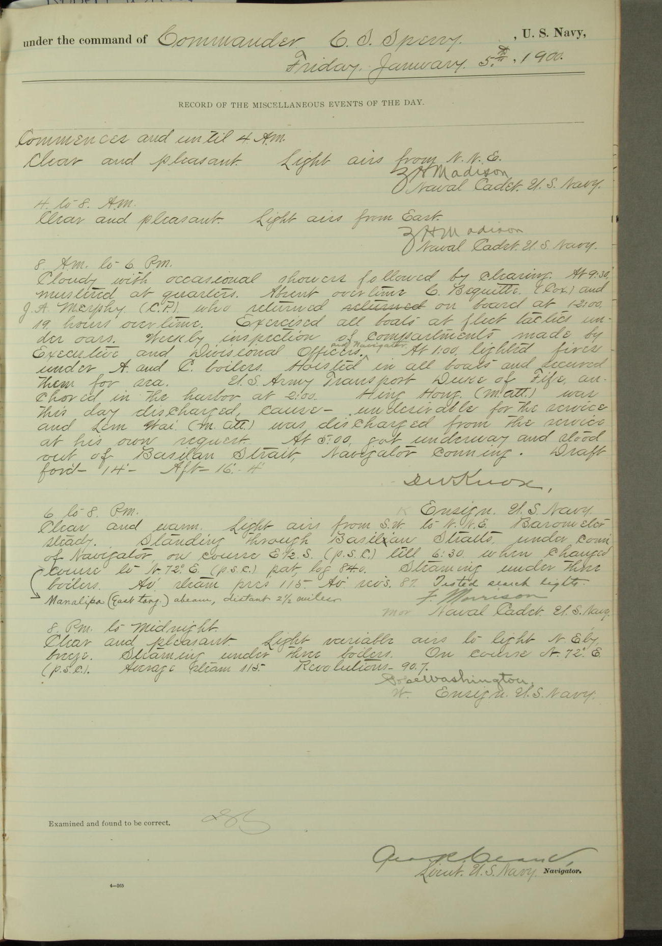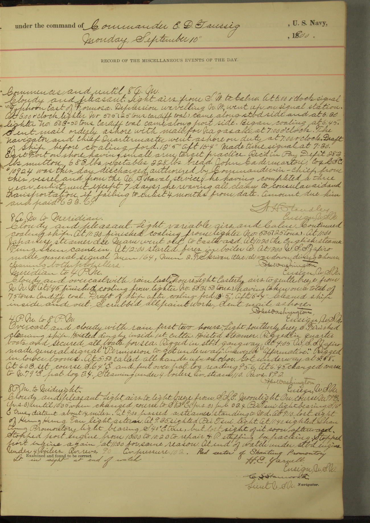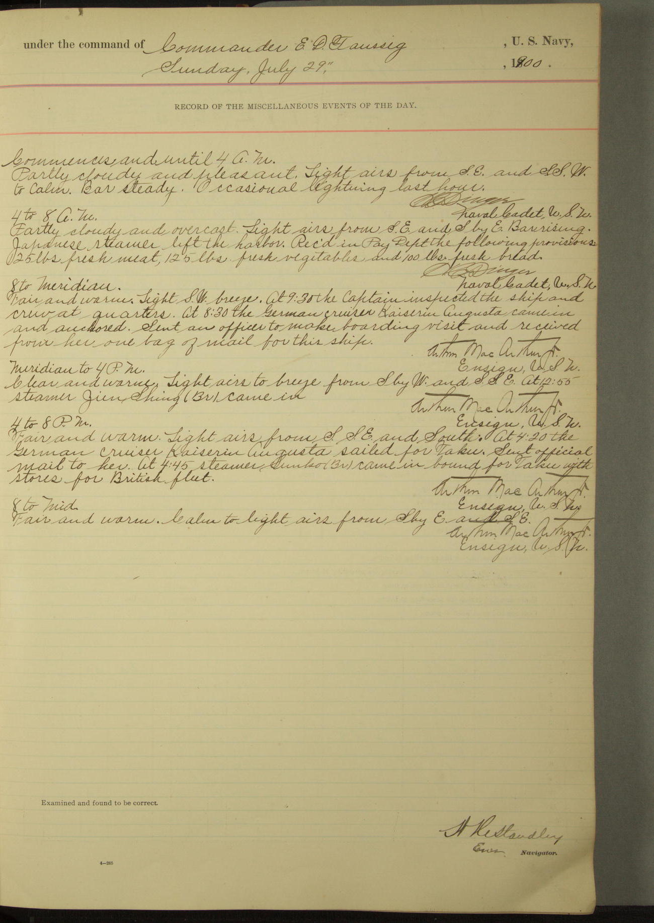 Commanding Officer awarded the following punishments: P.M. Anderson, Coal Passer, reduced to 2nd [conduct] class, for ½ hour over time; A. Kelly, Coxswain, 4th [conduct] class and 2 days' extra duty, for 12 hours over time and tight; H. Milan, Machinist First-class, 3rd [conduct] class and 1 day's extra duty, for 3 hours over time and drunk.