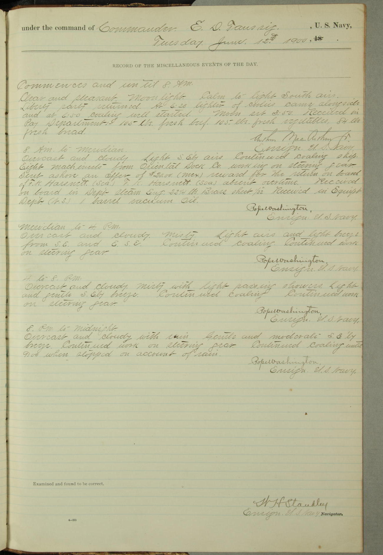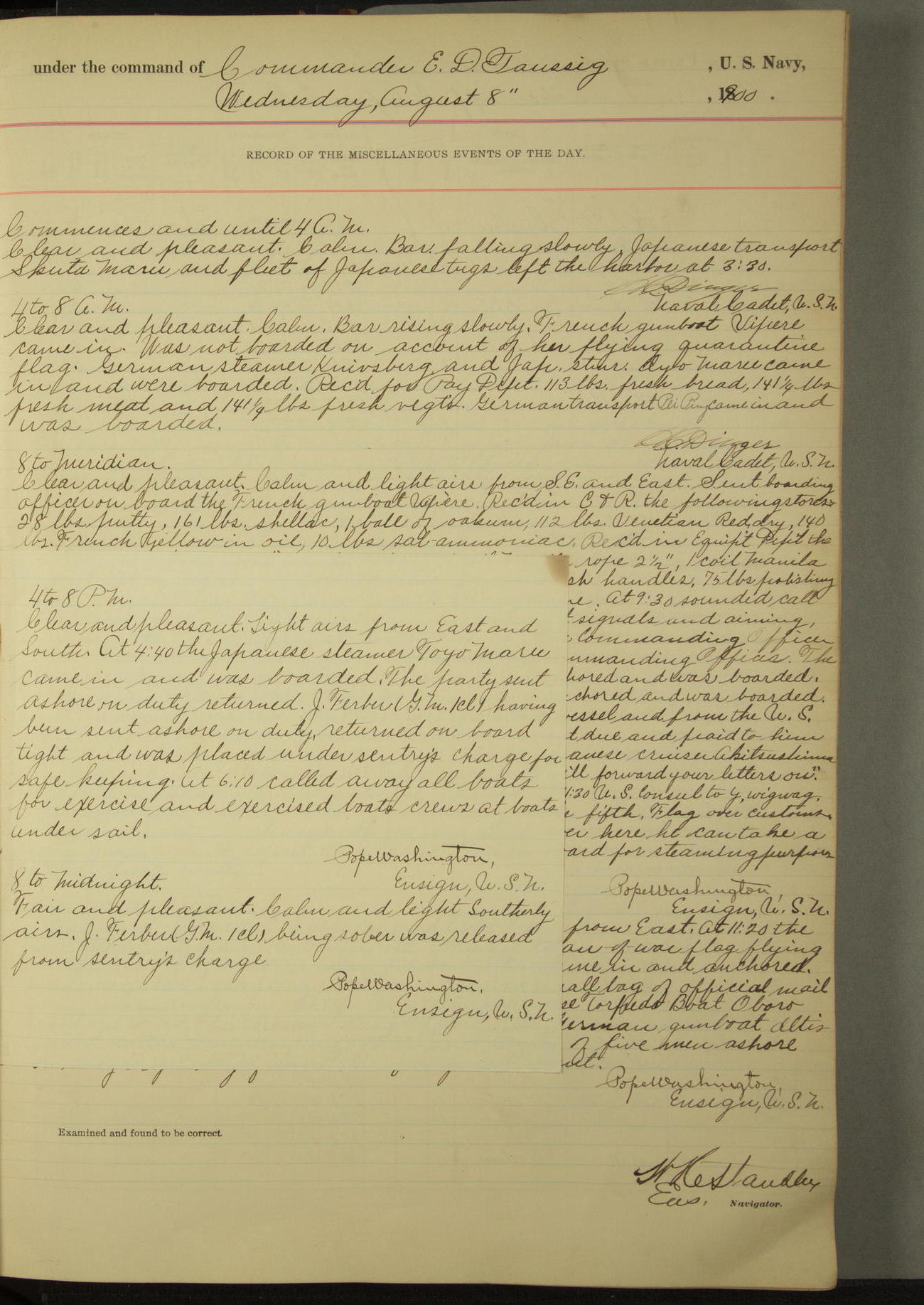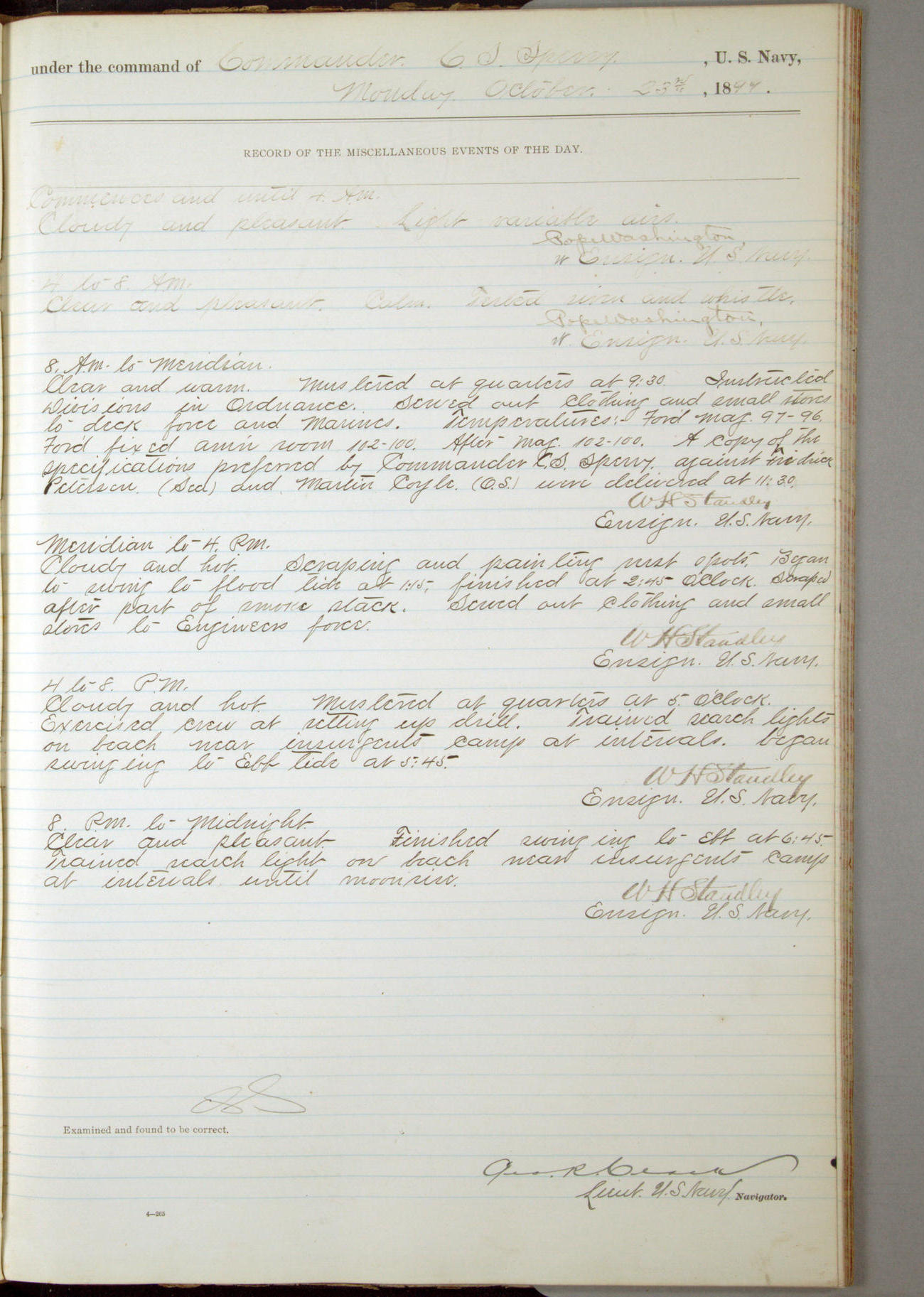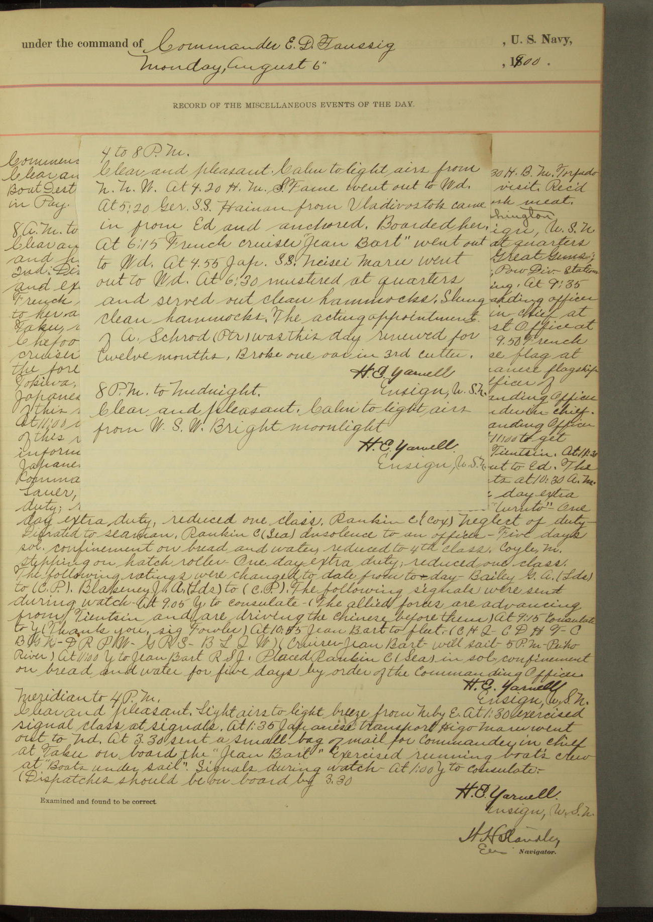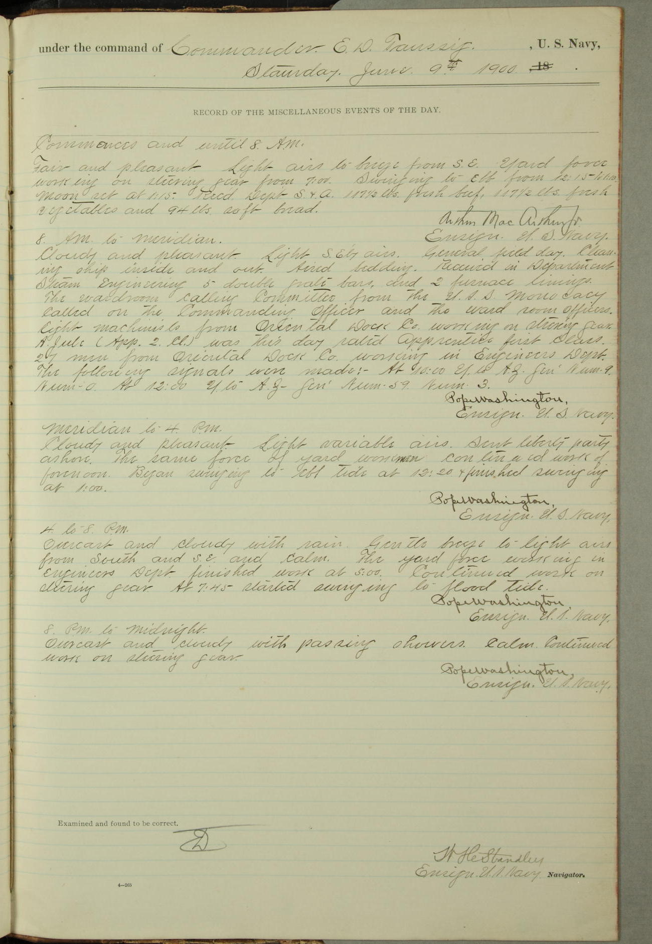 Commanding Officer awarded the following punishments: P.M. Anderson, Coal Passer, reduced to 2nd [conduct] class, for ½ hour over time; A. Kelly, Coxswain, 4th [conduct] class and 2 days' extra duty, for 12 hours over time and tight; H. Milan, Machinist First-class, 3rd [conduct] class and 1 day's extra duty, for 3 hours over time and drunk.