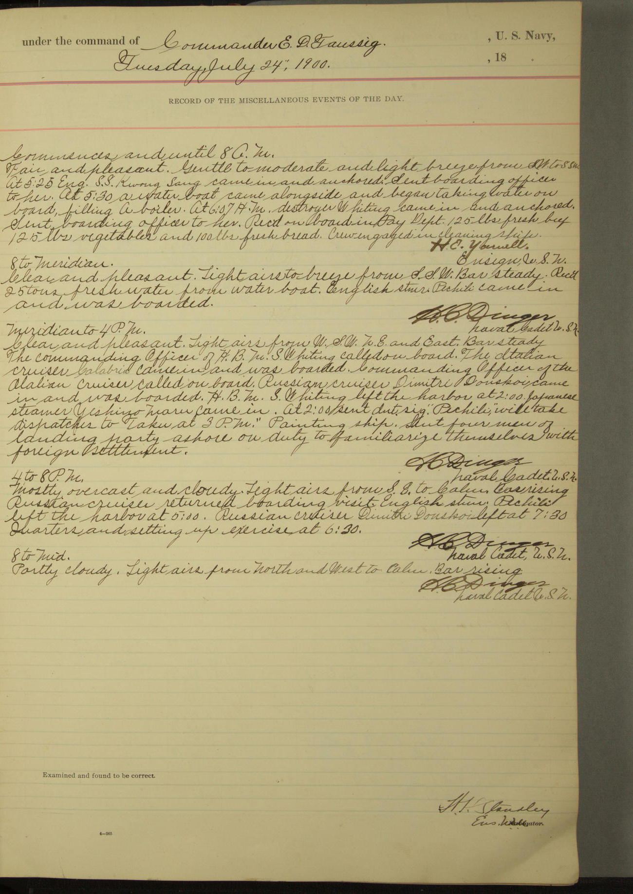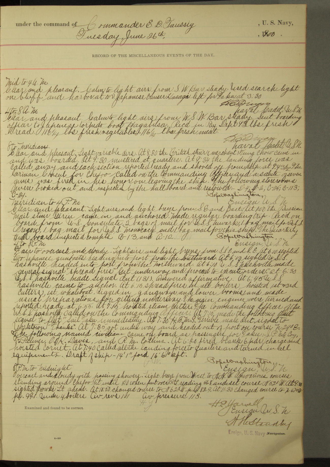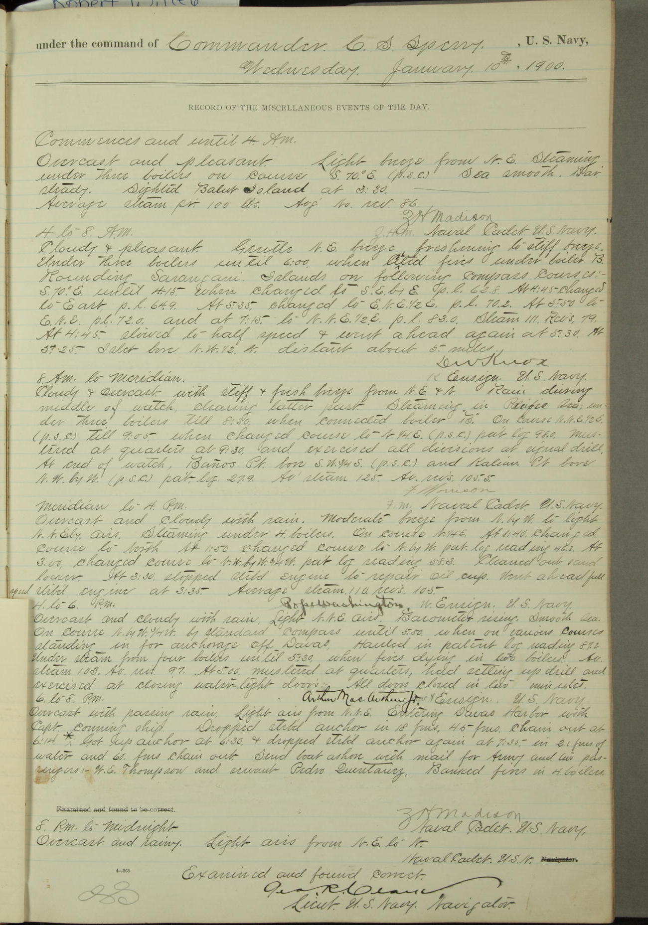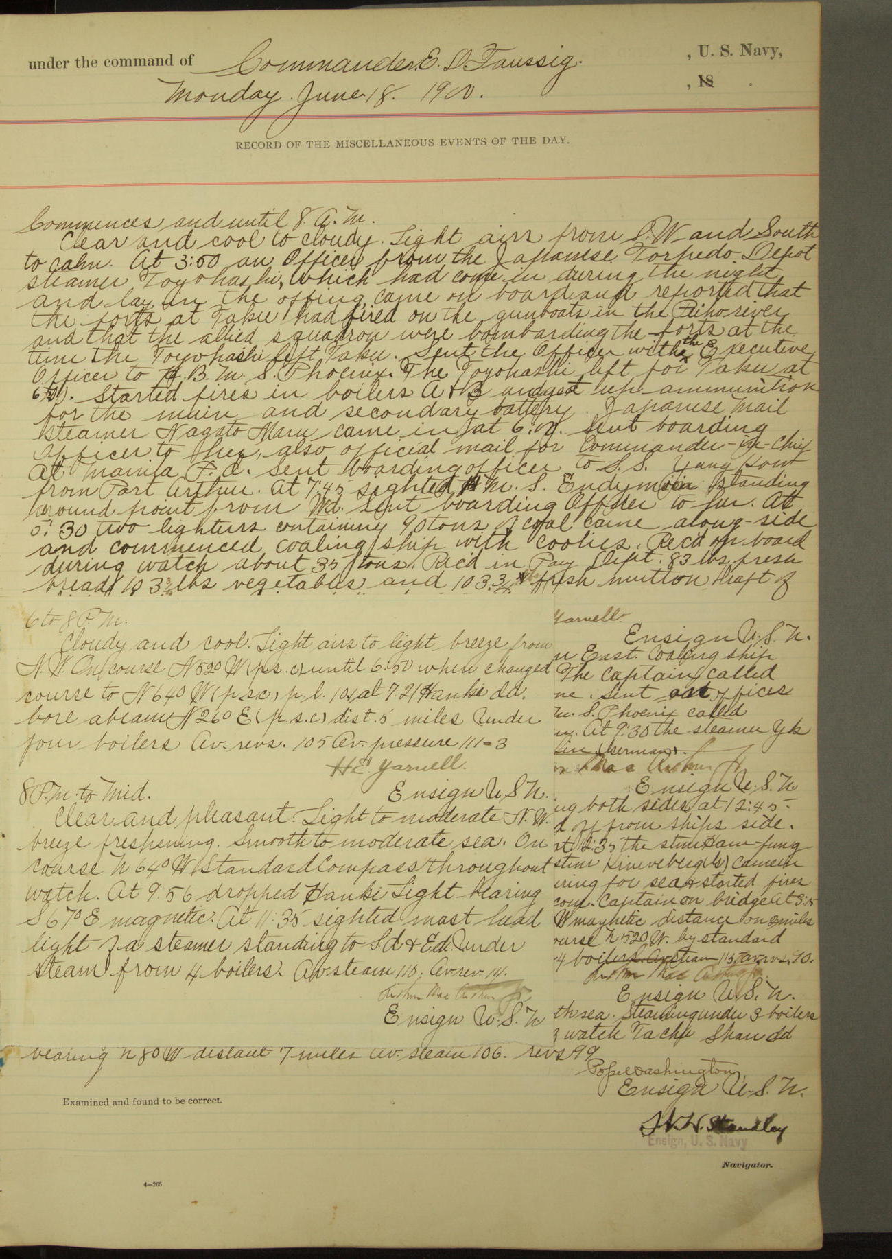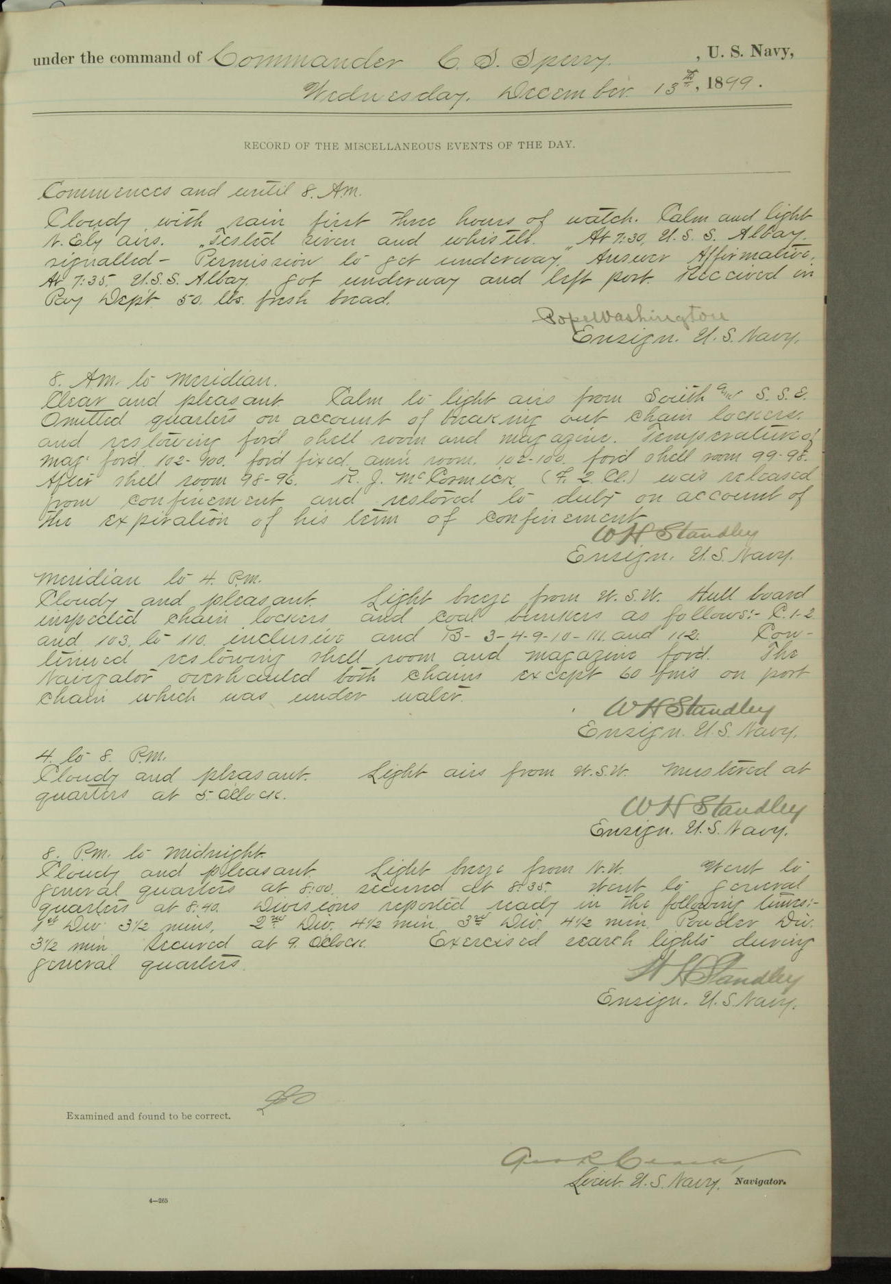 Commanding Officer awarded the following punishments: P.M. Anderson, Coal Passer, reduced to 2nd [conduct] class, for ½ hour over time; A. Kelly, Coxswain, 4th [conduct] class and 2 days' extra duty, for 12 hours over time and tight; H. Milan, Machinist First-class, 3rd [conduct] class and 1 day's extra duty, for 3 hours over time and drunk.