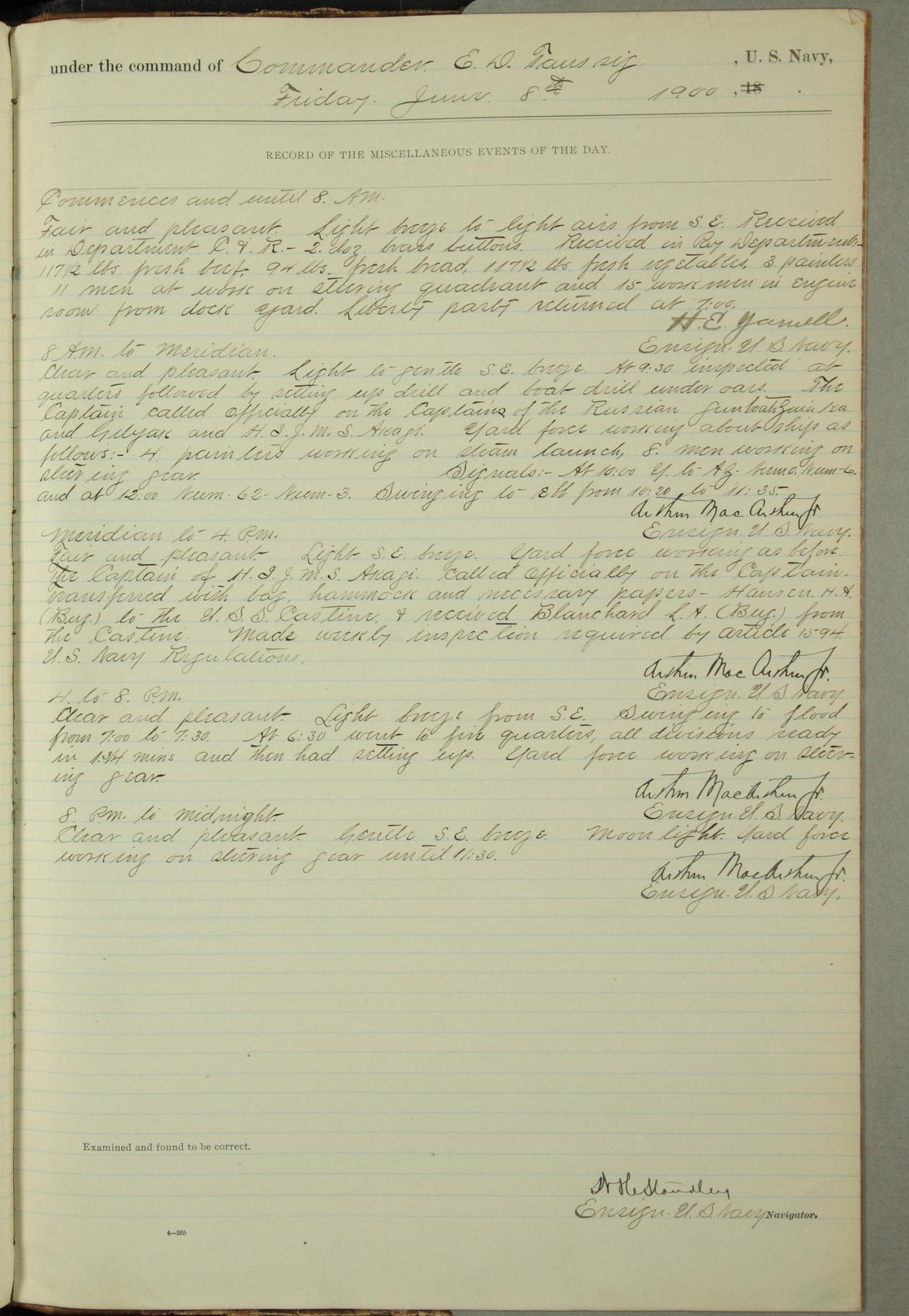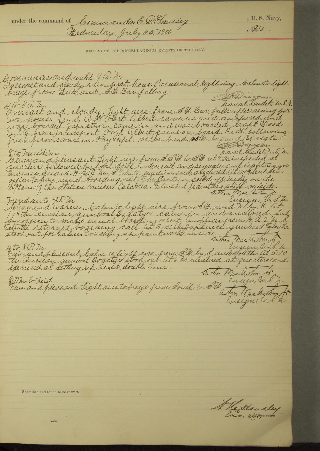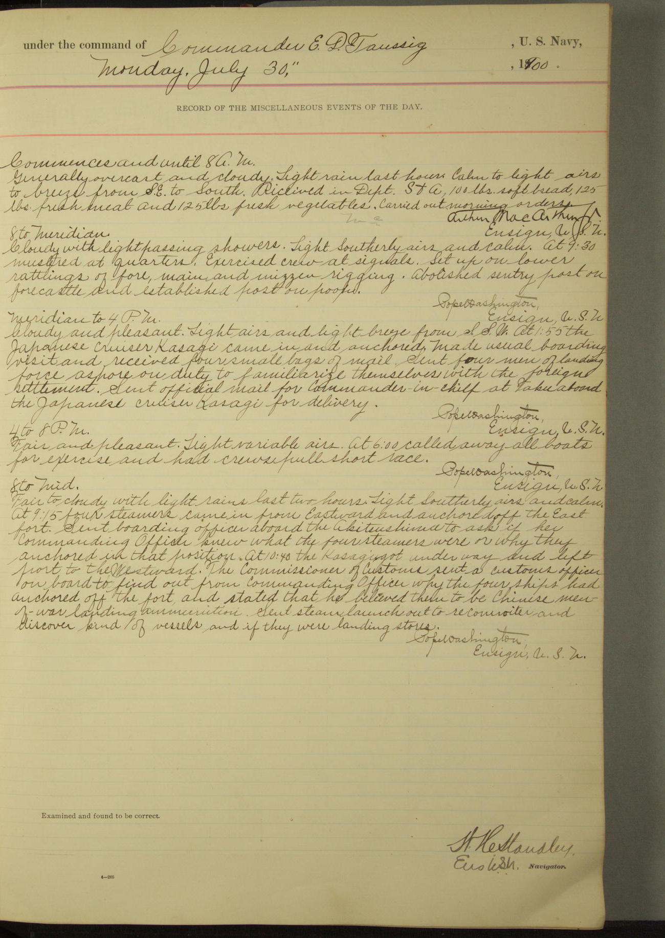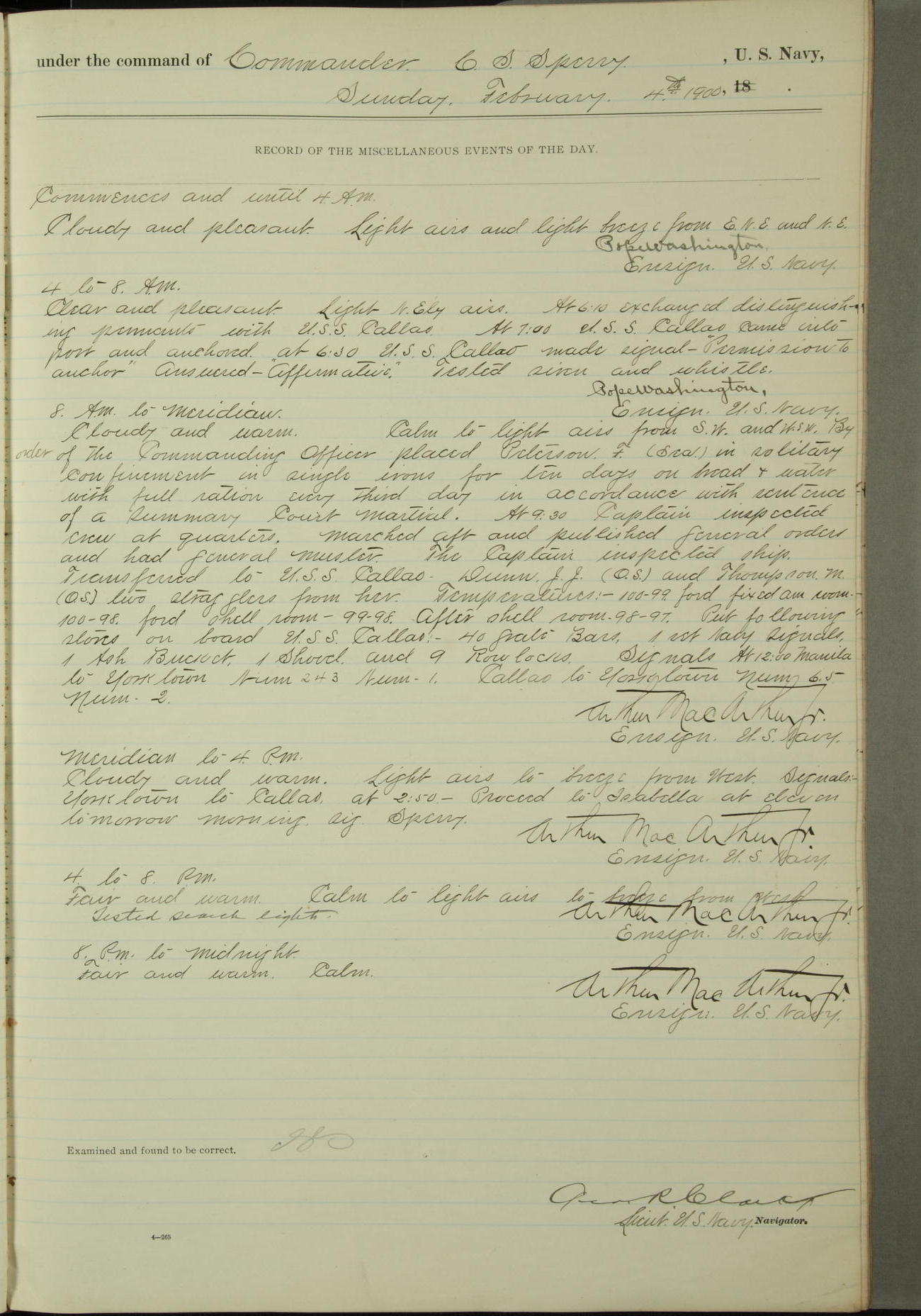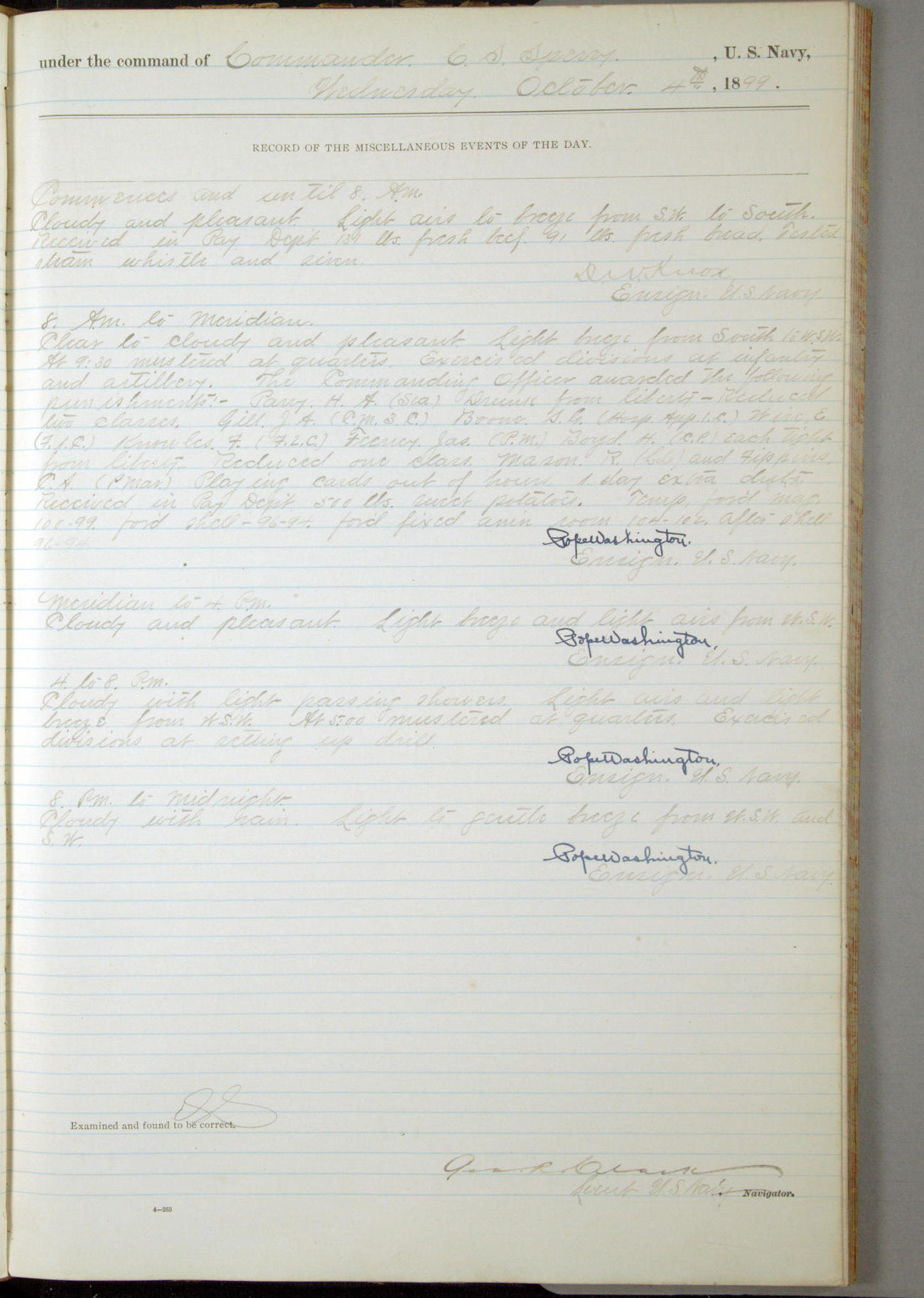 Commanding Officer awarded the following punishments: P.M. Anderson, Coal Passer, reduced to 2nd [conduct] class, for ½ hour over time; A. Kelly, Coxswain, 4th [conduct] class and 2 days' extra duty, for 12 hours over time and tight; H. Milan, Machinist First-class, 3rd [conduct] class and 1 day's extra duty, for 3 hours over time and drunk.