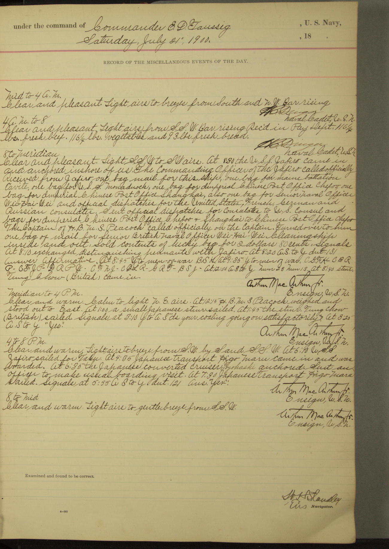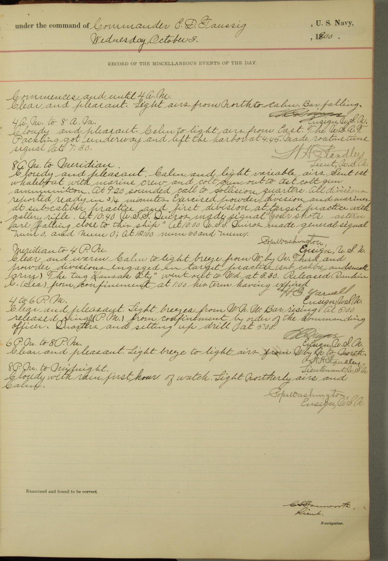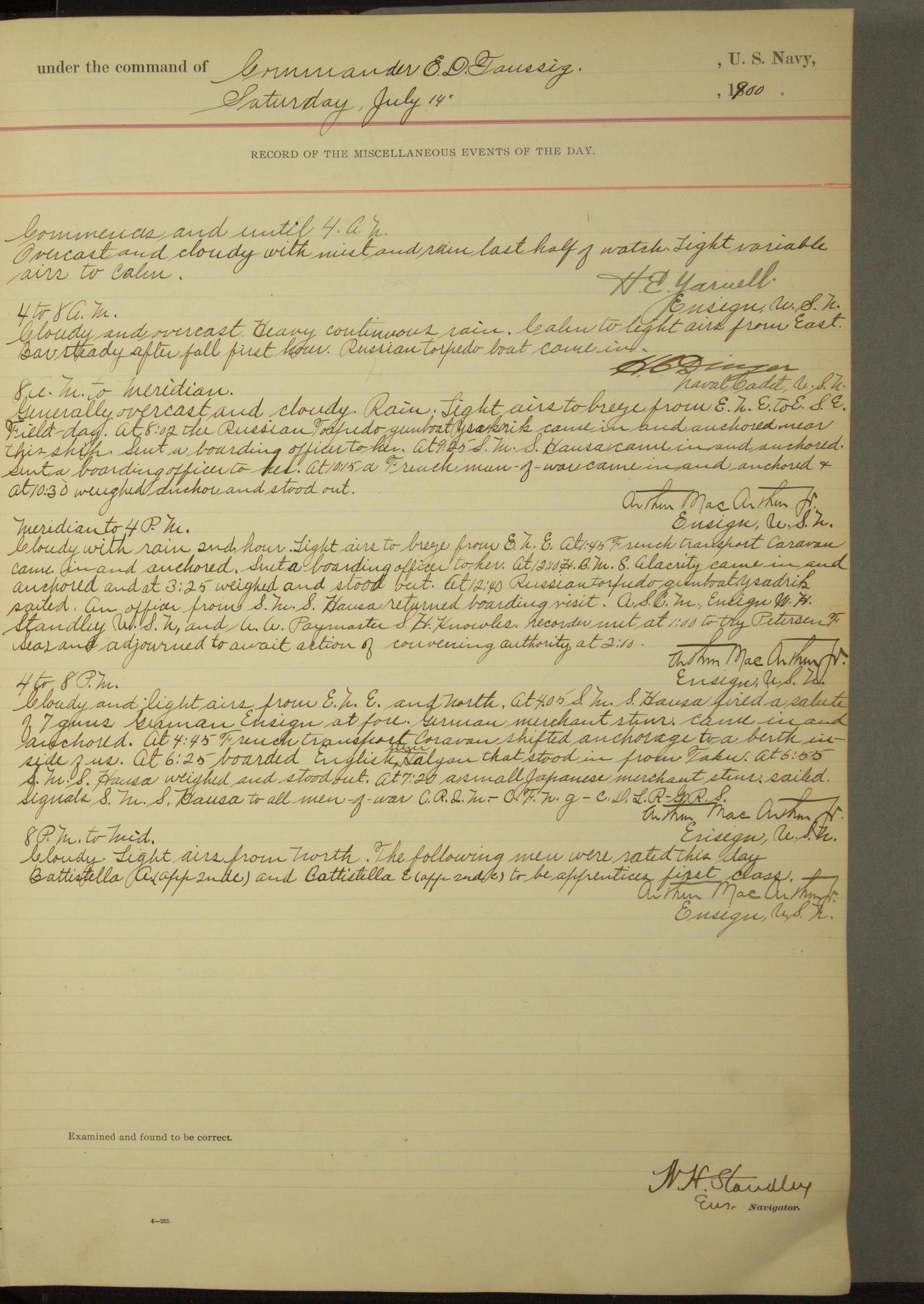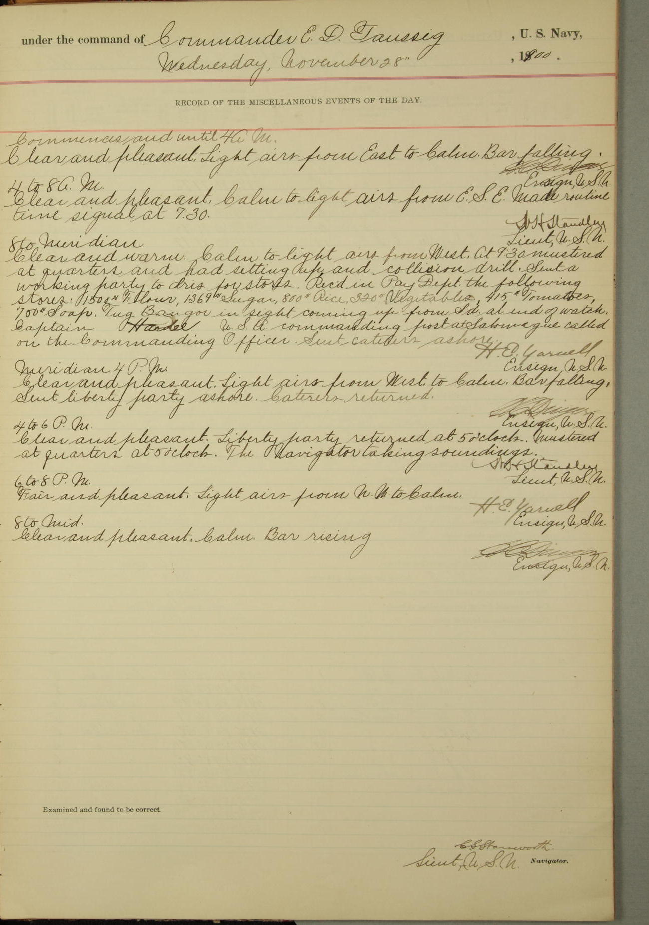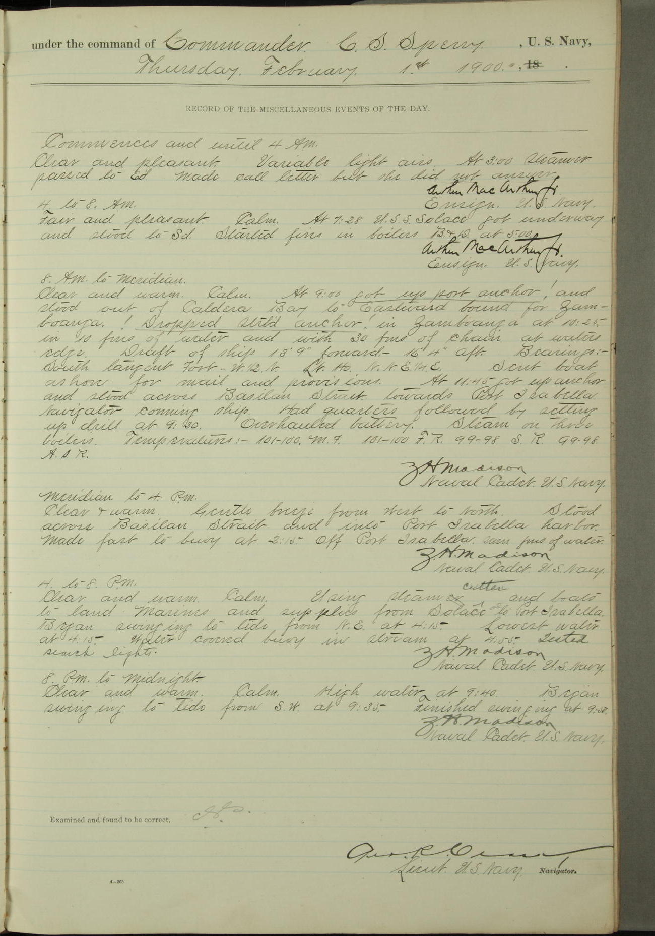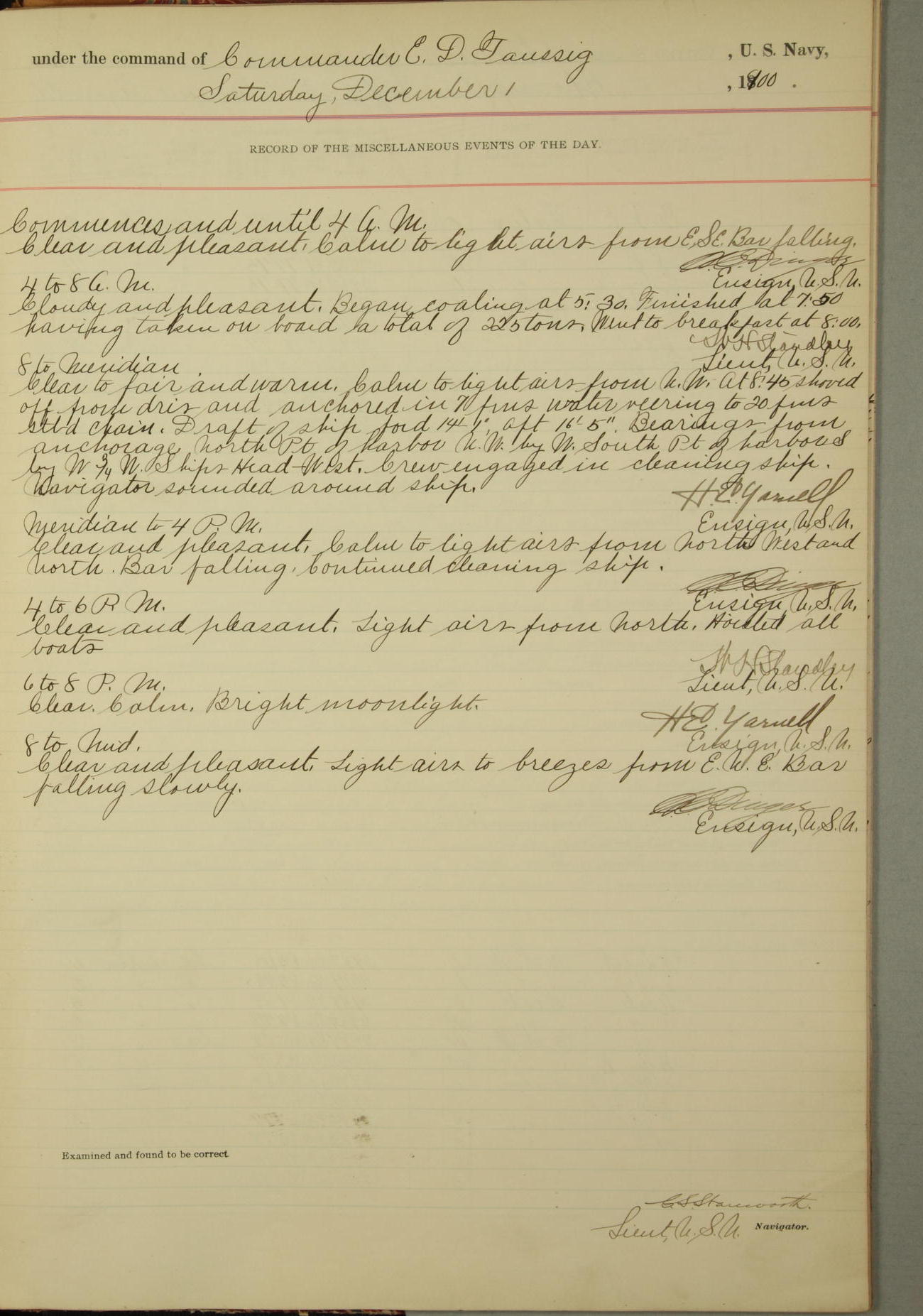 Commanding Officer awarded the following punishments: P.M. Anderson, Coal Passer, reduced to 2nd [conduct] class, for ½ hour over time; A. Kelly, Coxswain, 4th [conduct] class and 2 days' extra duty, for 12 hours over time and tight; H. Milan, Machinist First-class, 3rd [conduct] class and 1 day's extra duty, for 3 hours over time and drunk.