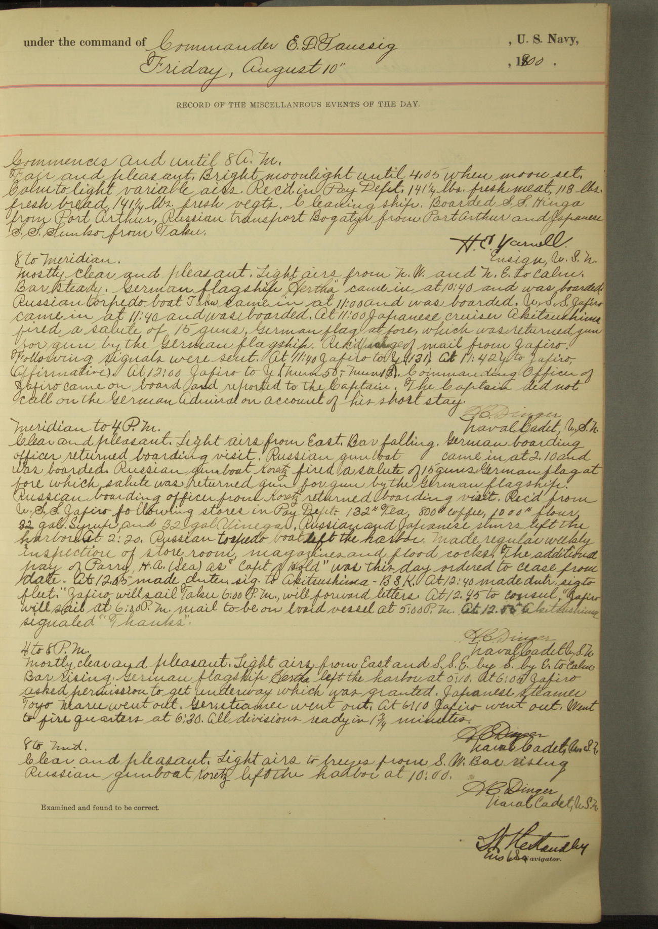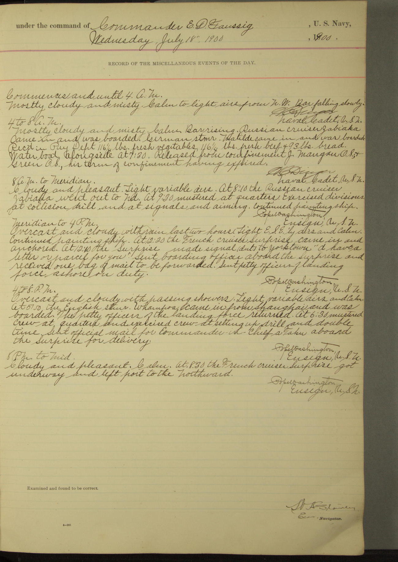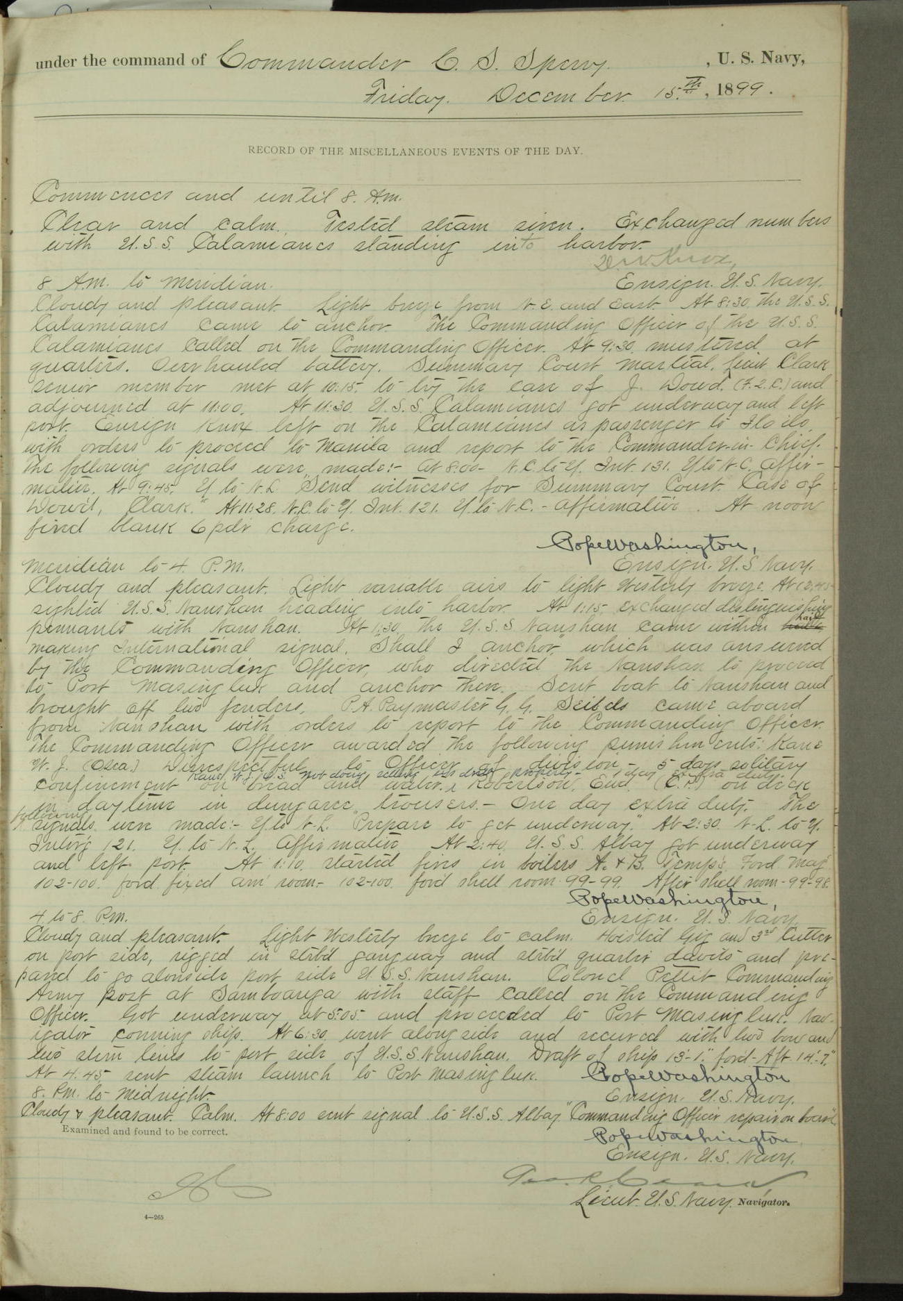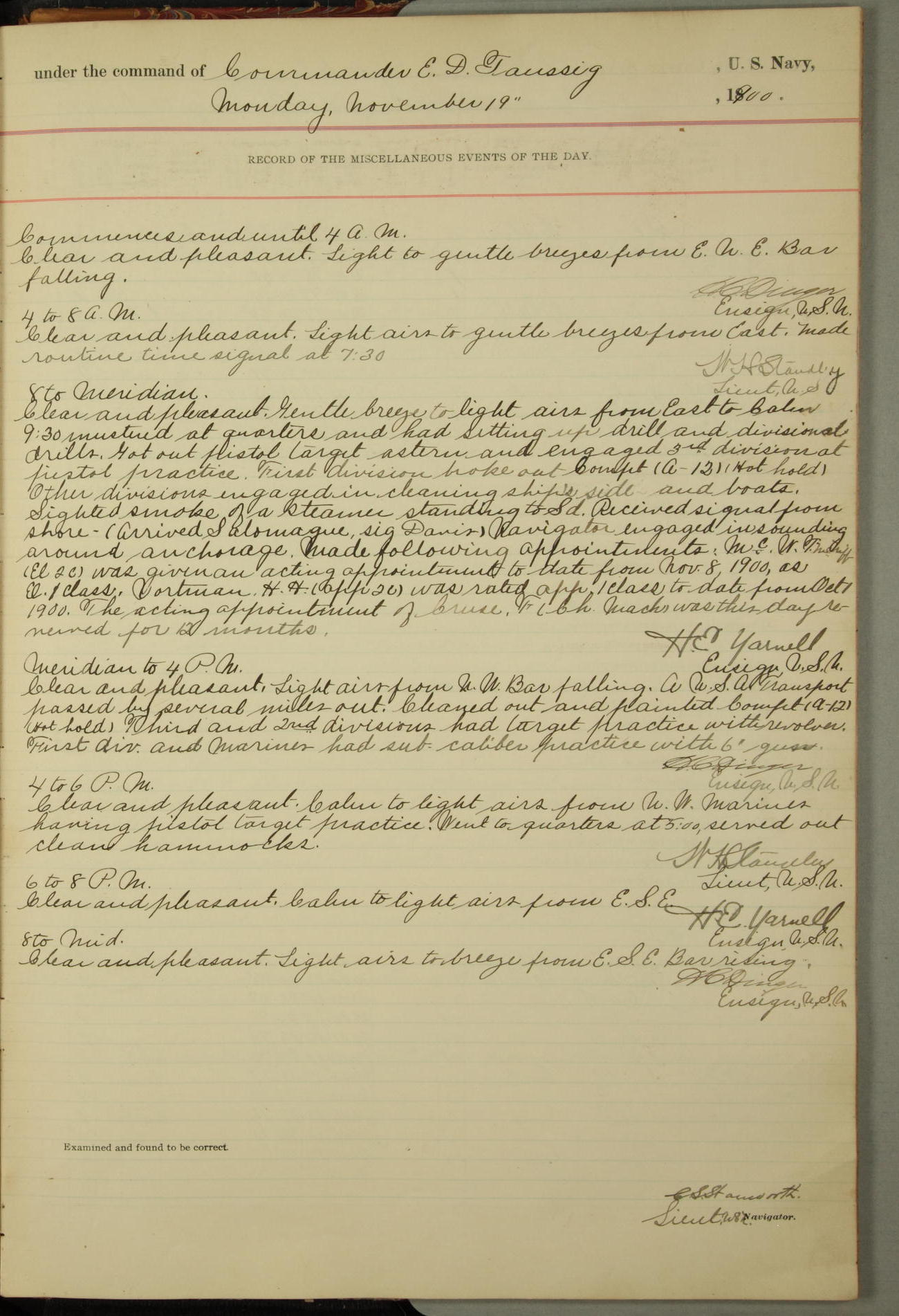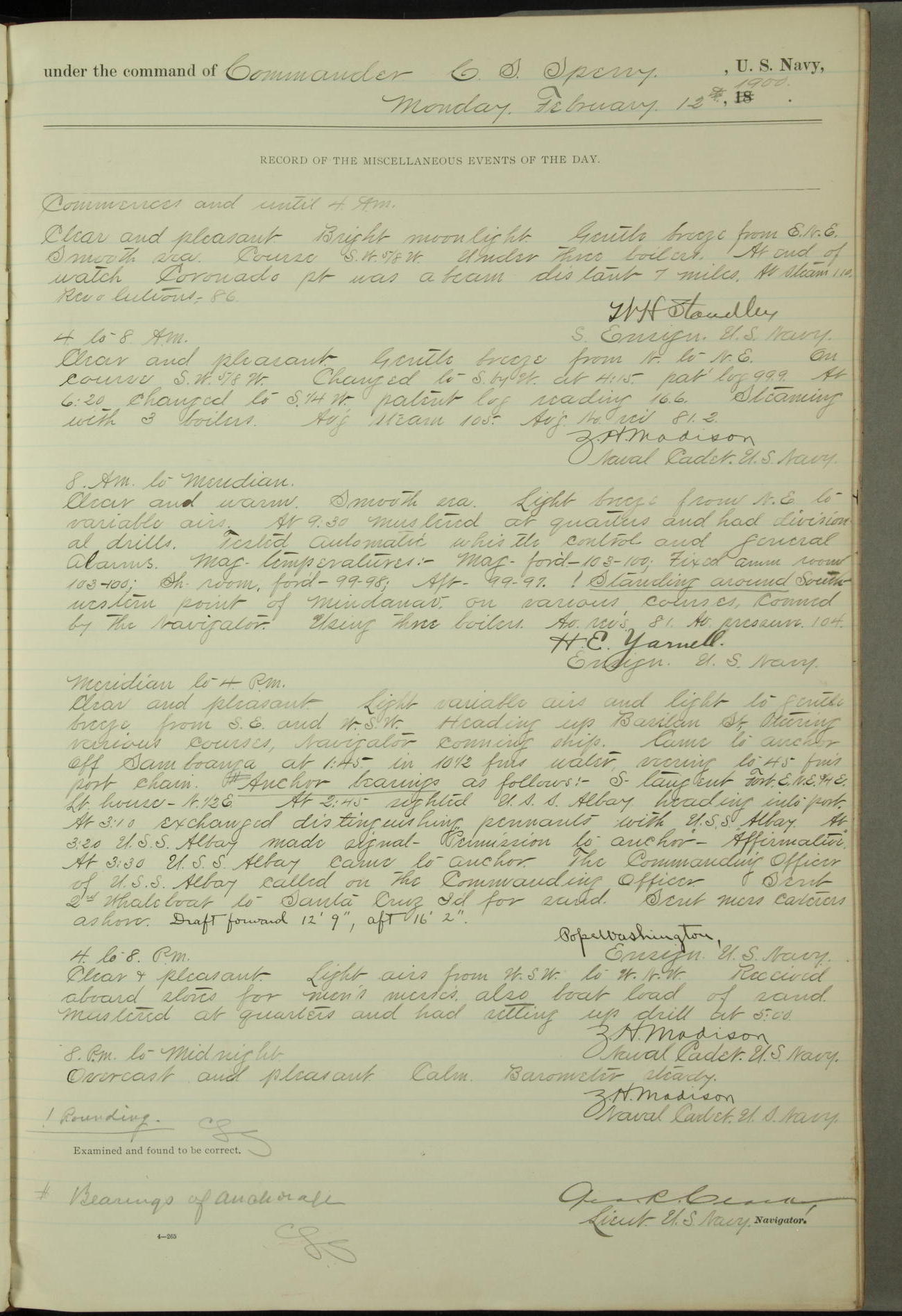 Commanding Officer awarded the following punishments: P.M. Anderson, Coal Passer, reduced to 2nd [conduct] class, for ½ hour over time; A. Kelly, Coxswain, 4th [conduct] class and 2 days' extra duty, for 12 hours over time and tight; H. Milan, Machinist First-class, 3rd [conduct] class and 1 day's extra duty, for 3 hours over time and drunk.