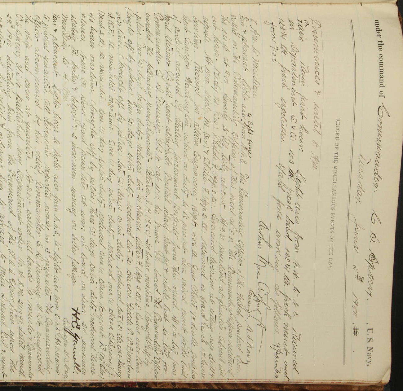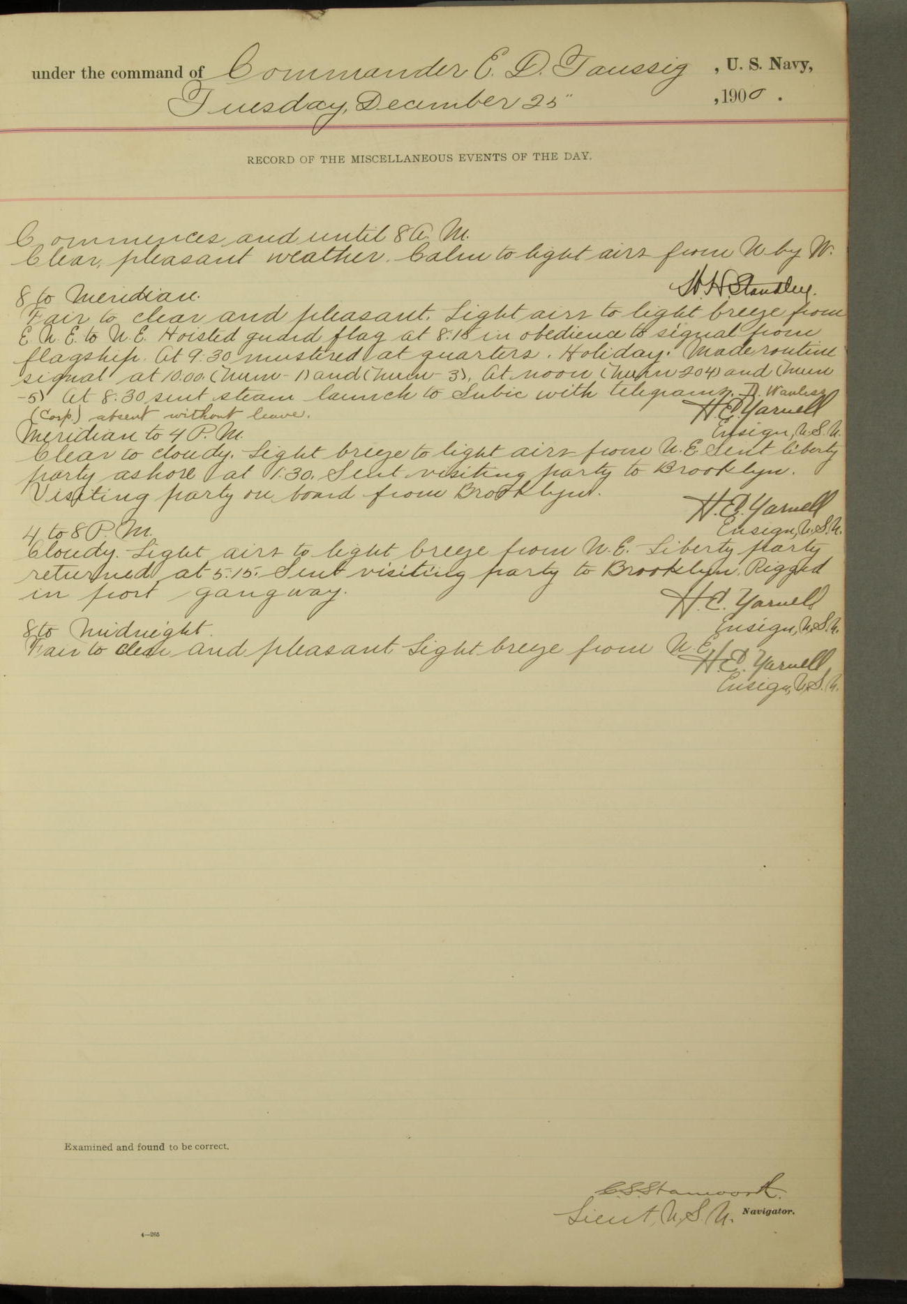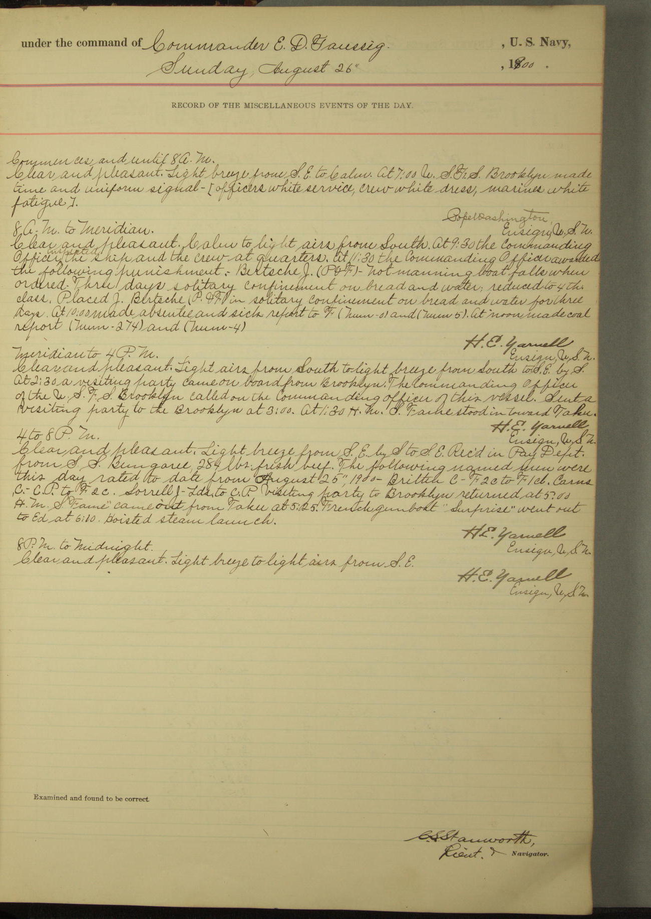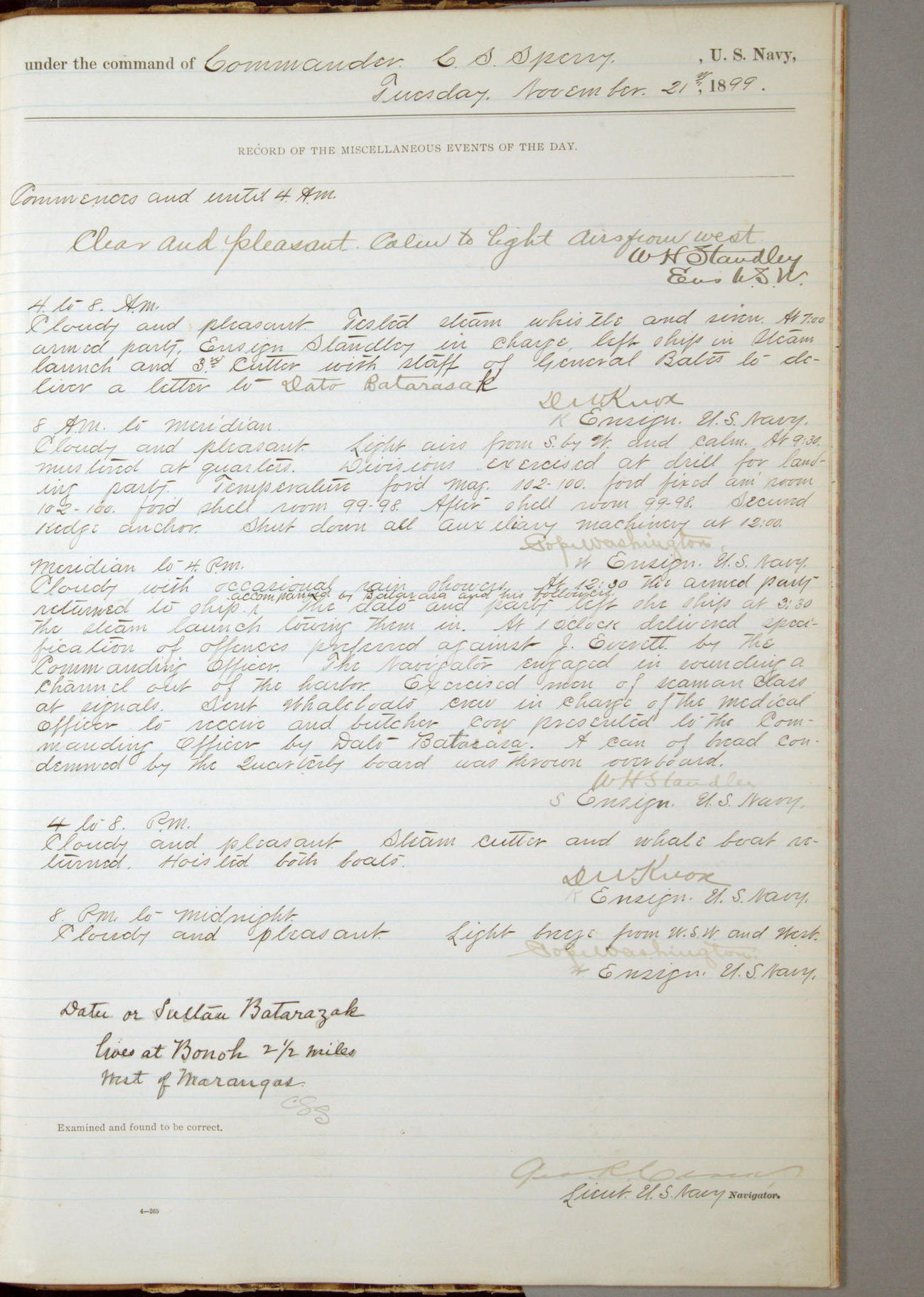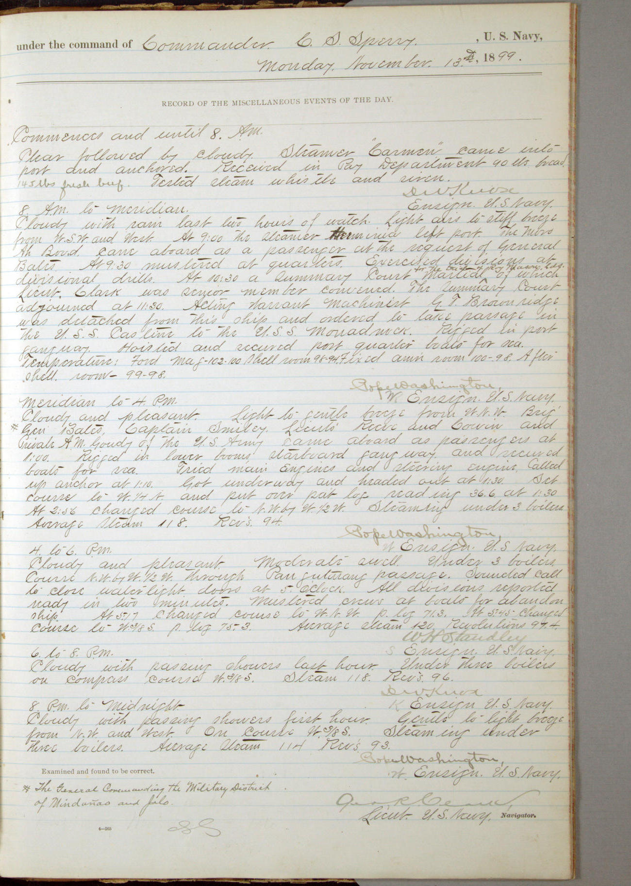 Commanding Officer awarded the following punishments: P.M. Anderson, Coal Passer, reduced to 2nd [conduct] class, for ½ hour over time; A. Kelly, Coxswain, 4th [conduct] class and 2 days' extra duty, for 12 hours over time and tight; H. Milan, Machinist First-class, 3rd [conduct] class and 1 day's extra duty, for 3 hours over time and drunk.