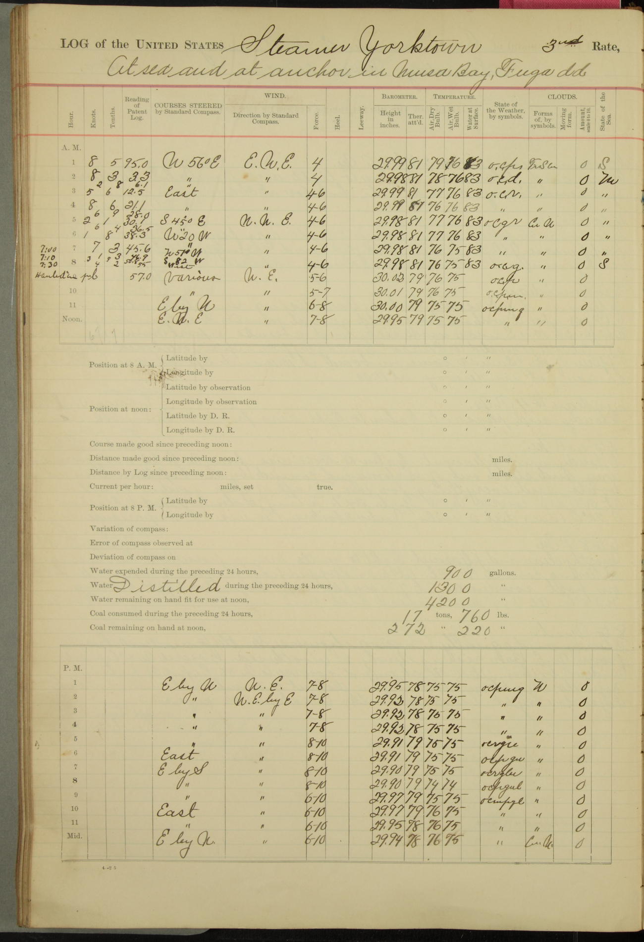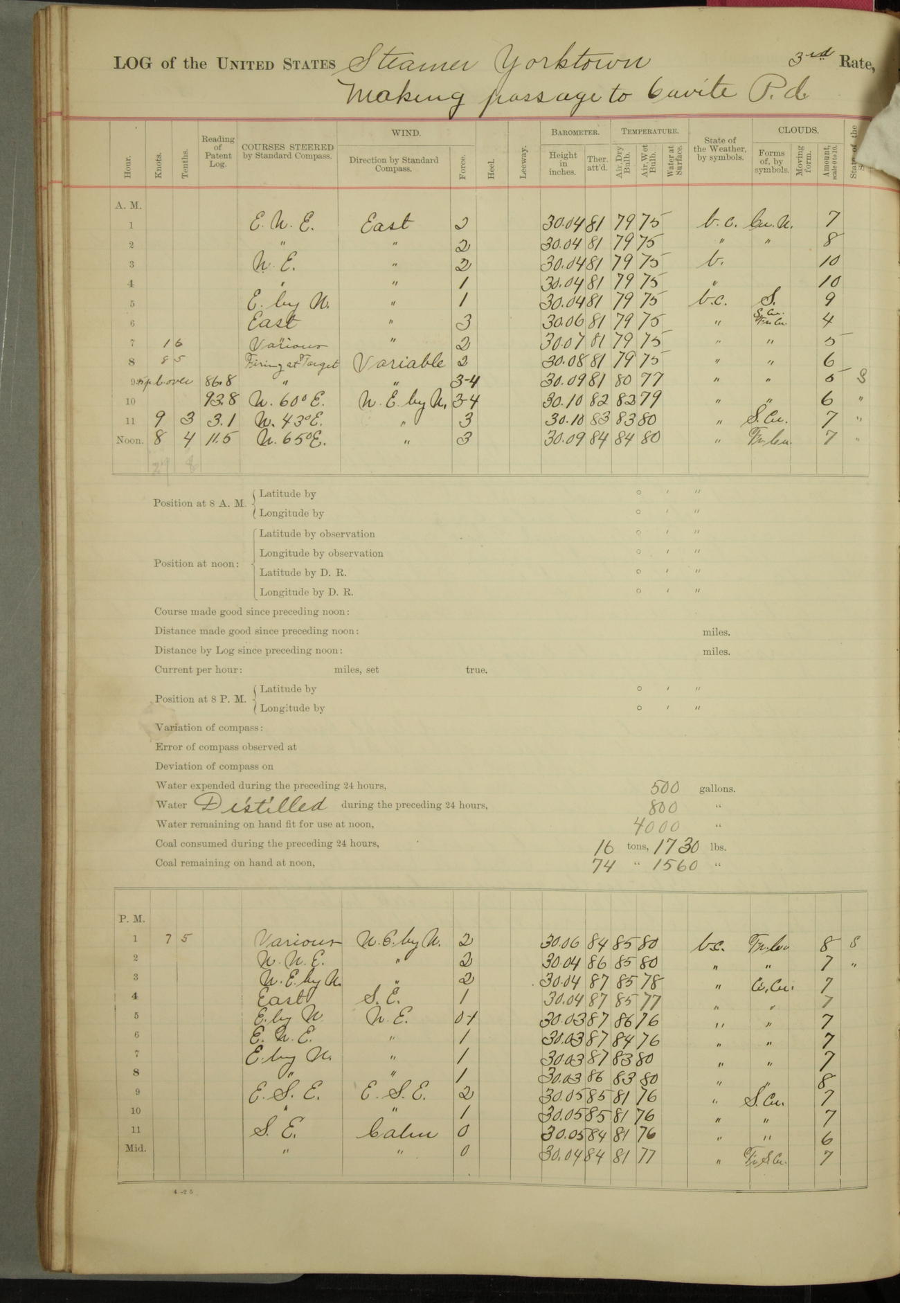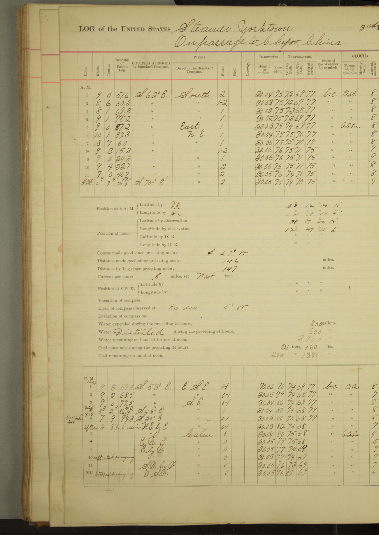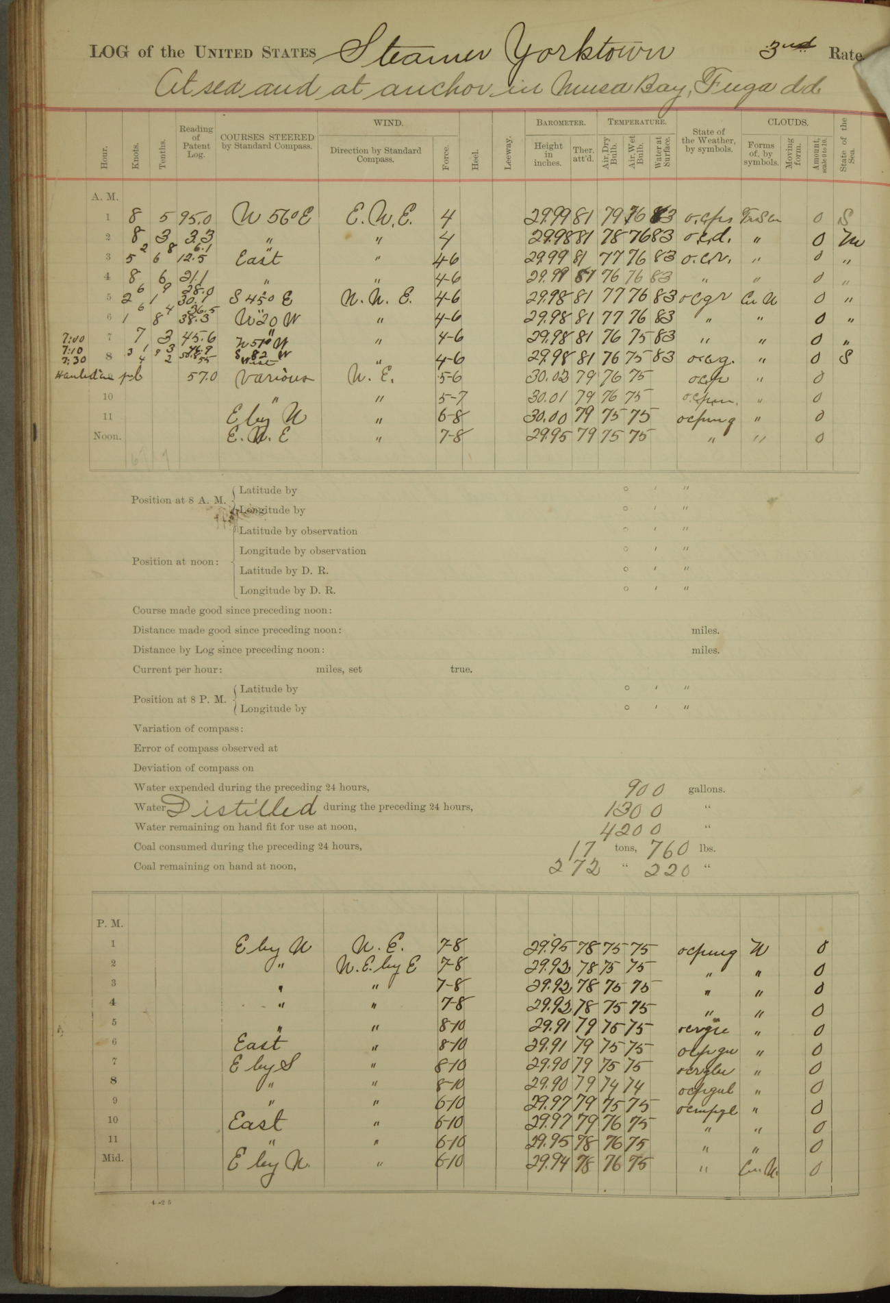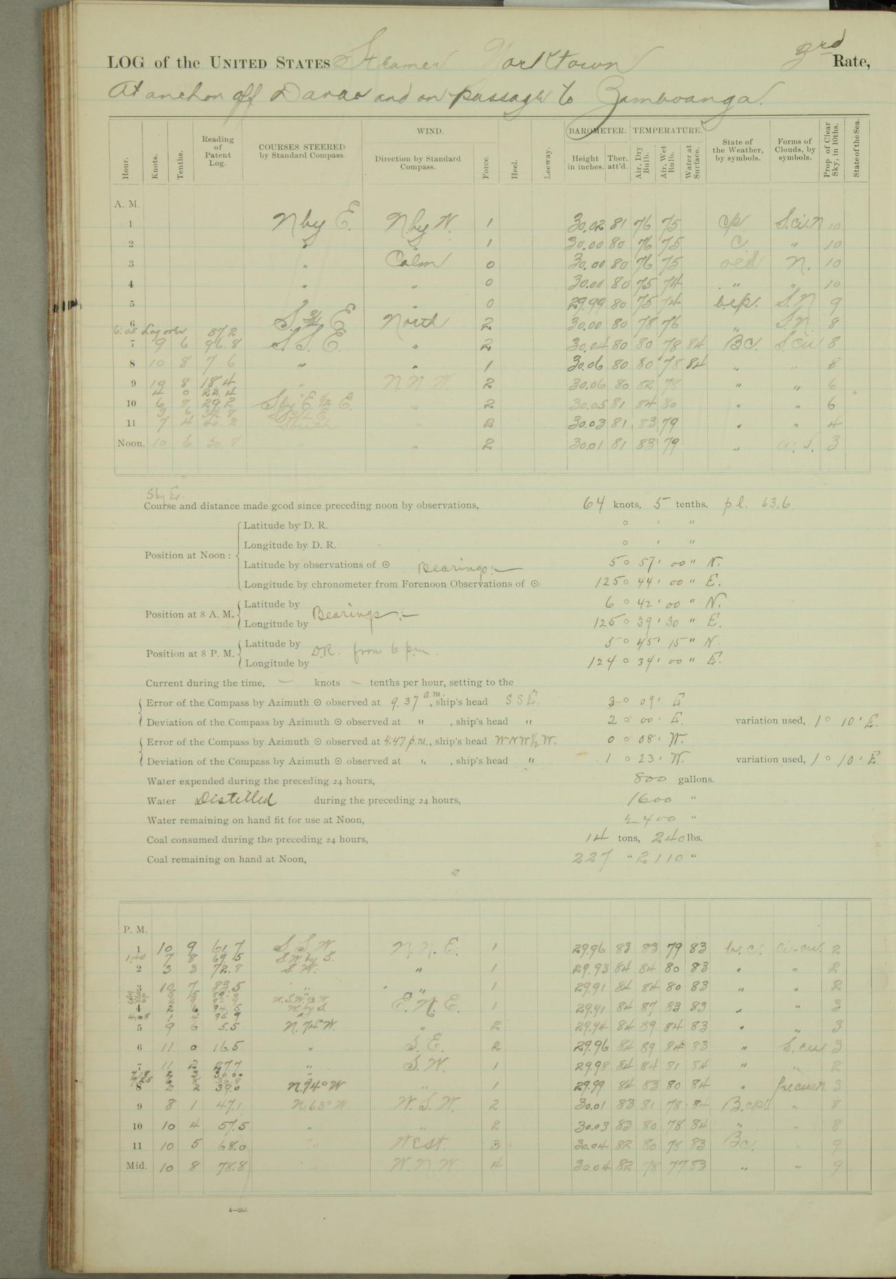Under [steam from] 3 boilers, course N76°E per standard compass.