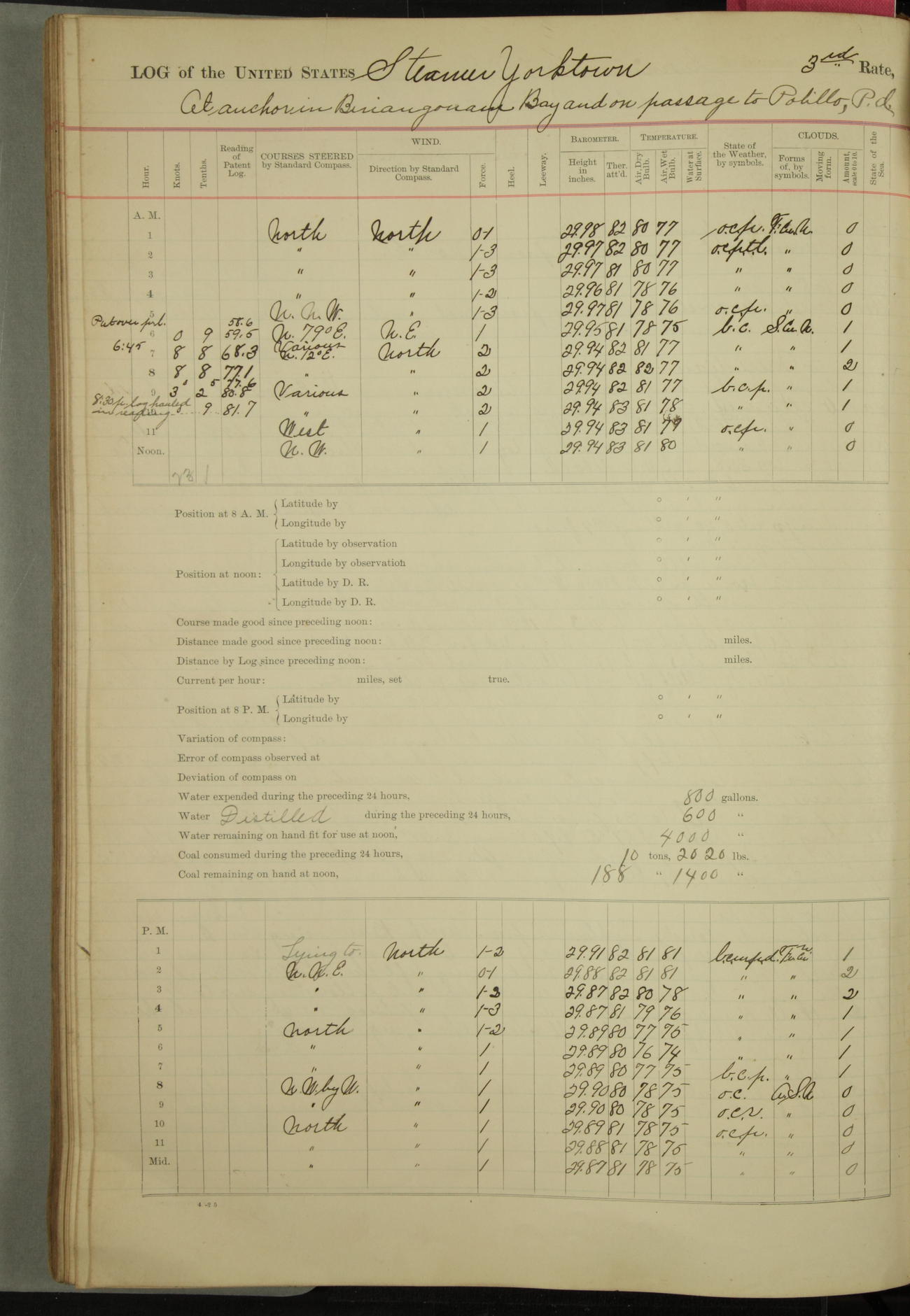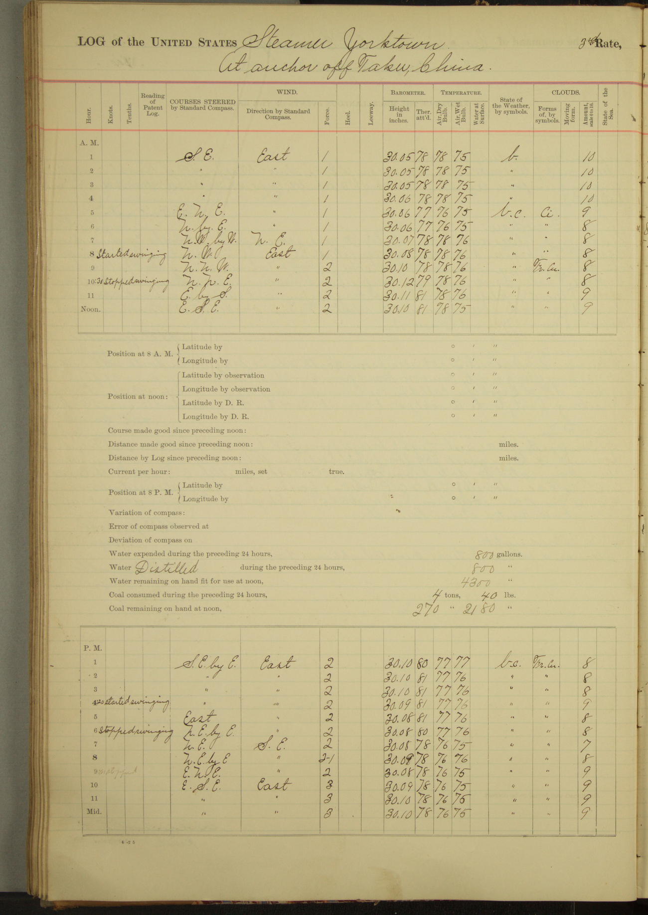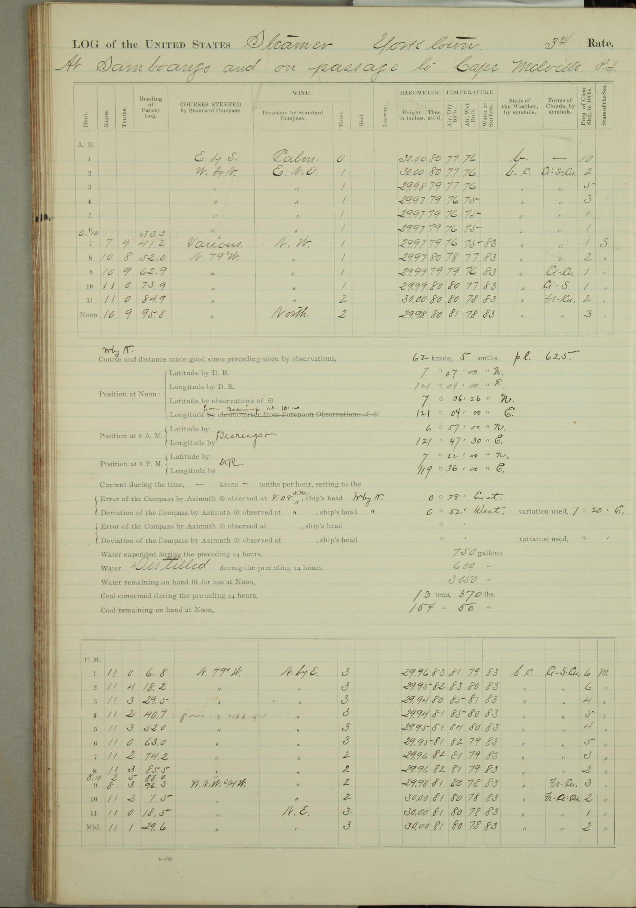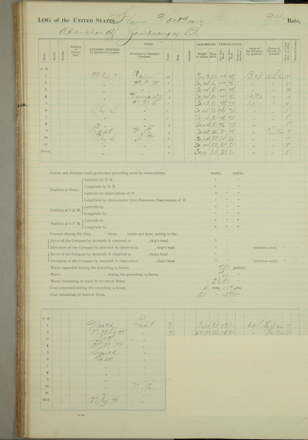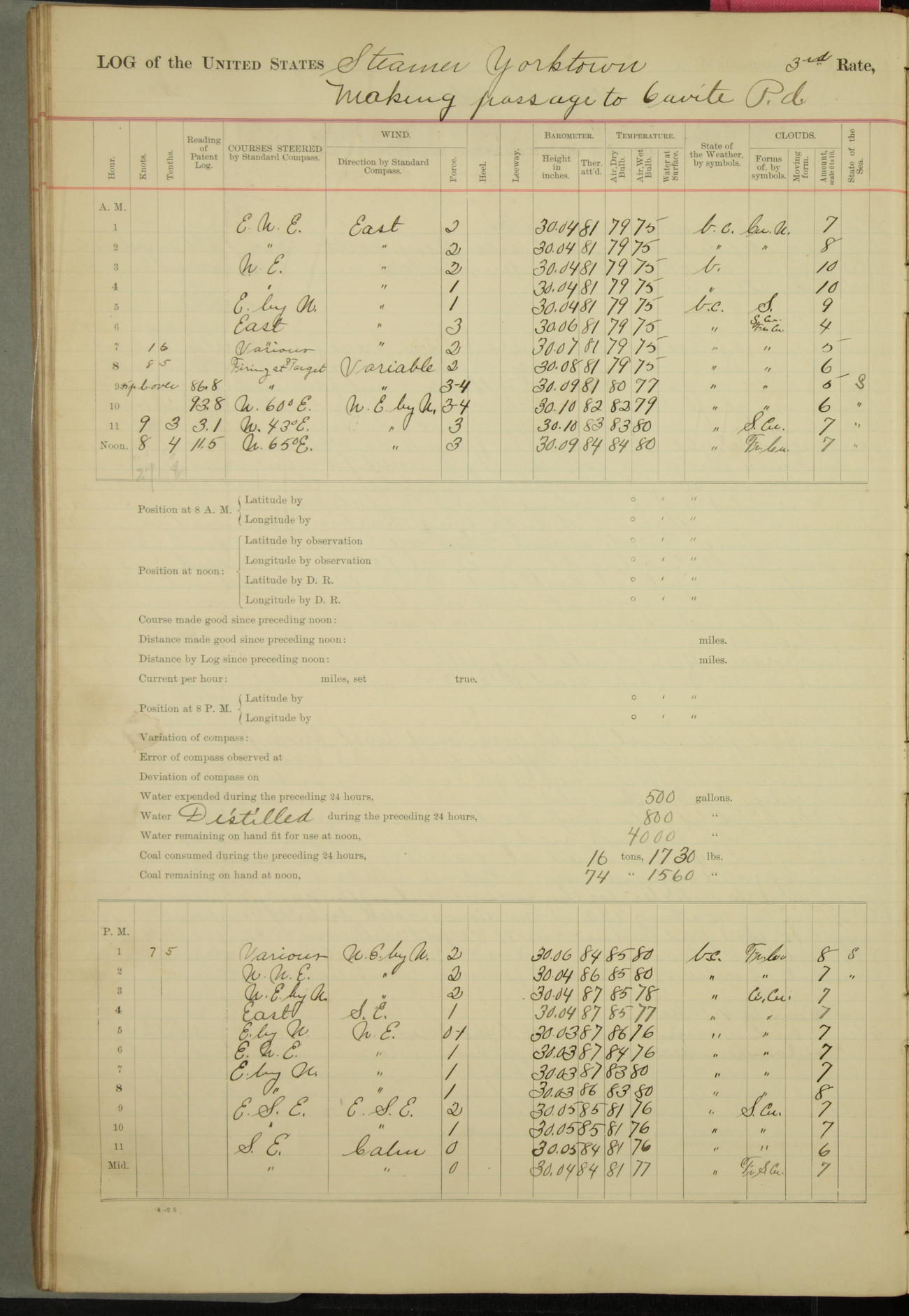 Under [steam from] 3 boilers, course N76°E per standard compass.