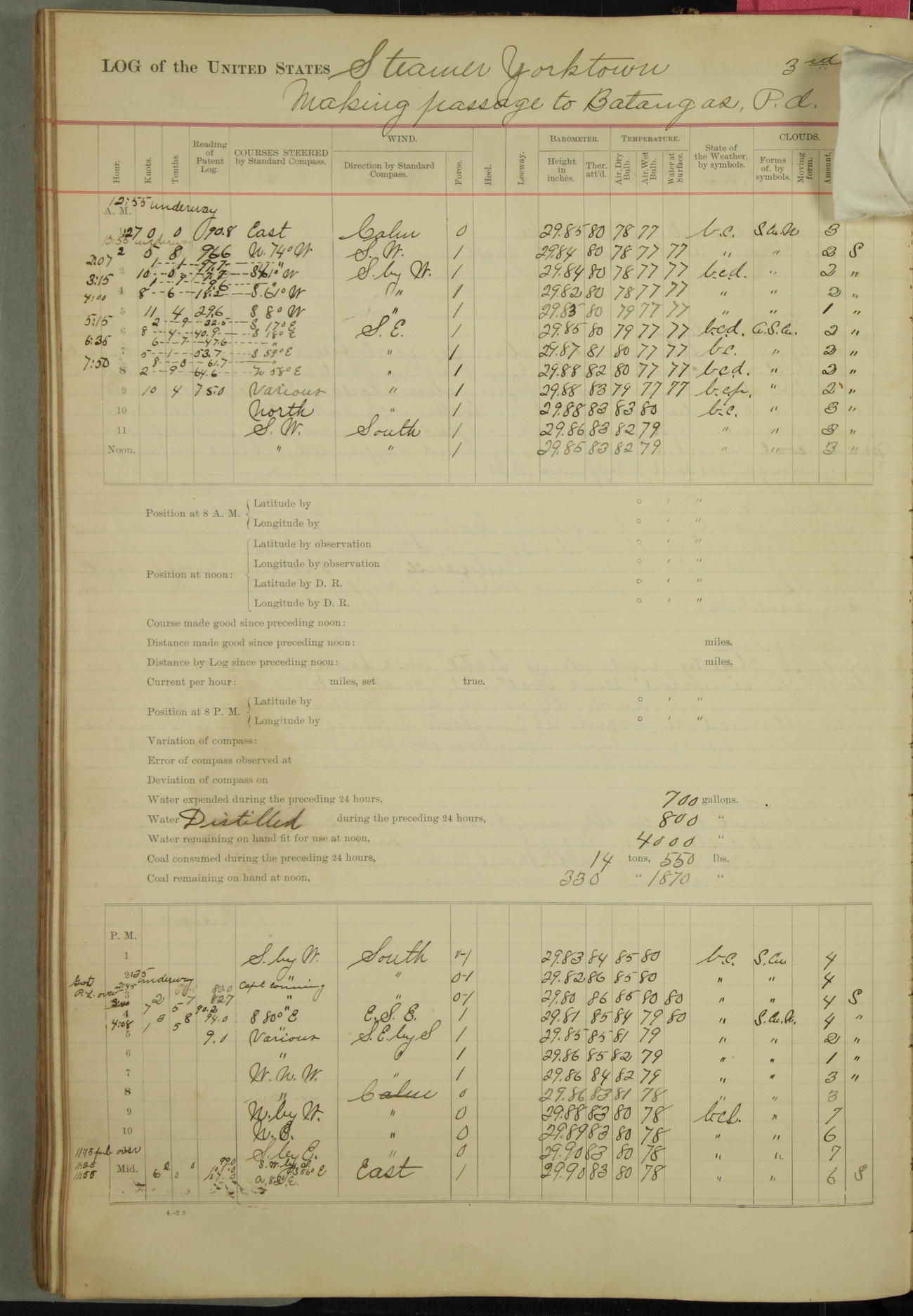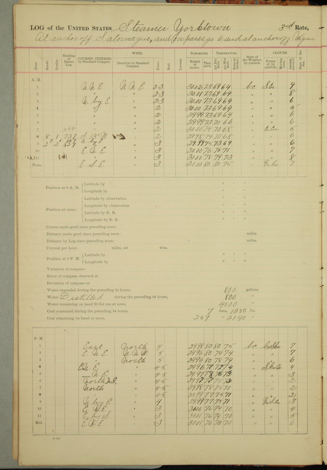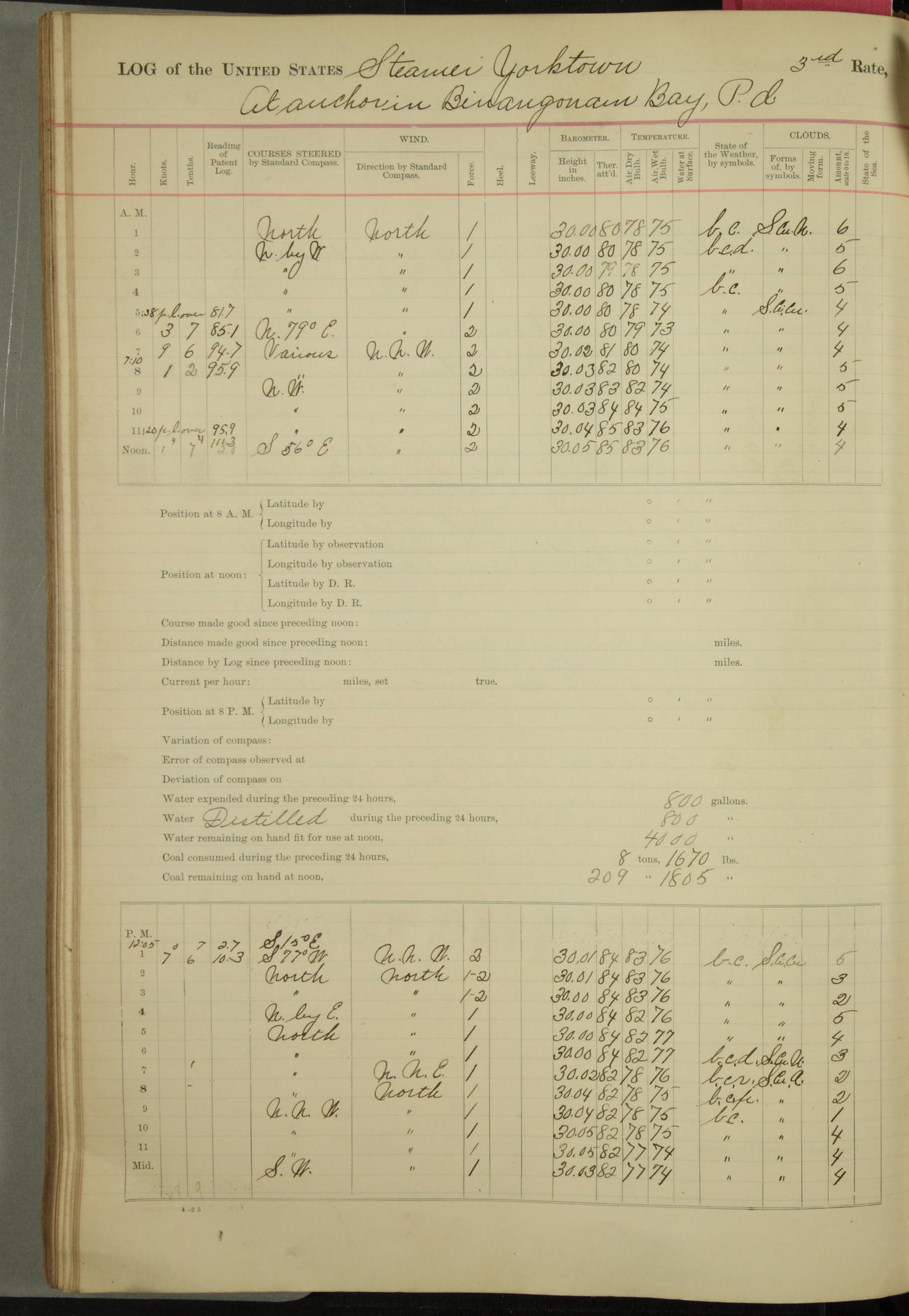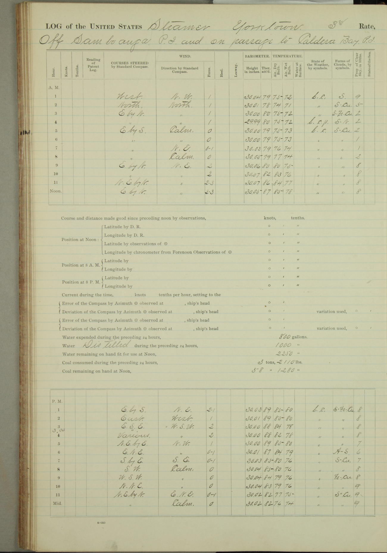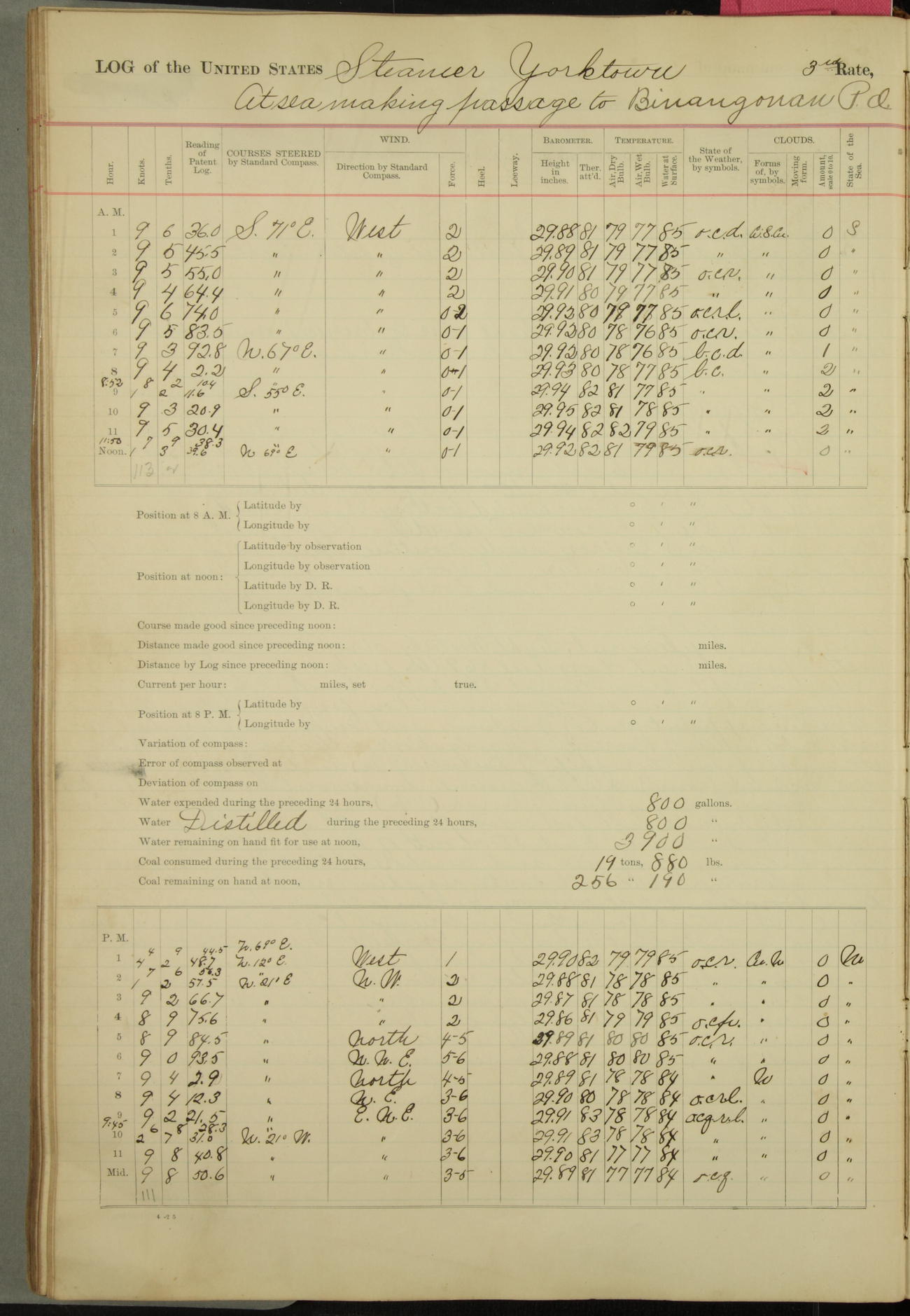 Under [steam from] 3 boilers, course N76°E per standard compass.