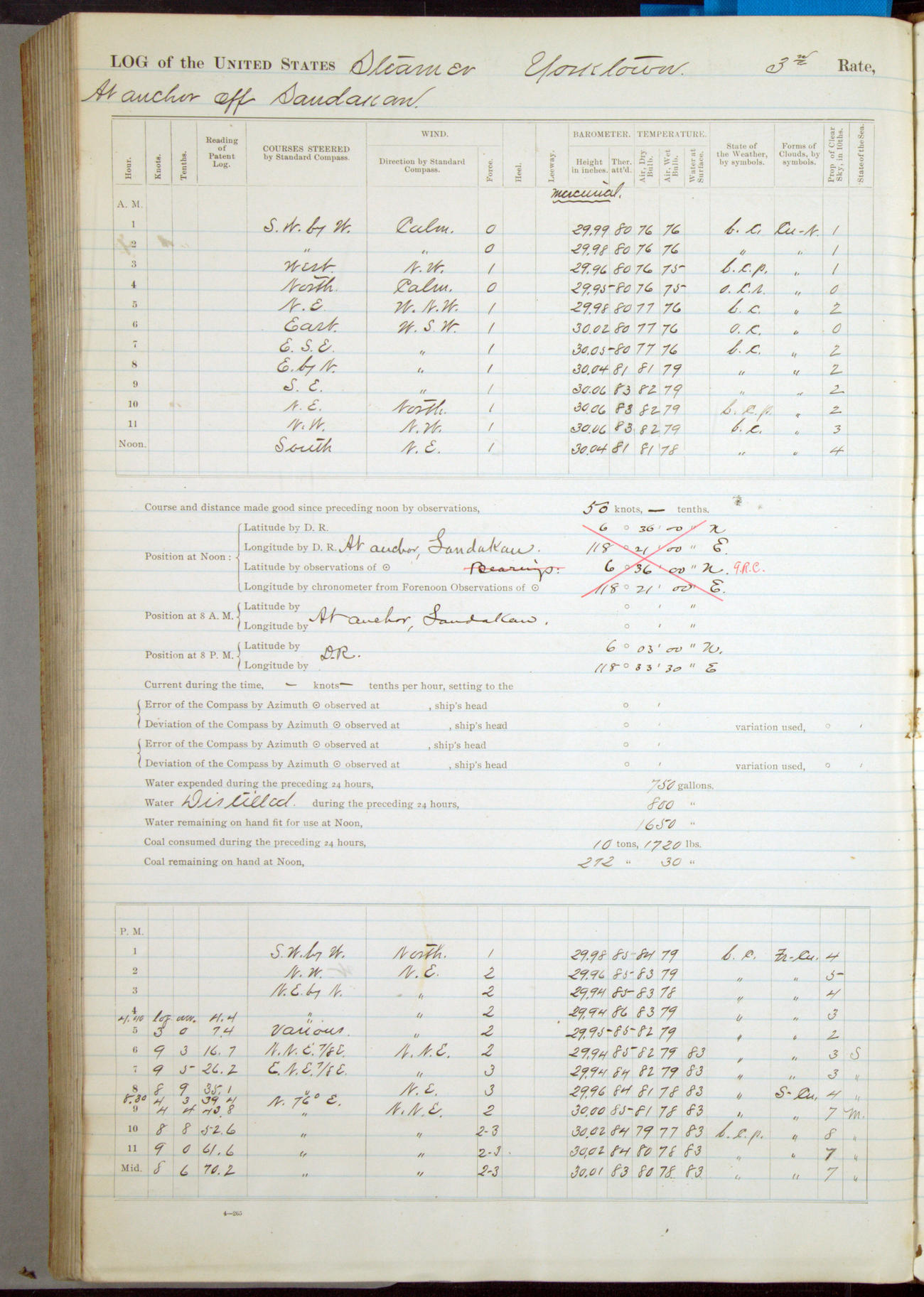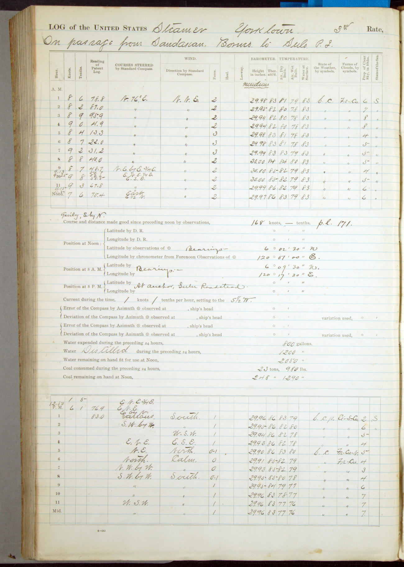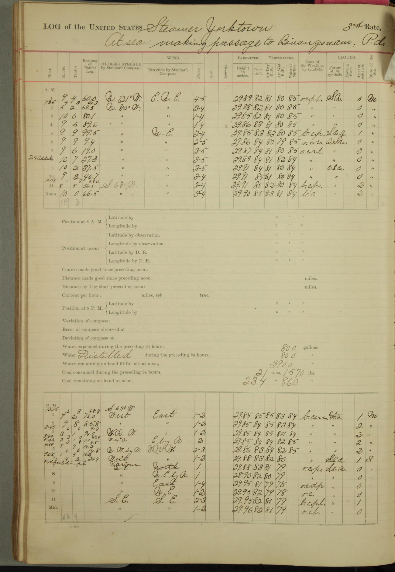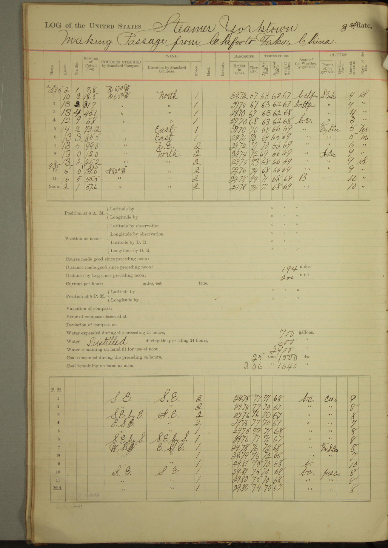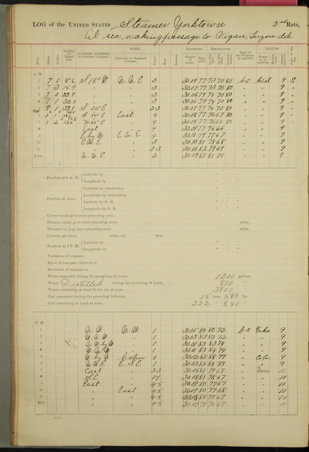 Under [steam from] 3 boilers, course N76°E per standard compass.