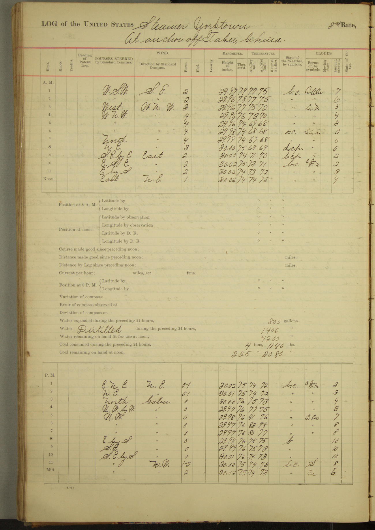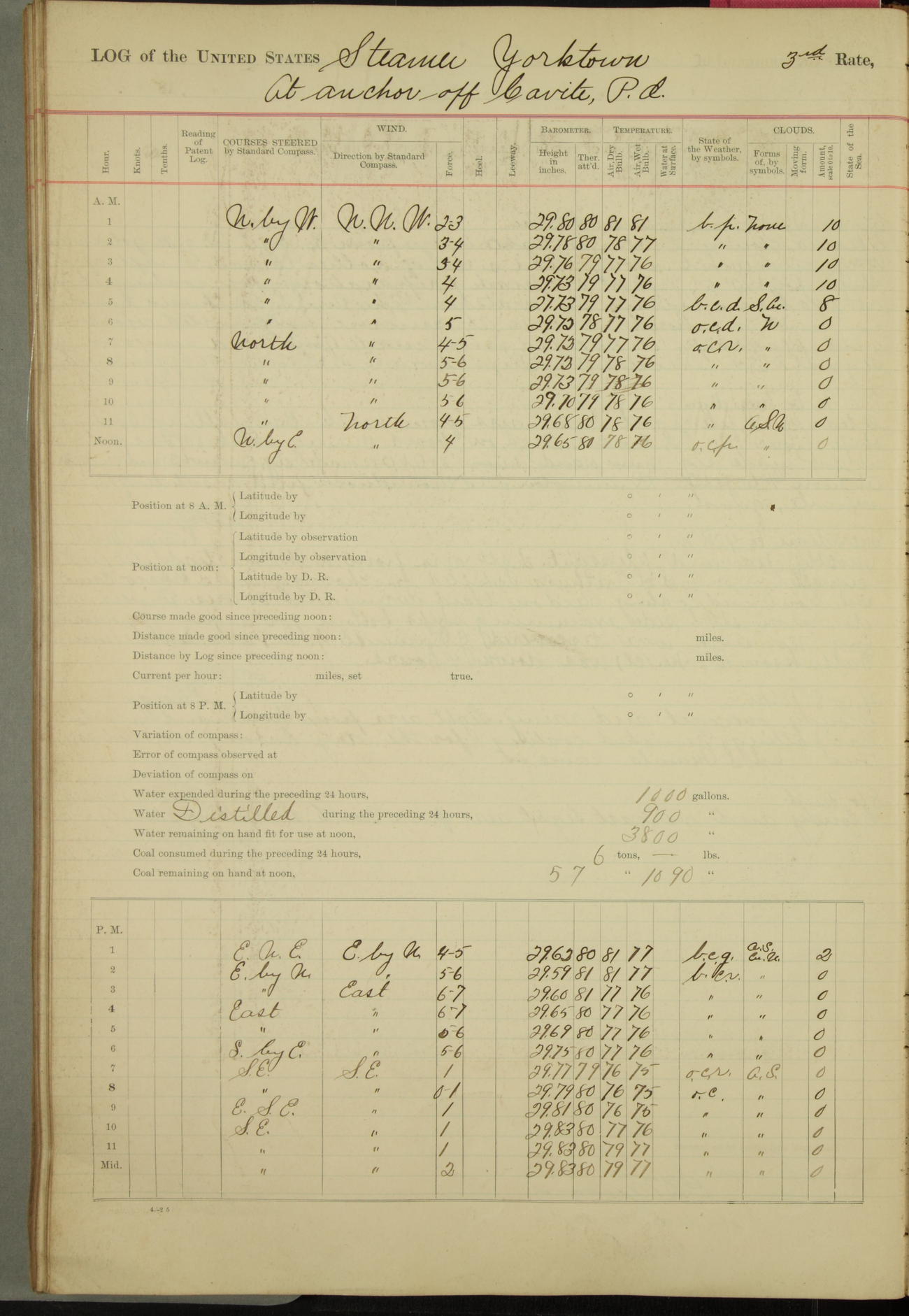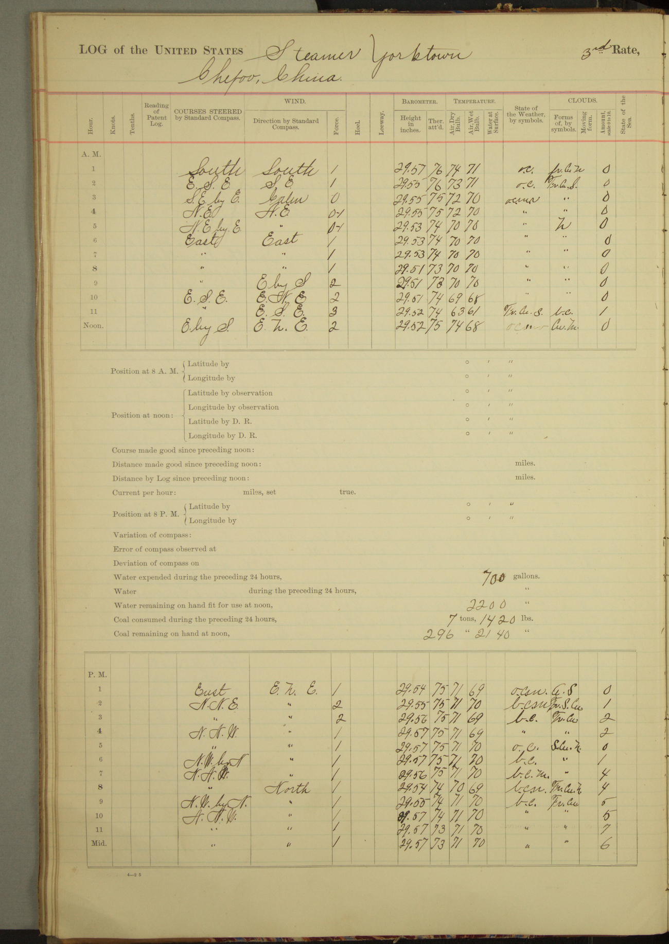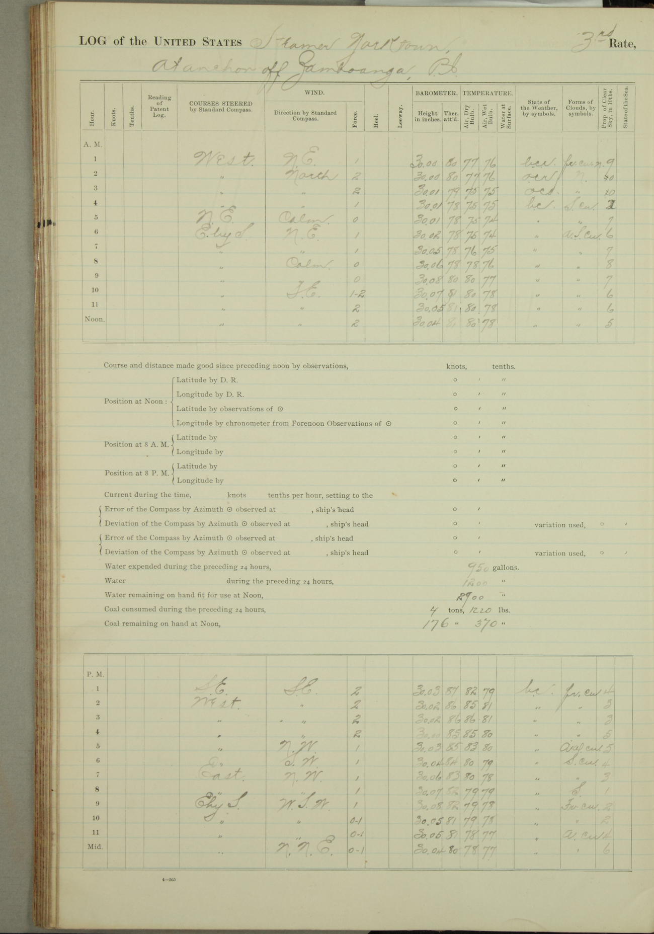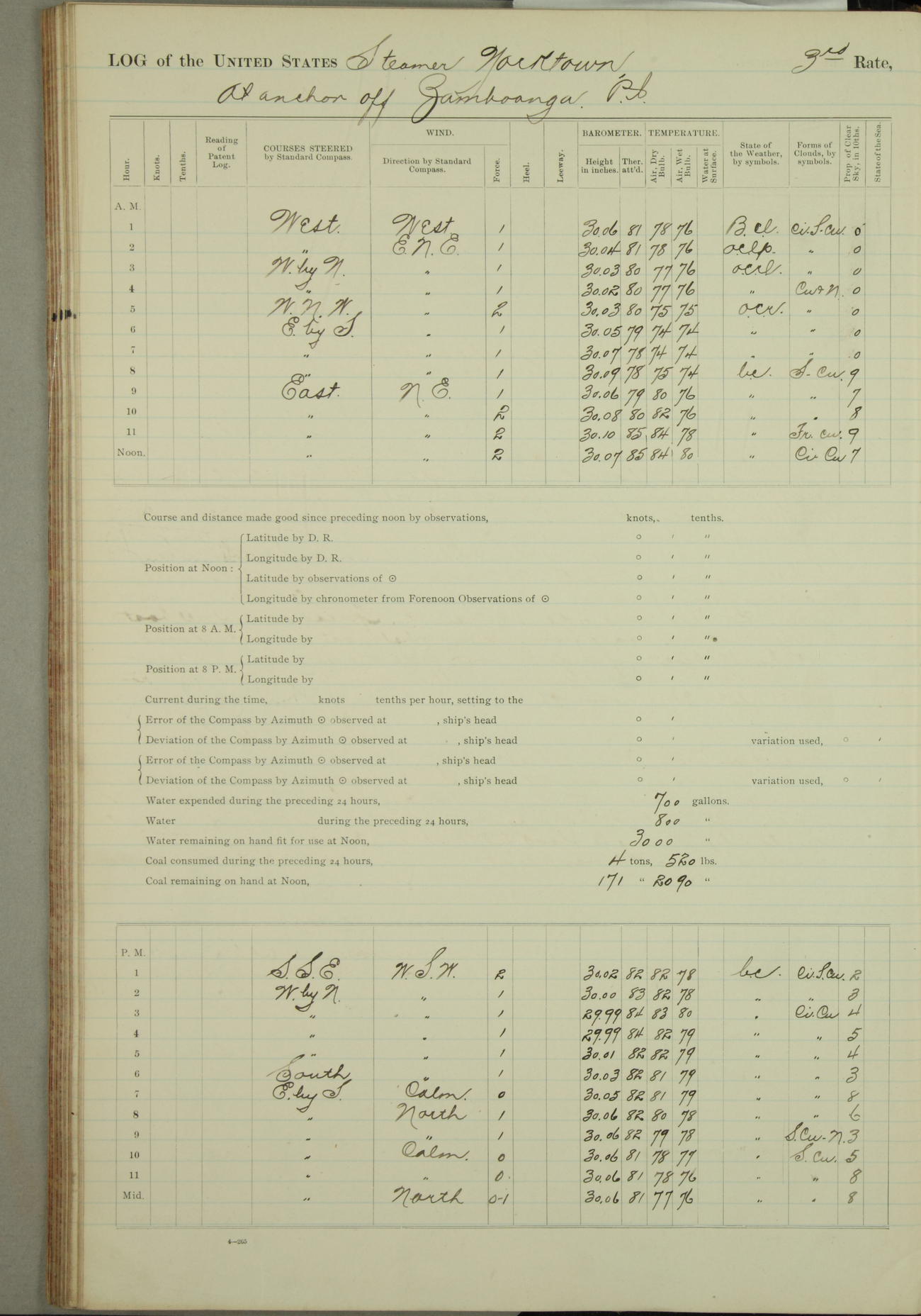 Under [steam from] 3 boilers, course N76°E per standard compass.