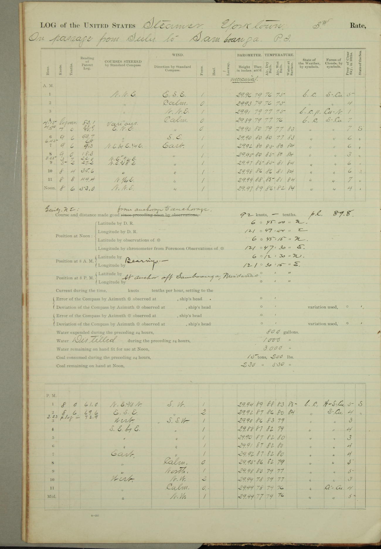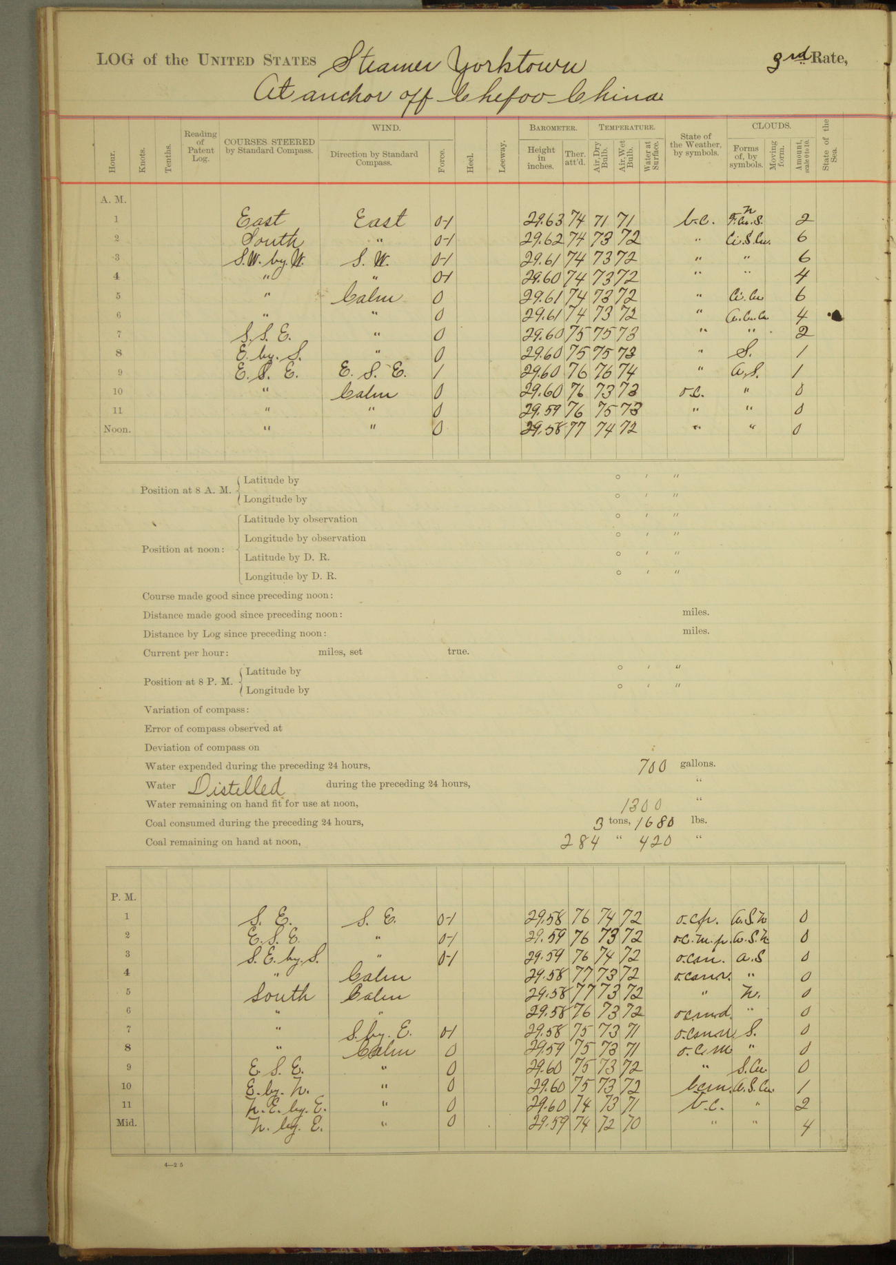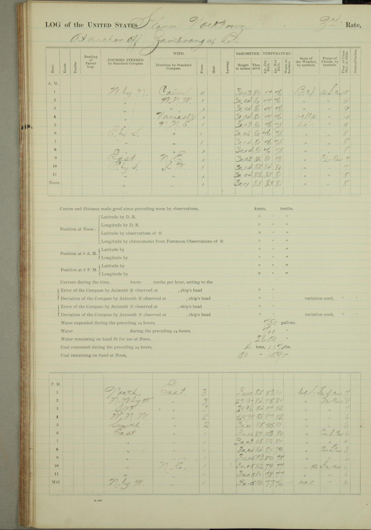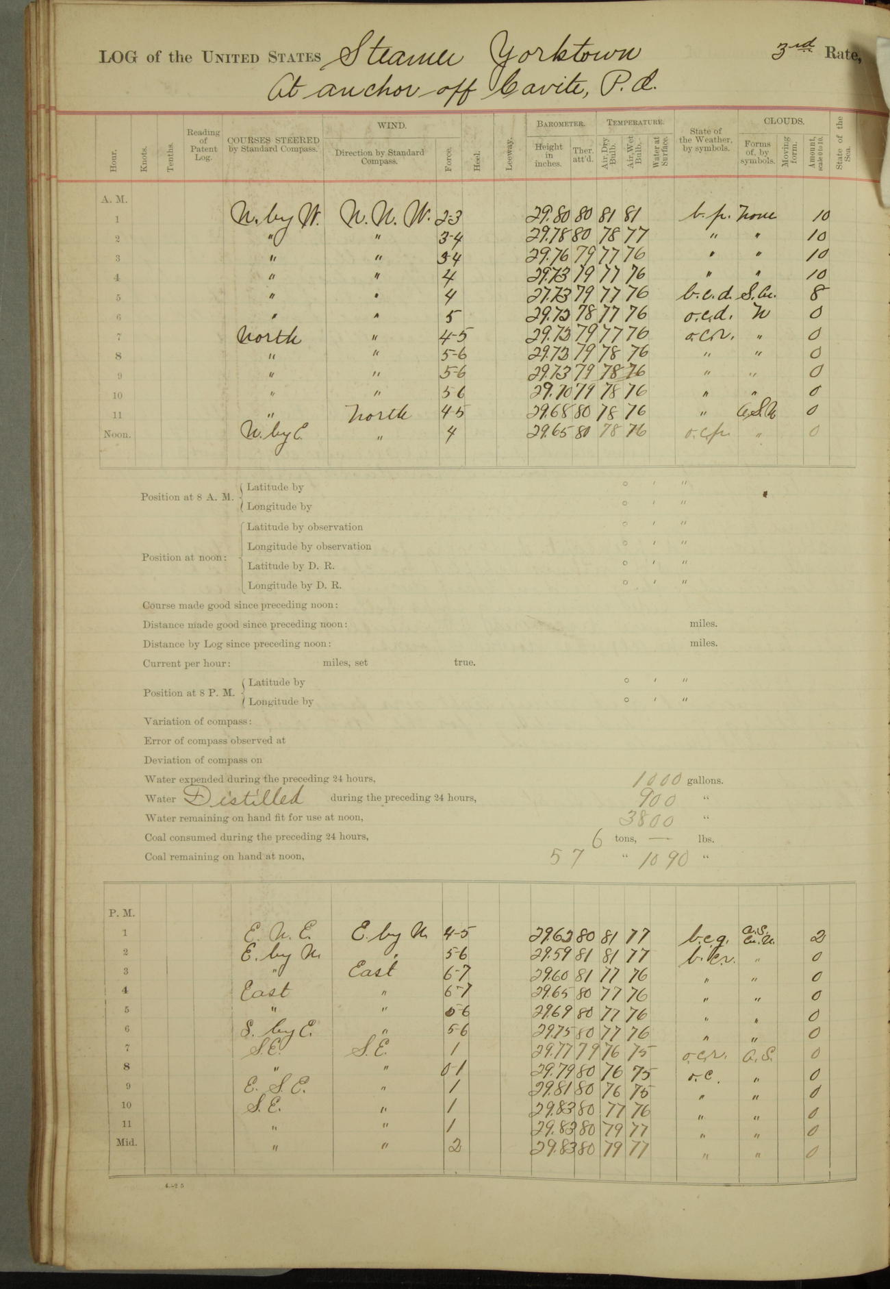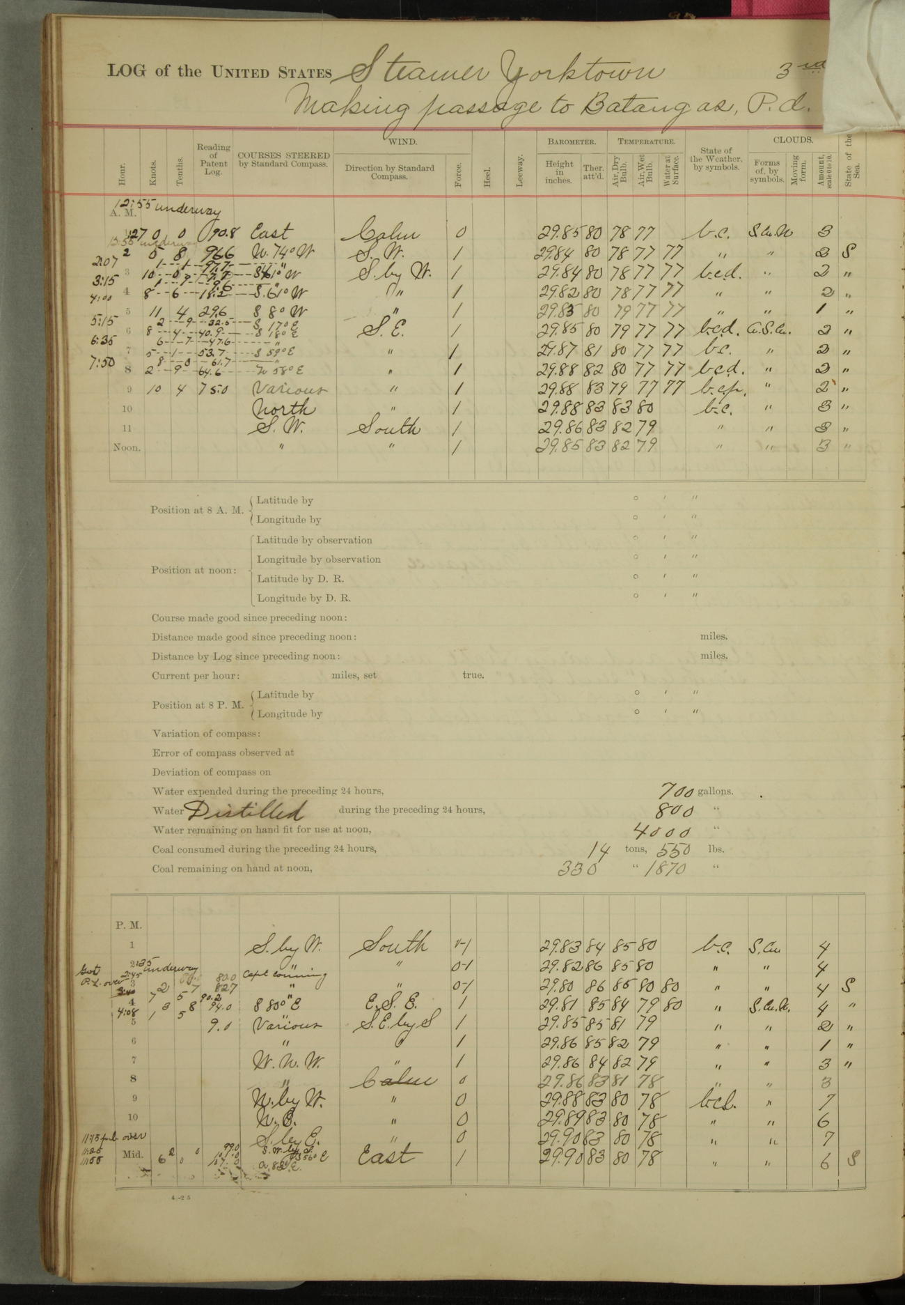 Under [steam from] 3 boilers, course N76°E per standard compass.