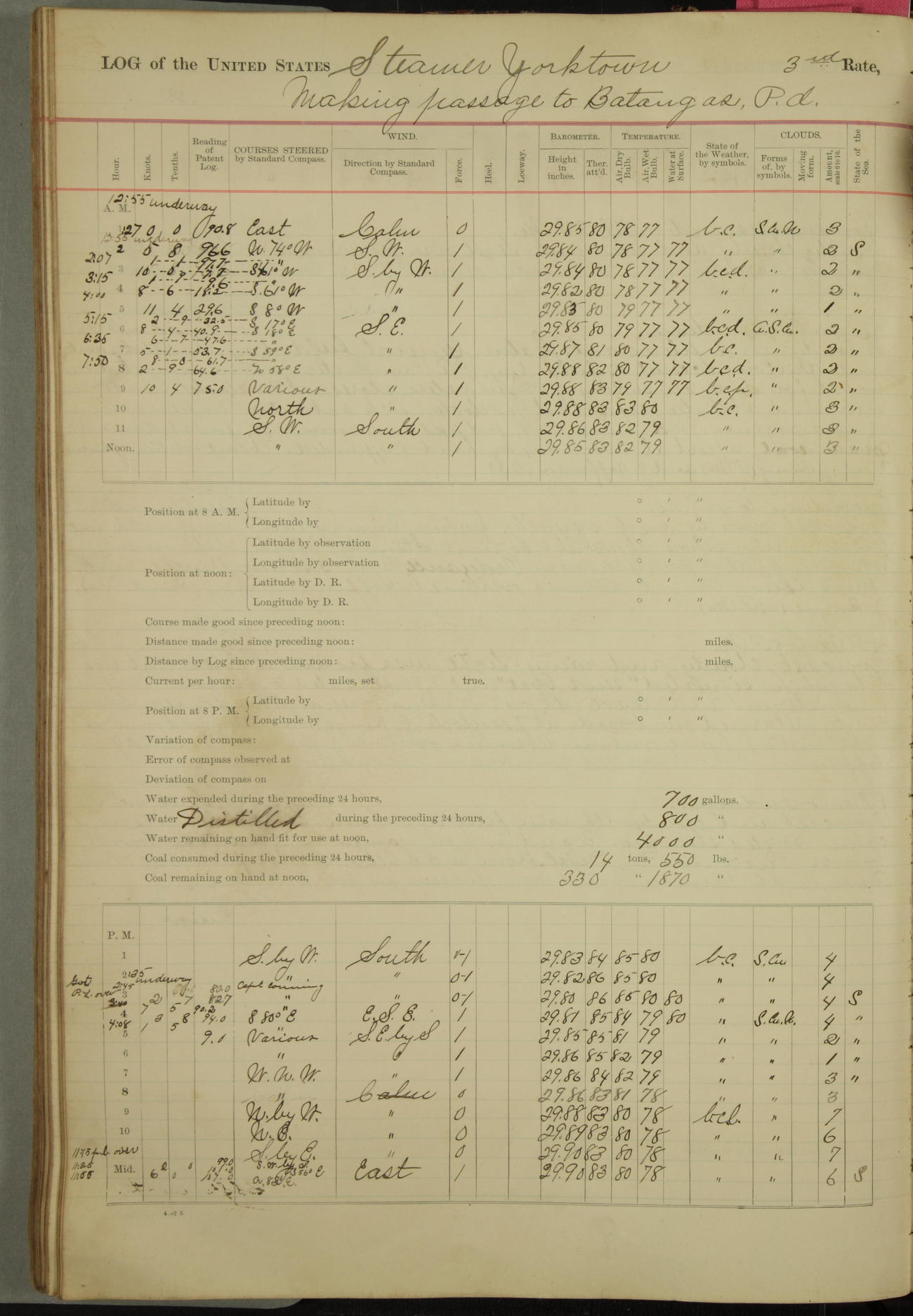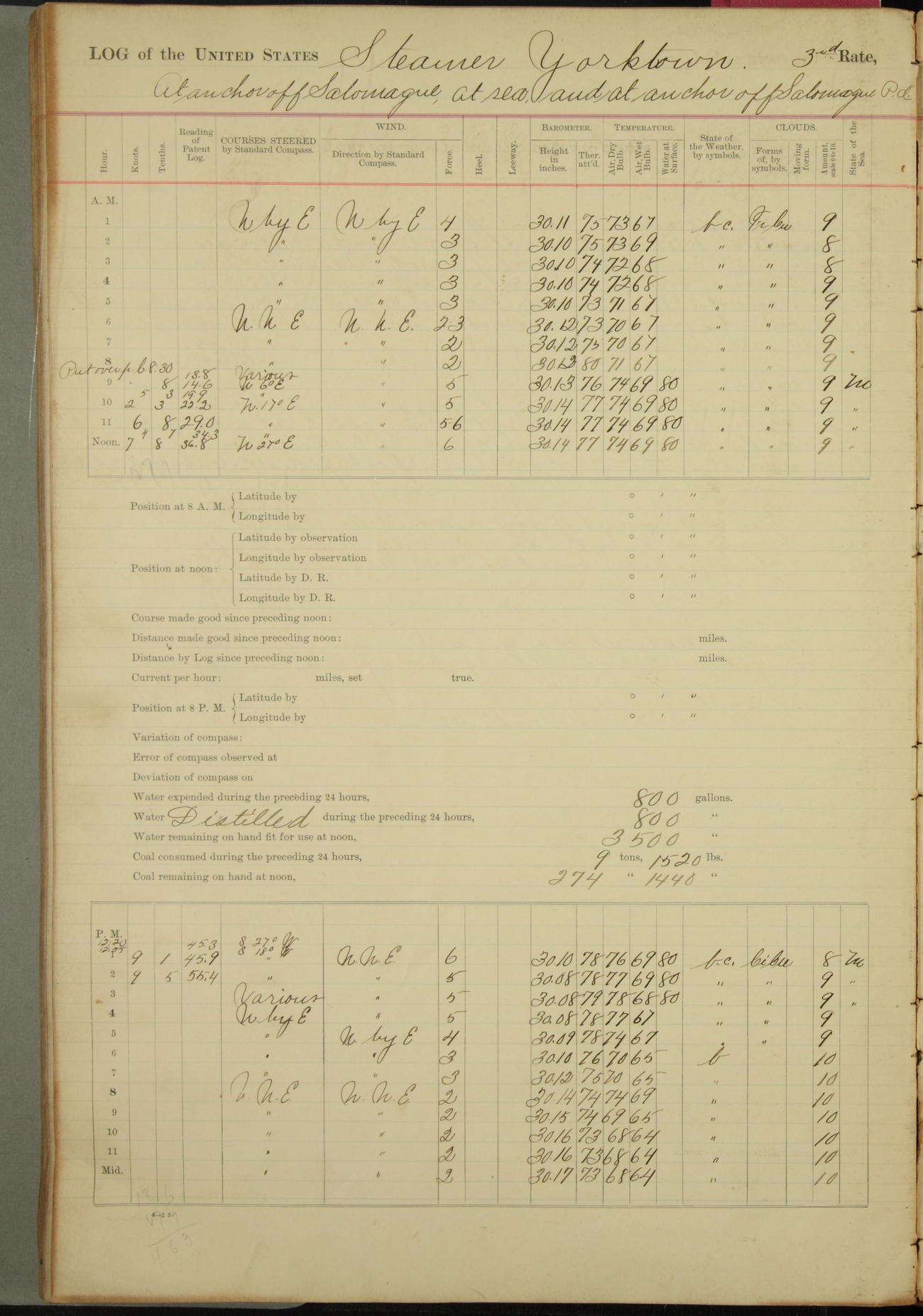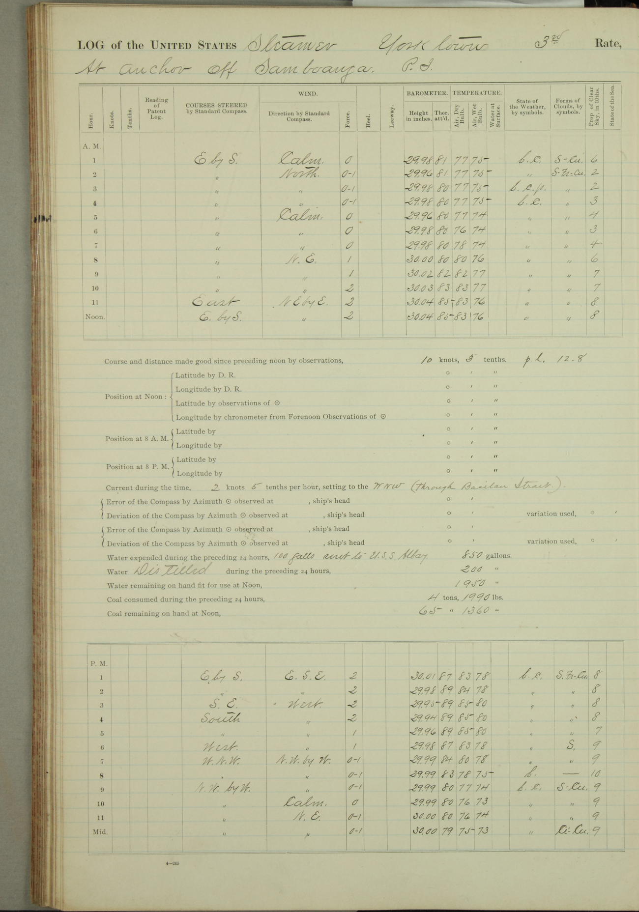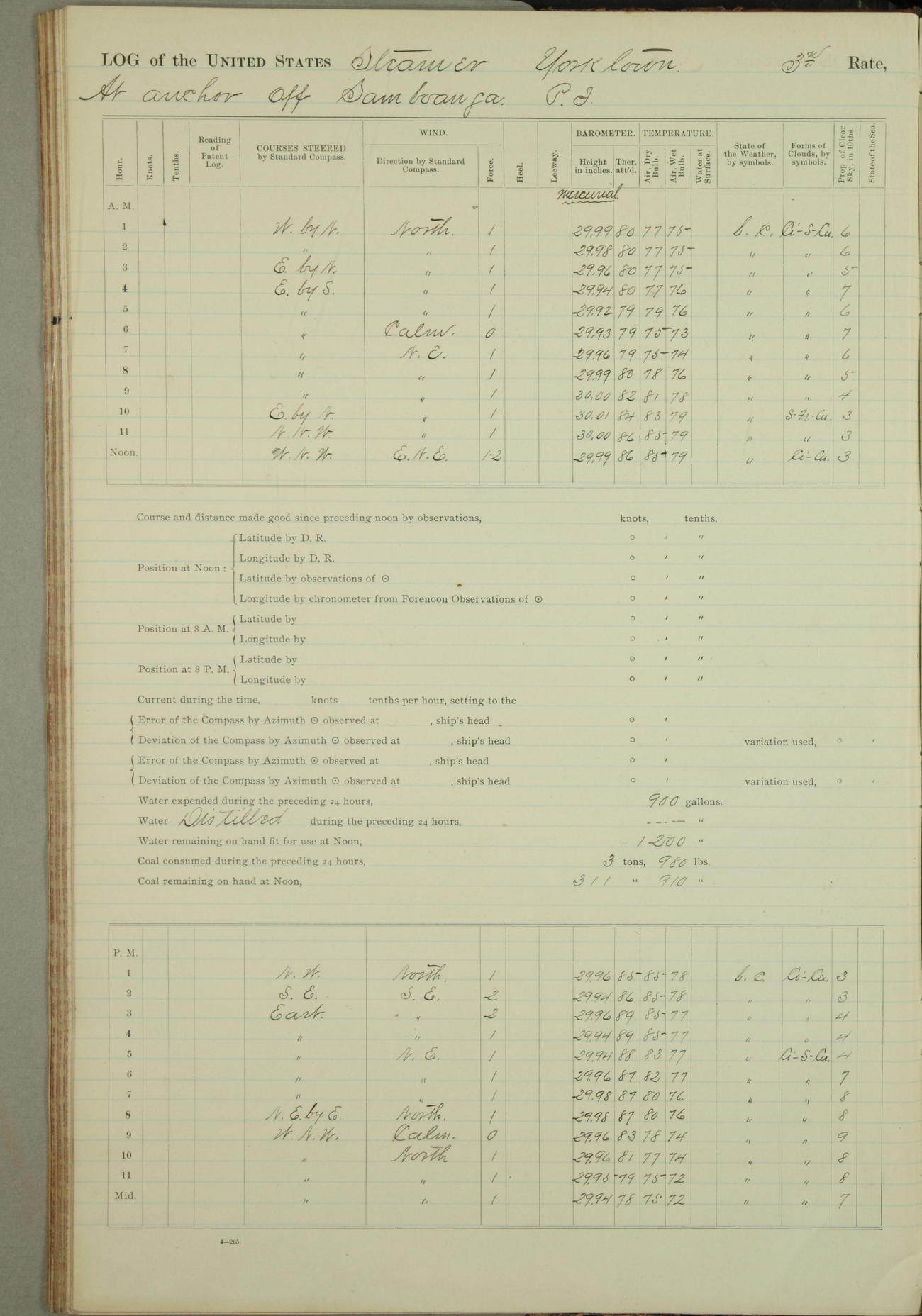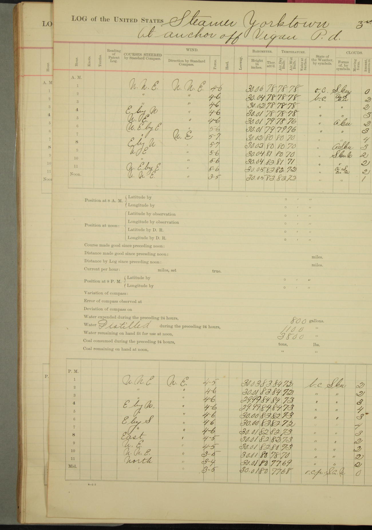 Under [steam from] 3 boilers, course N76°E per standard compass.