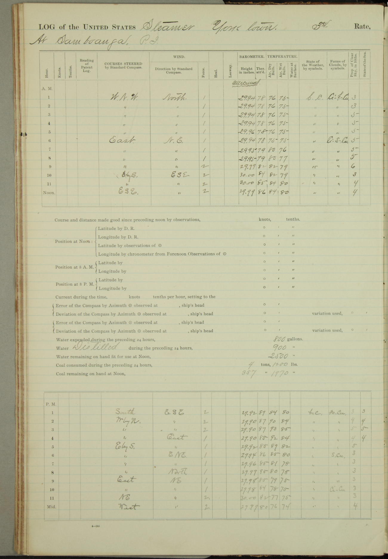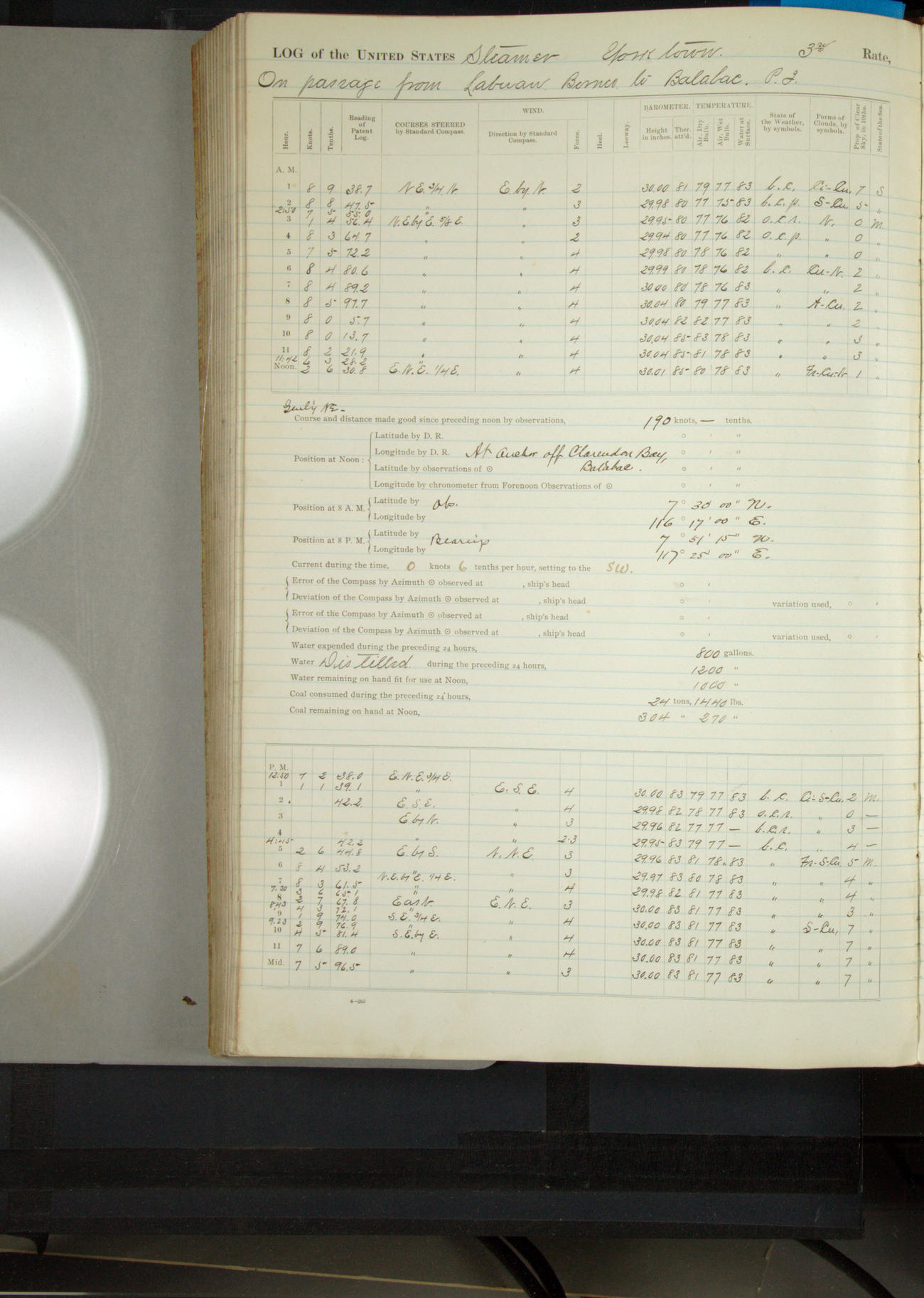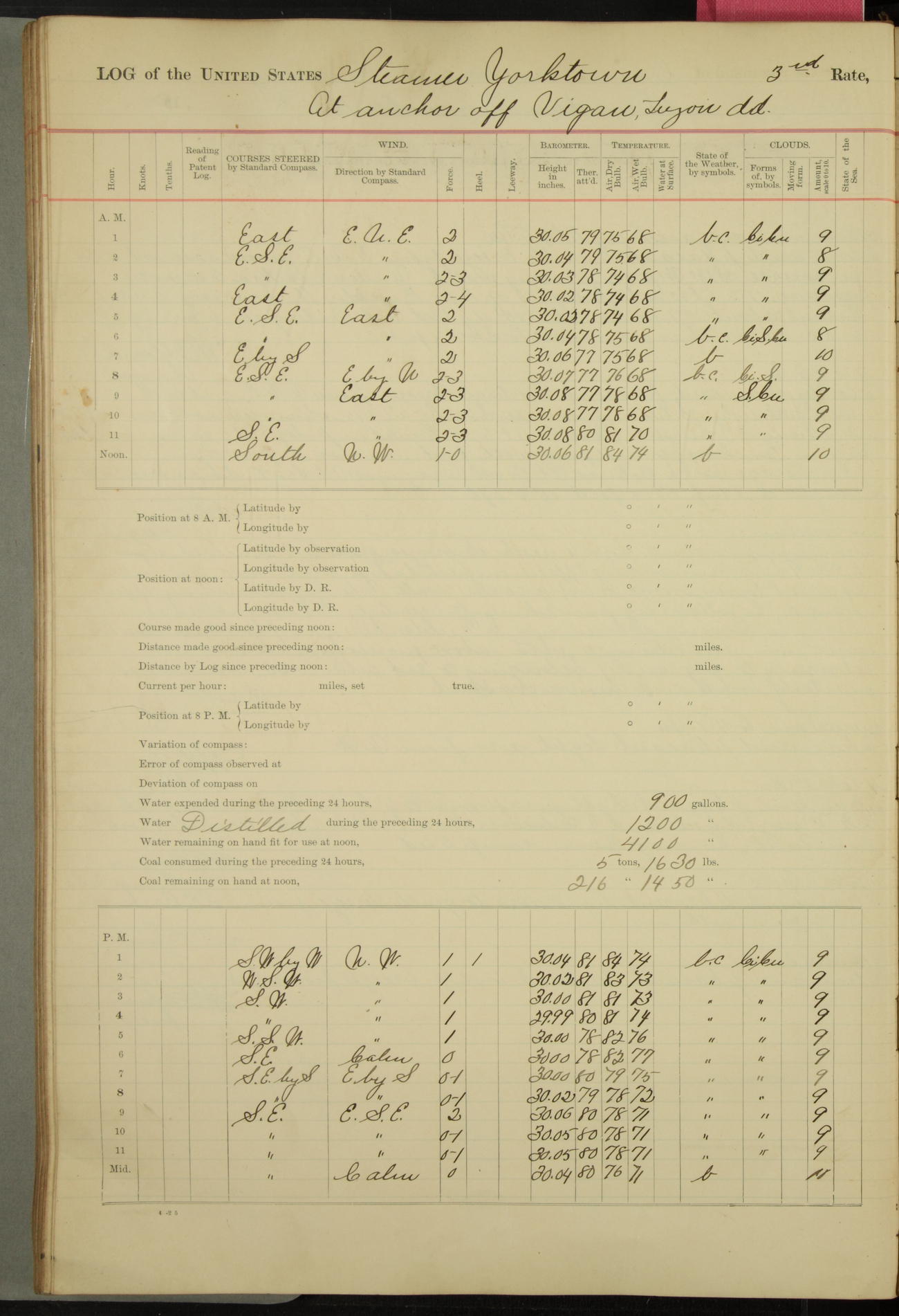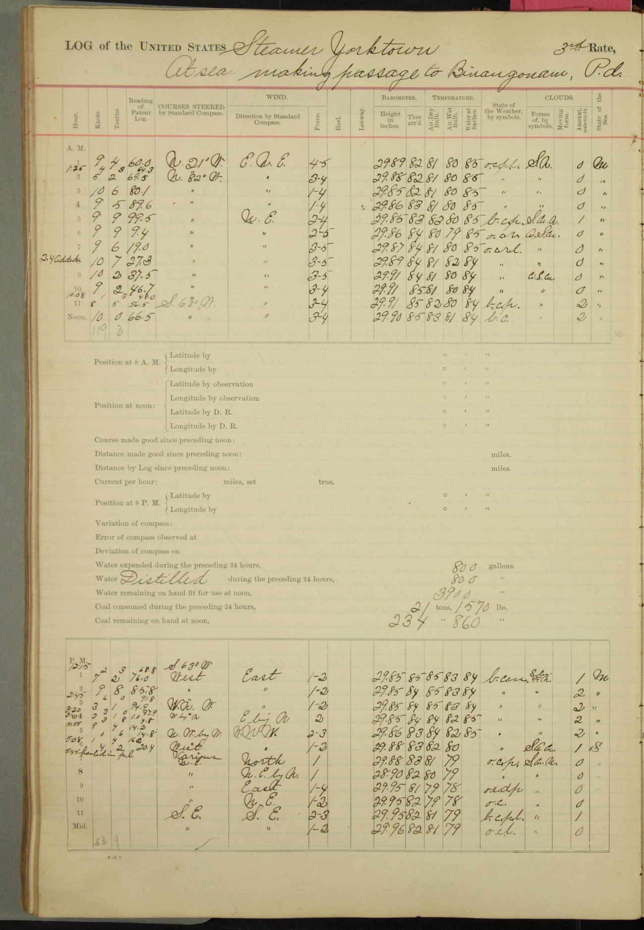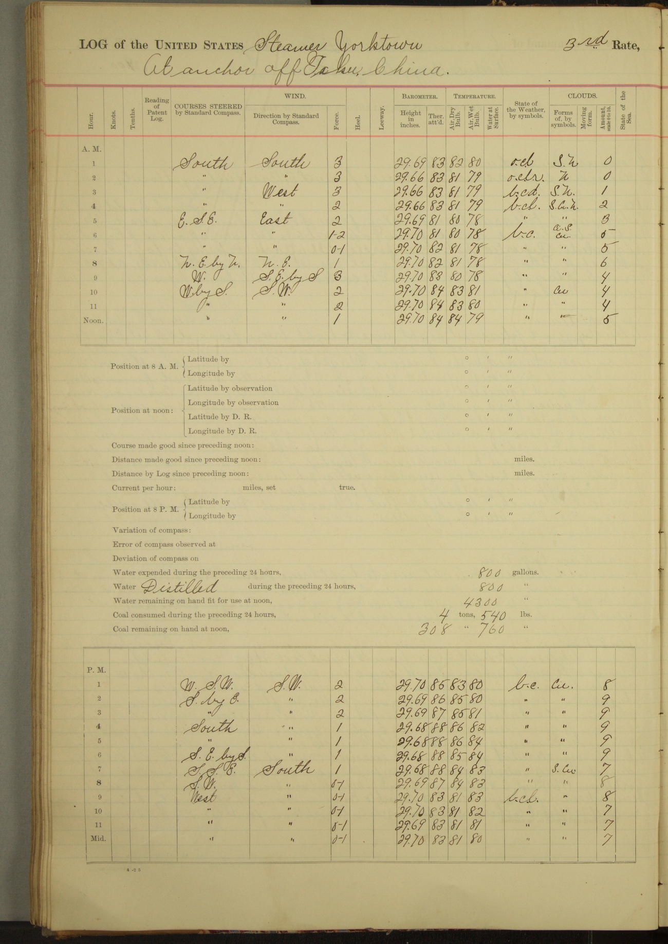 Under [steam from] 3 boilers, course N76°E per standard compass.