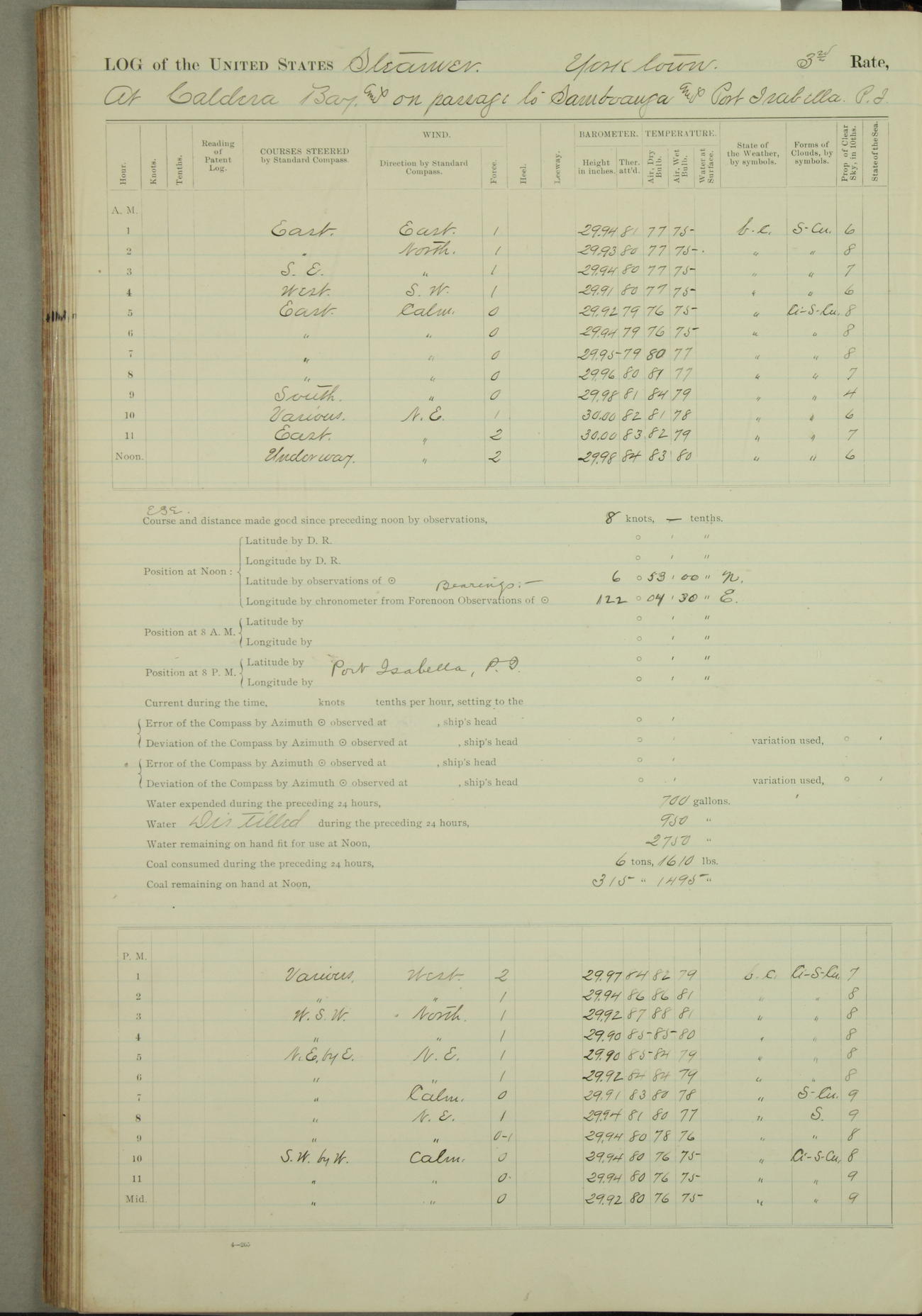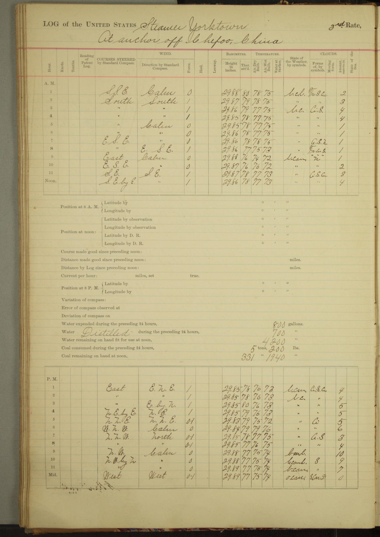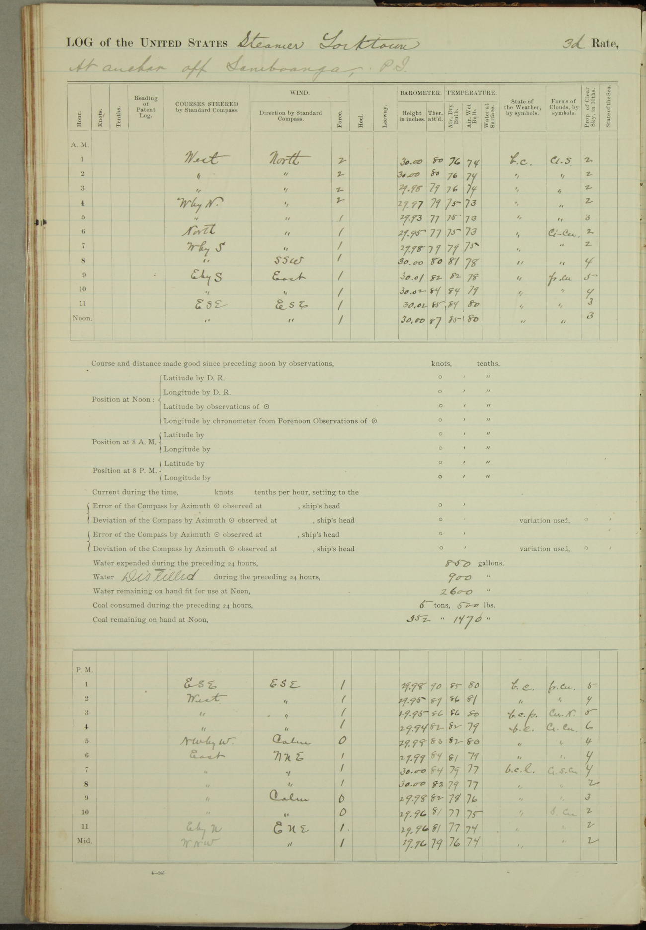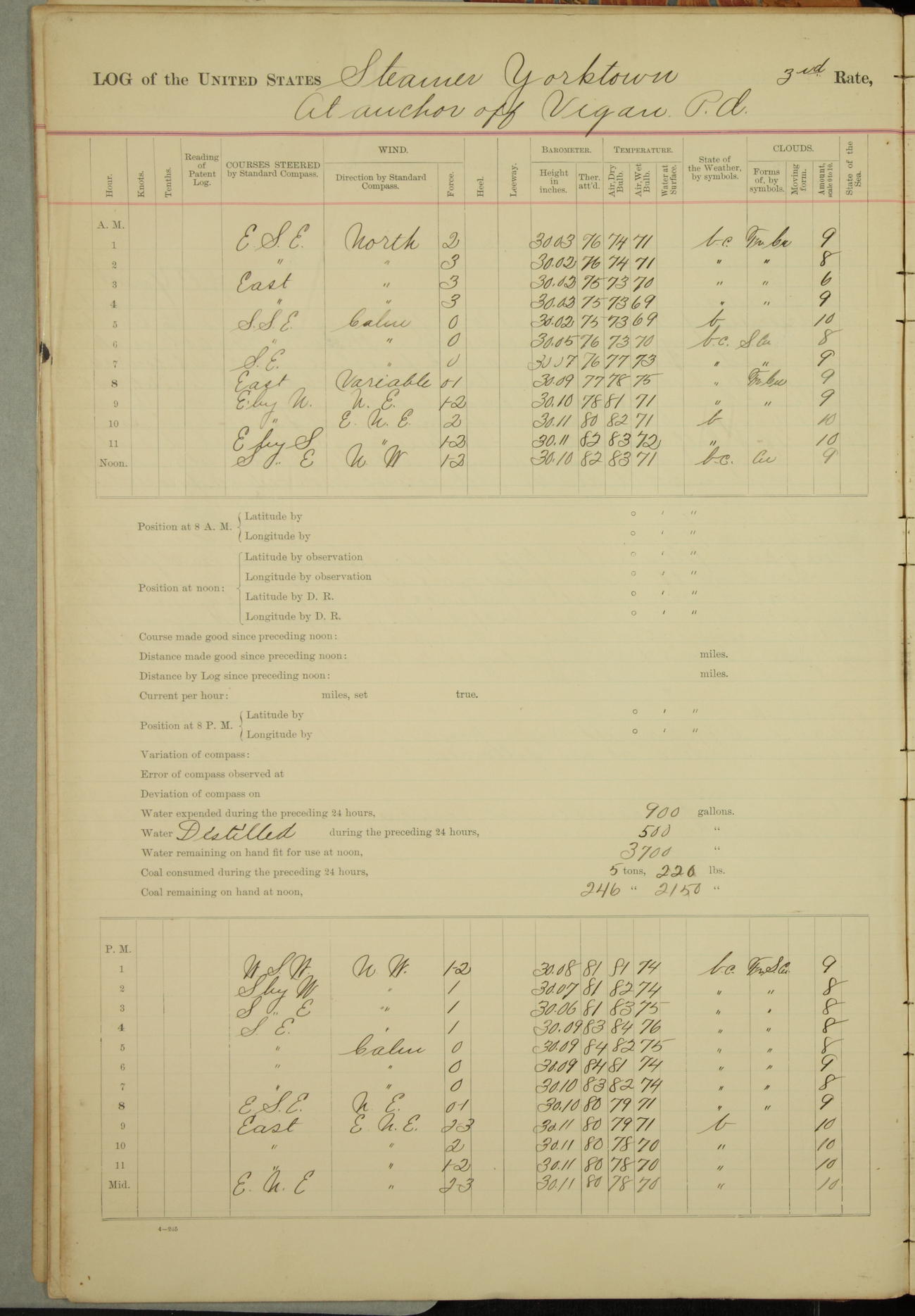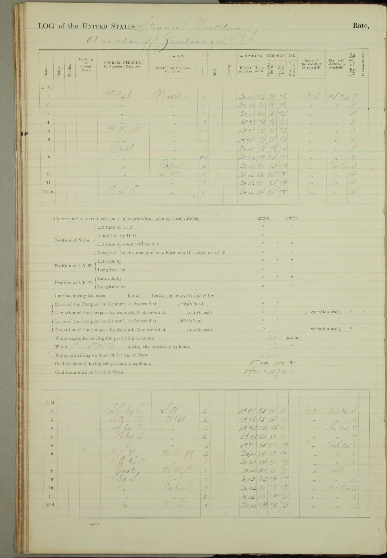 Under [steam from] 3 boilers, course N76°E per standard compass.