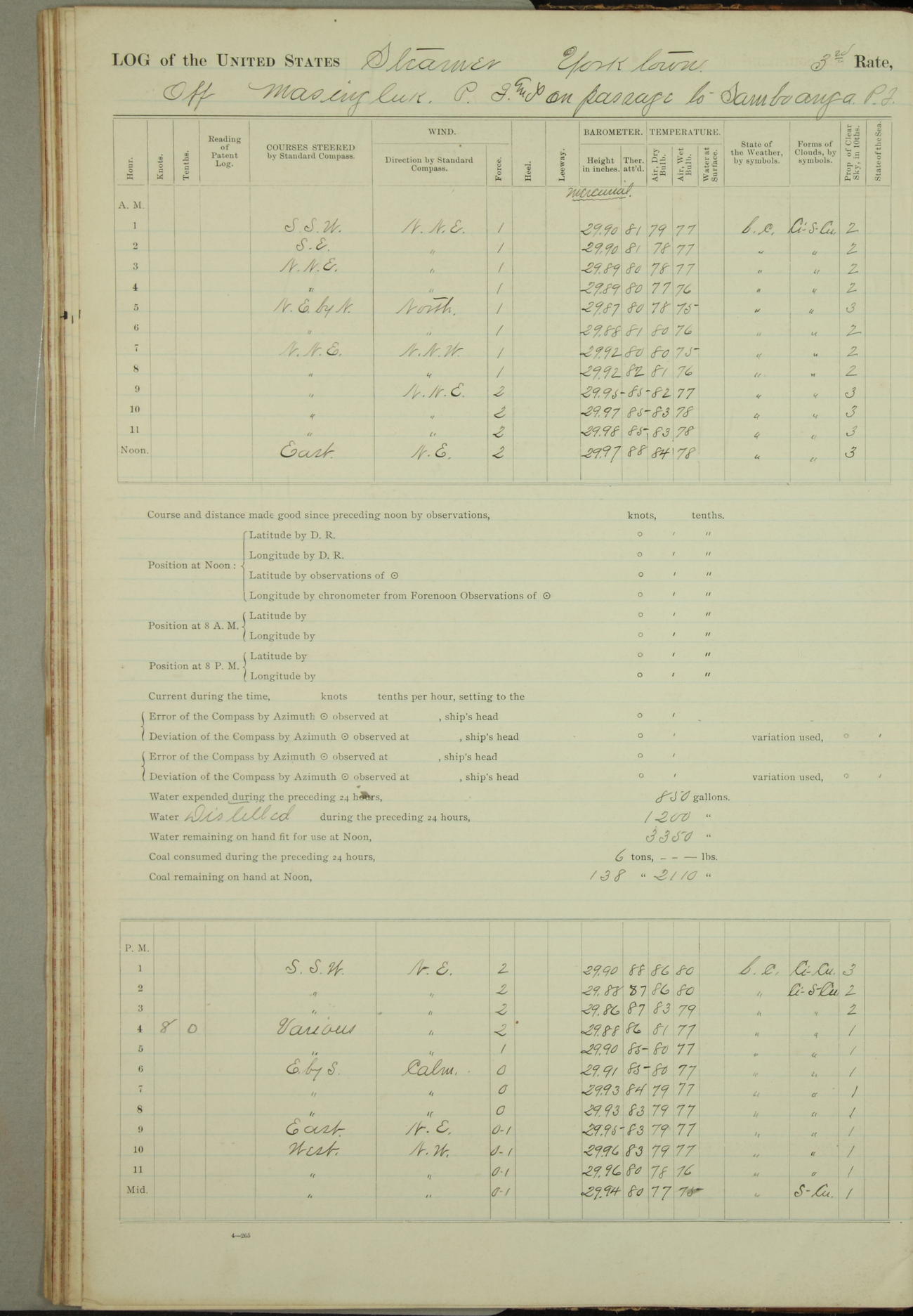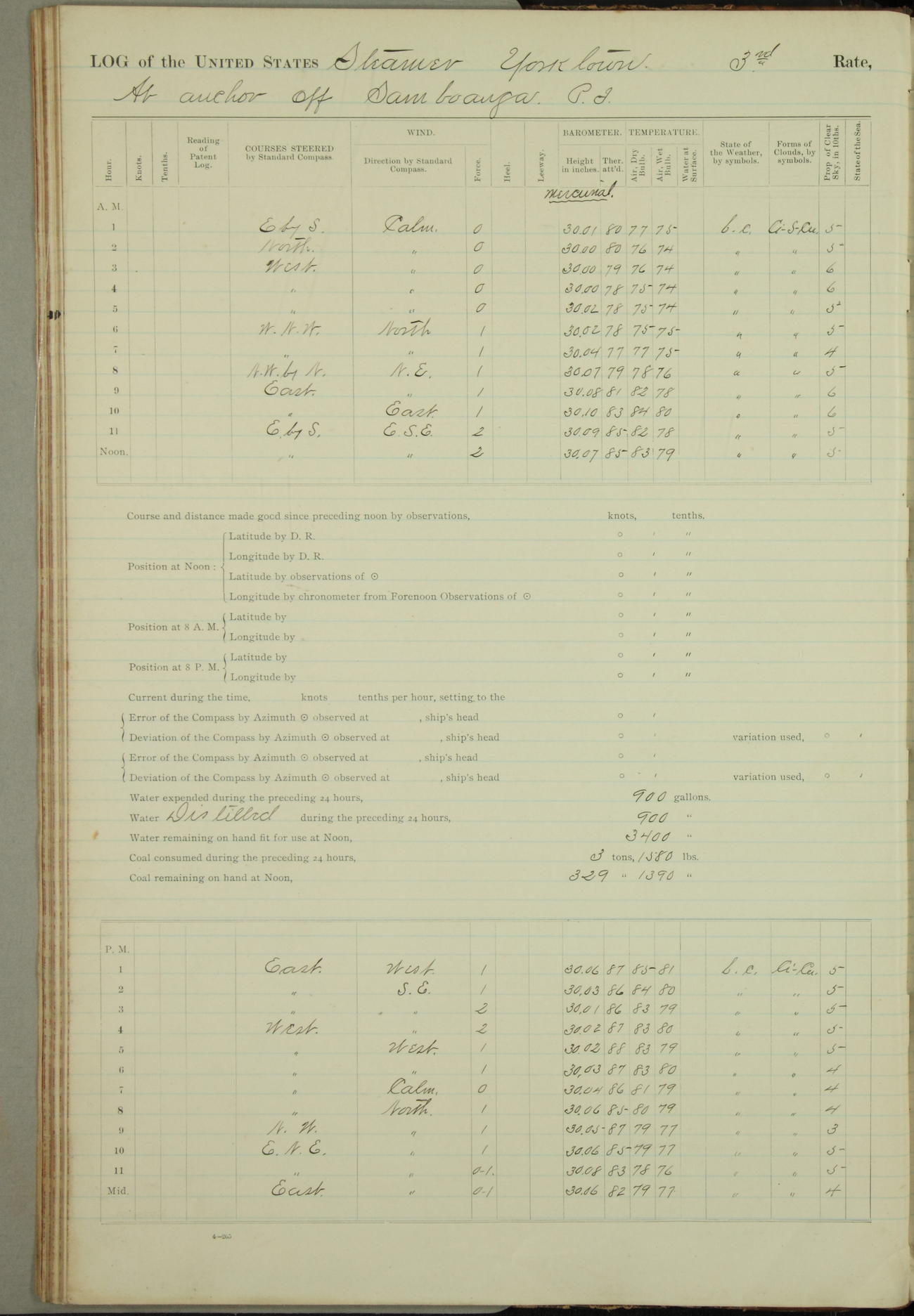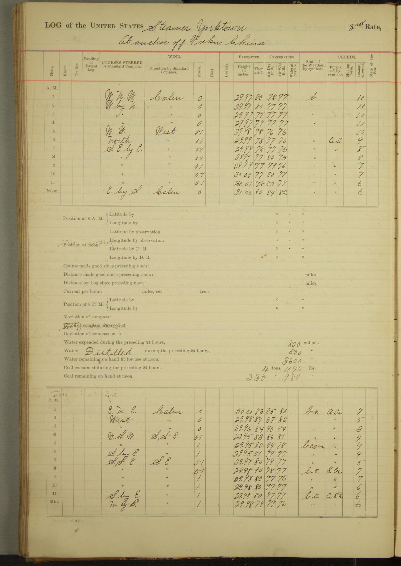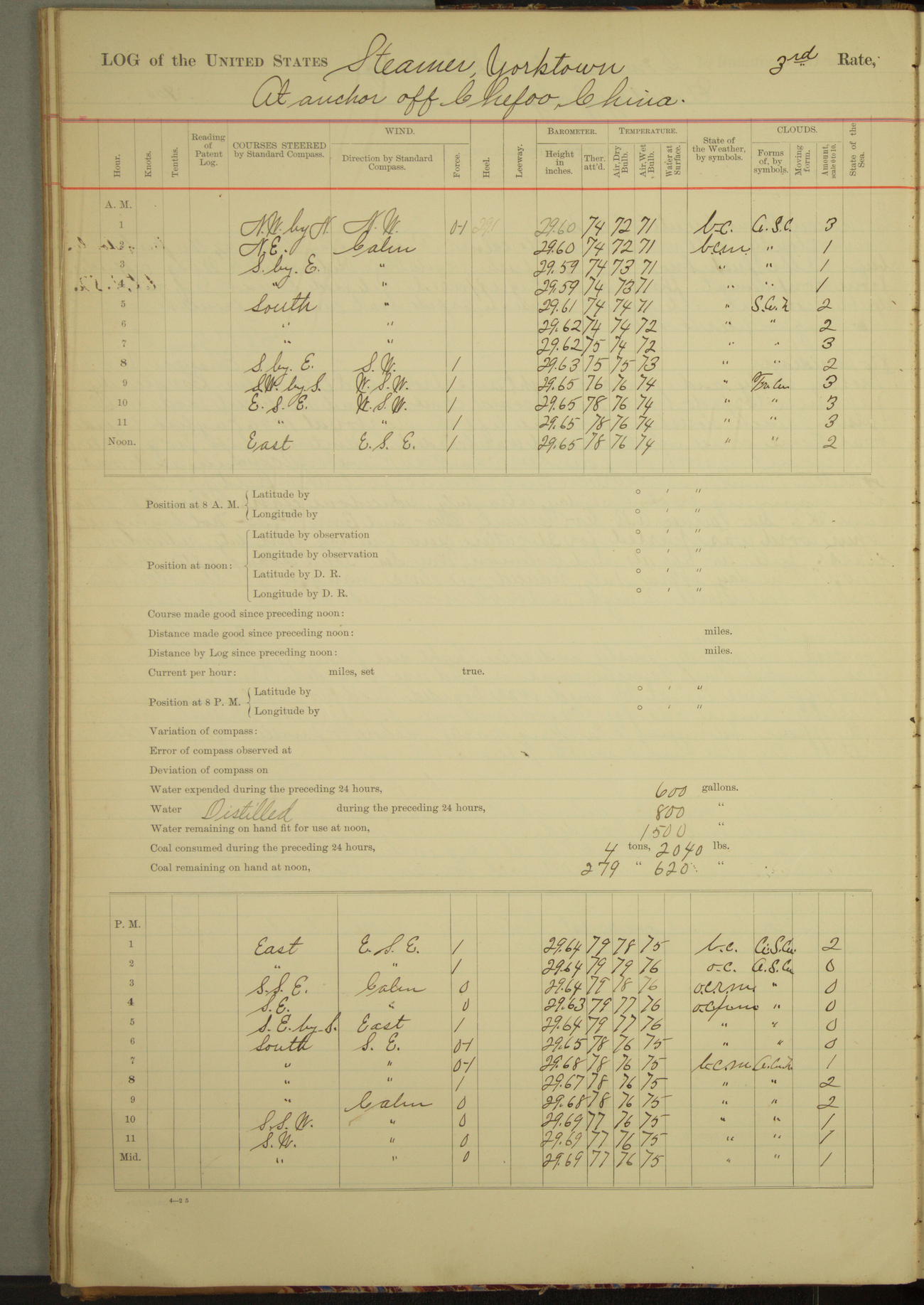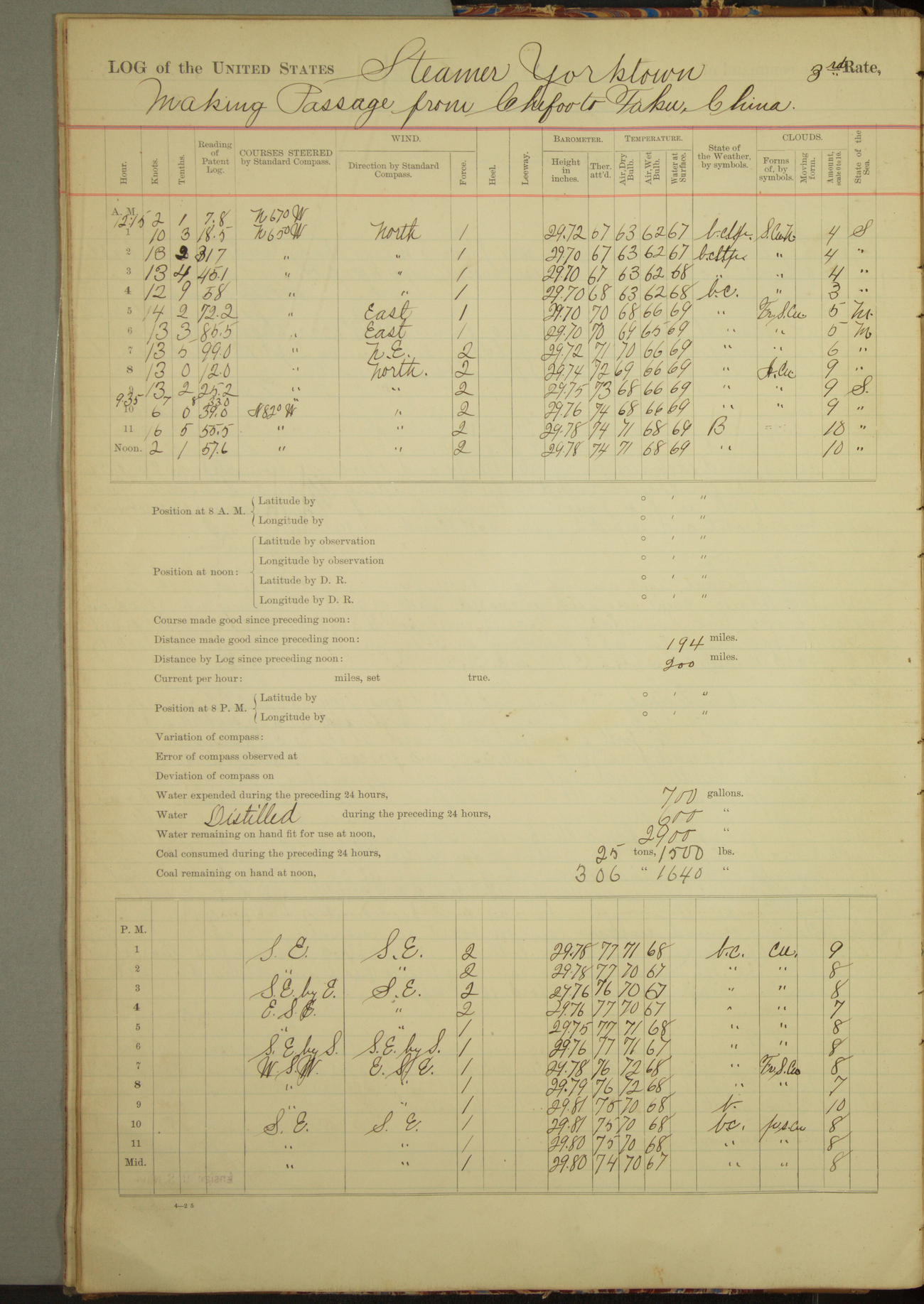 Under [steam from] 3 boilers, course N76°E per standard compass.