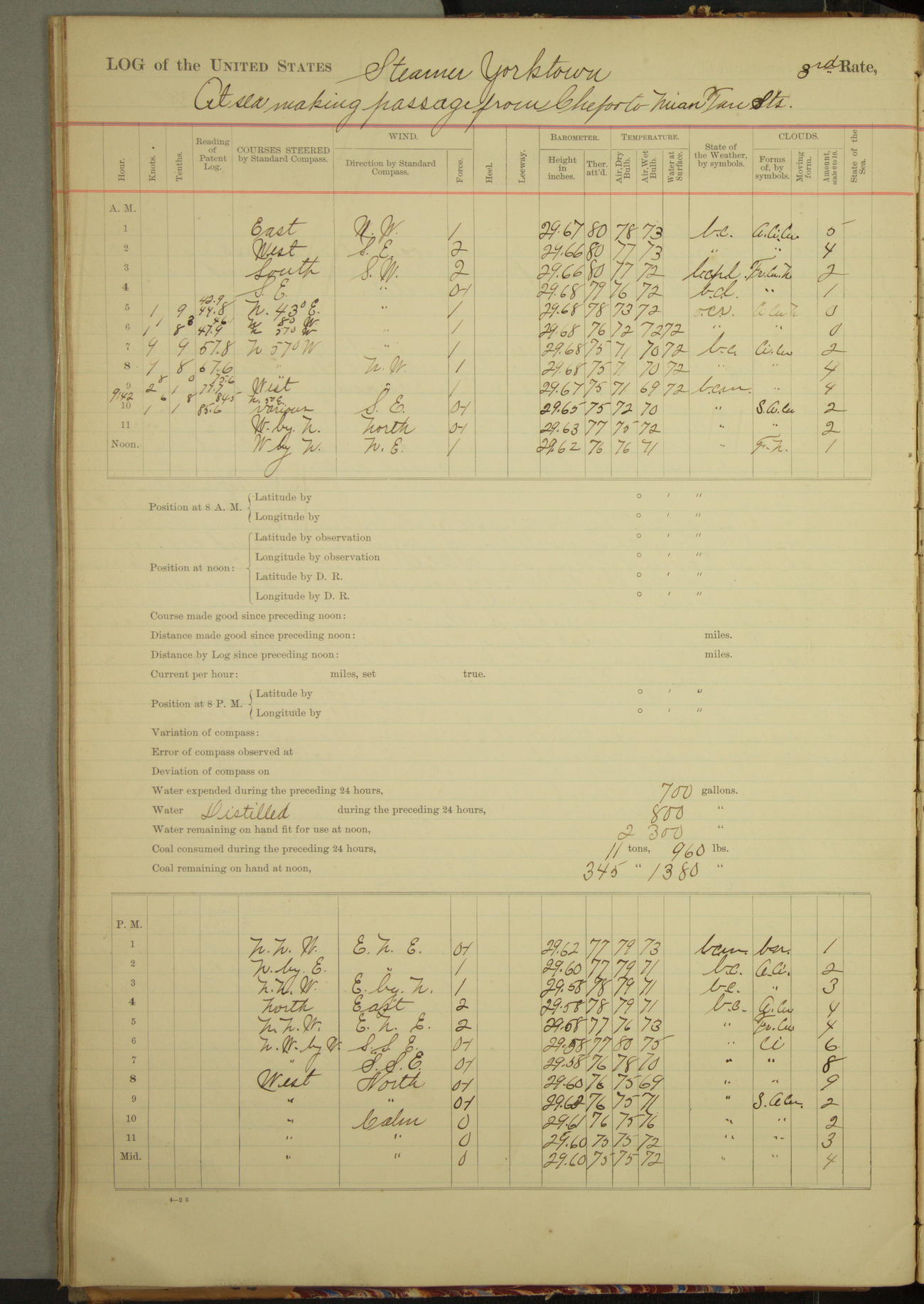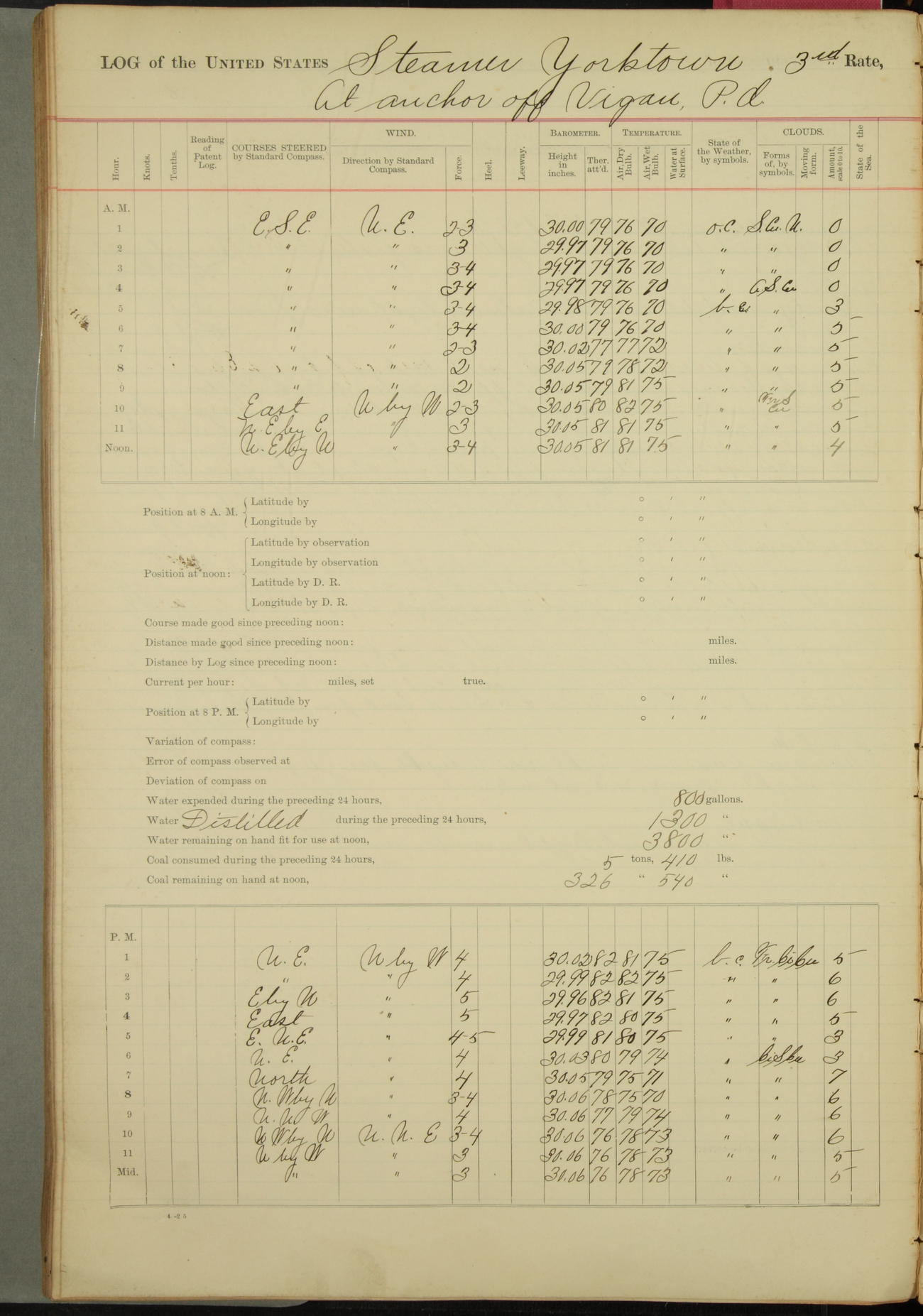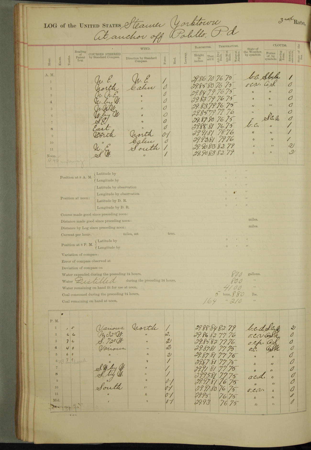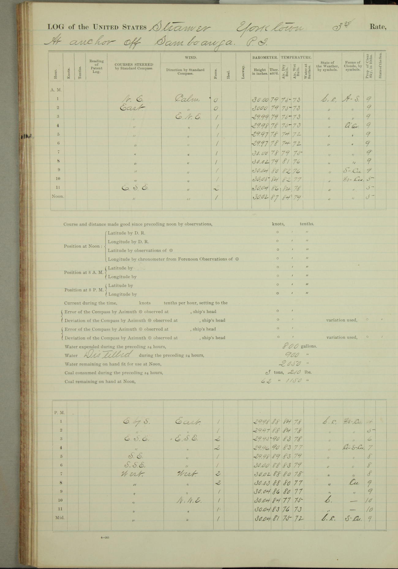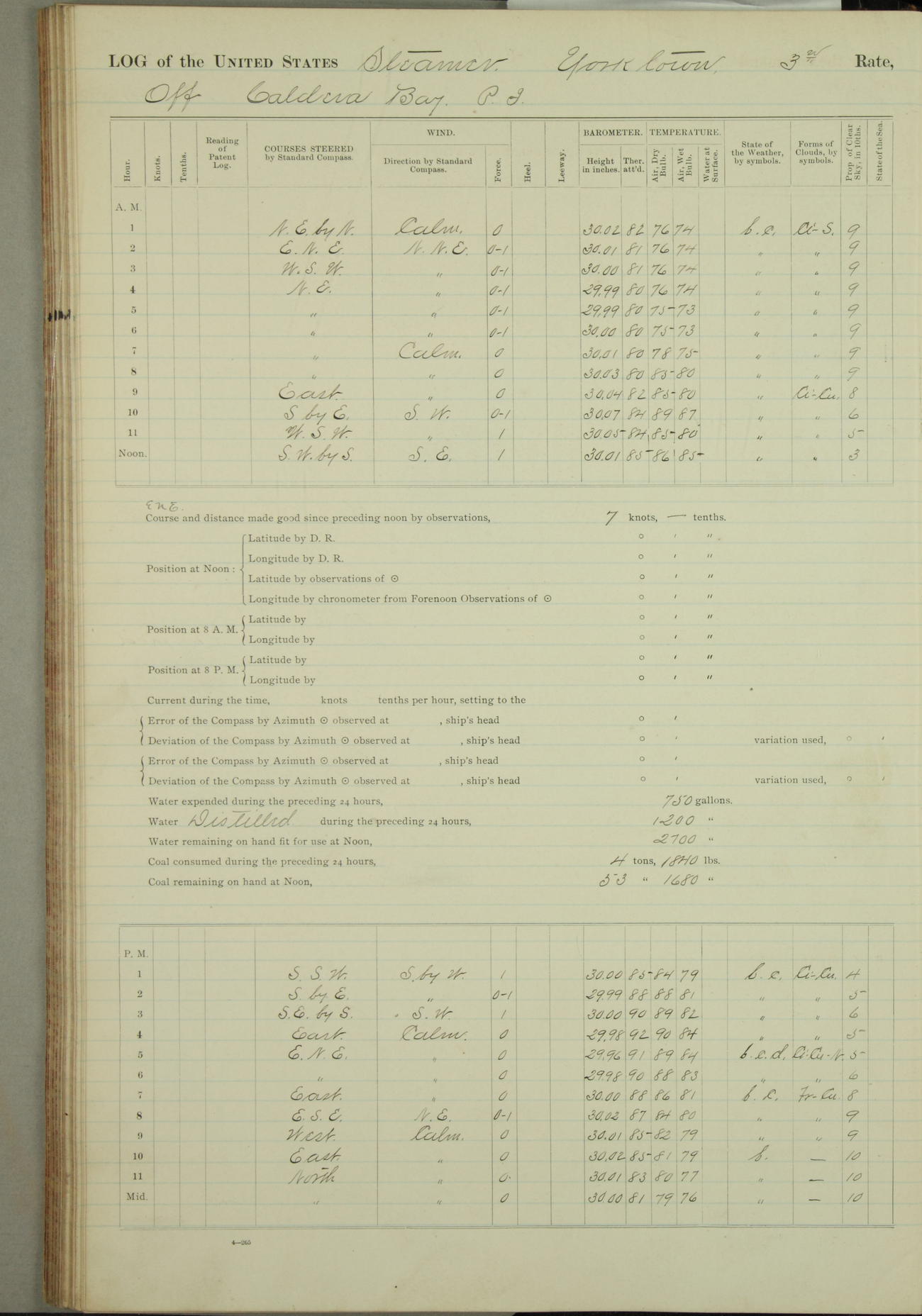 Under [steam from] 3 boilers, course N76°E per standard compass.