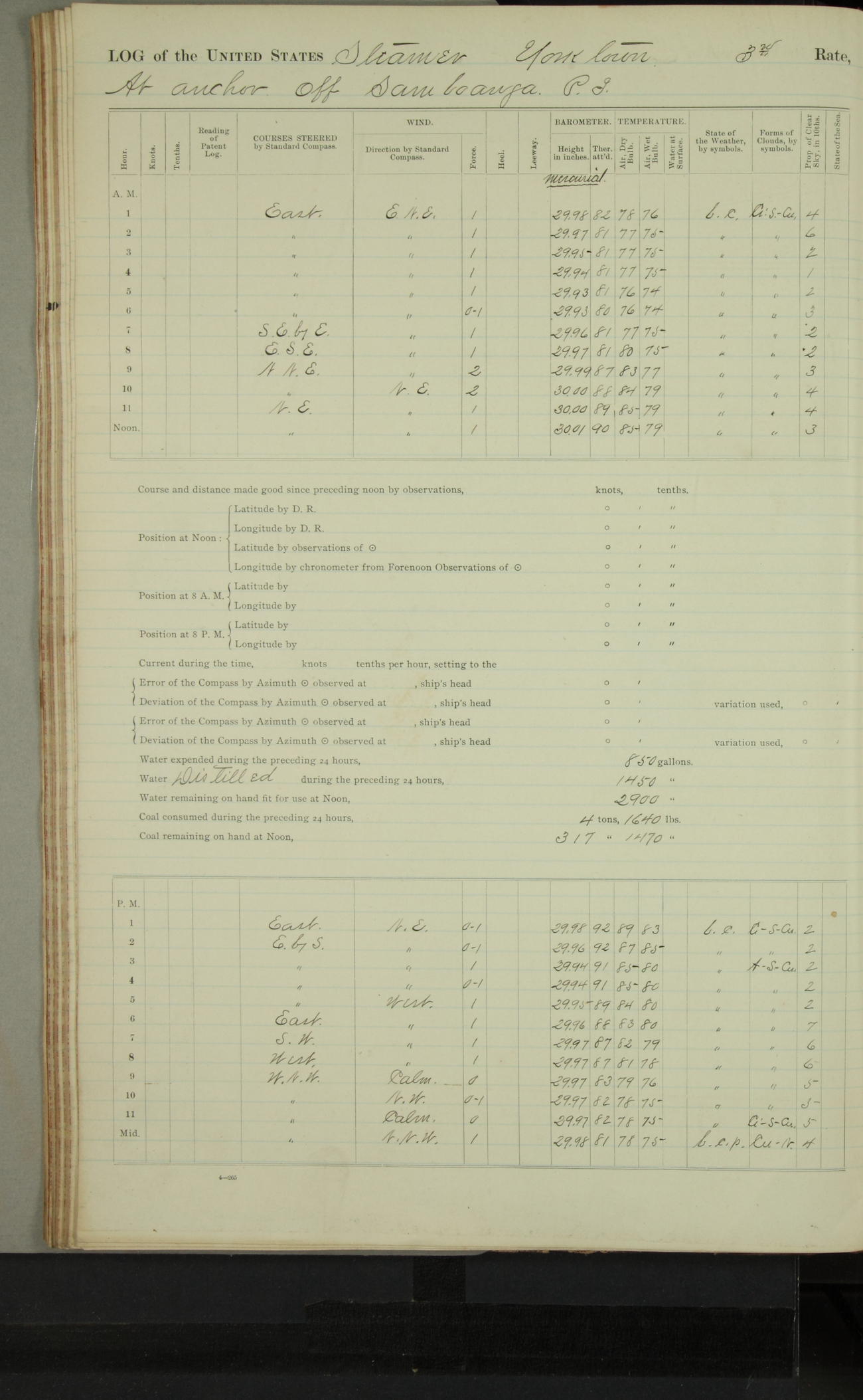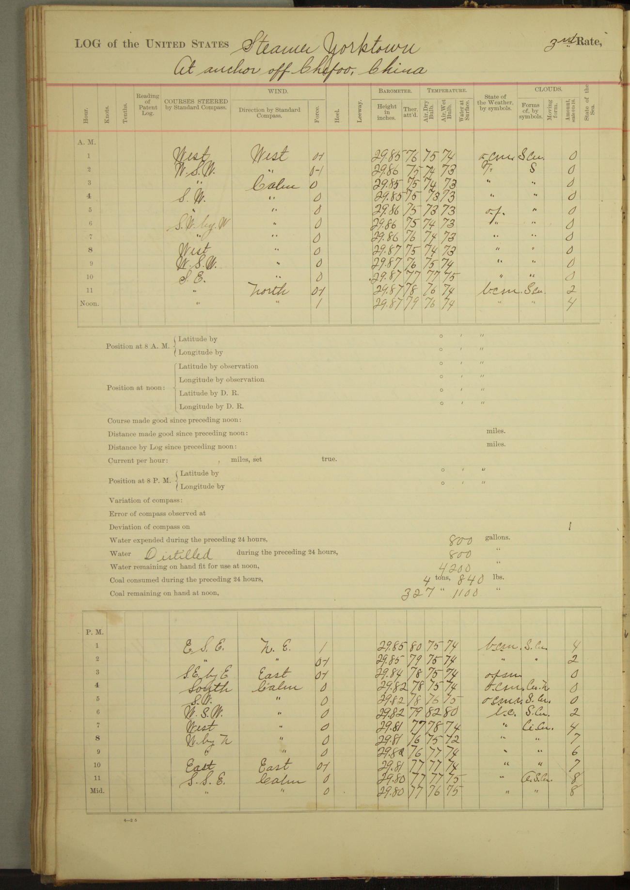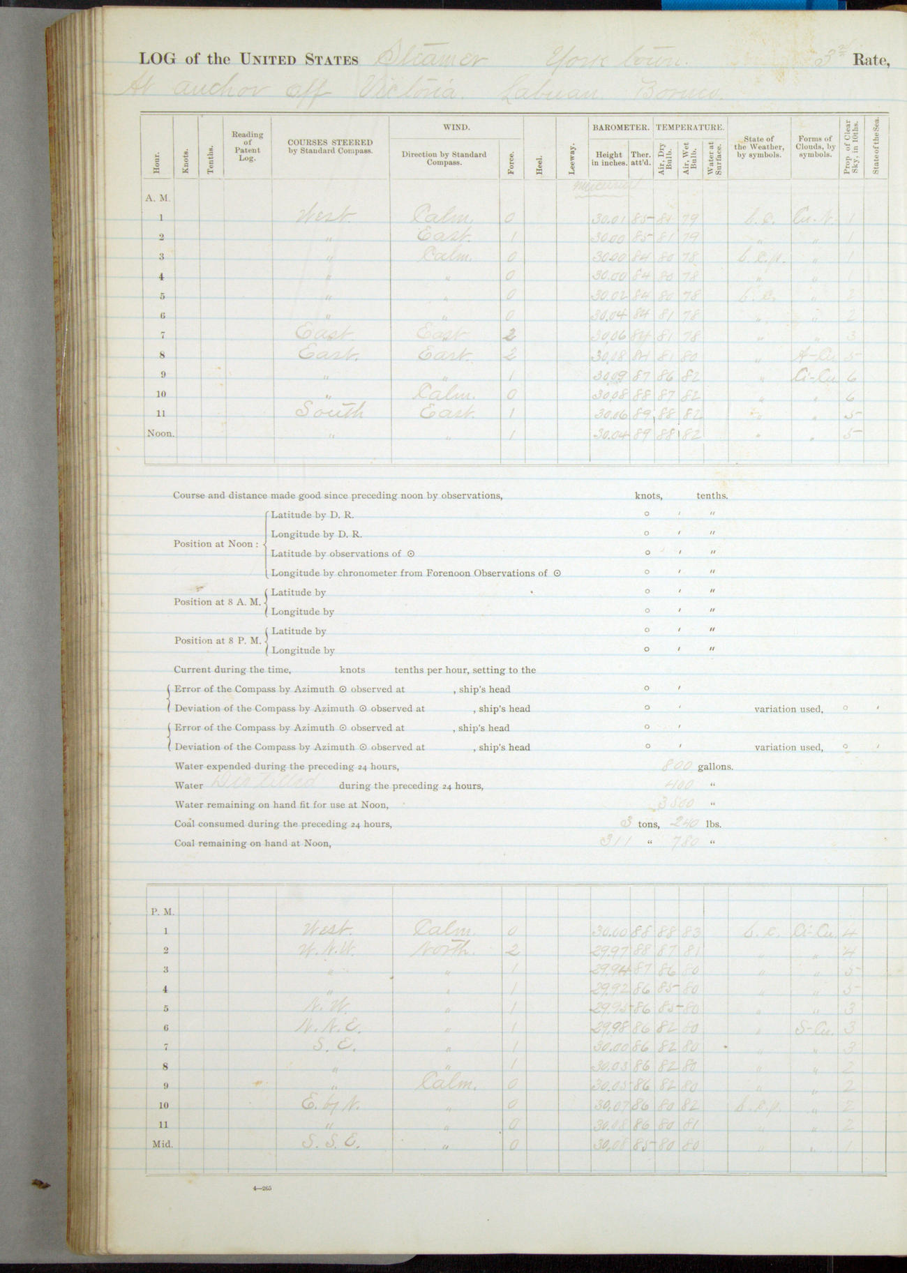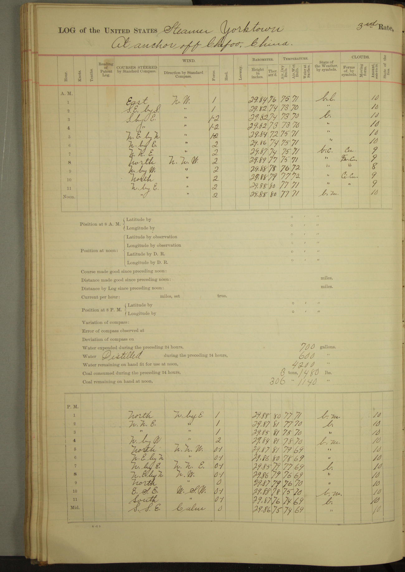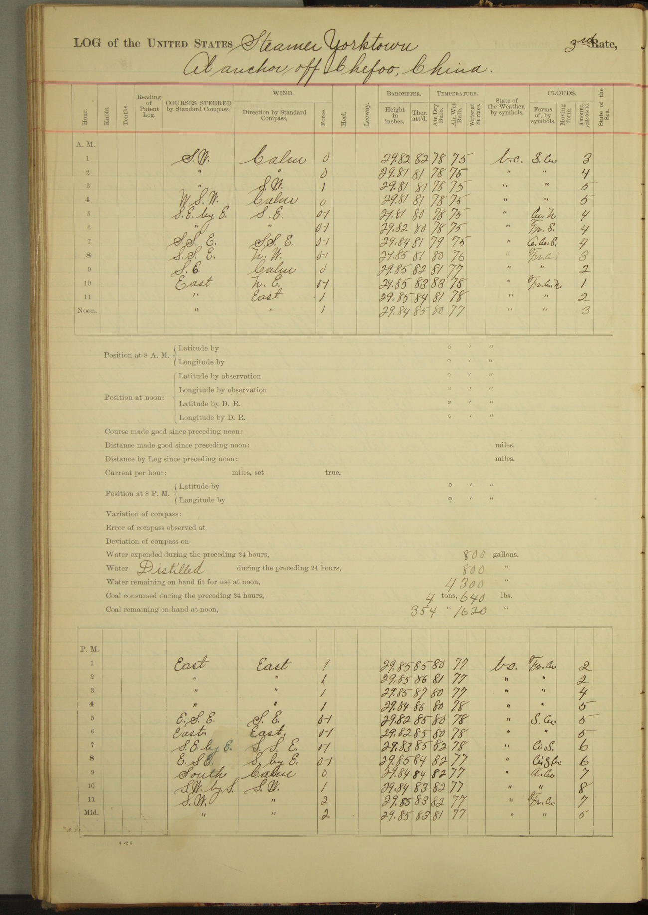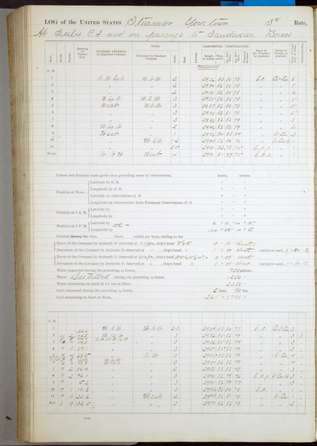 Under [steam from] 3 boilers, course N76°E per standard compass.