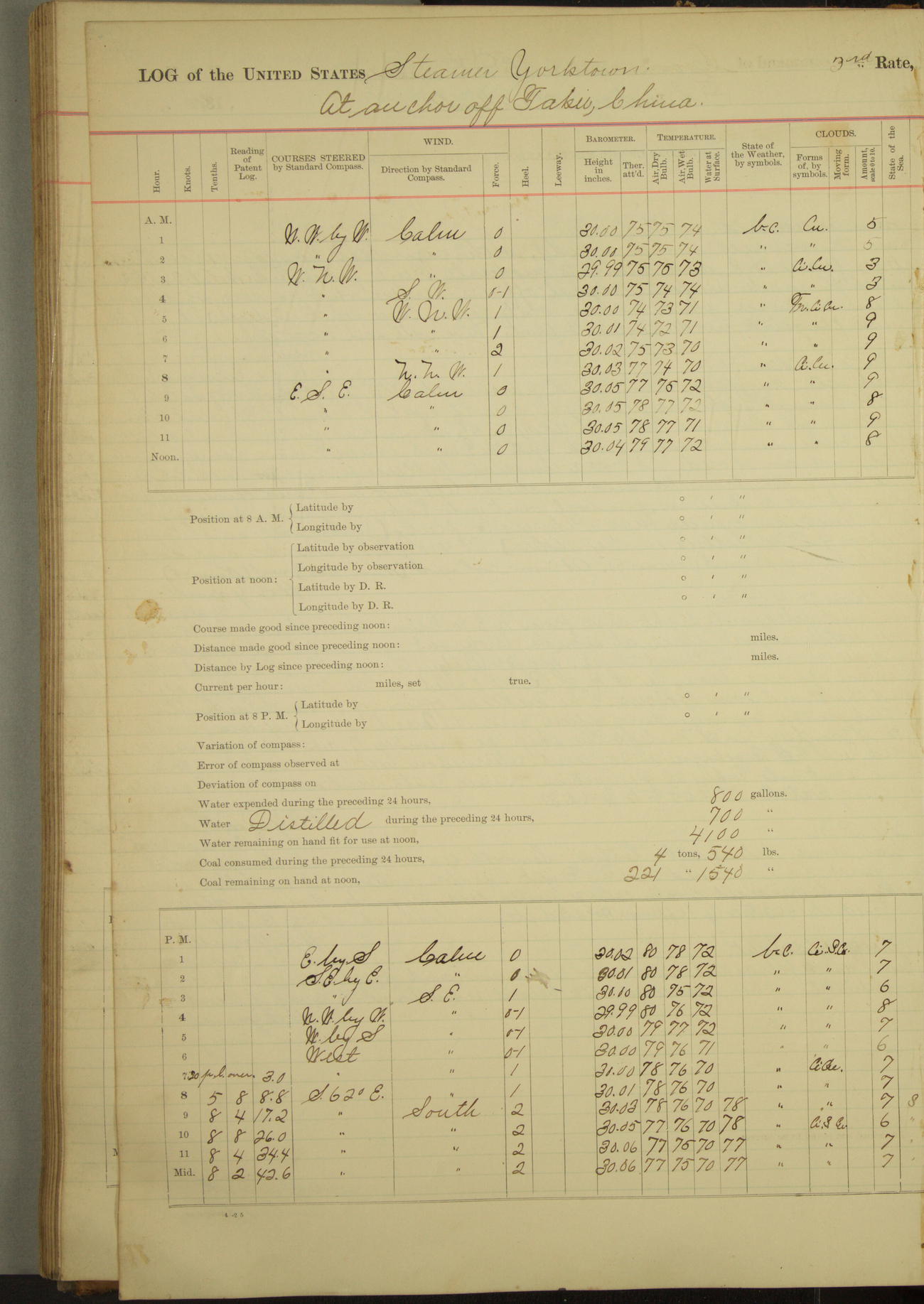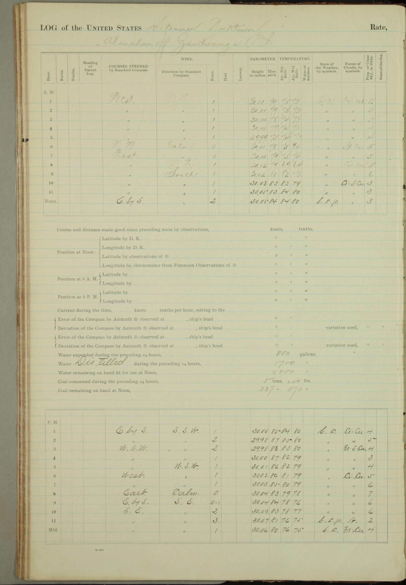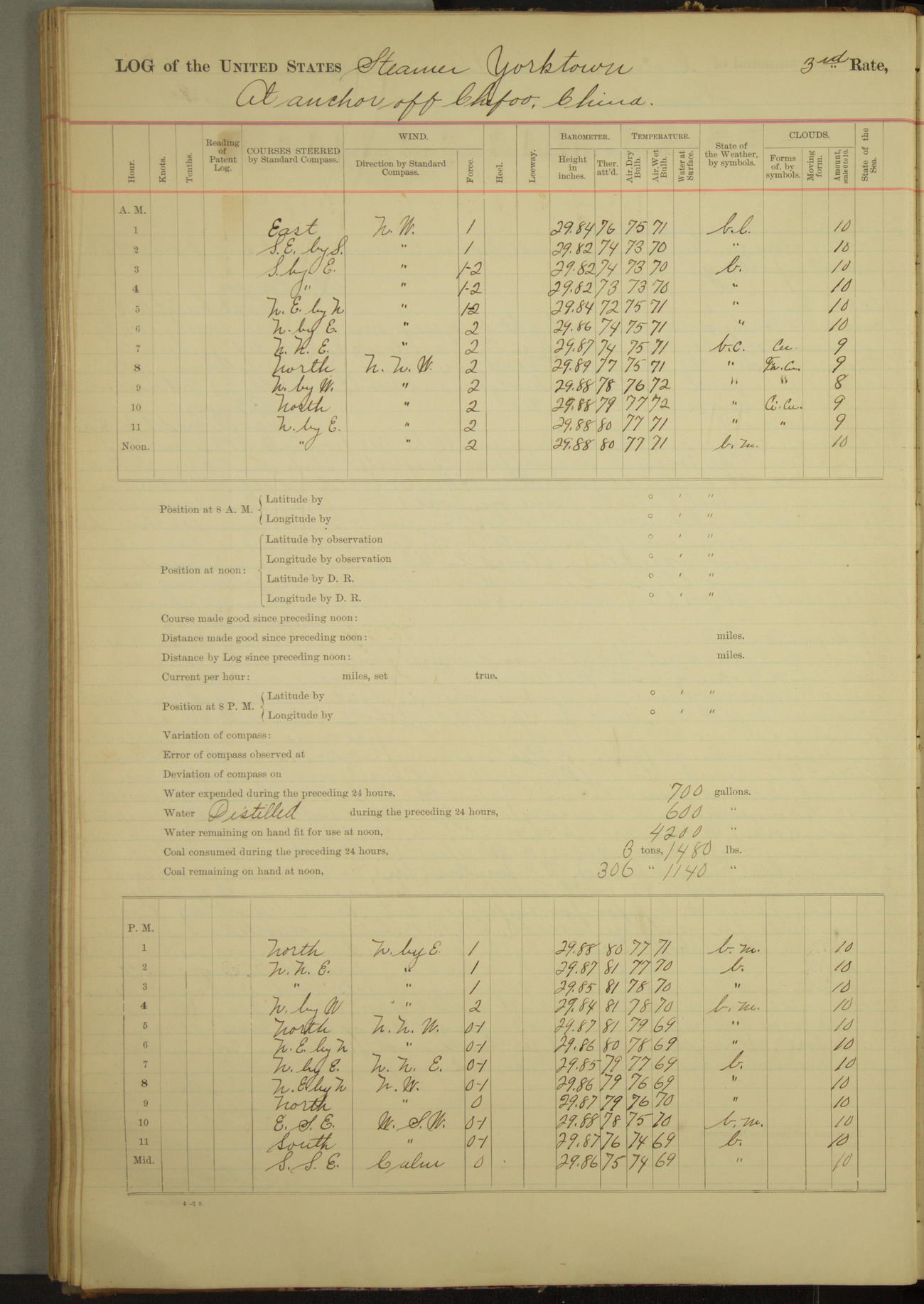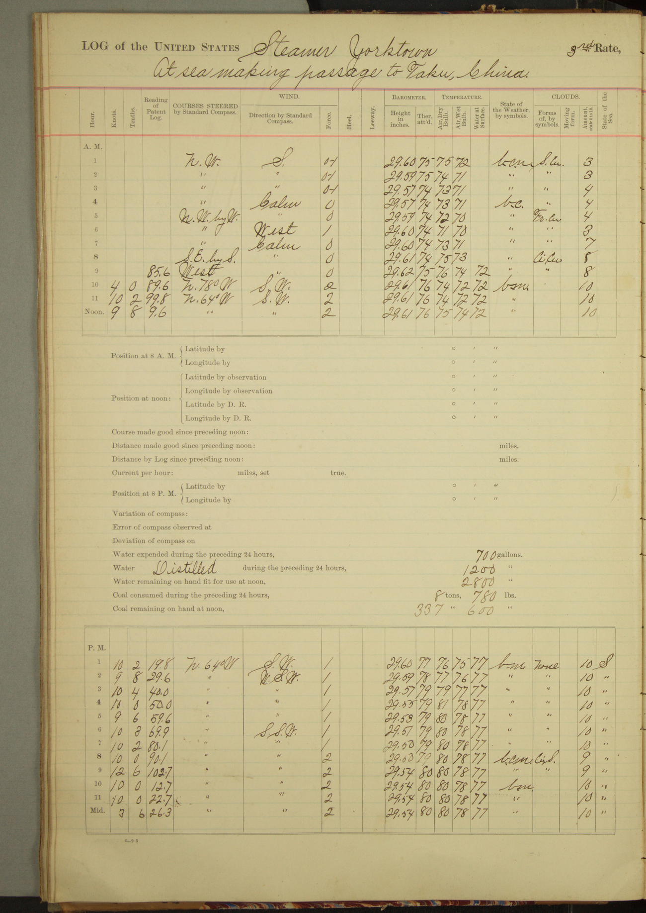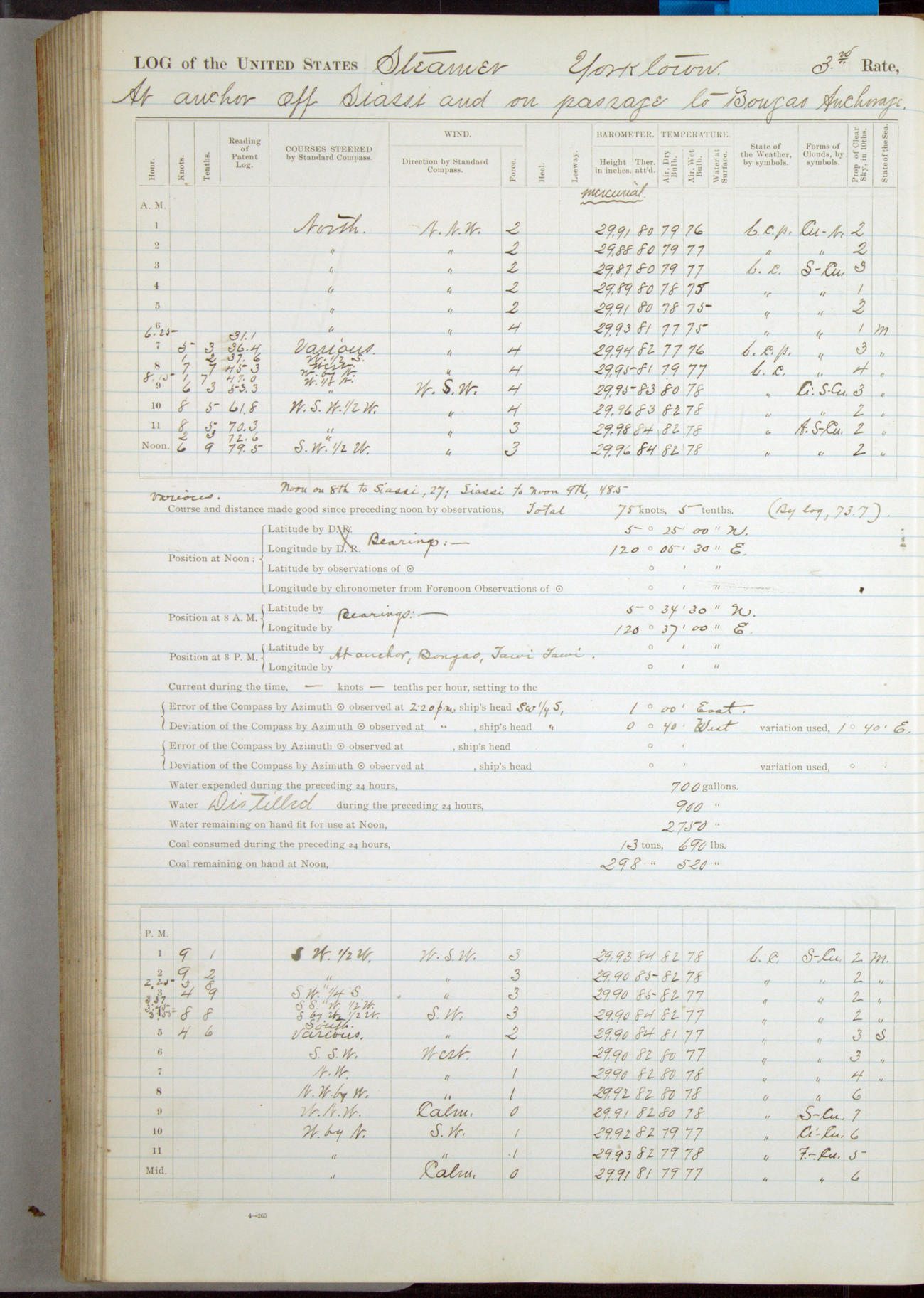 Under [steam from] 3 boilers, course N76°E per standard compass.