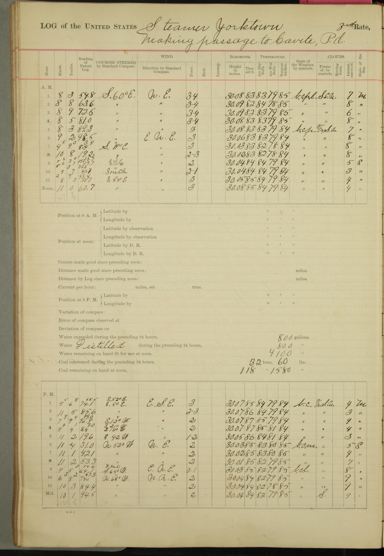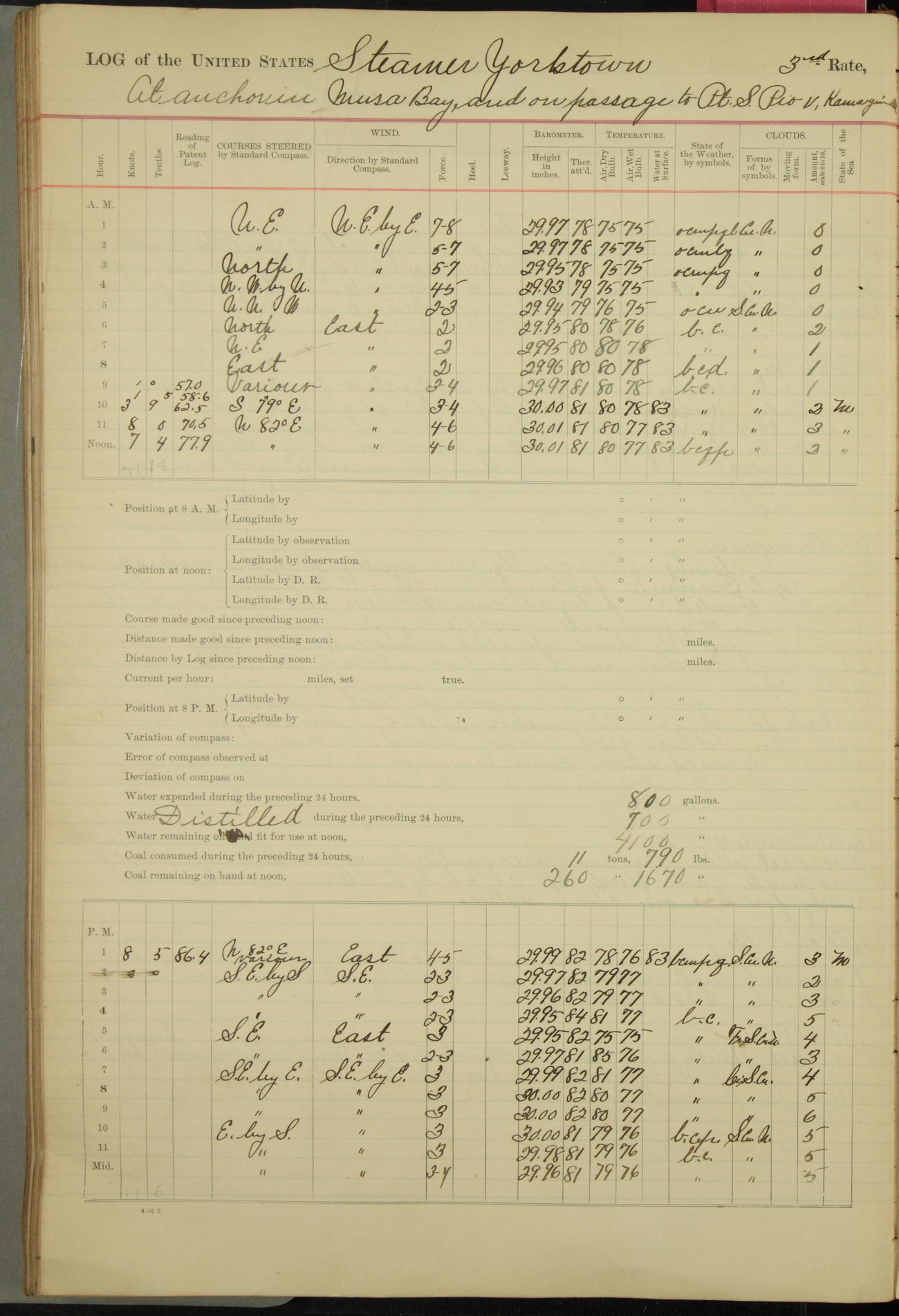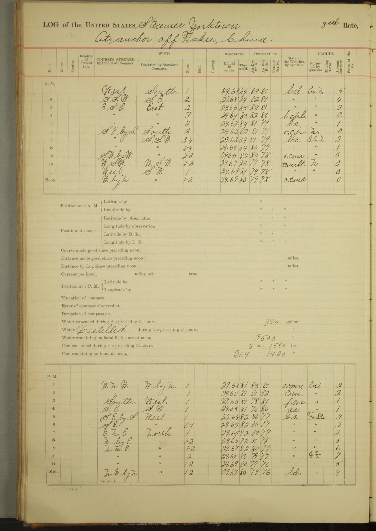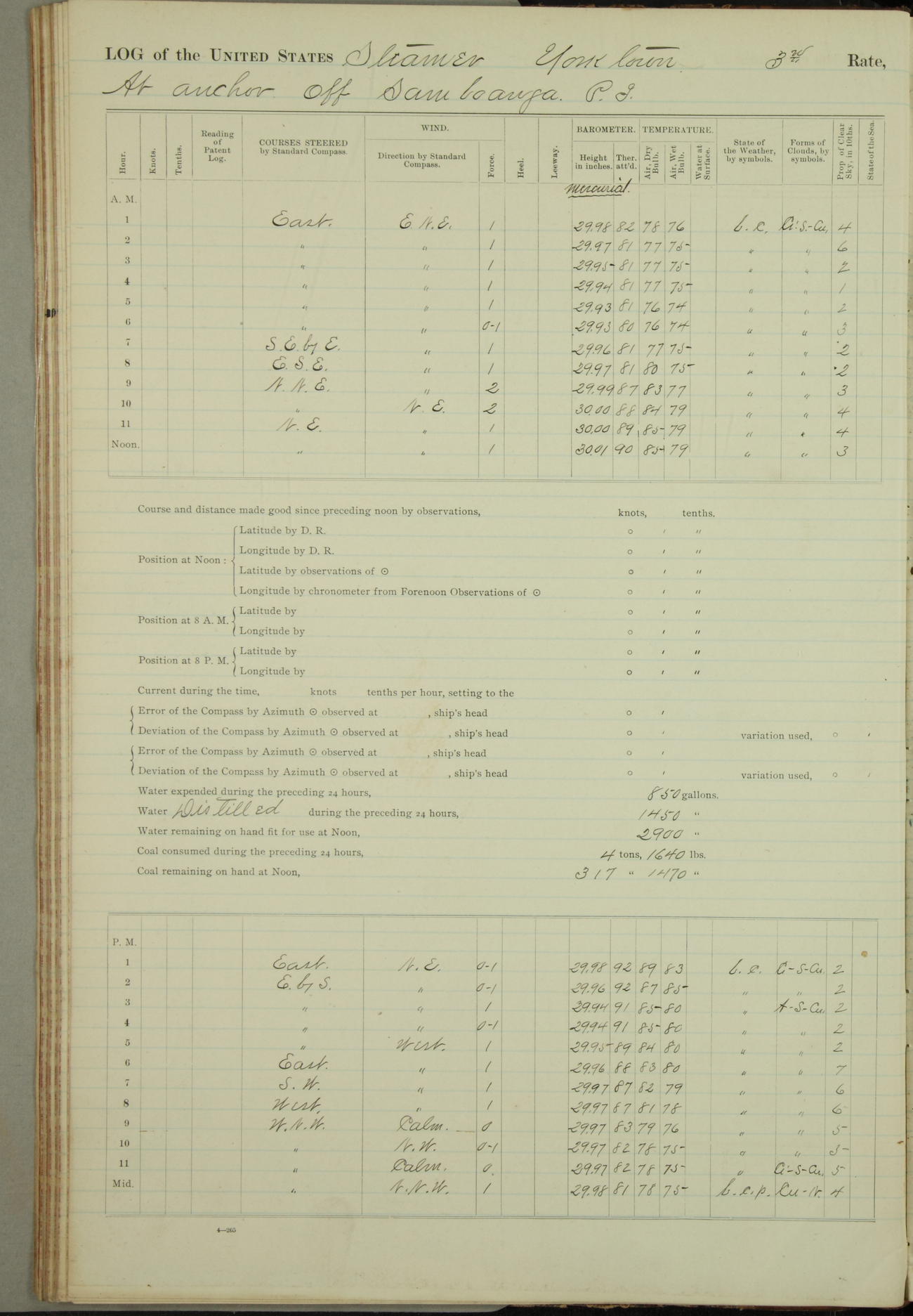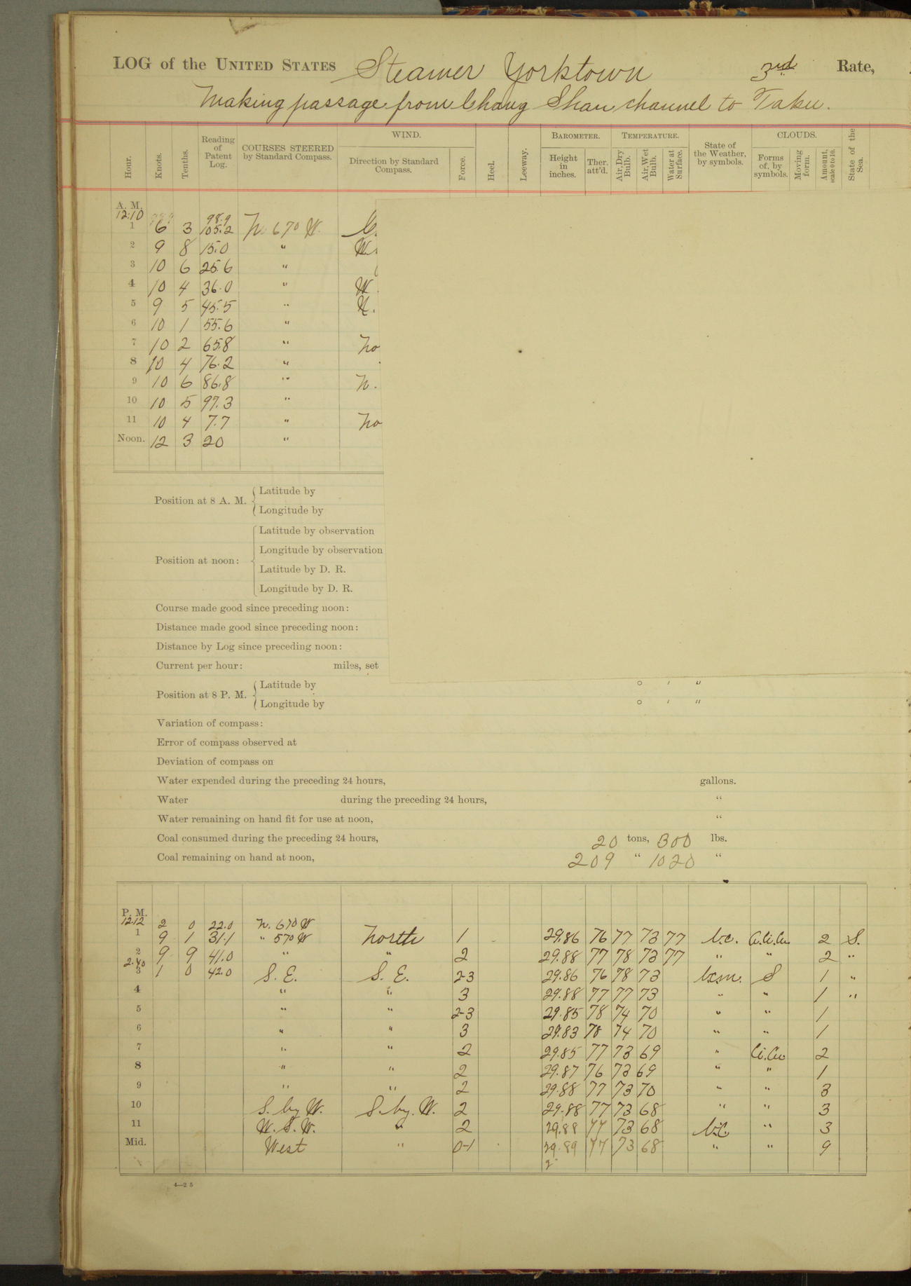 Under [steam from] 3 boilers, course N76°E per standard compass.
