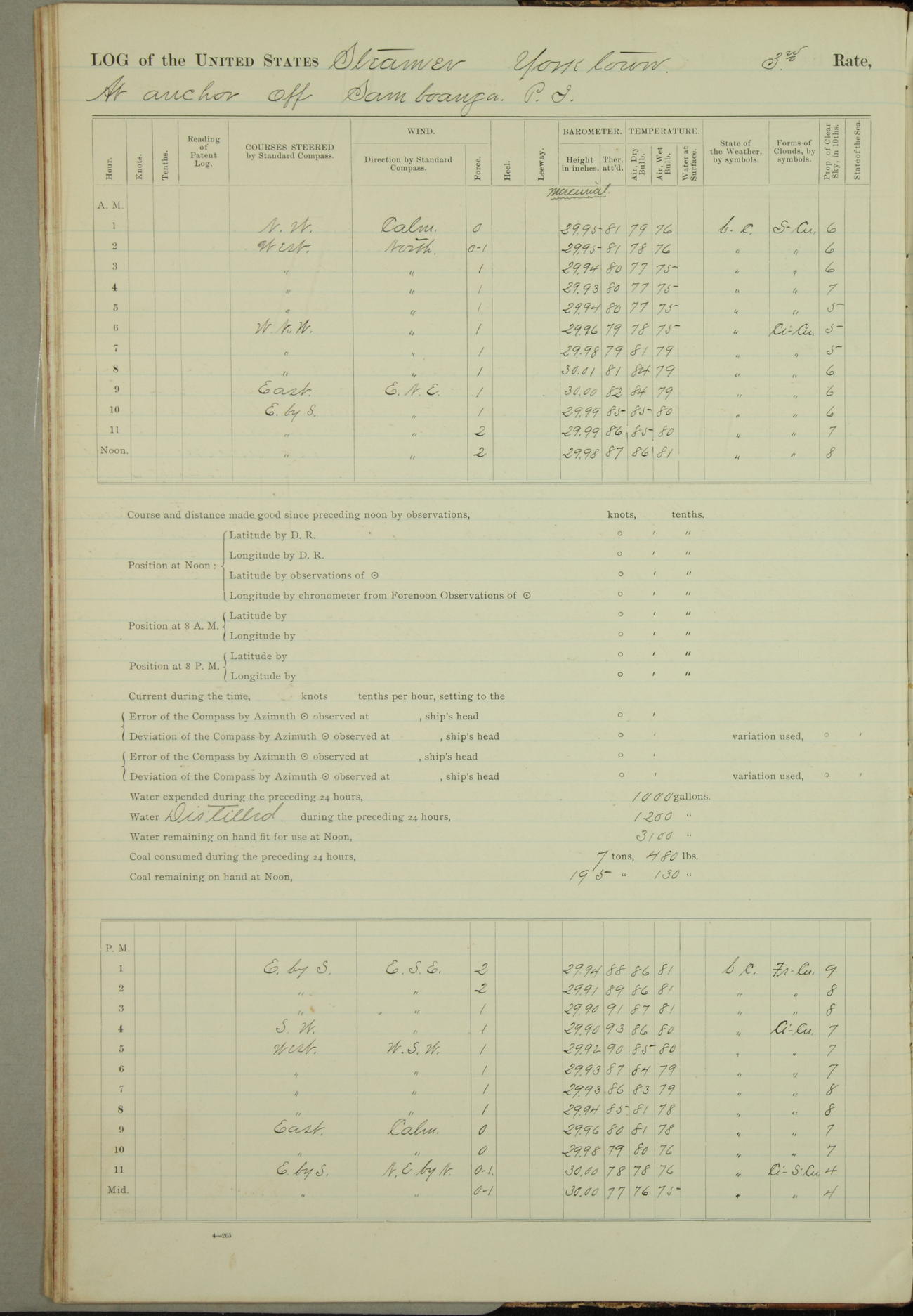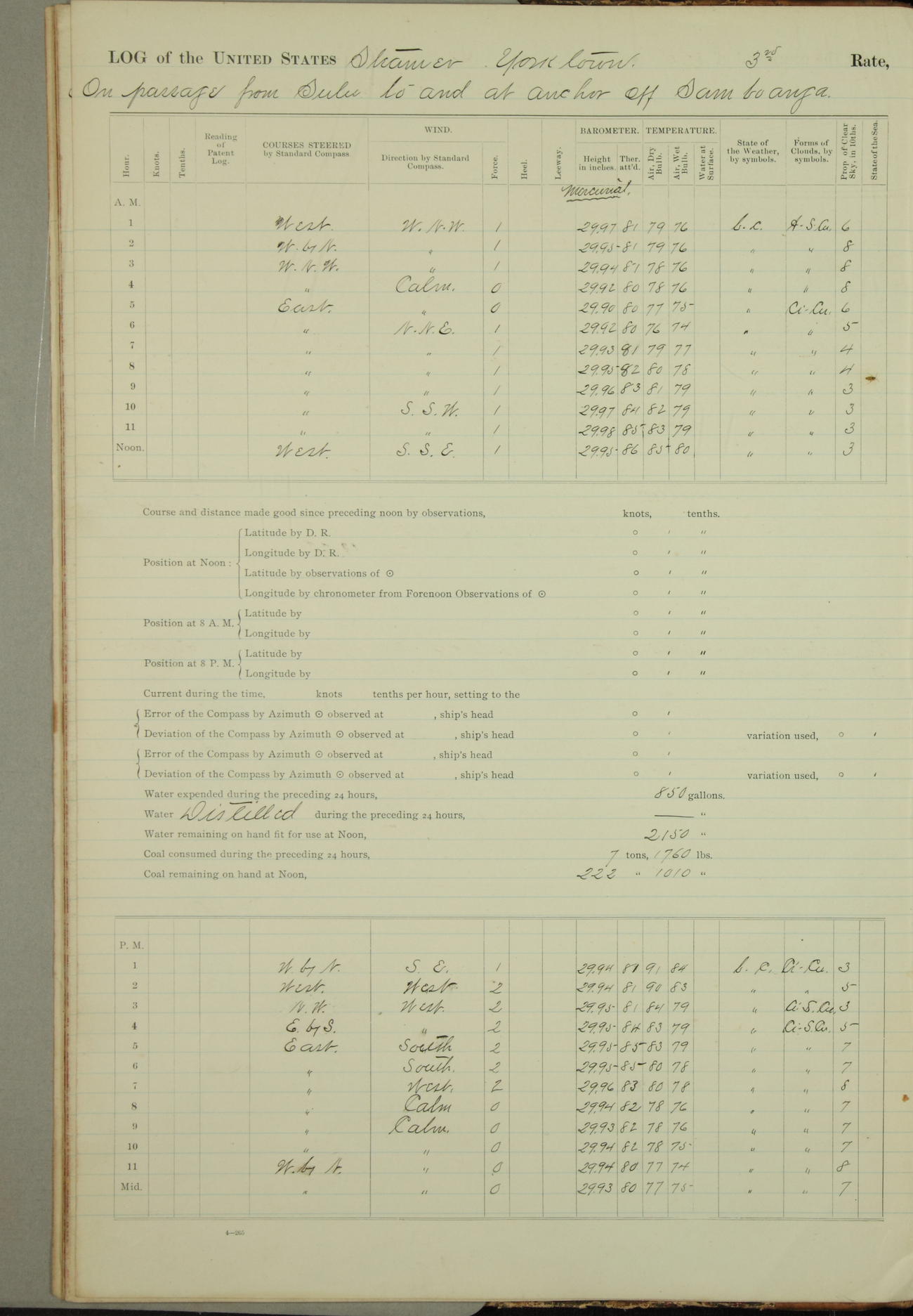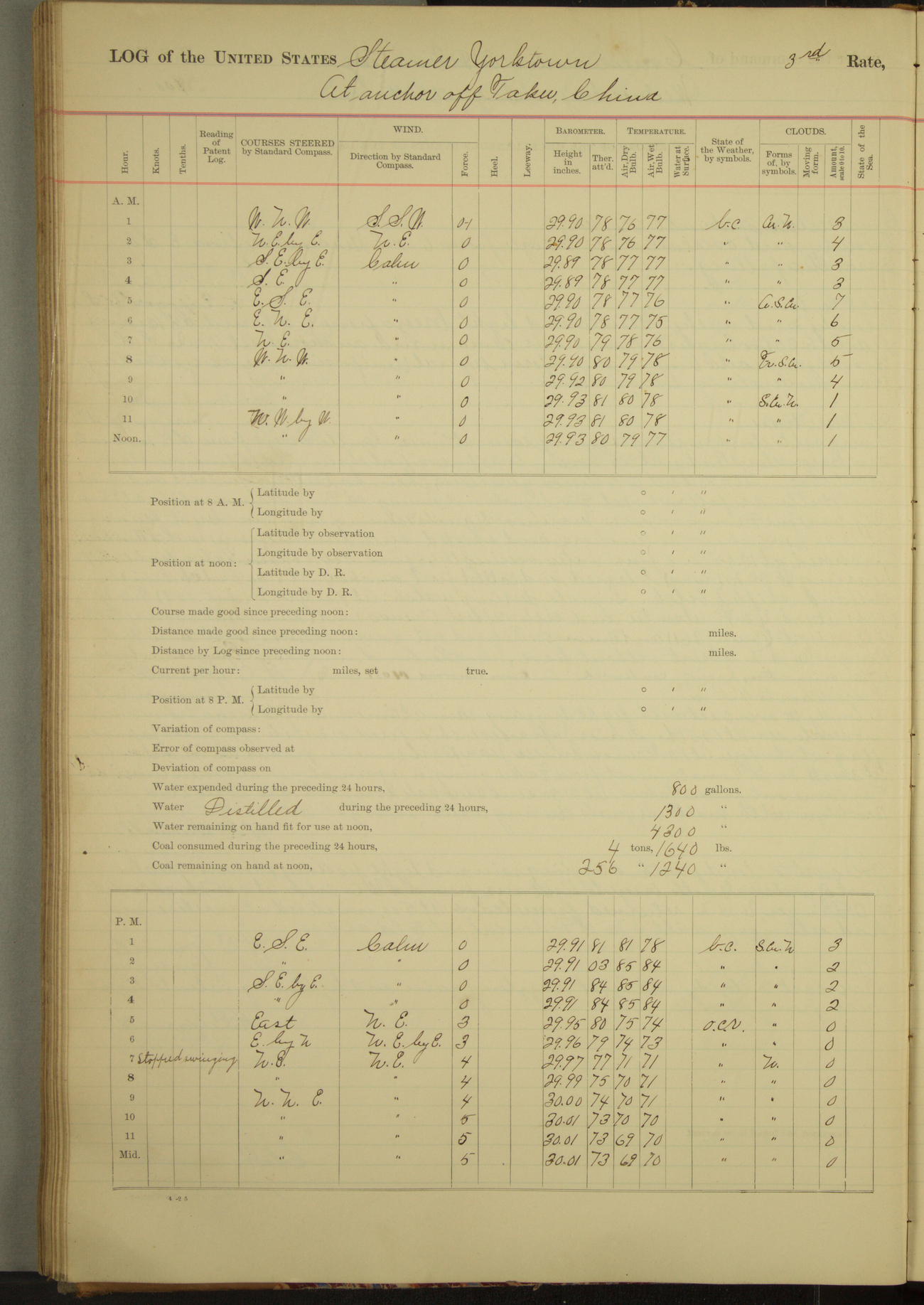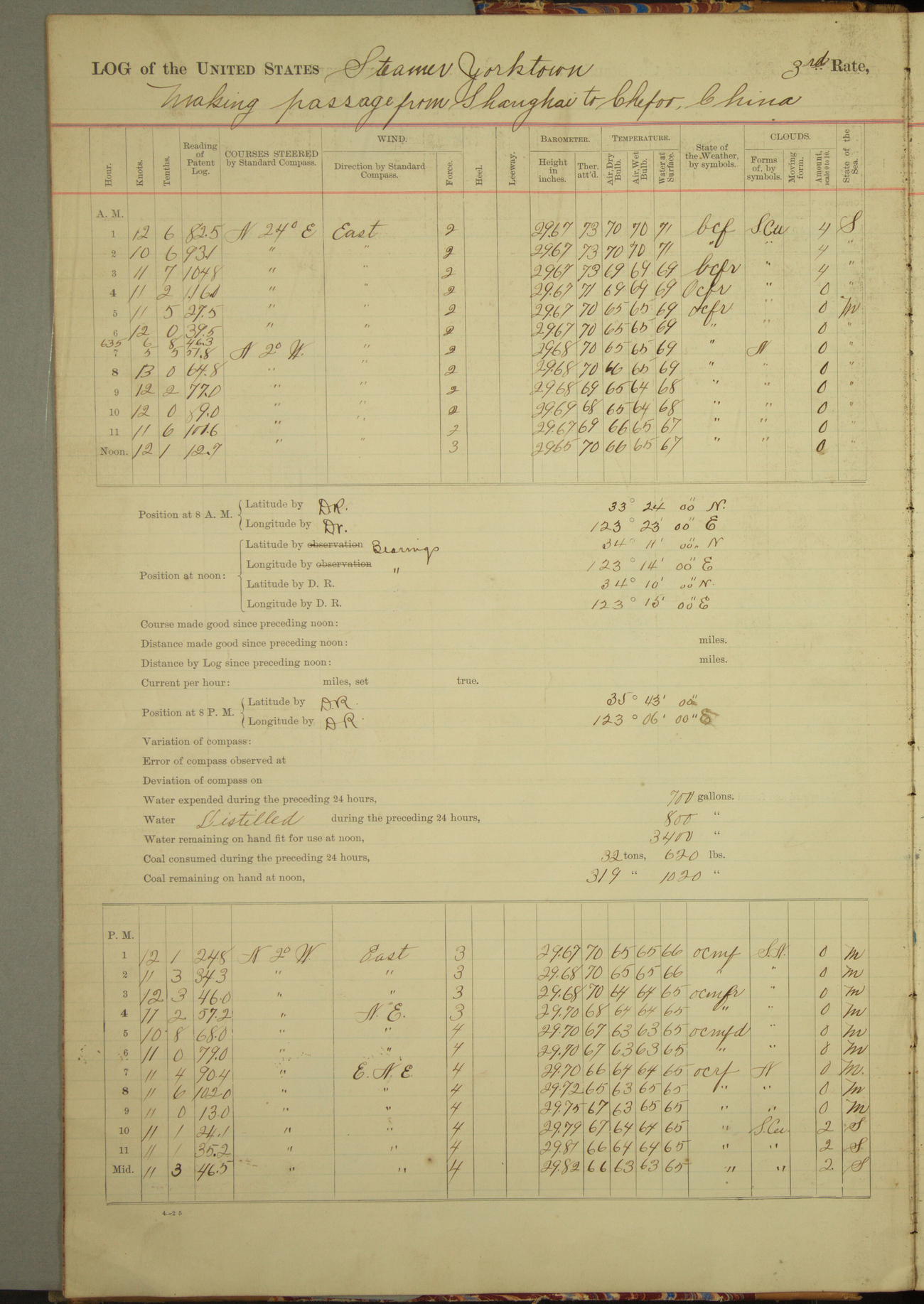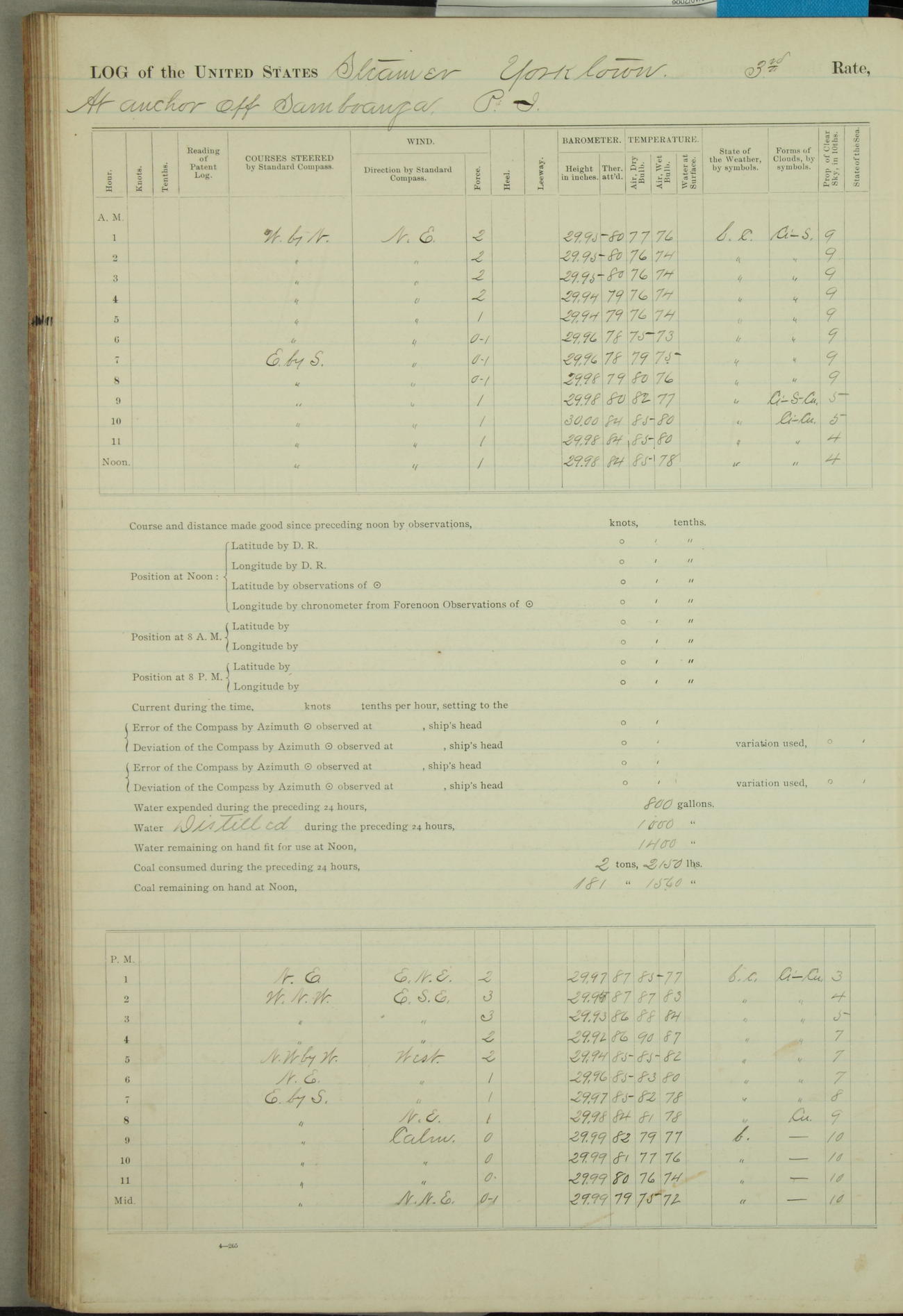 Under [steam from] 3 boilers, course N76°E per standard compass.