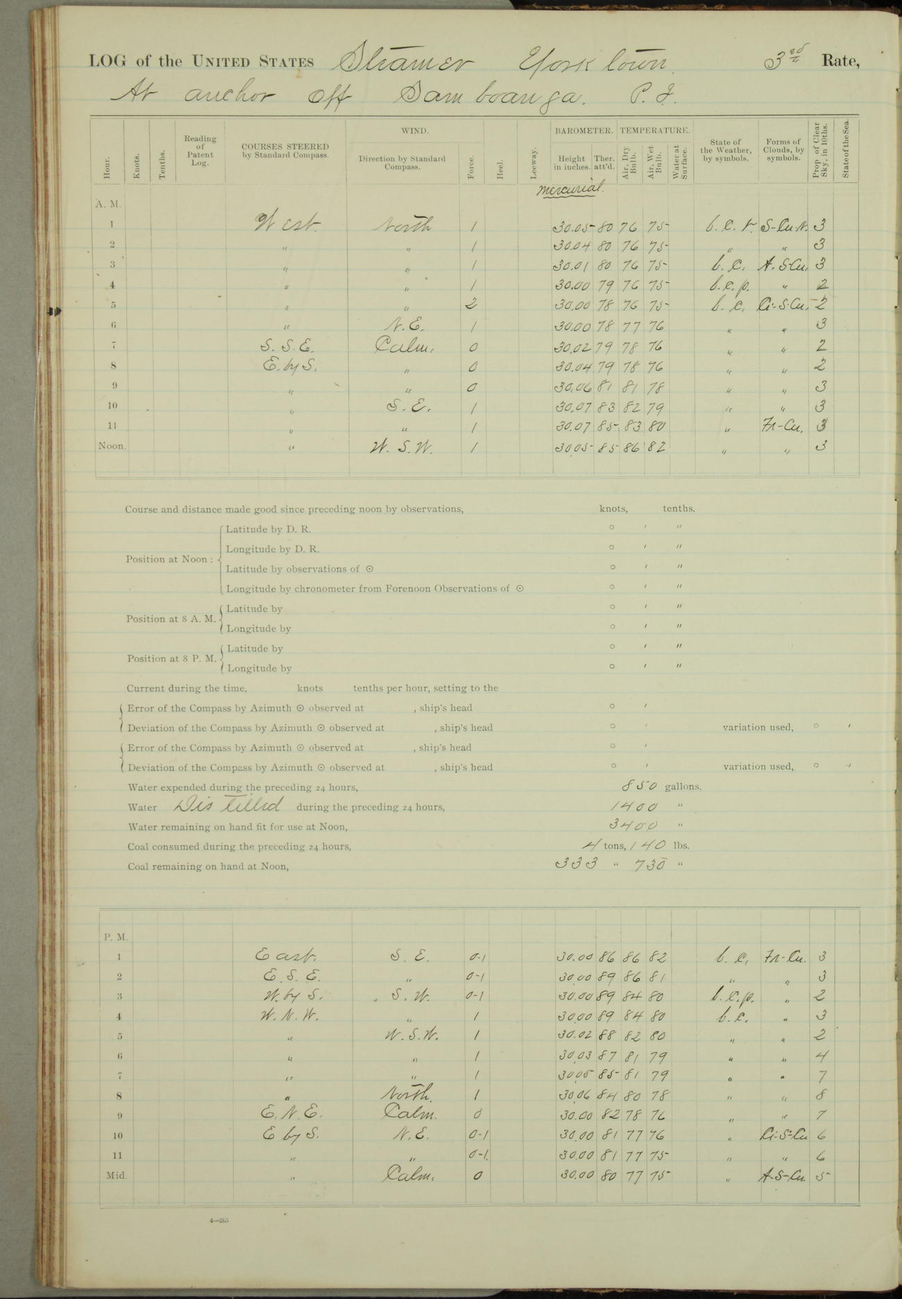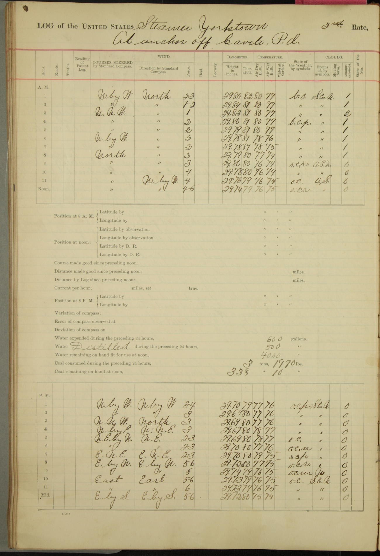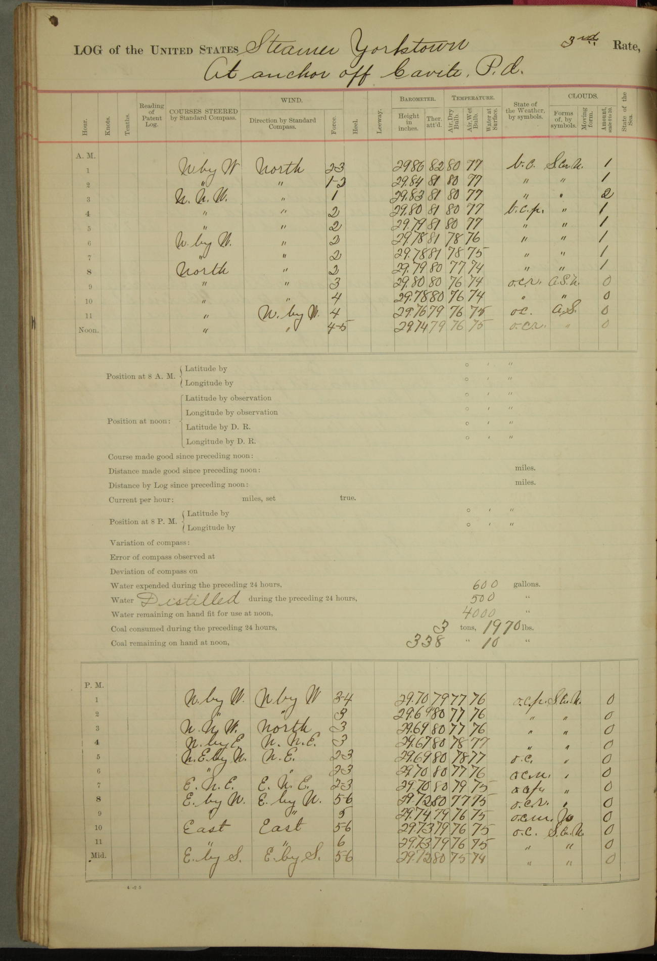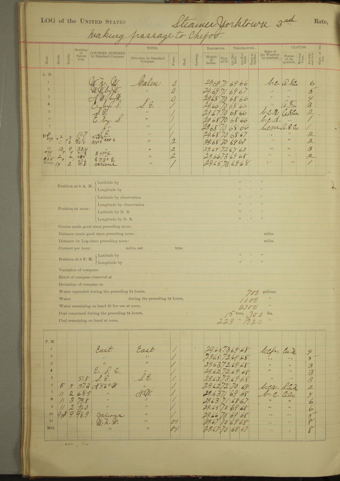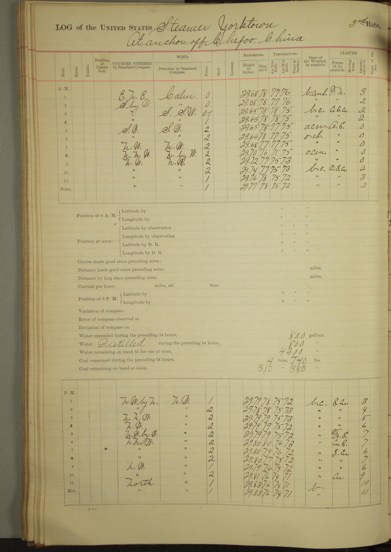 Under [steam from] 3 boilers, course N76°E per standard compass.