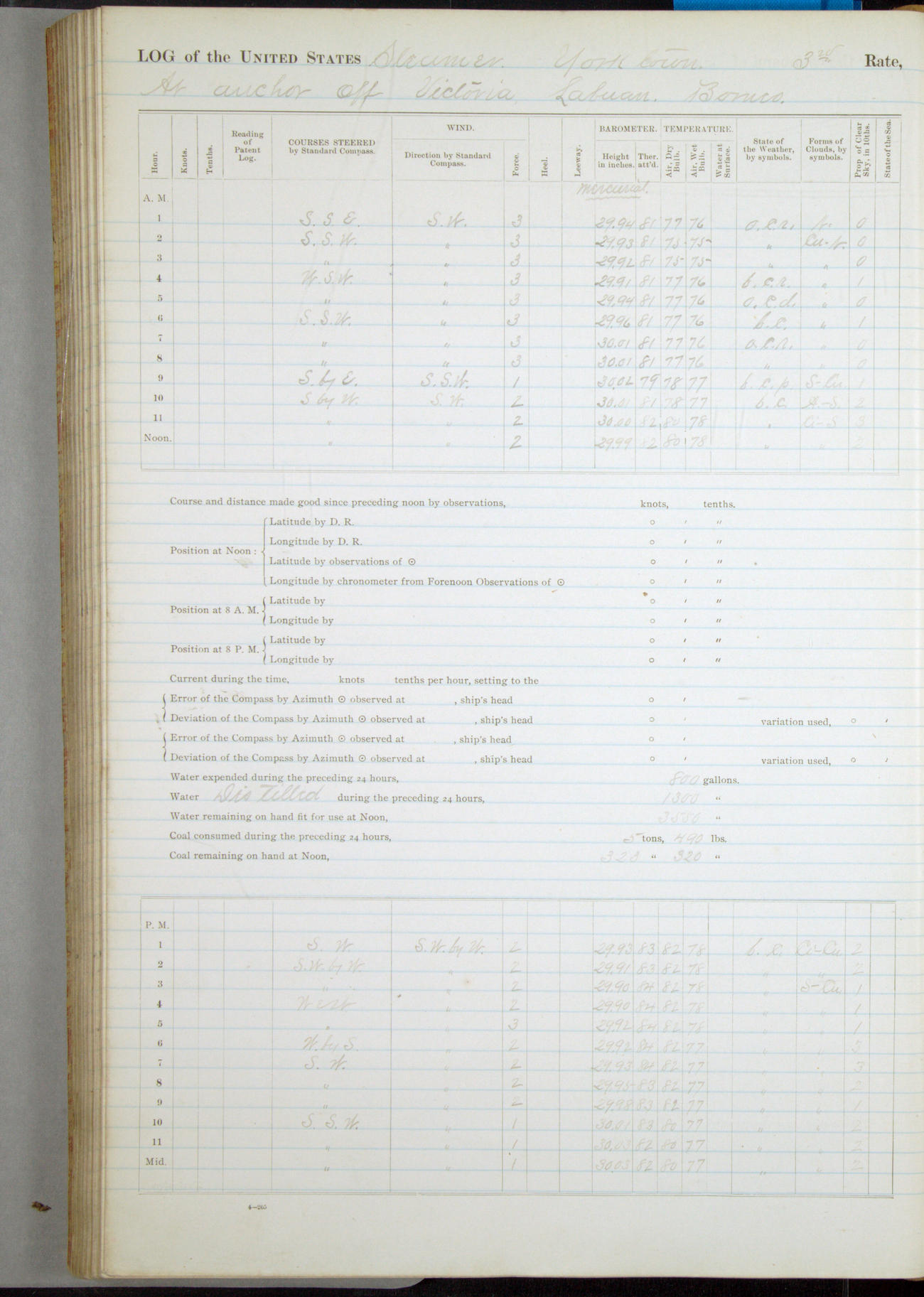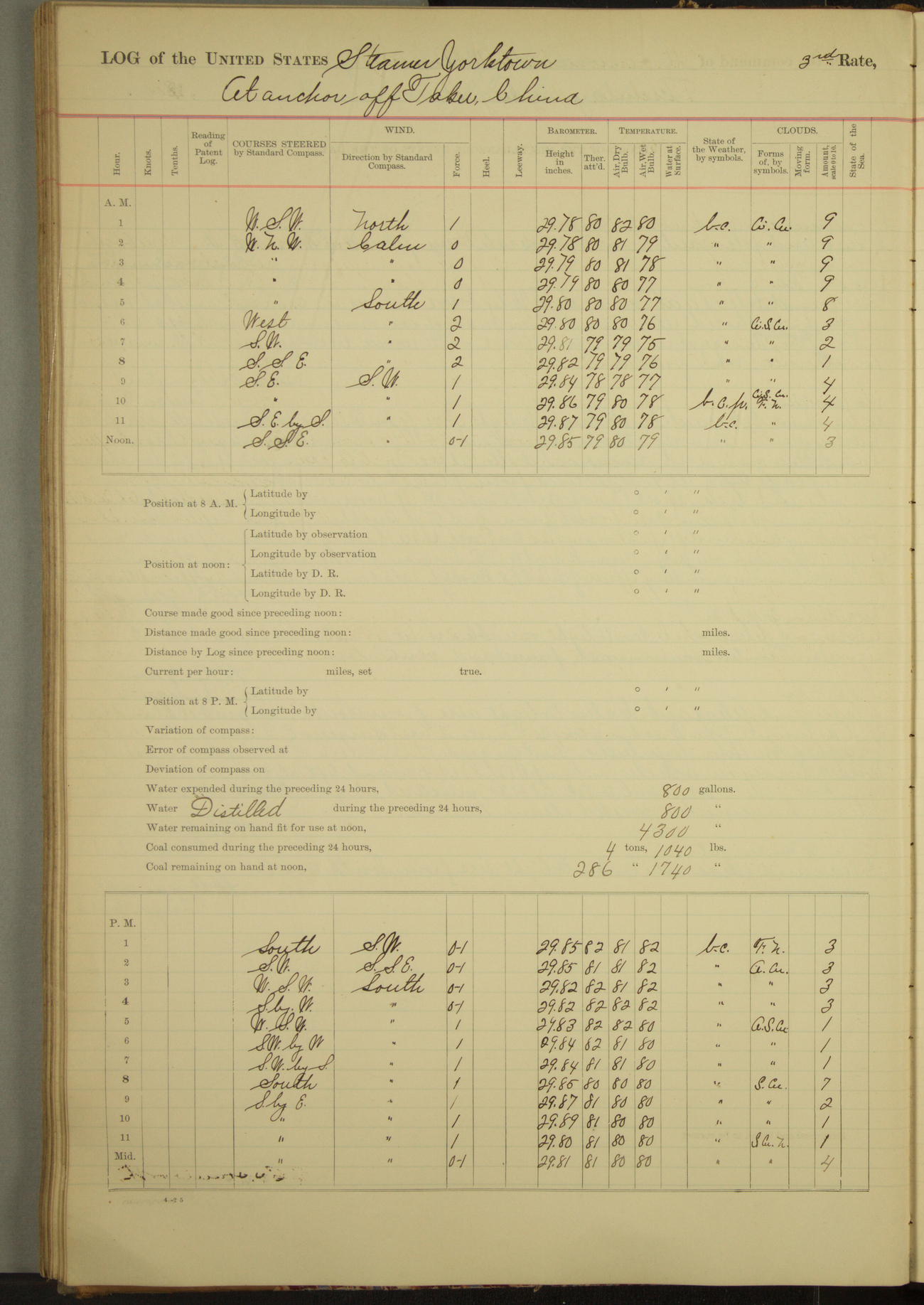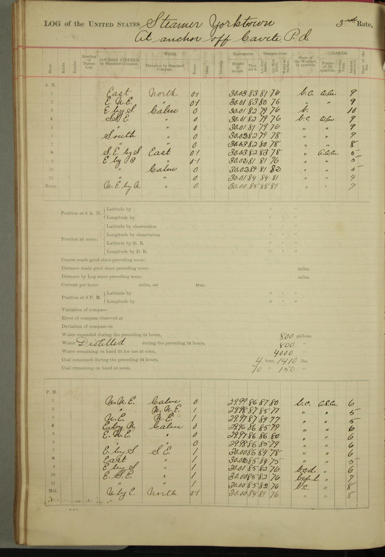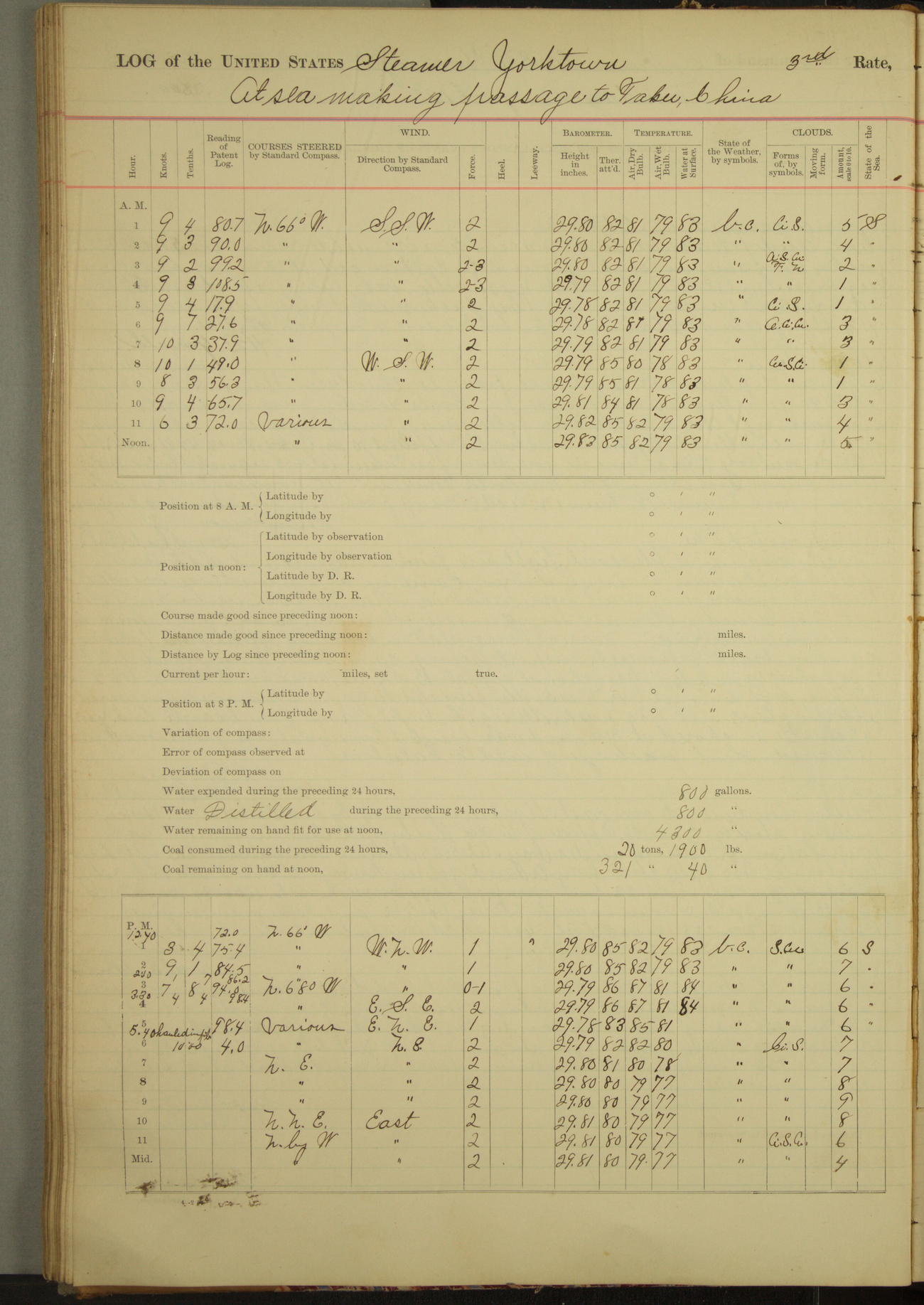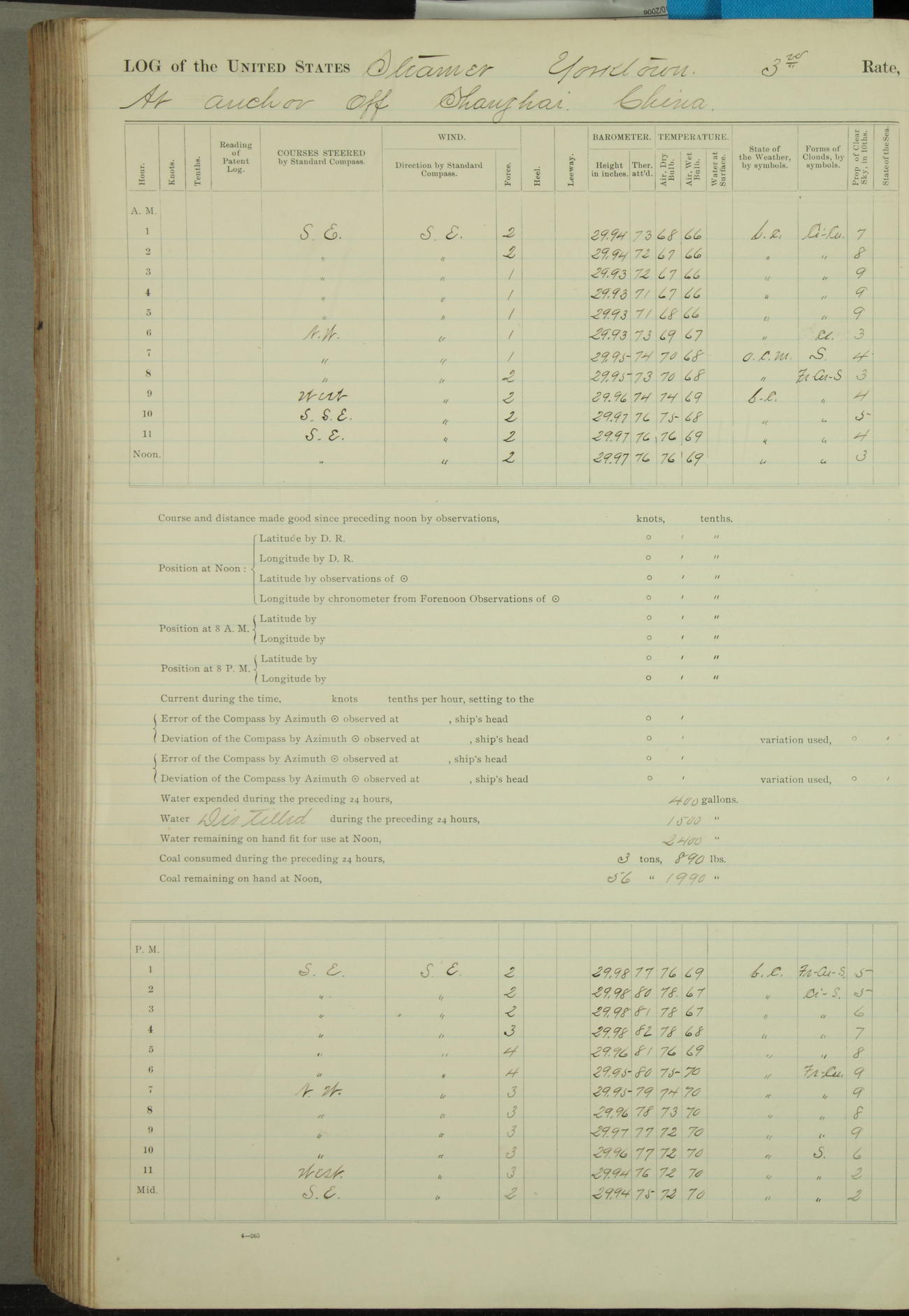 Under [steam from] 3 boilers, course N76°E per standard compass.