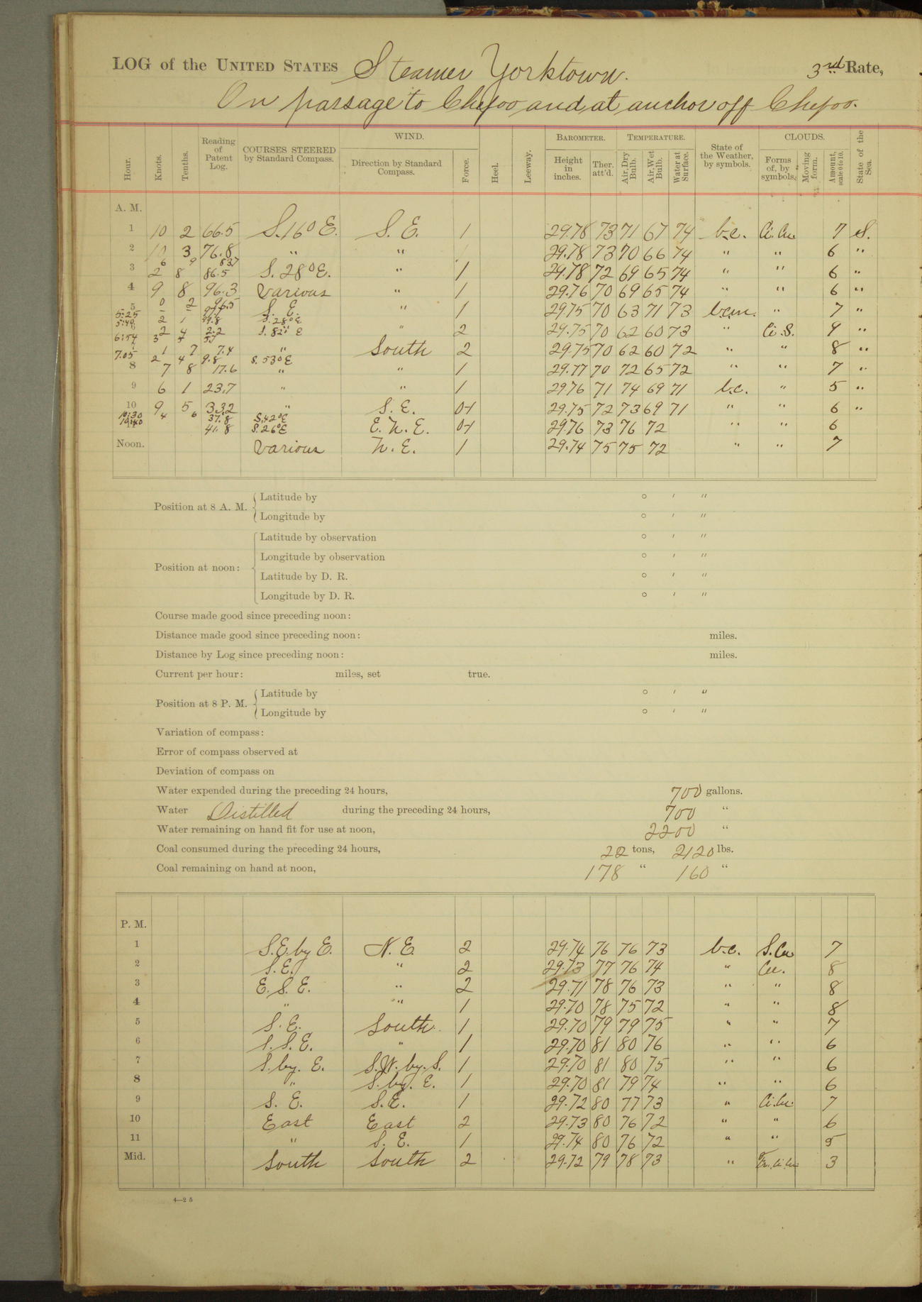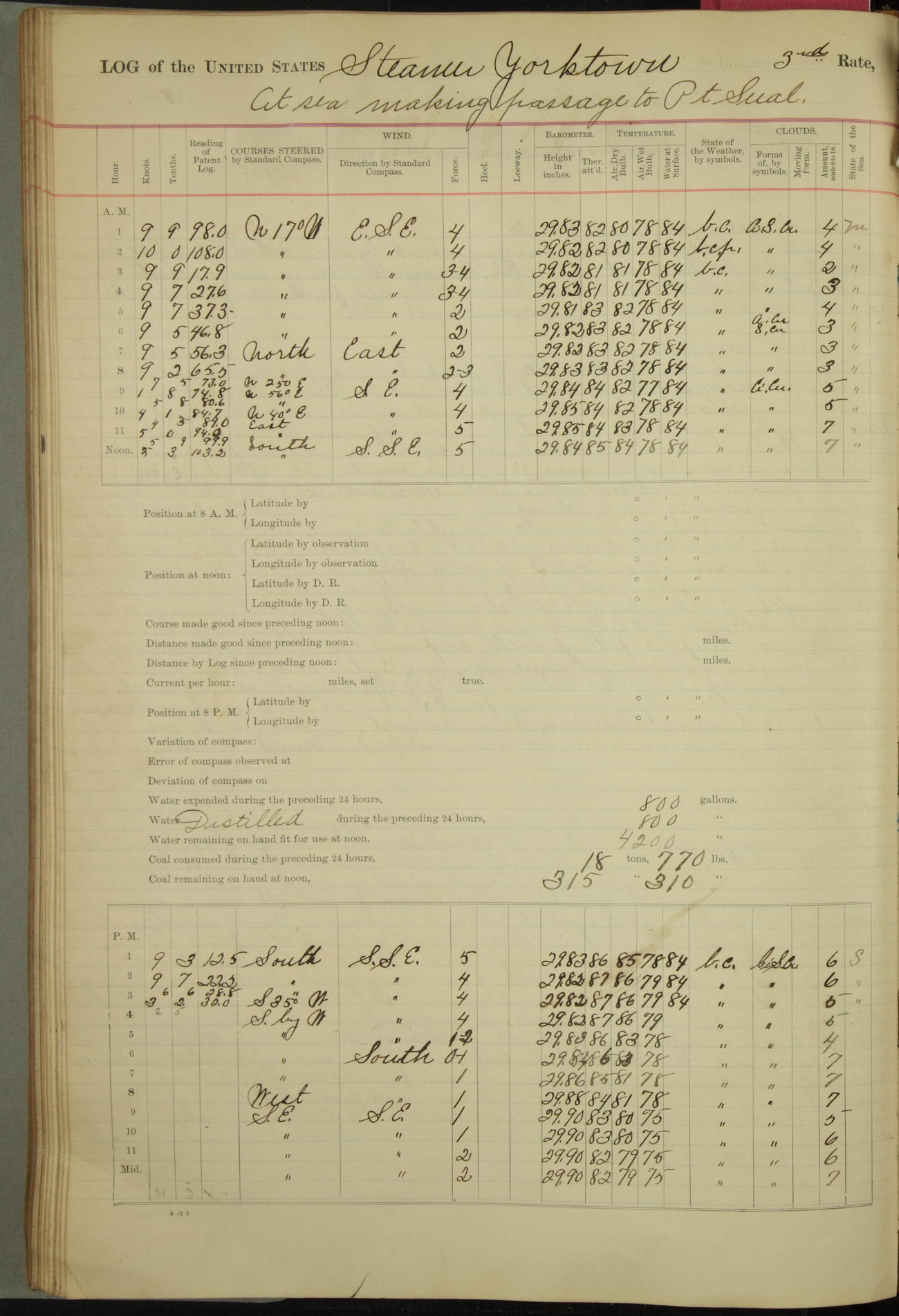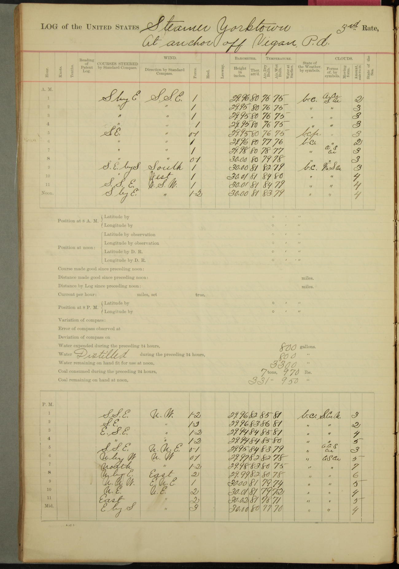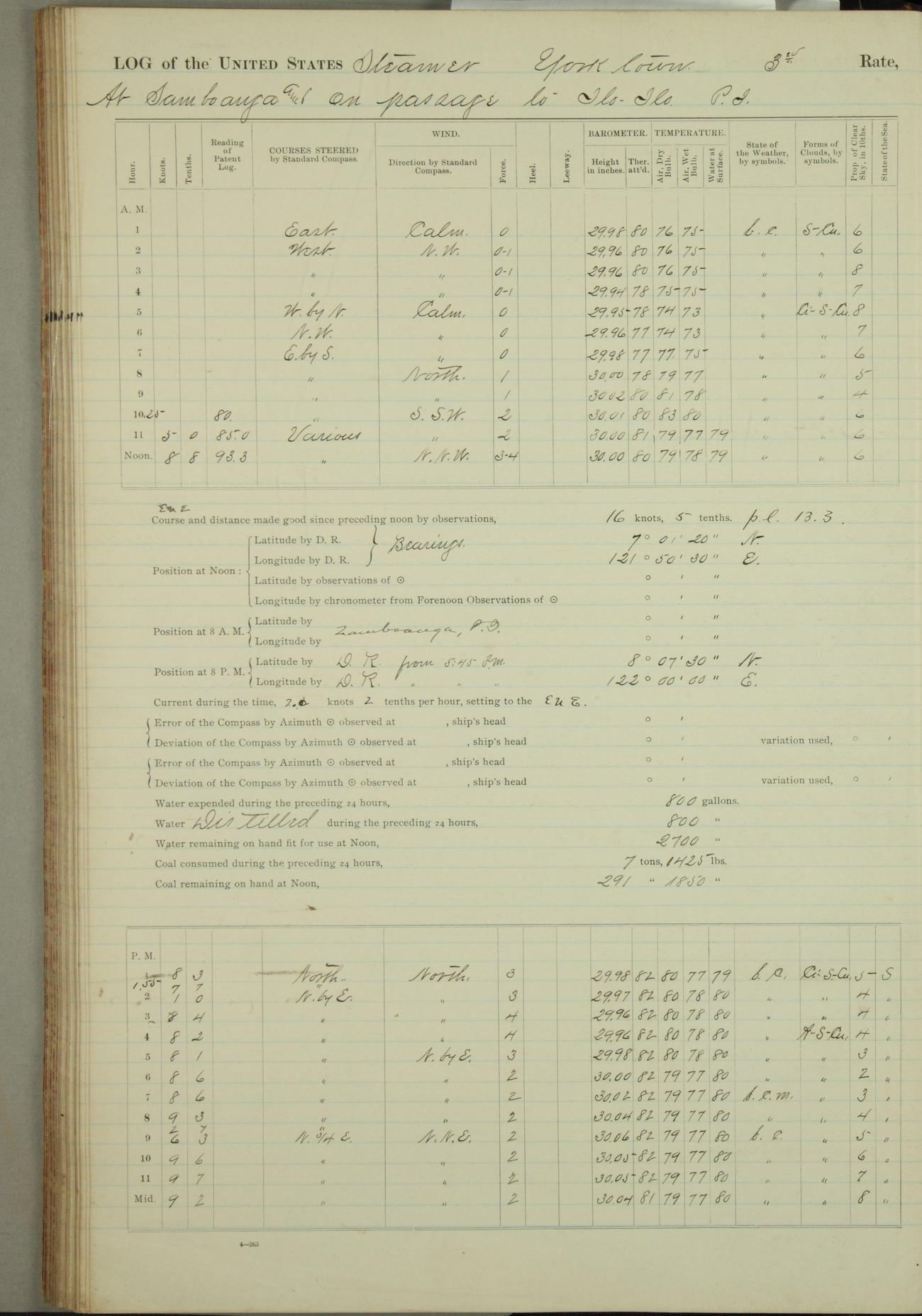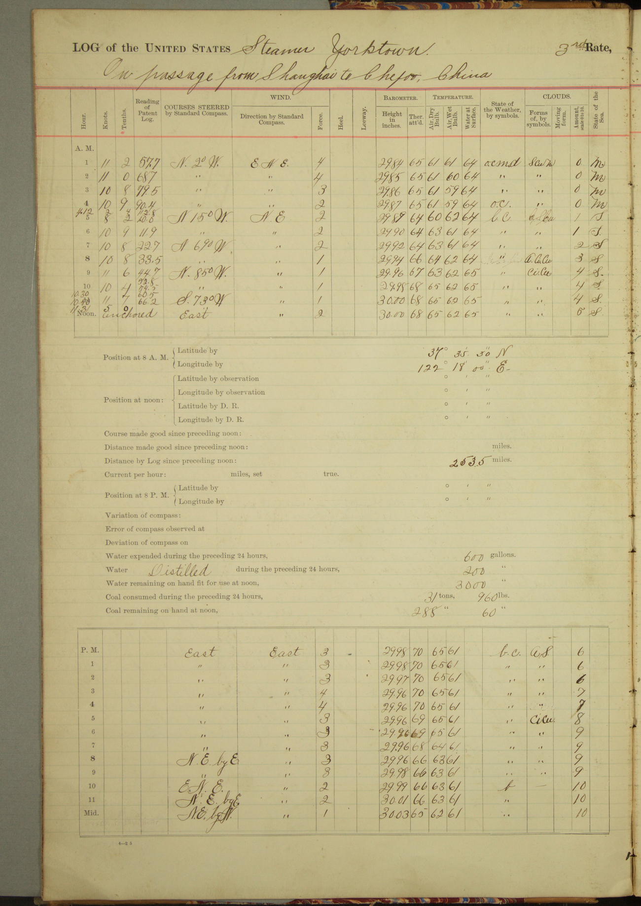 Under [steam from] 3 boilers, course N76°E per standard compass.