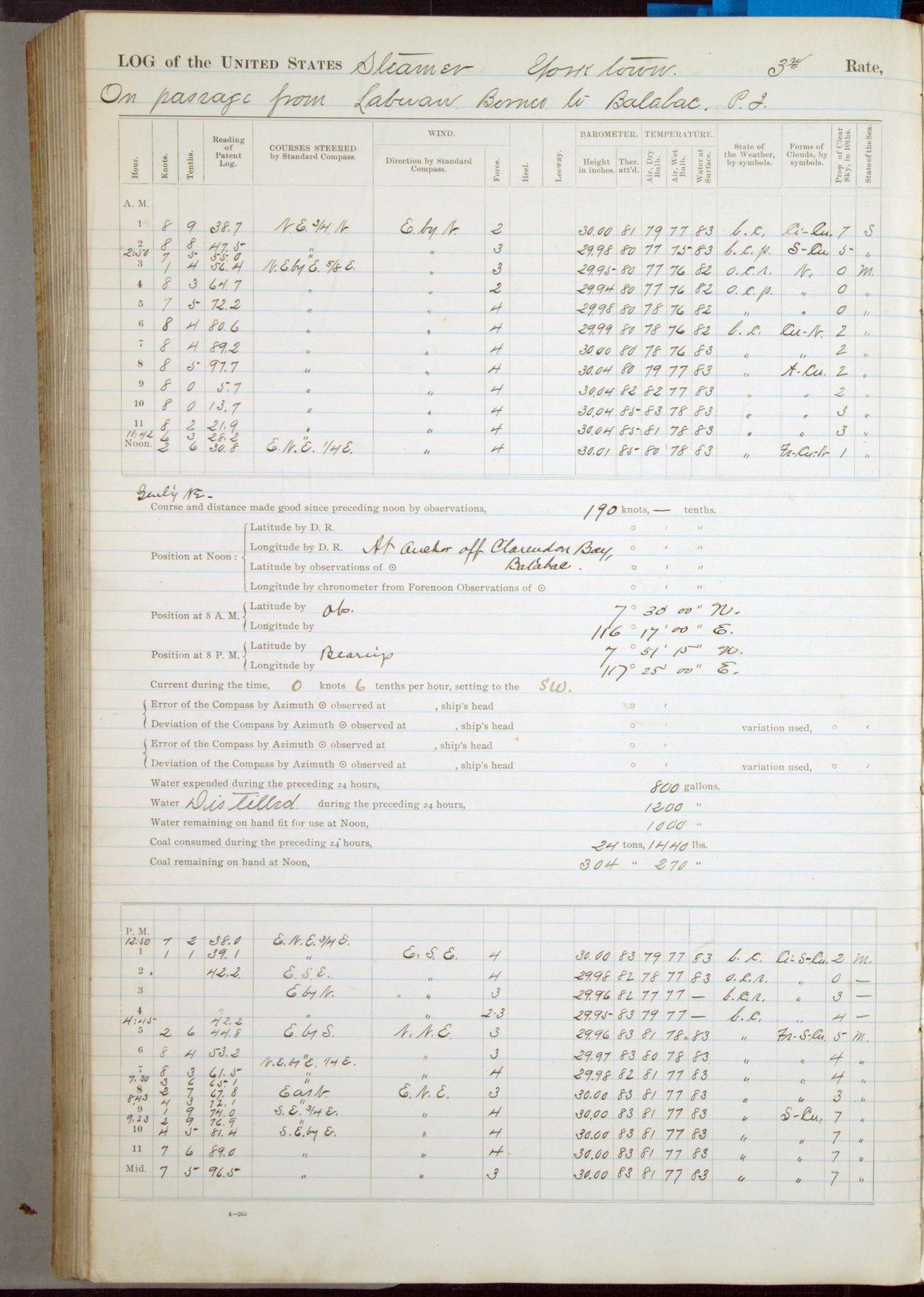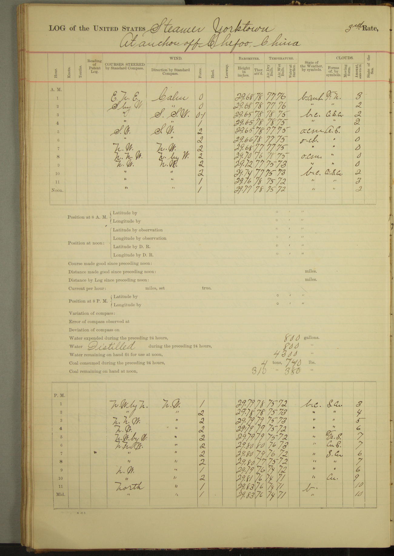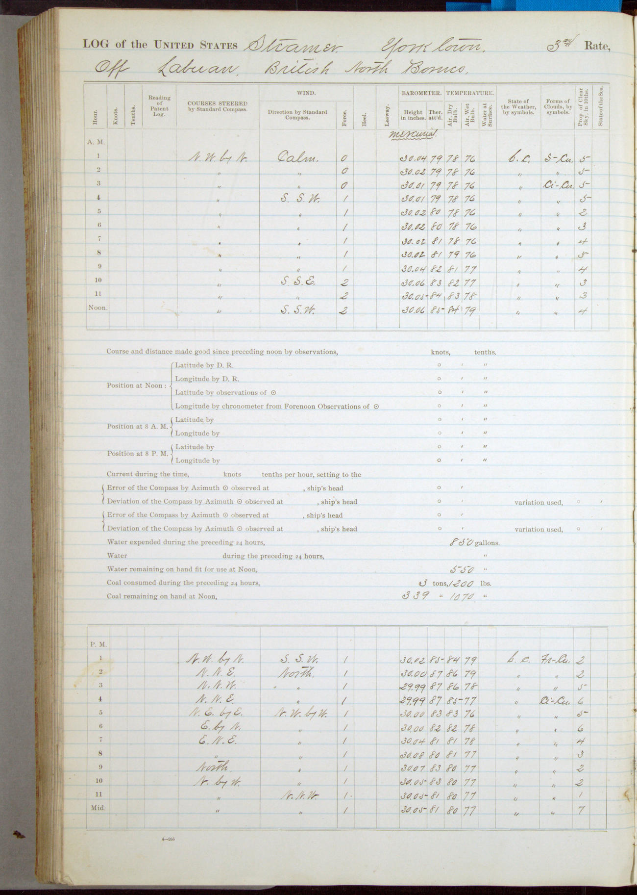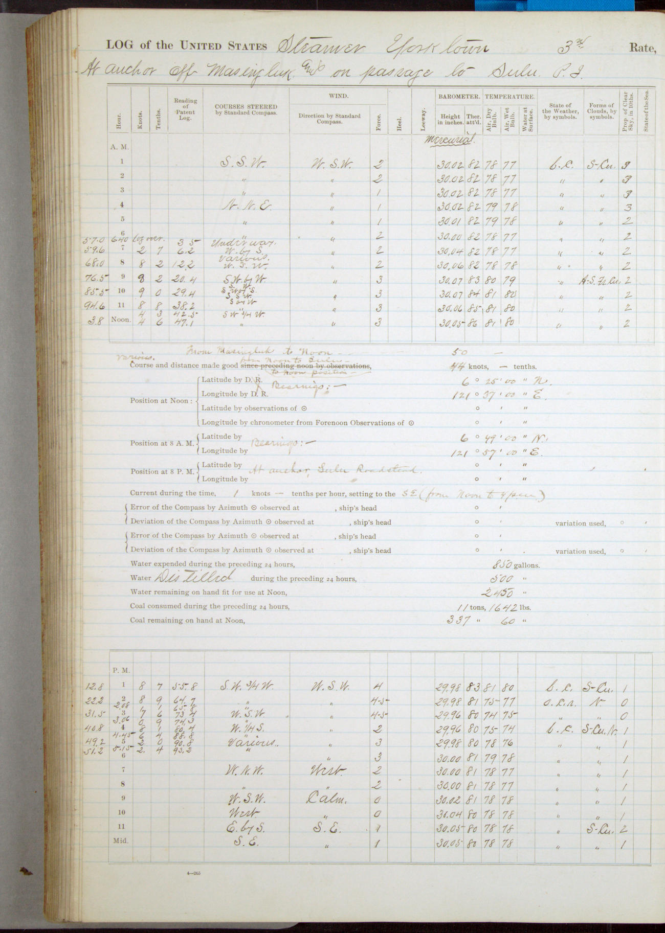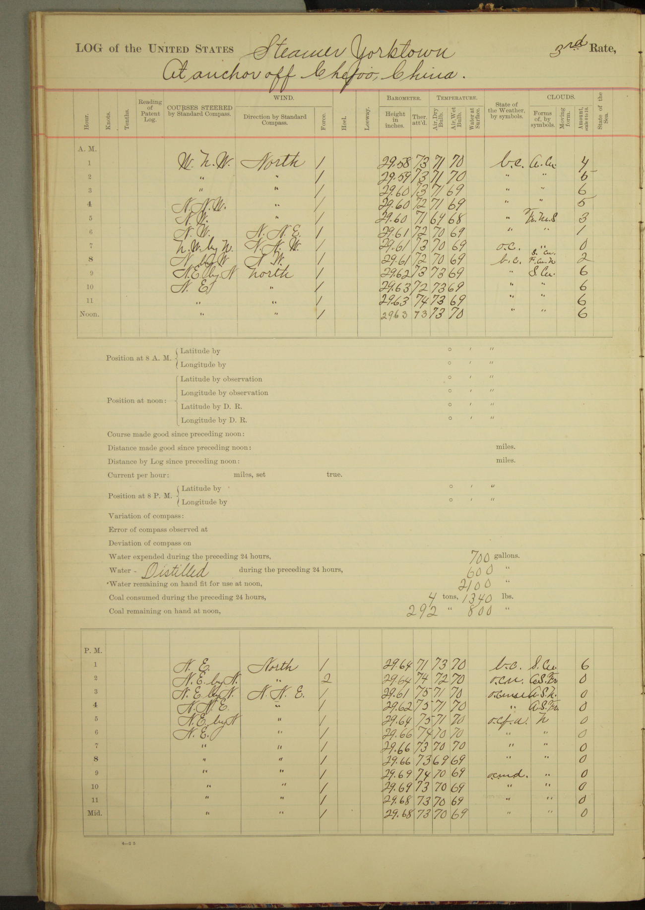 Under [steam from] 3 boilers, course N76°E per standard compass.