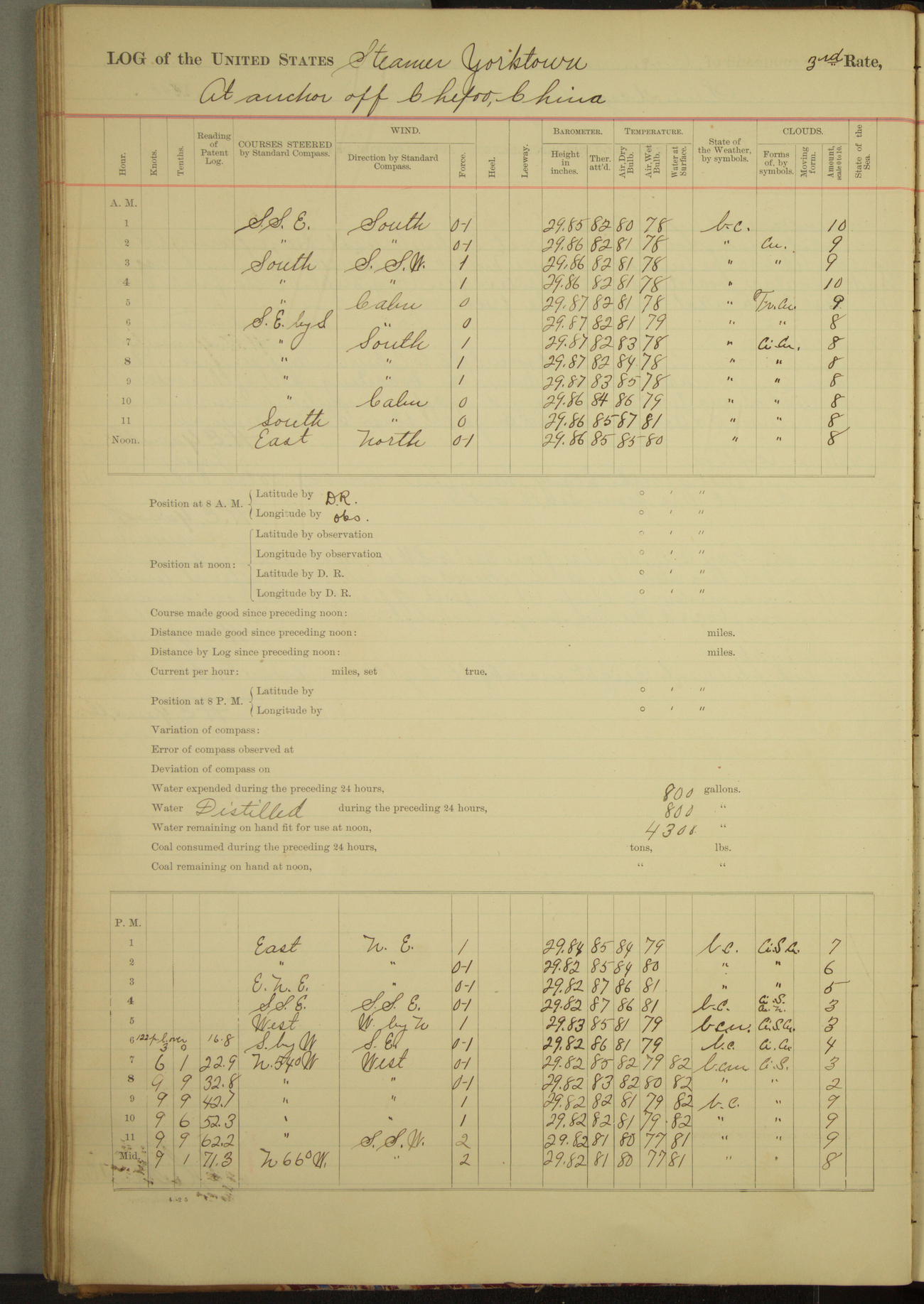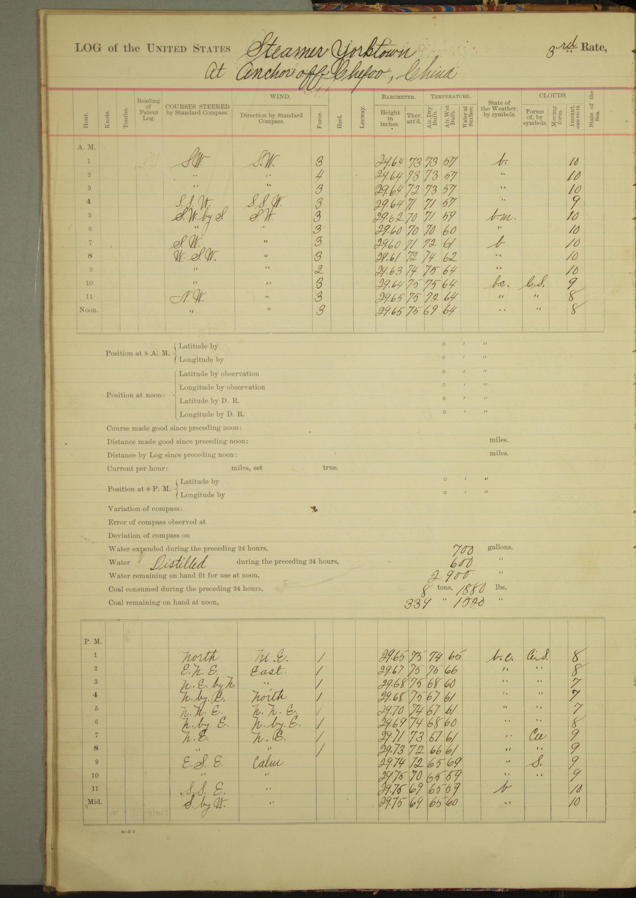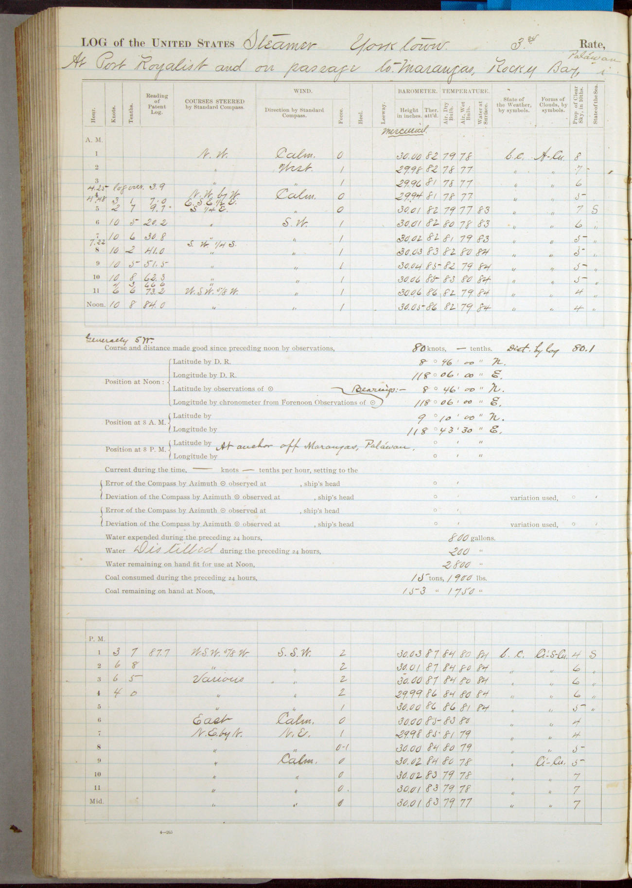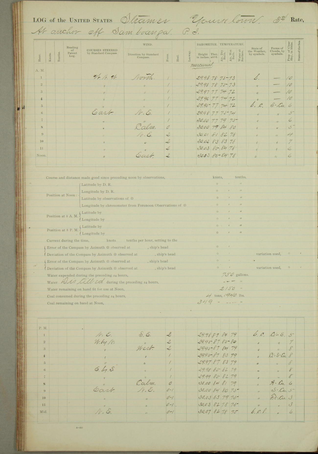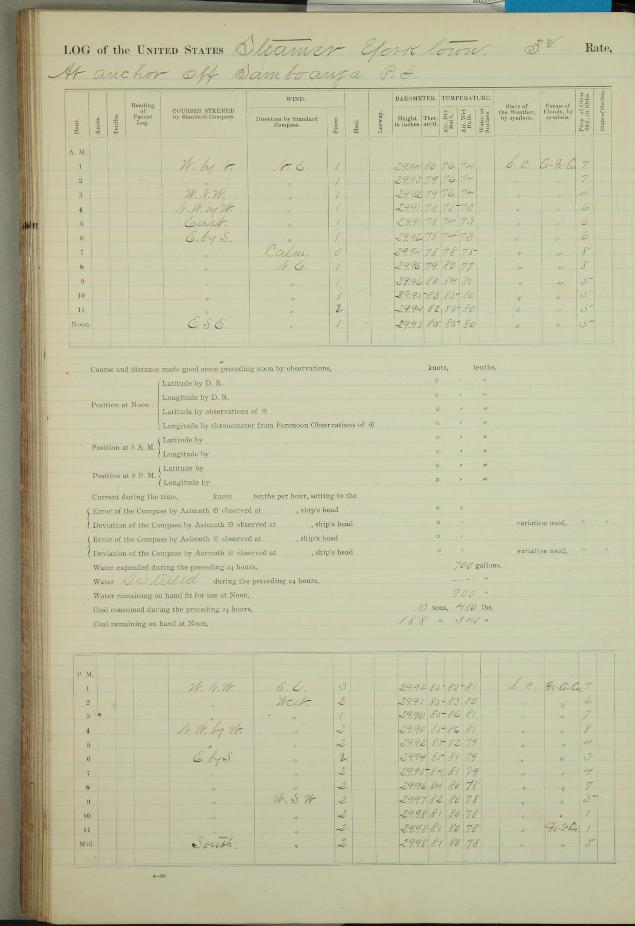 Under [steam from] 3 boilers, course N76°E per standard compass.