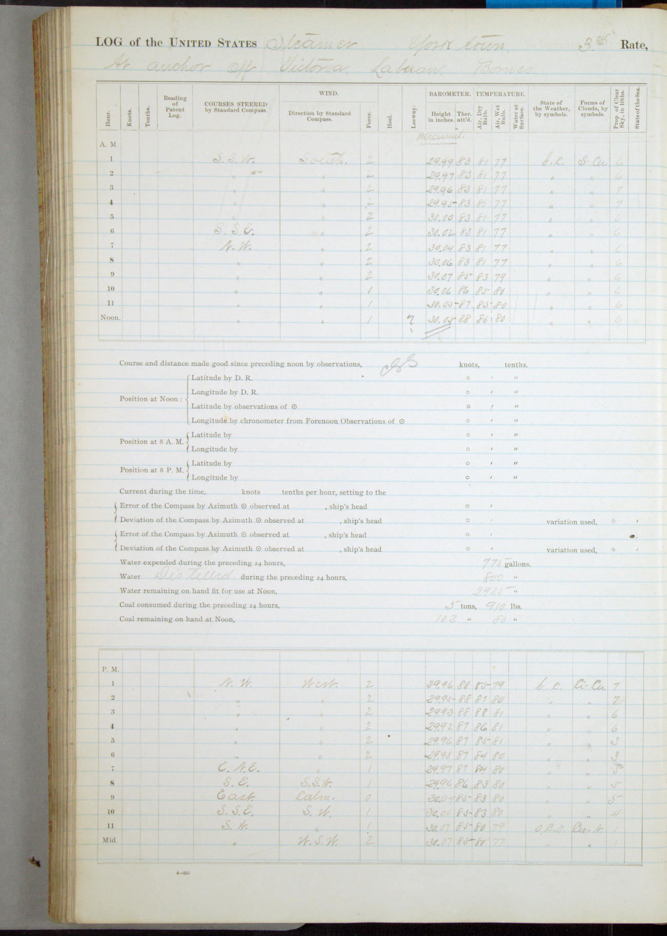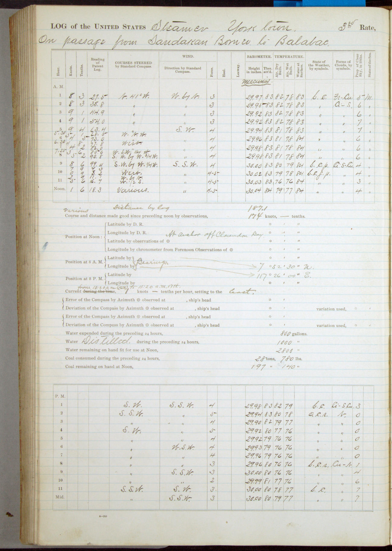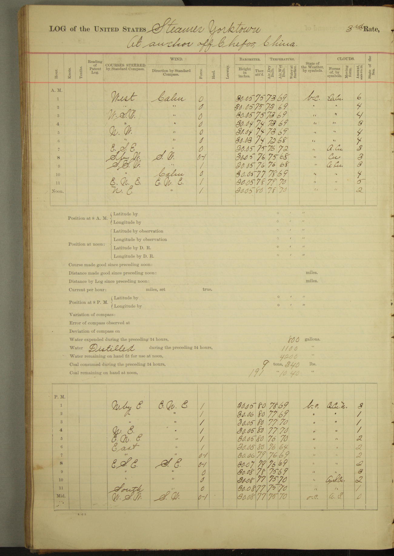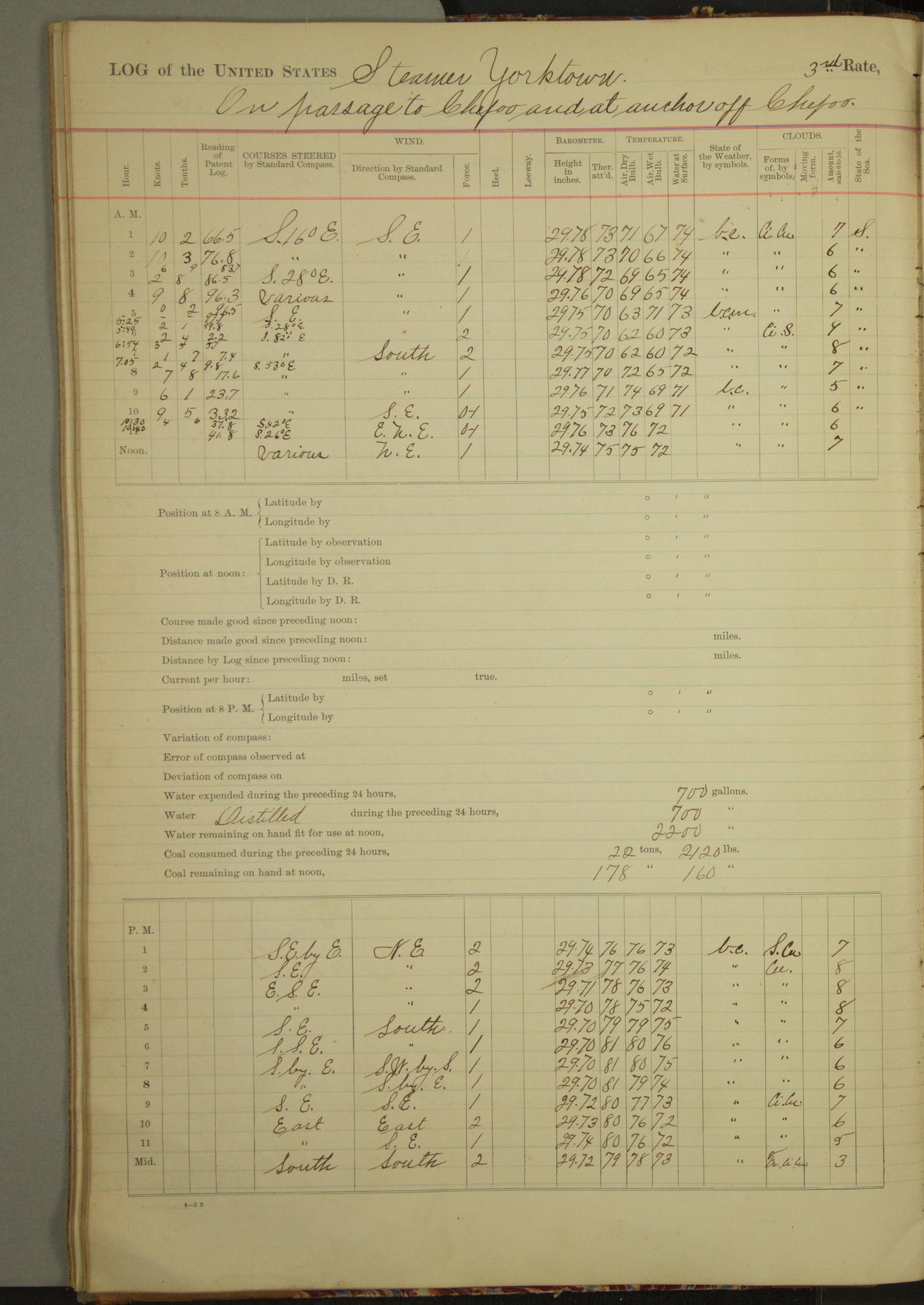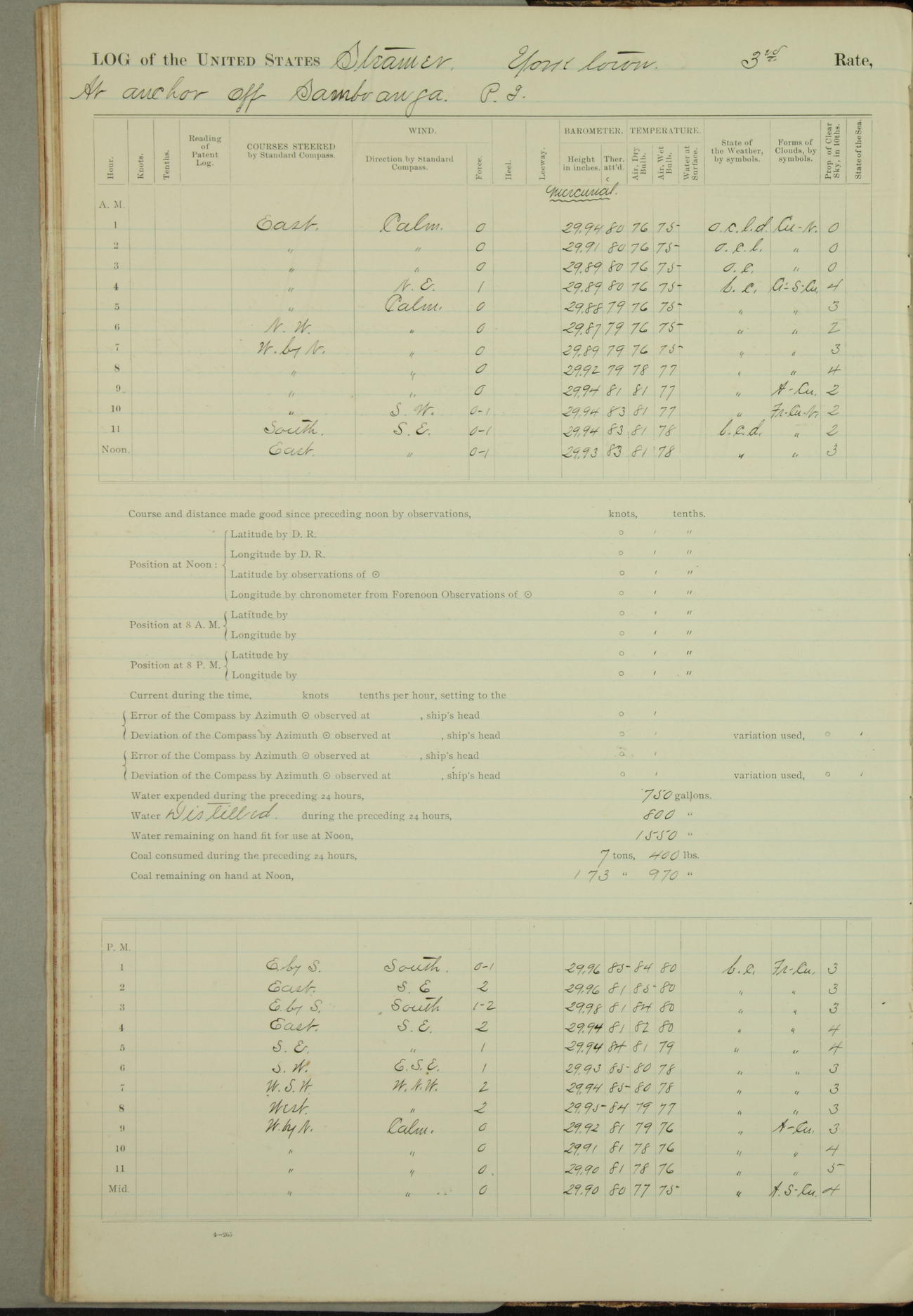 Under [steam from] 3 boilers, course N76°E per standard compass.