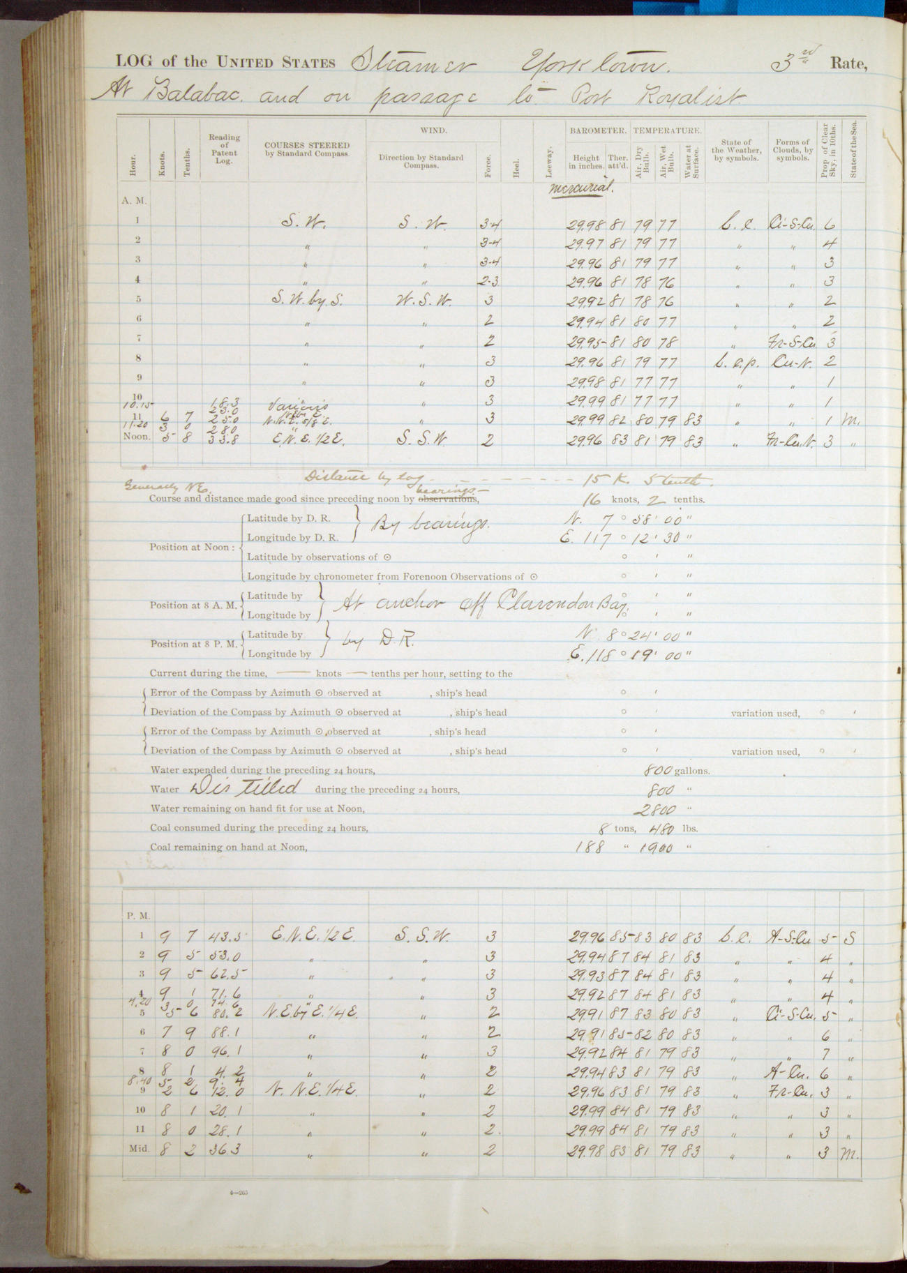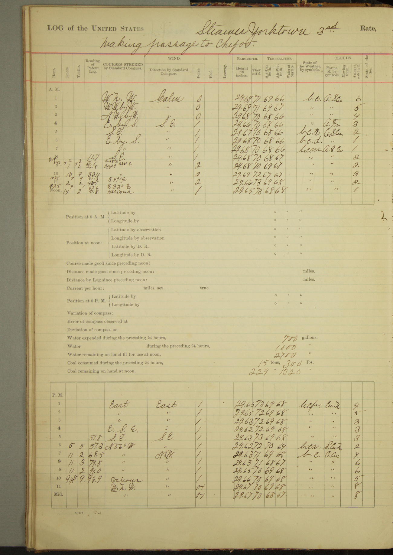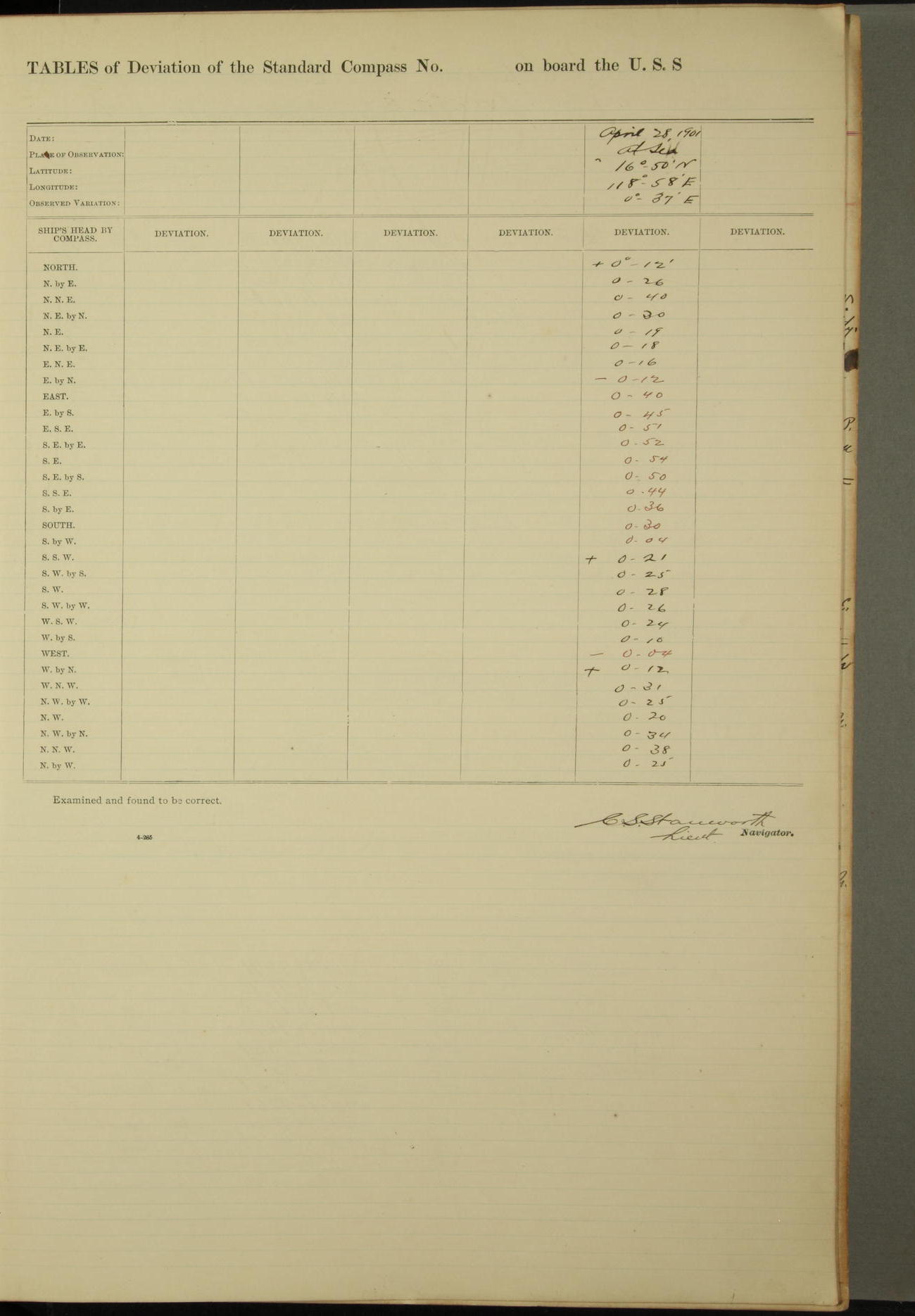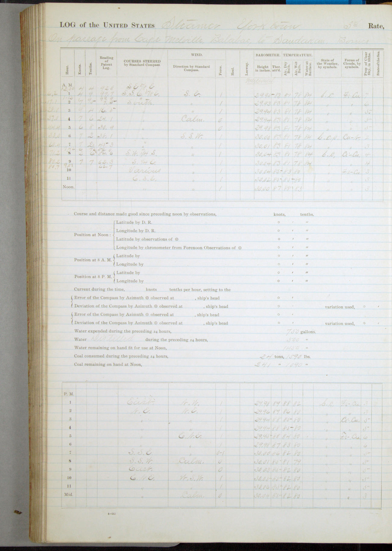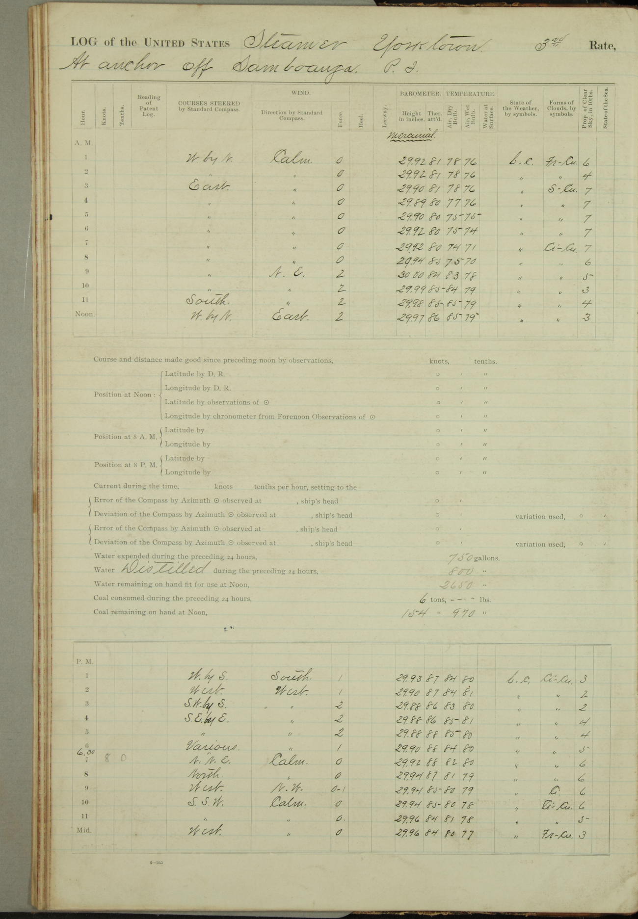 Under [steam from] 3 boilers, course N76°E per standard compass.
