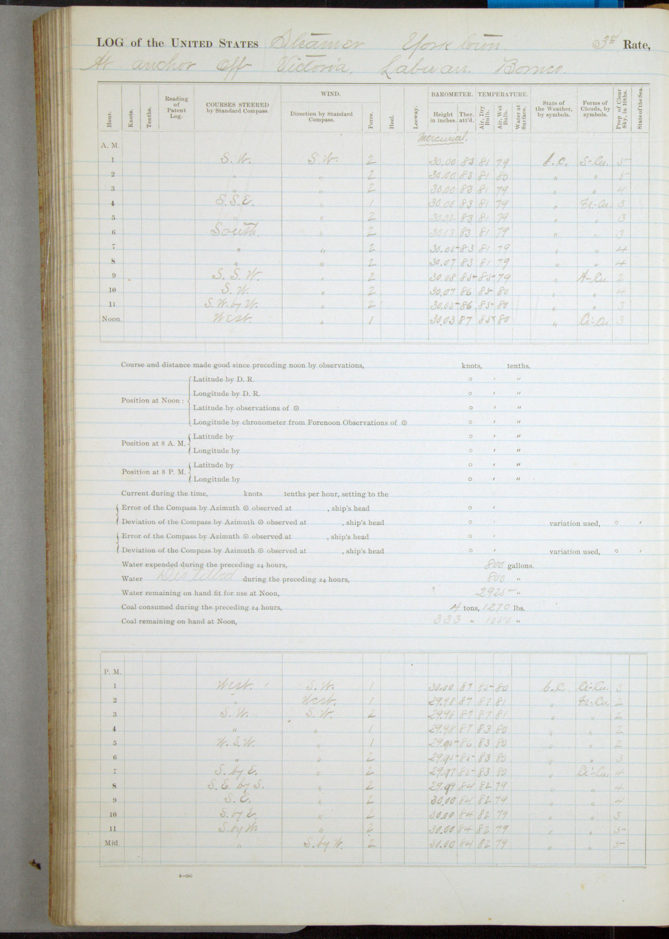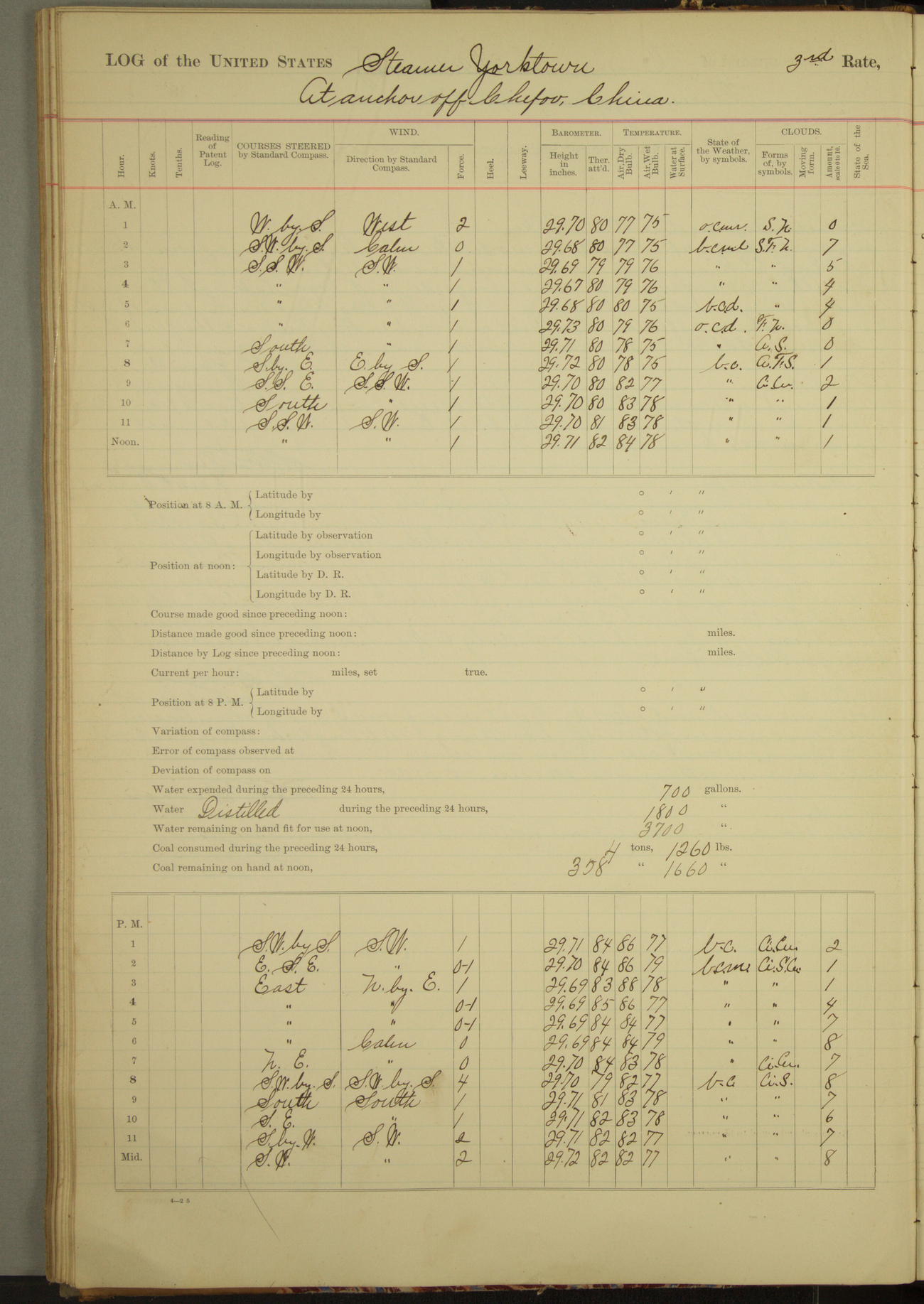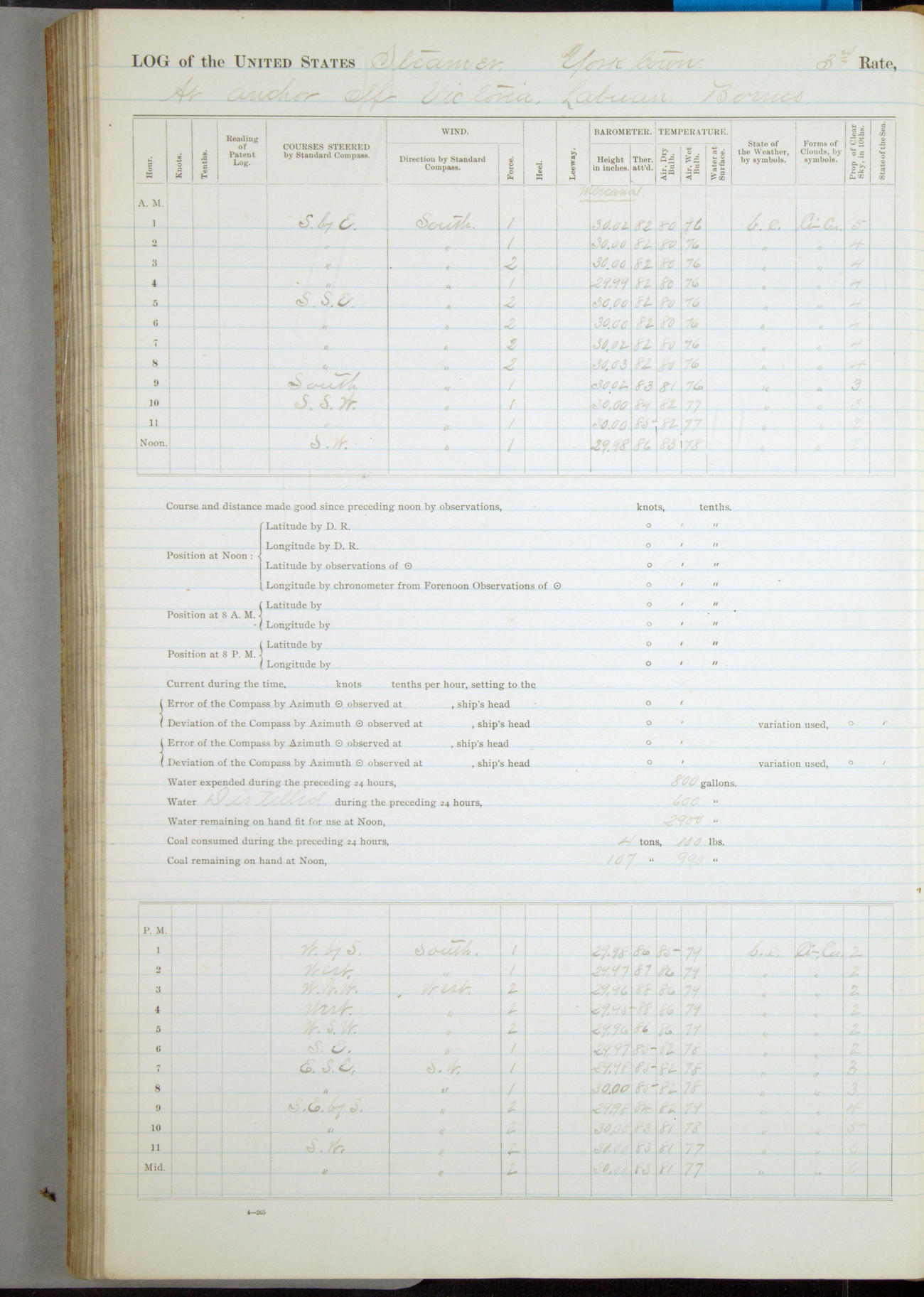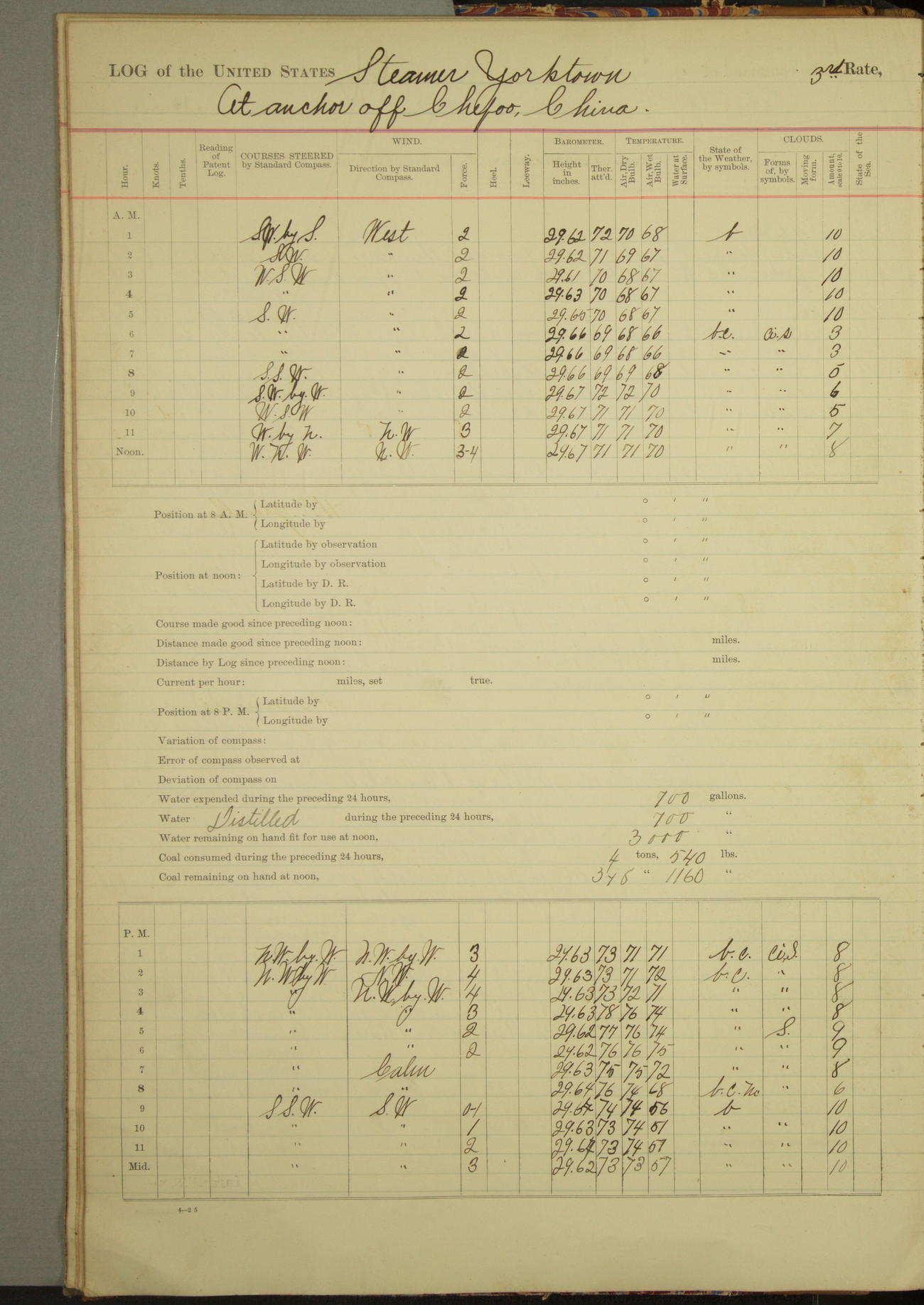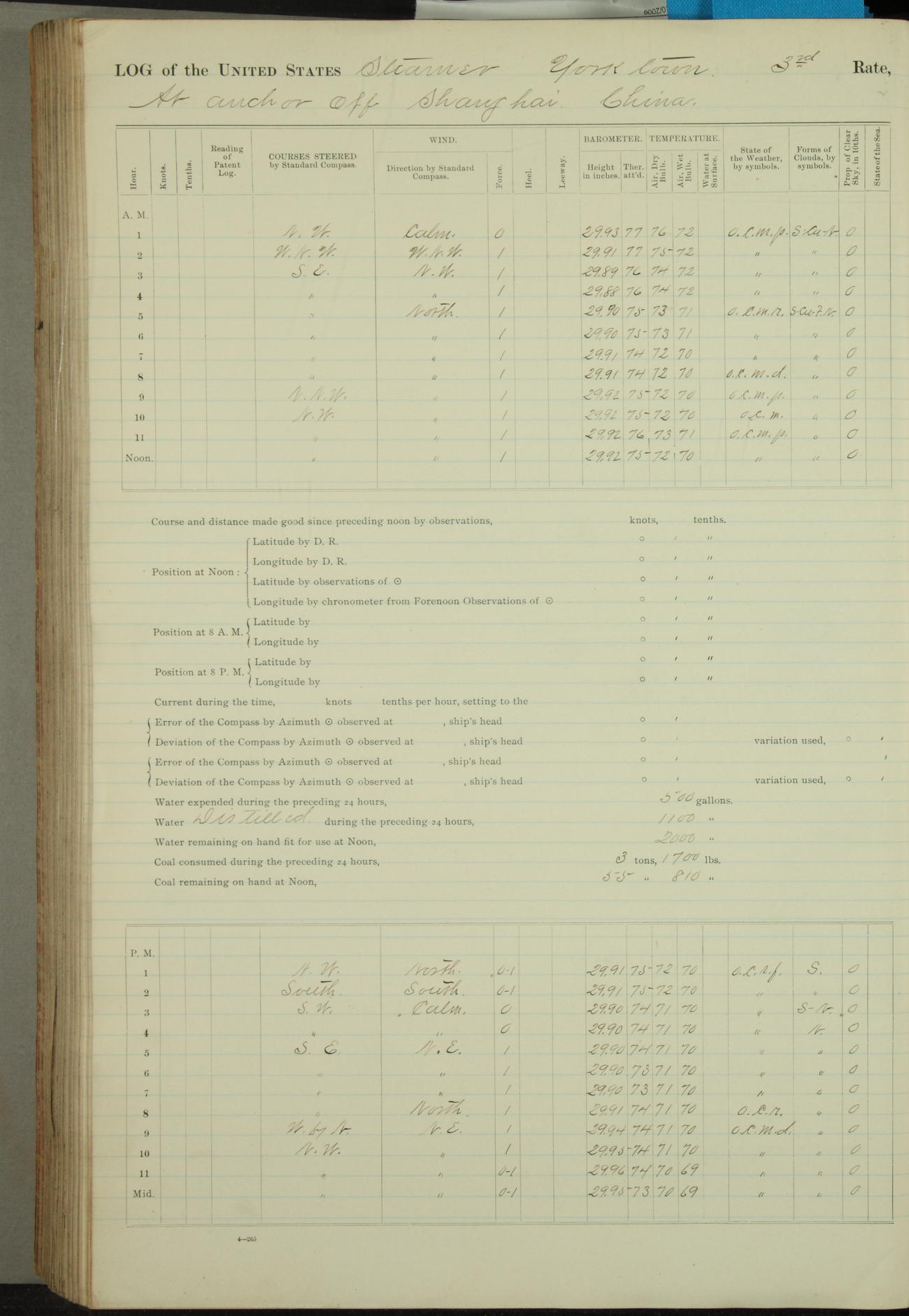 Under [steam from] 3 boilers, course N76°E per standard compass.