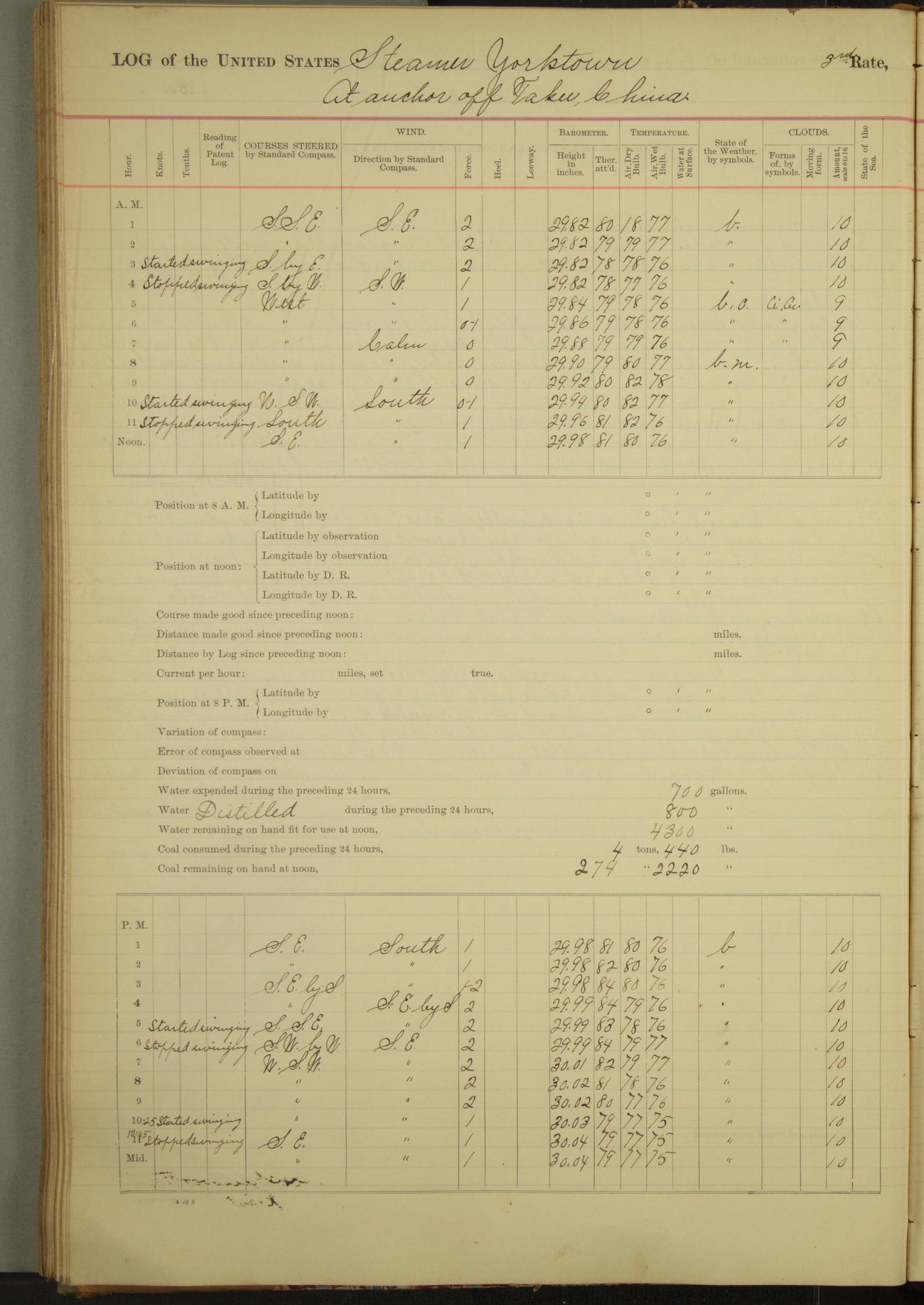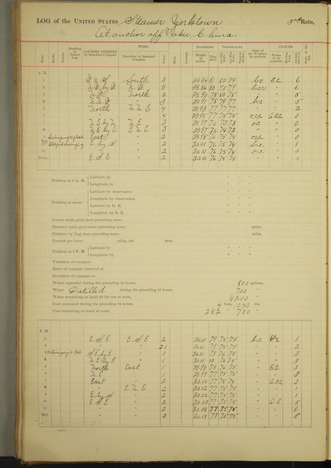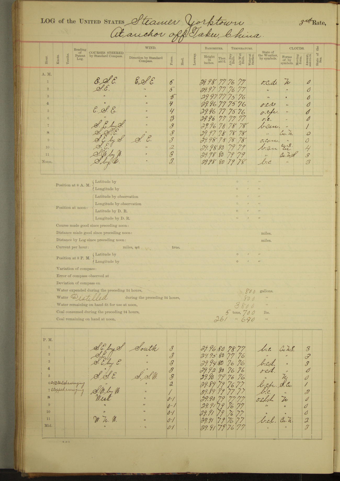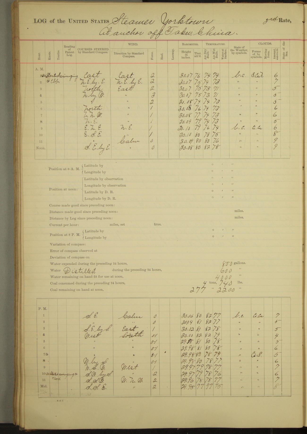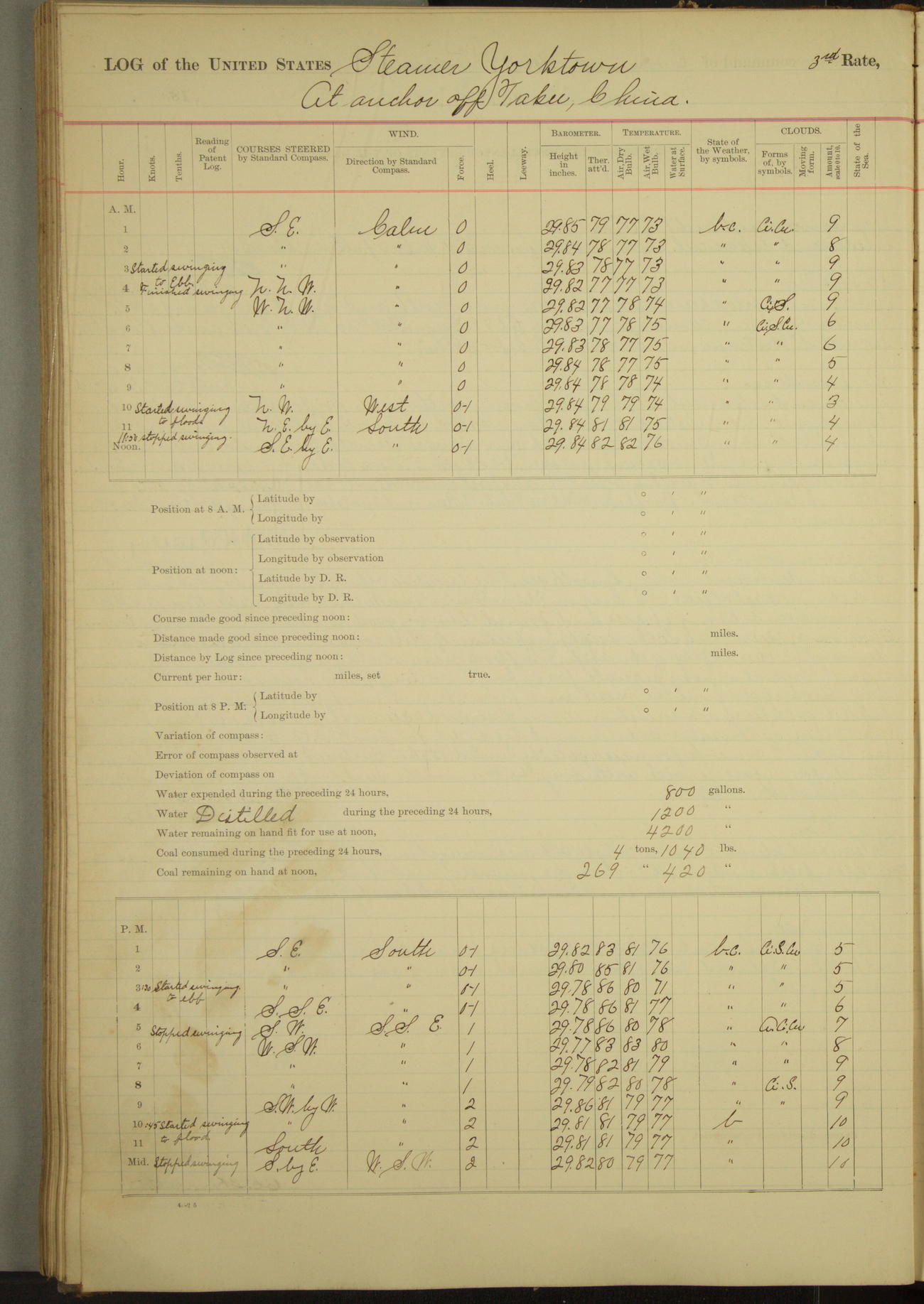 At 2.40pm came to in 5¾ fathoms [water], veering to 20 fathoms port chain.
