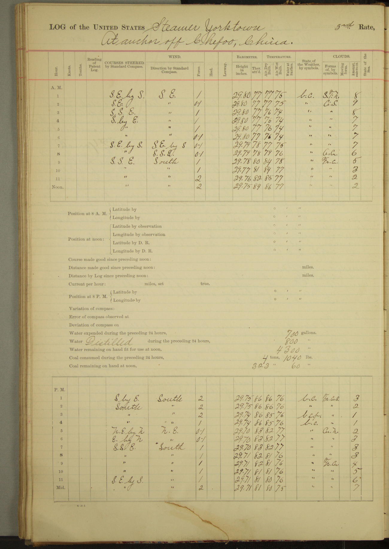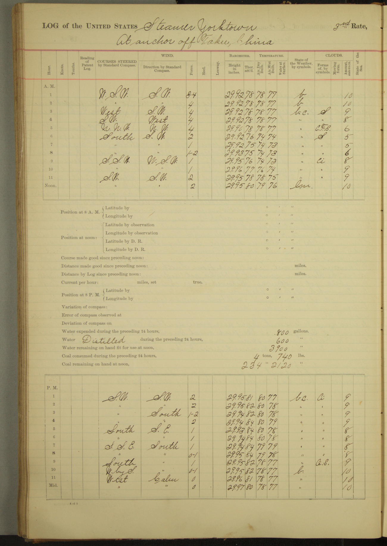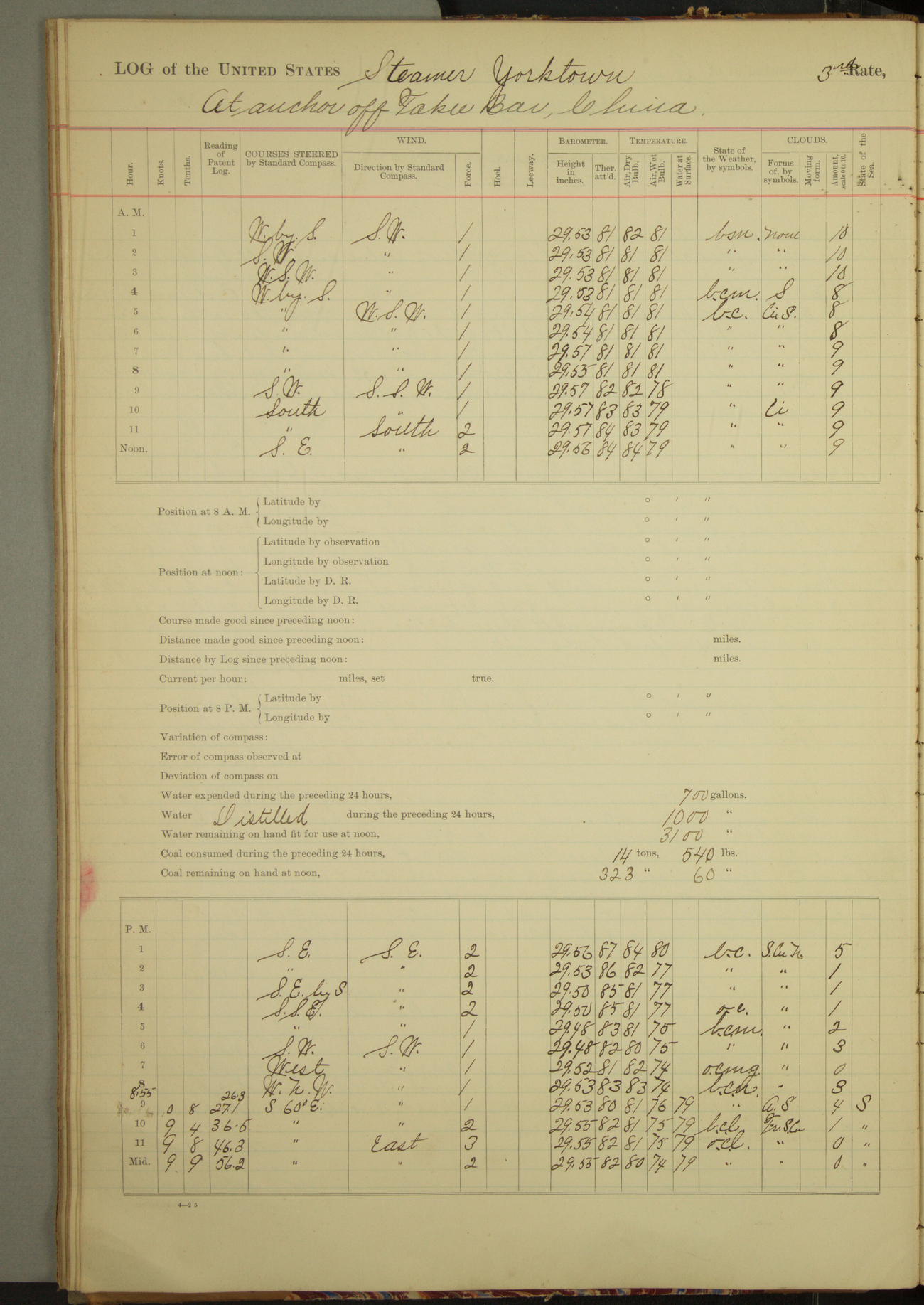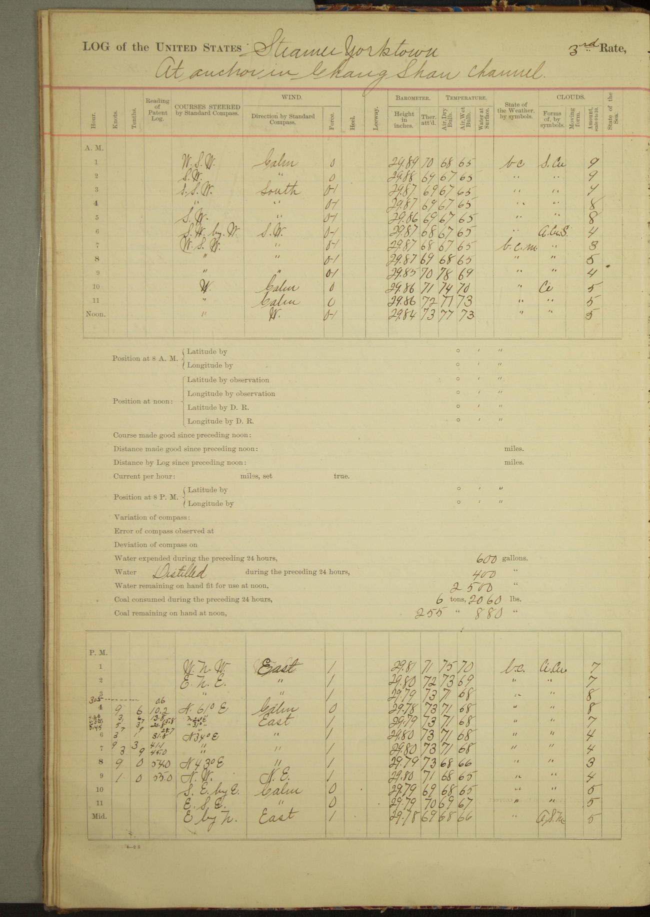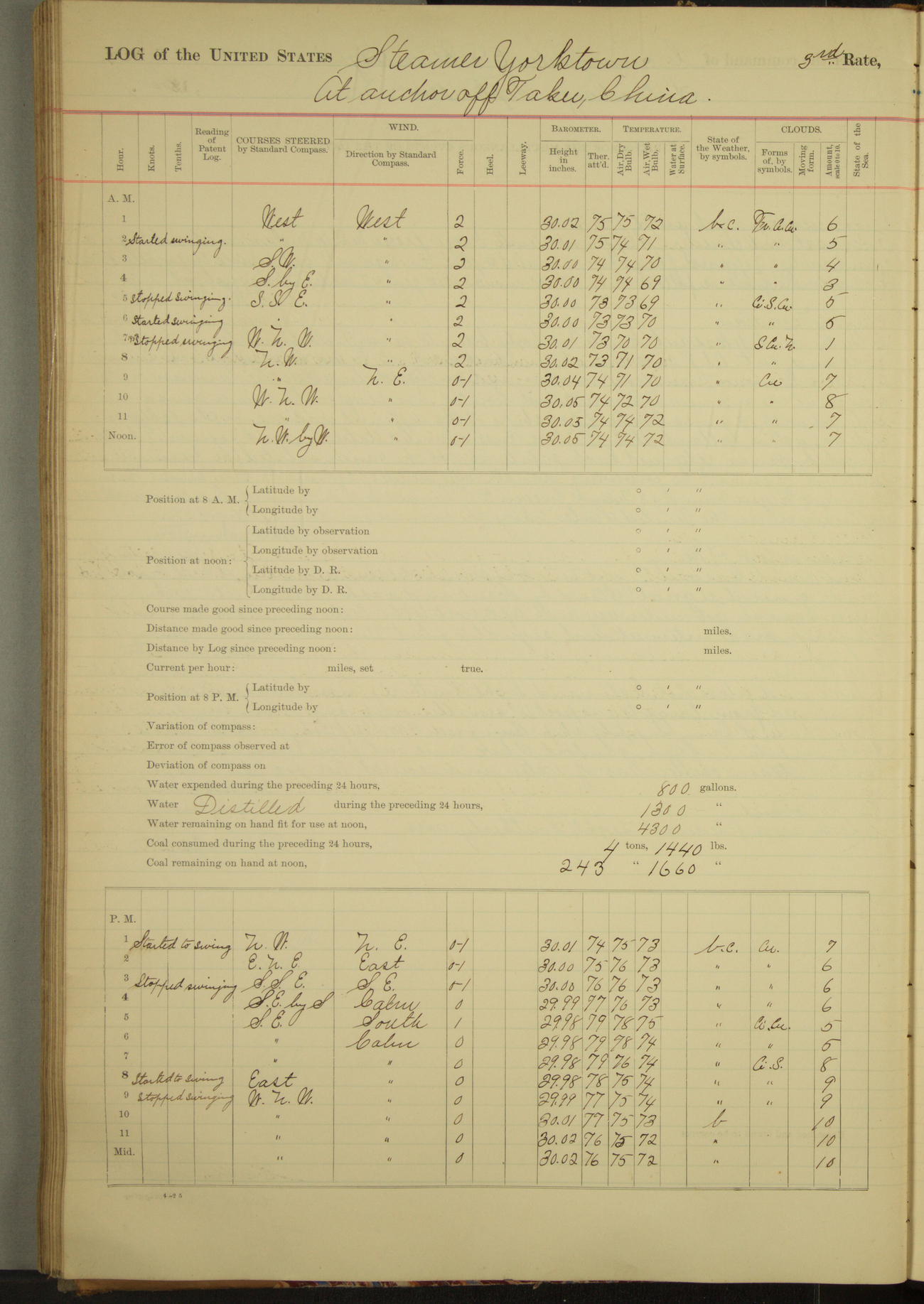 At 2.40pm came to in 5¾ fathoms [water], veering to 20 fathoms port chain.
