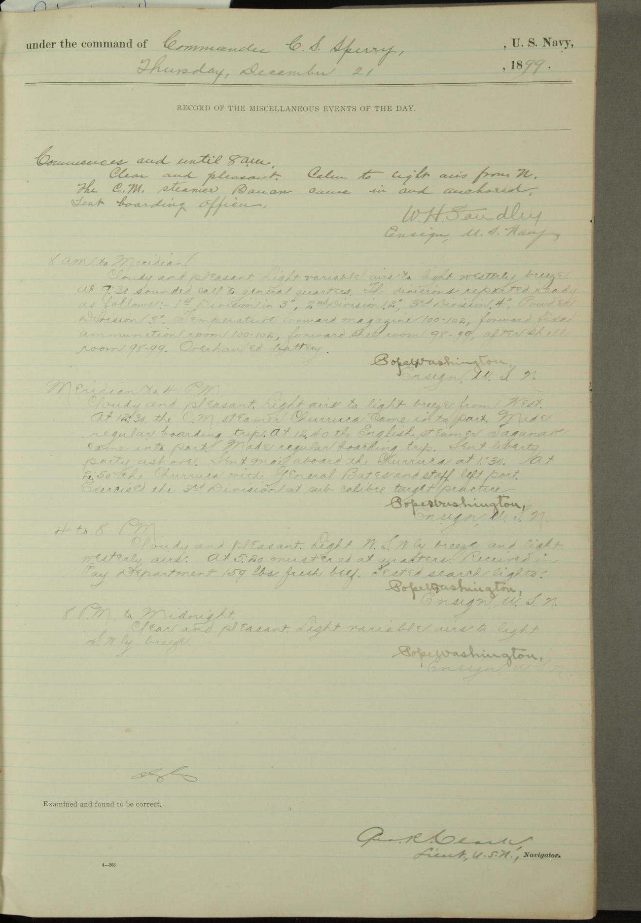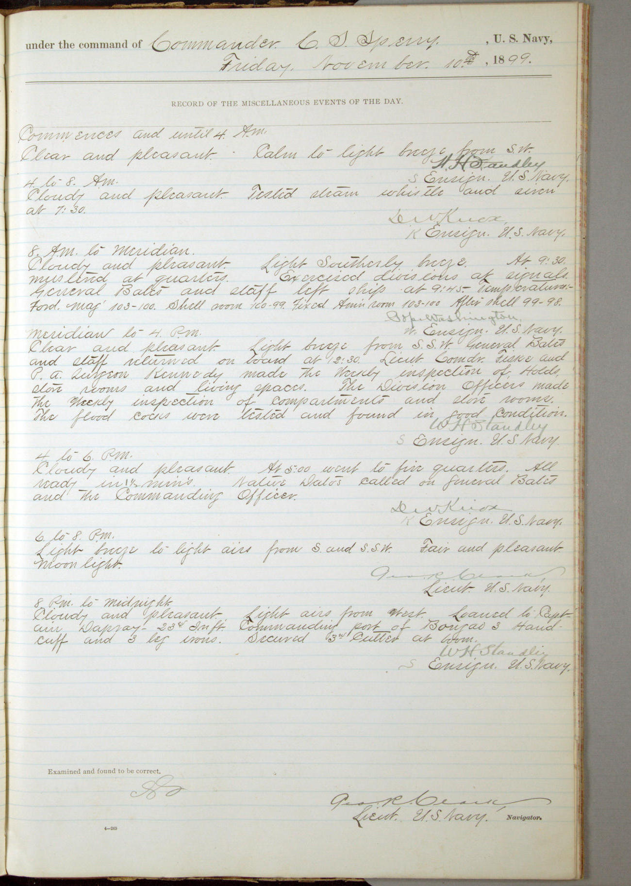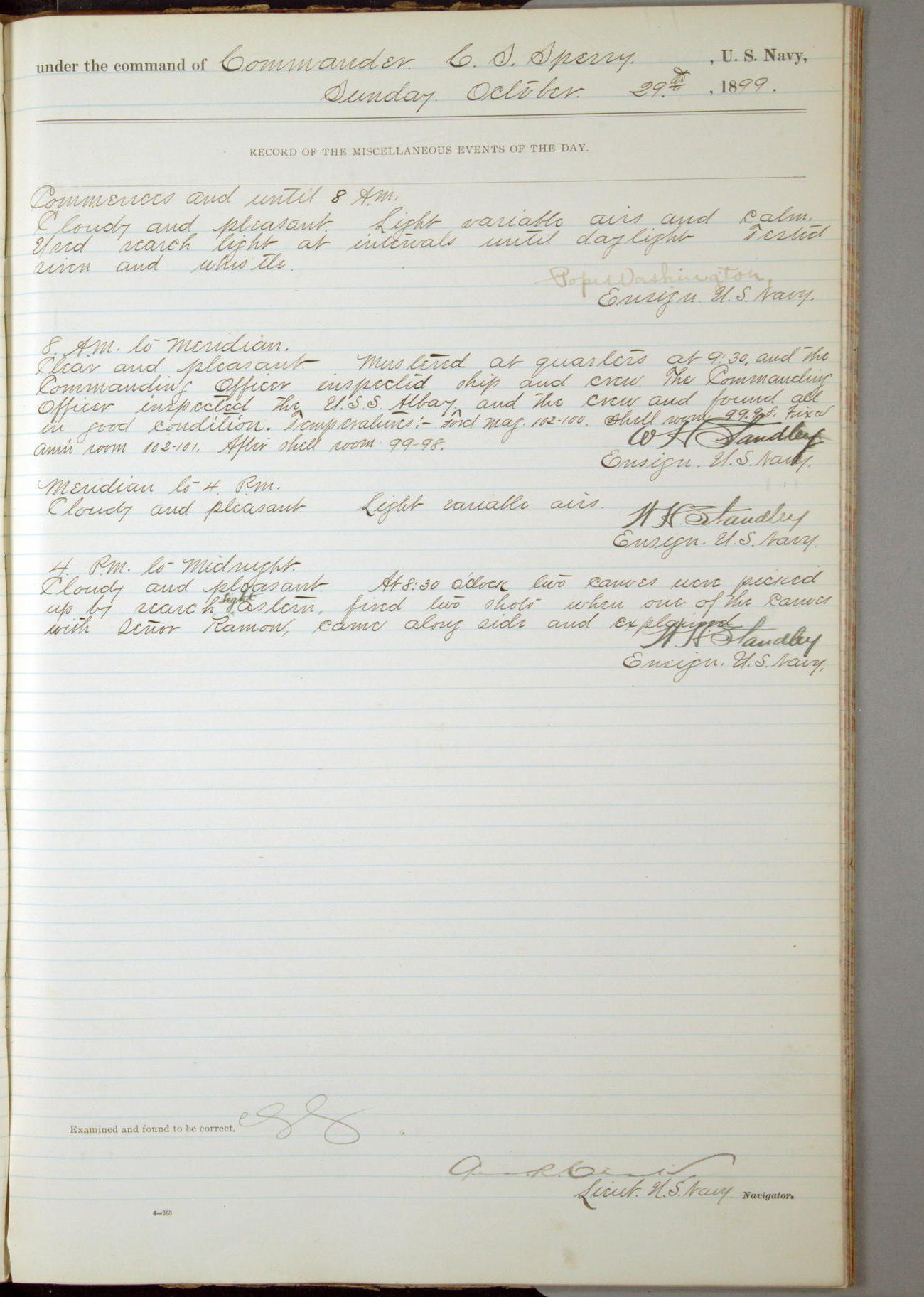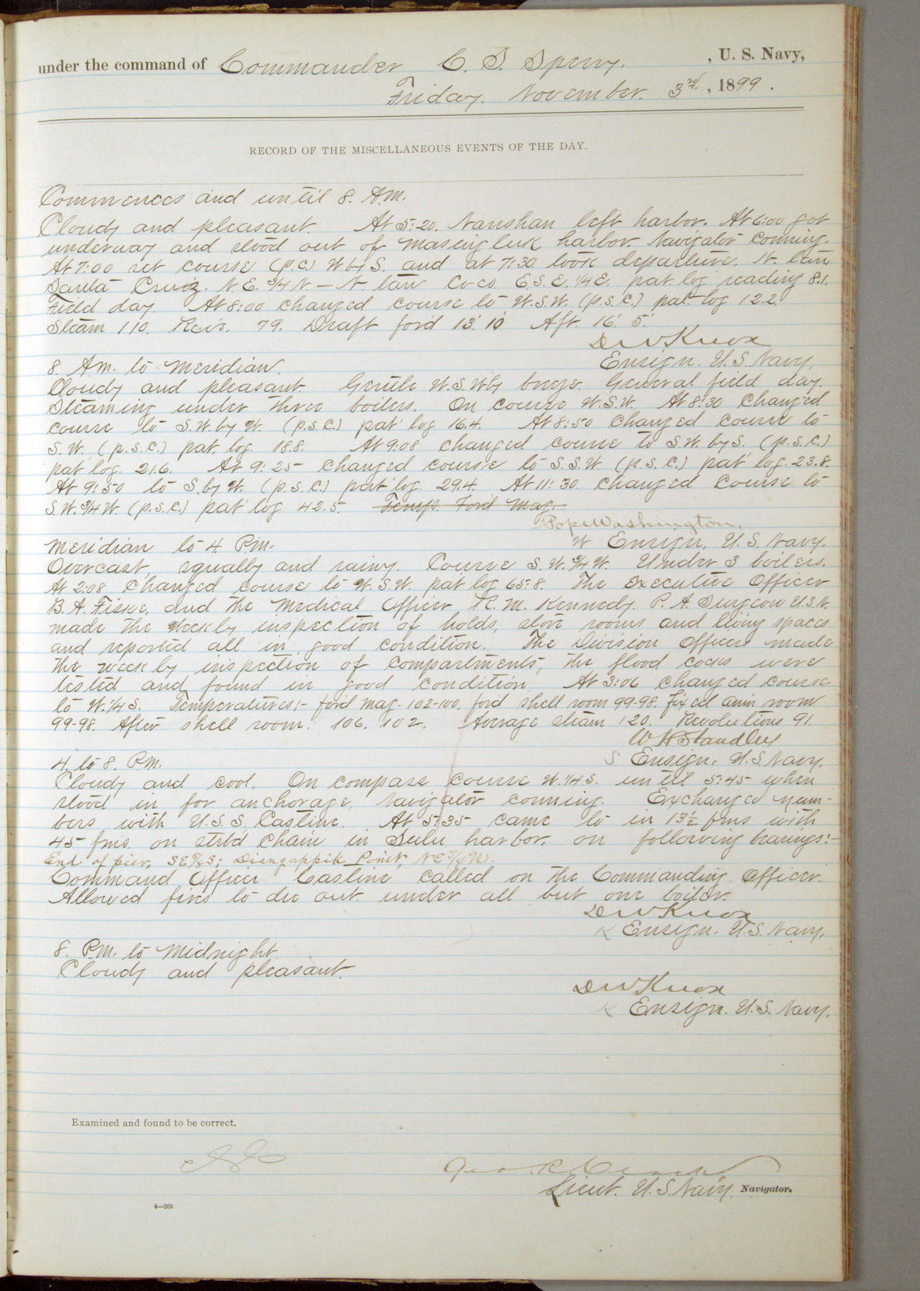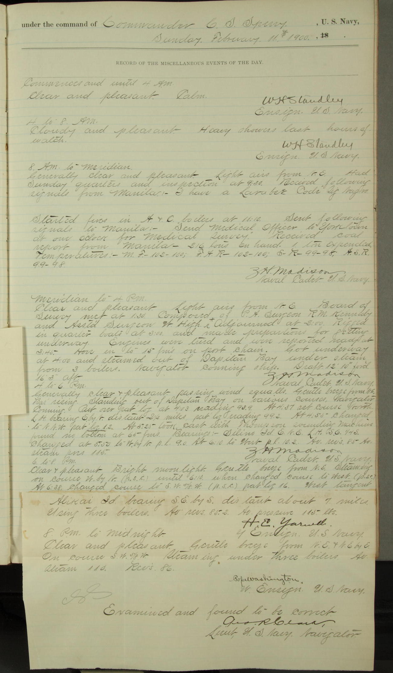 Passed Assistant Surgeon G.D. Costigan, U.S. Navy, made the usual sanitary inspection of holds, storerooms and living spaces, and found them in good sanitary condition.