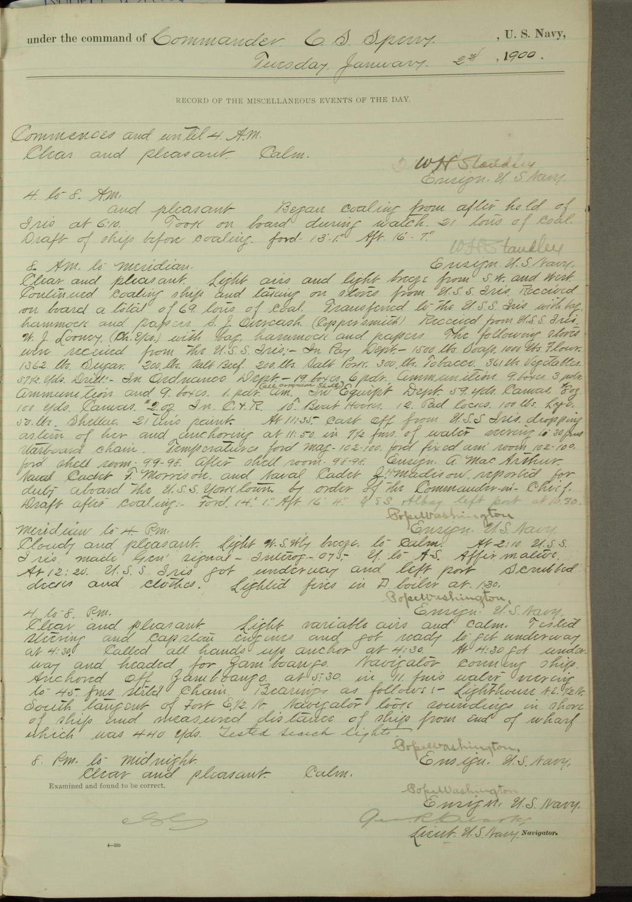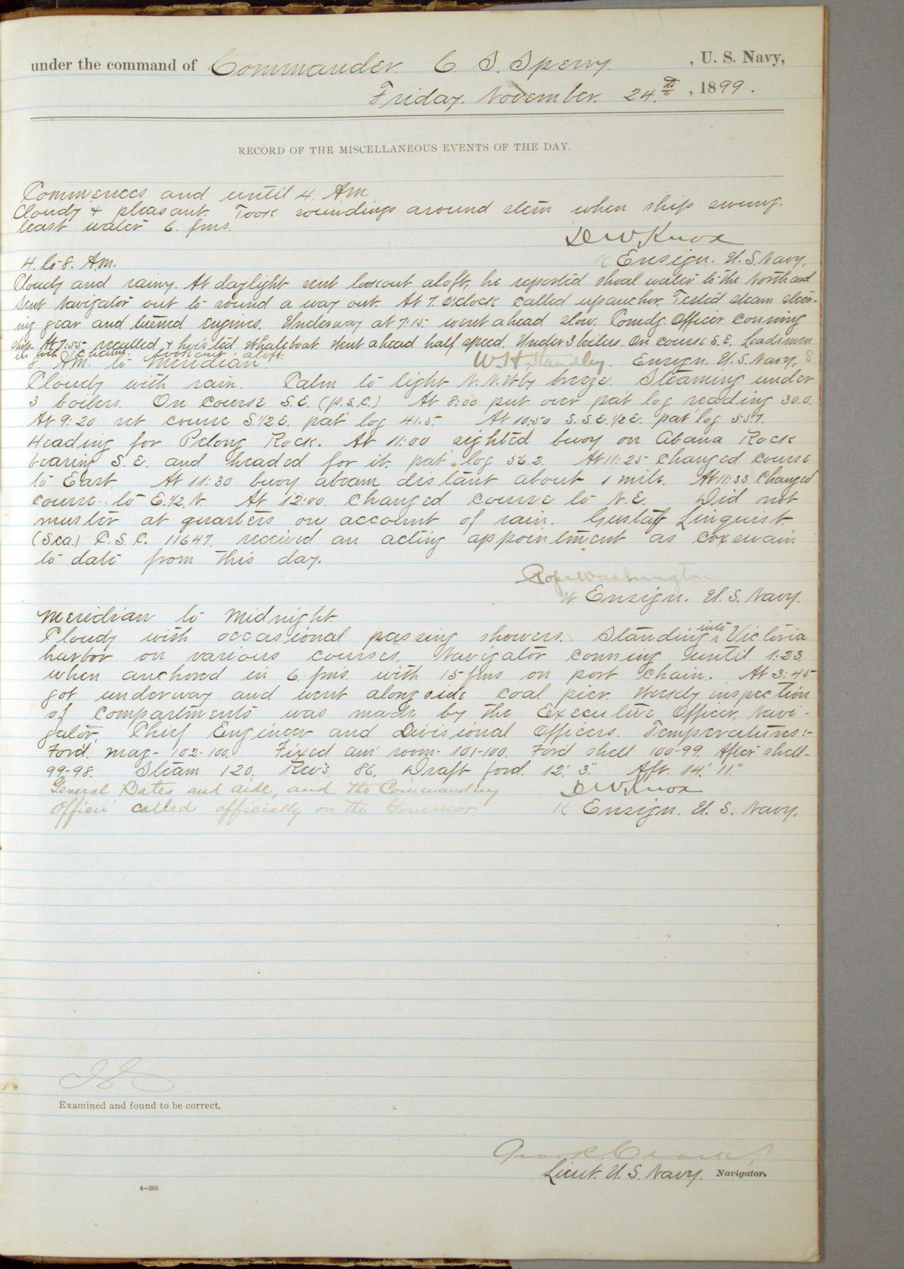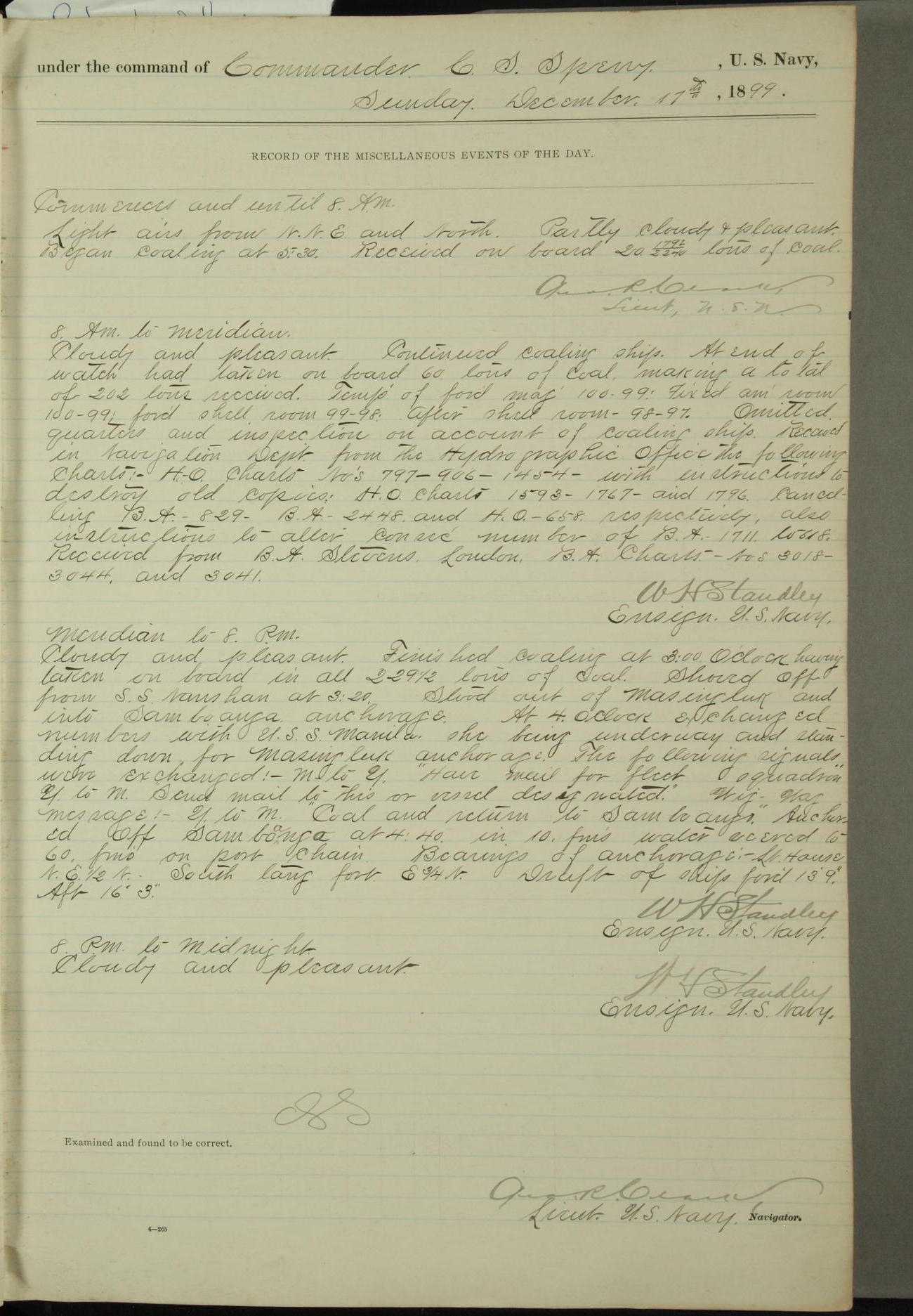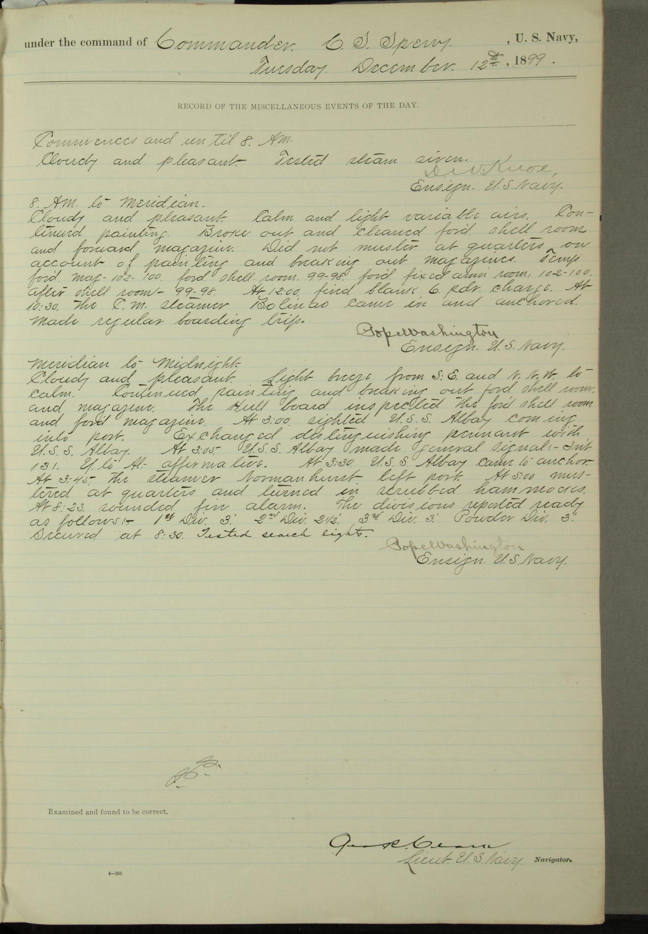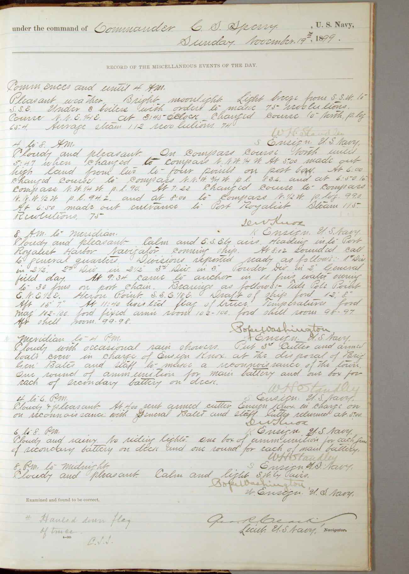 Passed Assistant Surgeon G.D. Costigan, U.S. Navy, made the usual sanitary inspection of holds, storerooms and living spaces, and found them in good sanitary condition.