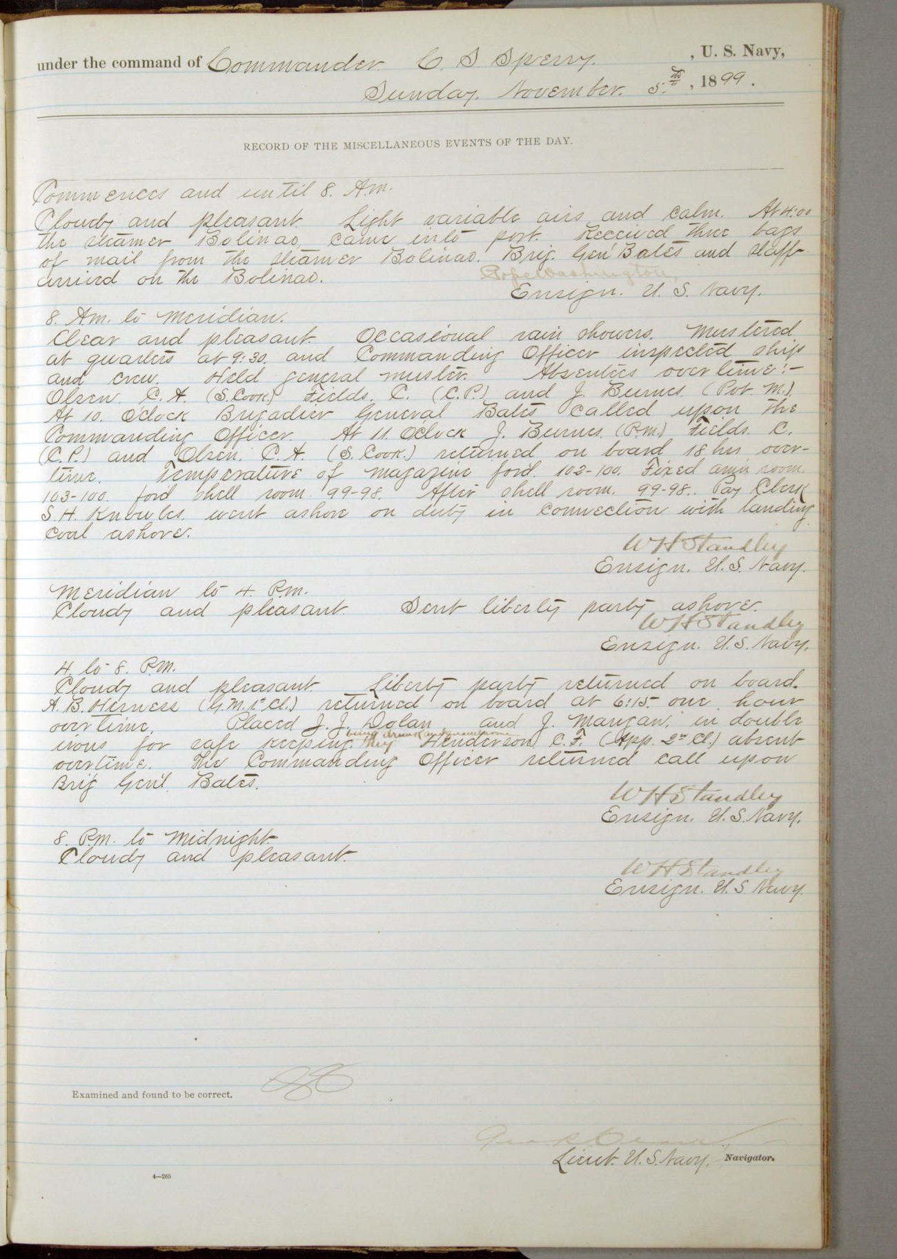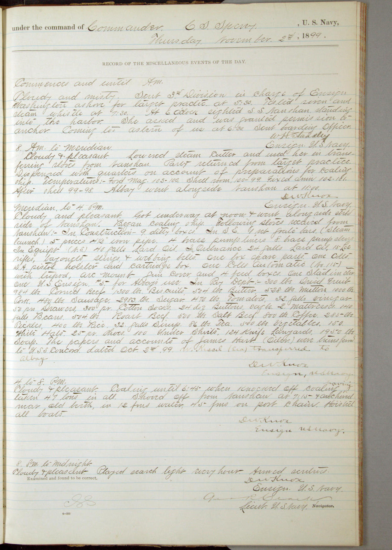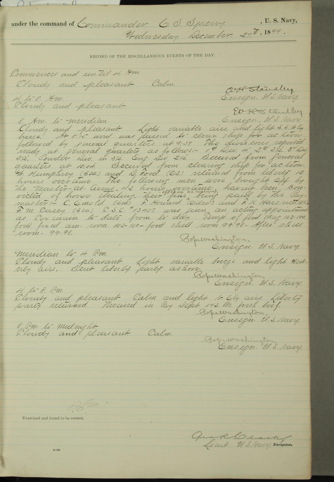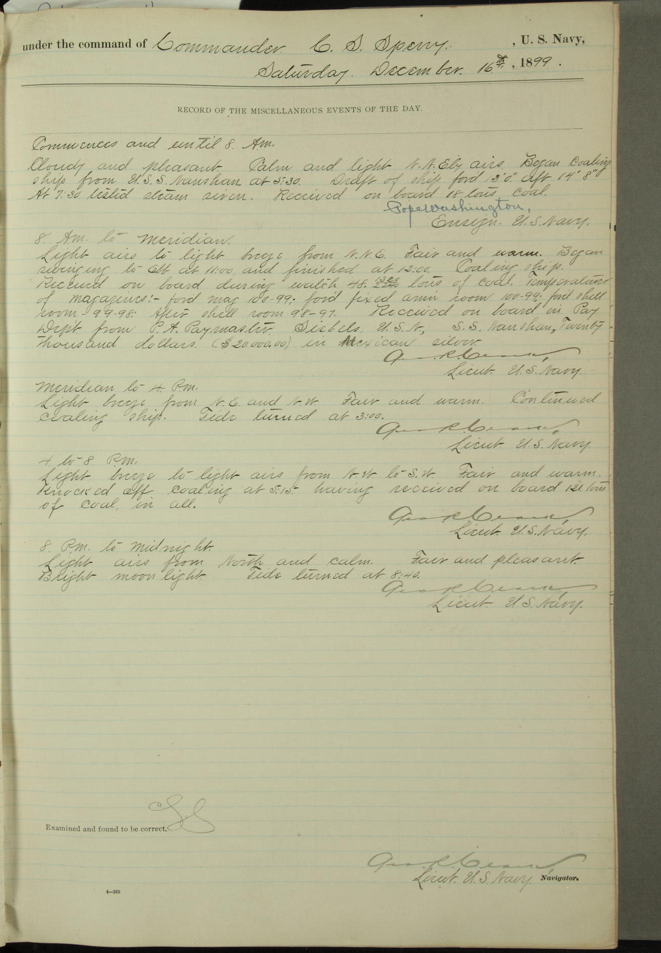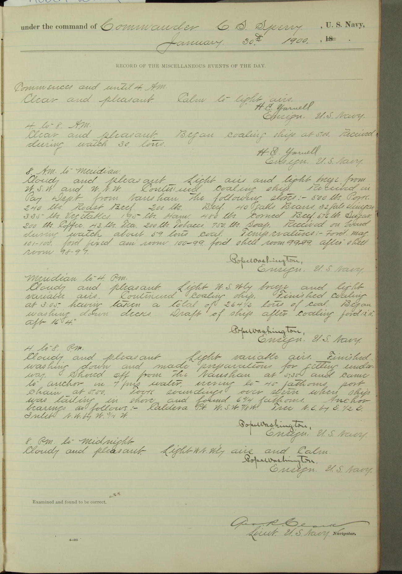 Passed Assistant Surgeon G.D. Costigan, U.S. Navy, made the usual sanitary inspection of holds, storerooms and living spaces, and found them in good sanitary condition.