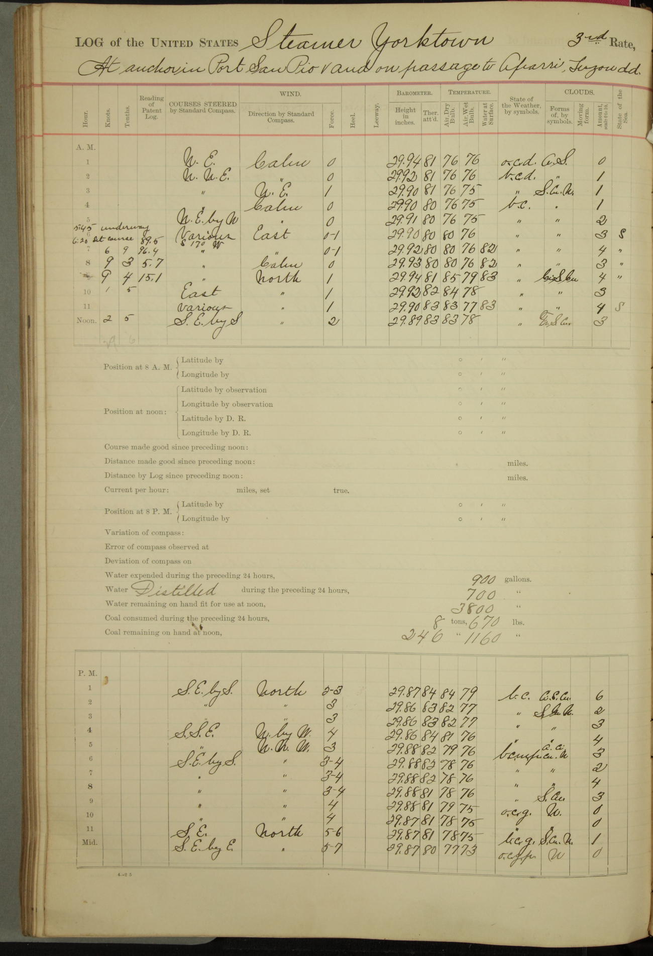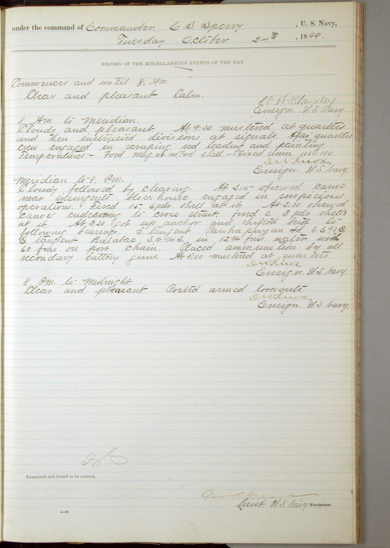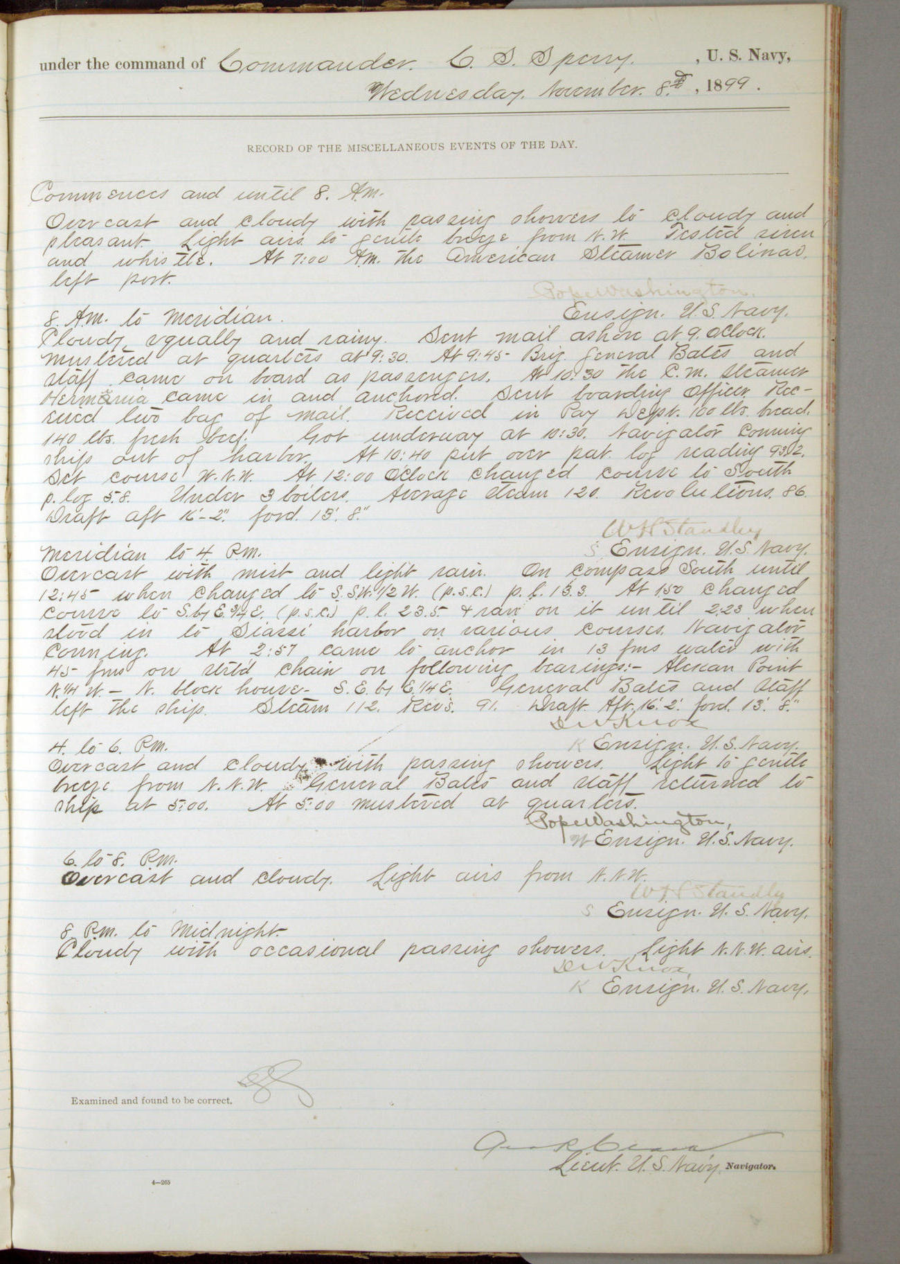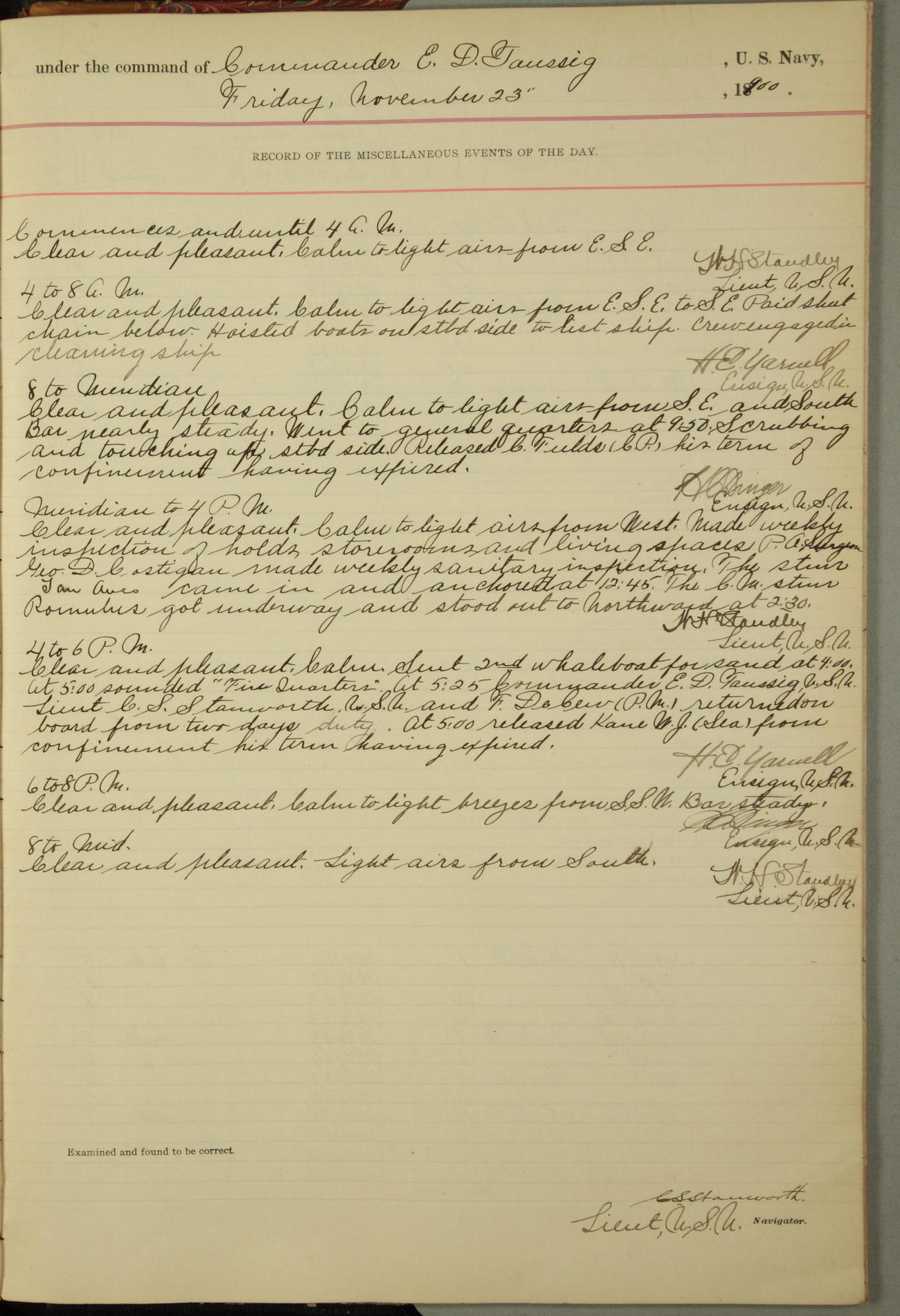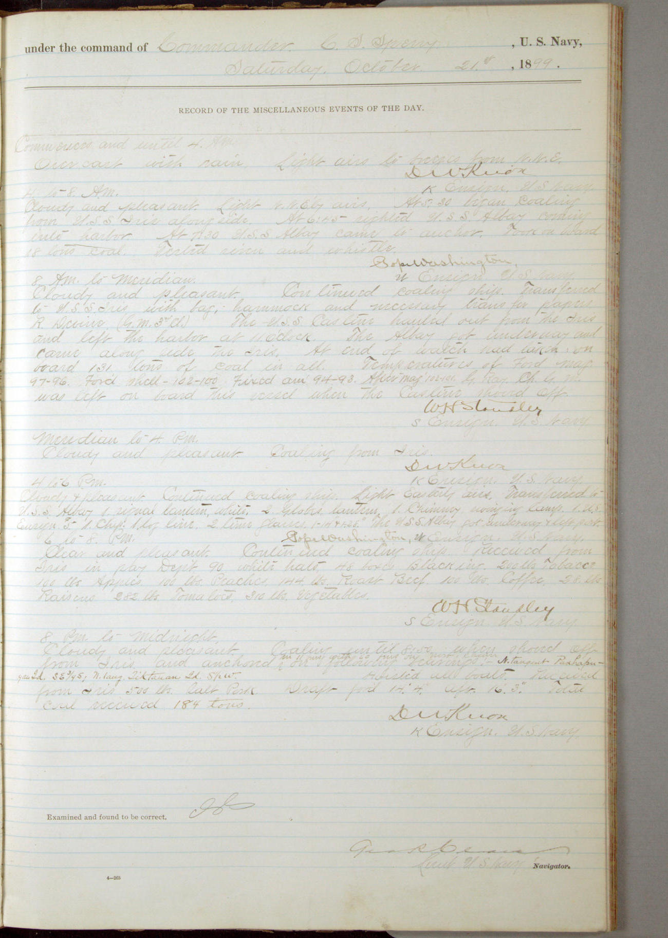 Passed Assistant Surgeon G.D. Costigan, U.S. Navy, made the usual sanitary inspection of holds, storerooms and living spaces, and found them in good sanitary condition.