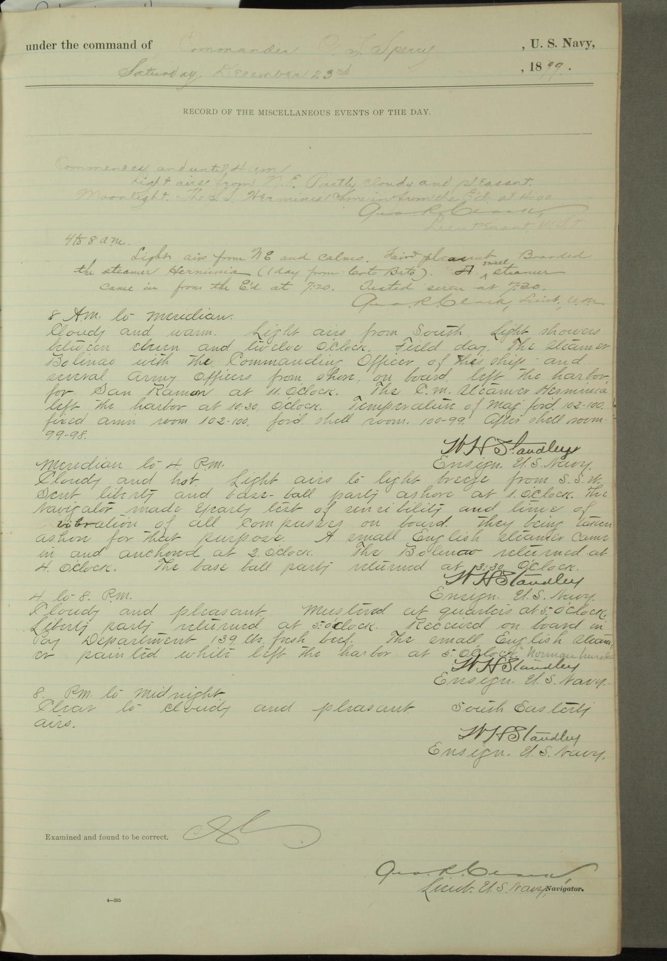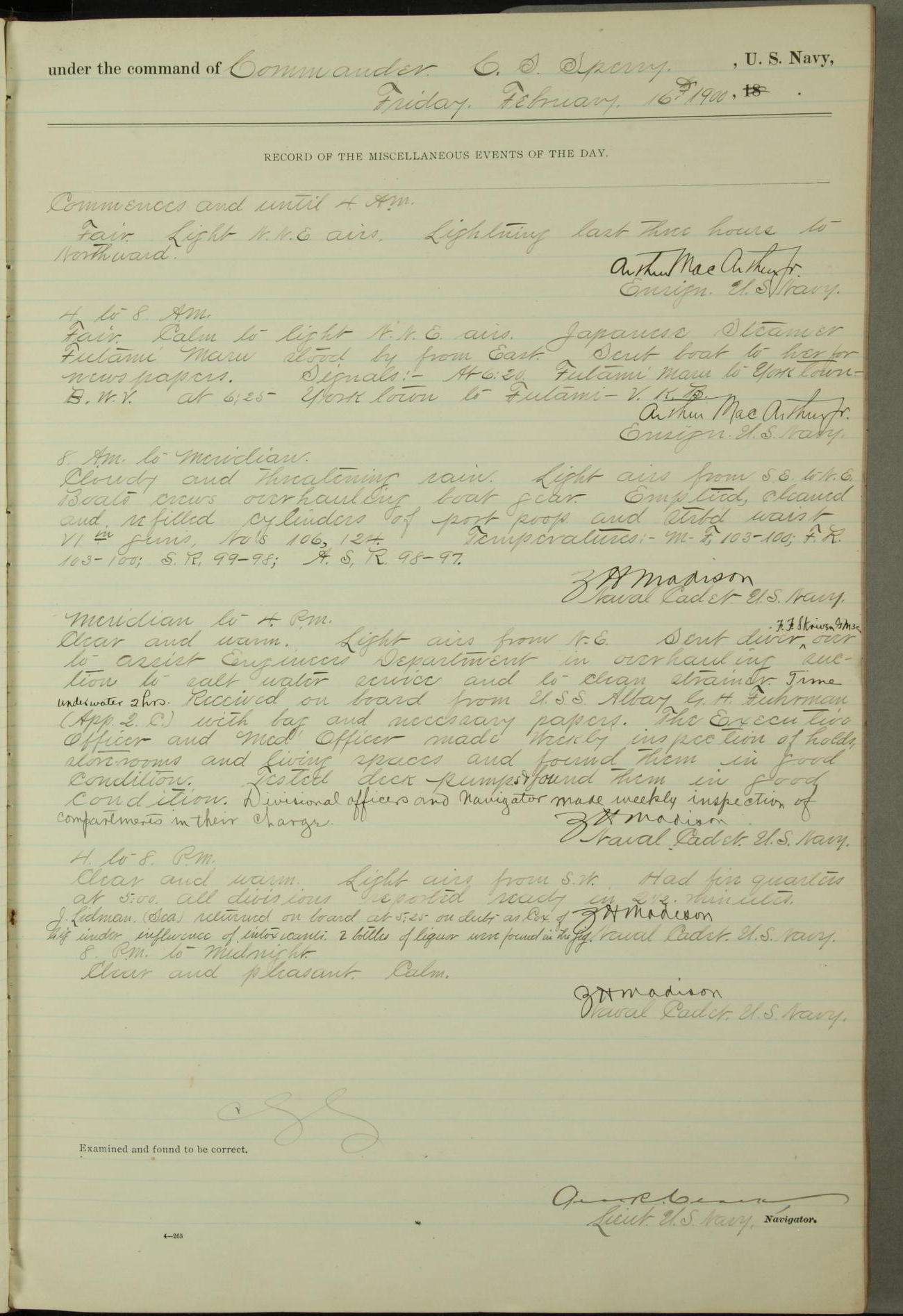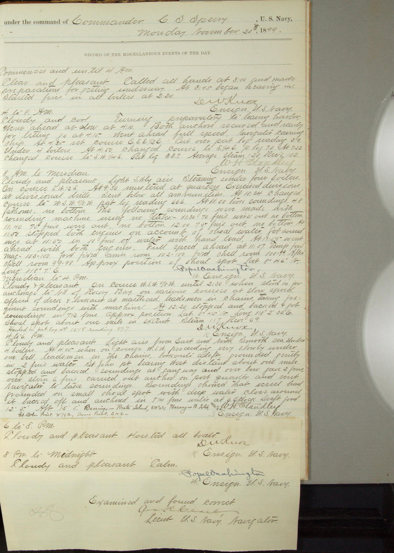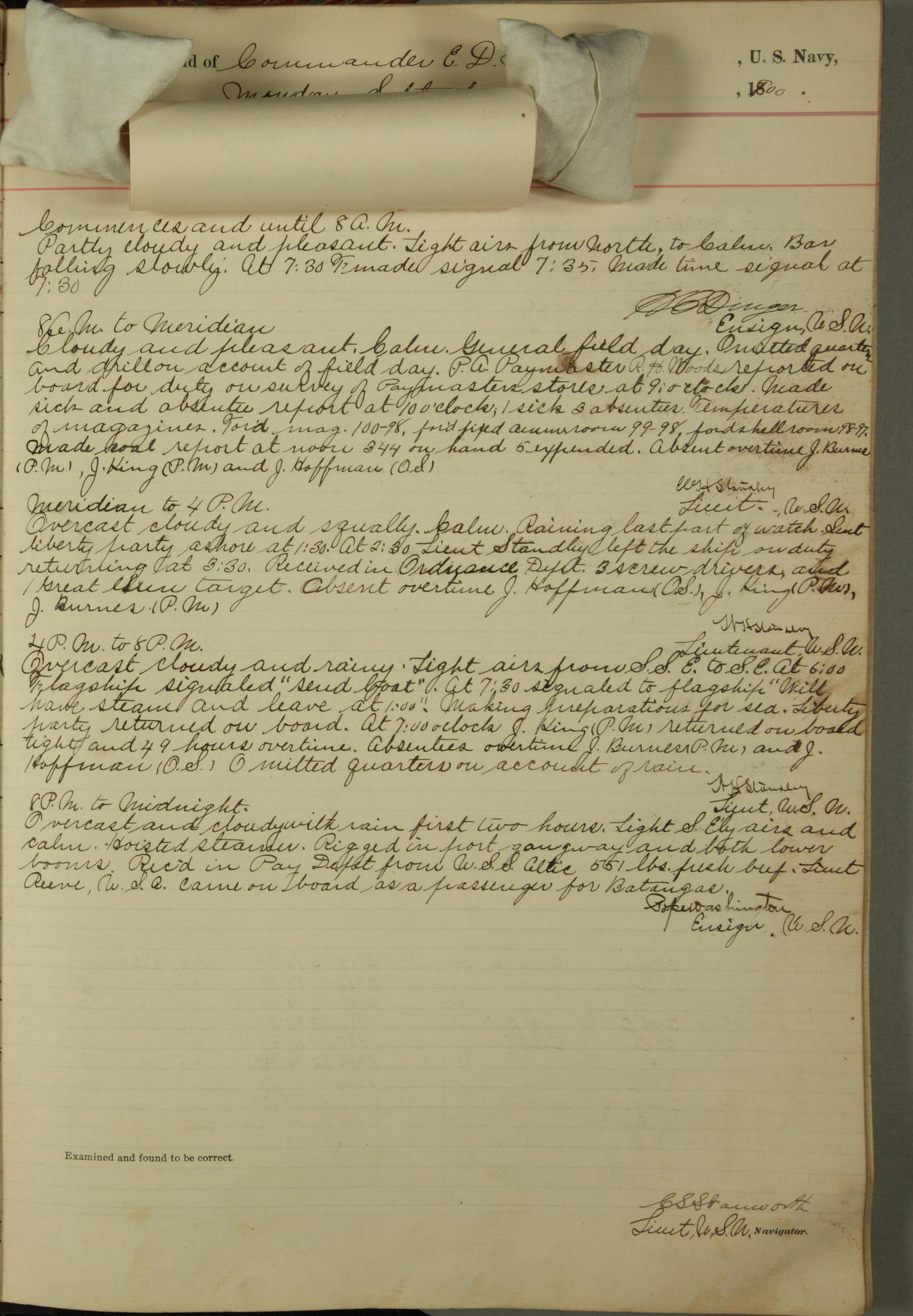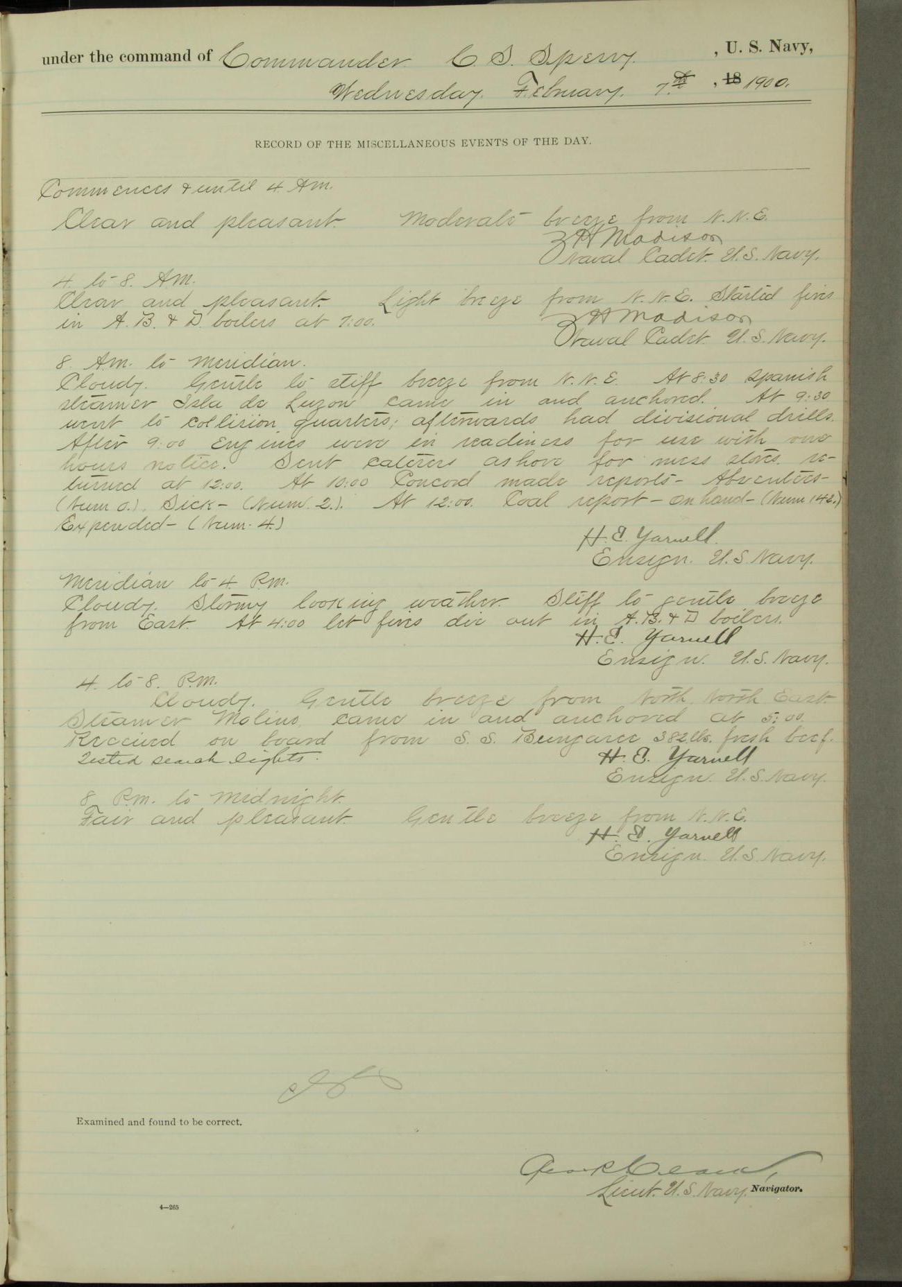 Passed Assistant Surgeon G.D. Costigan, U.S. Navy, made the usual sanitary inspection of holds, storerooms and living spaces, and found them in good sanitary condition.