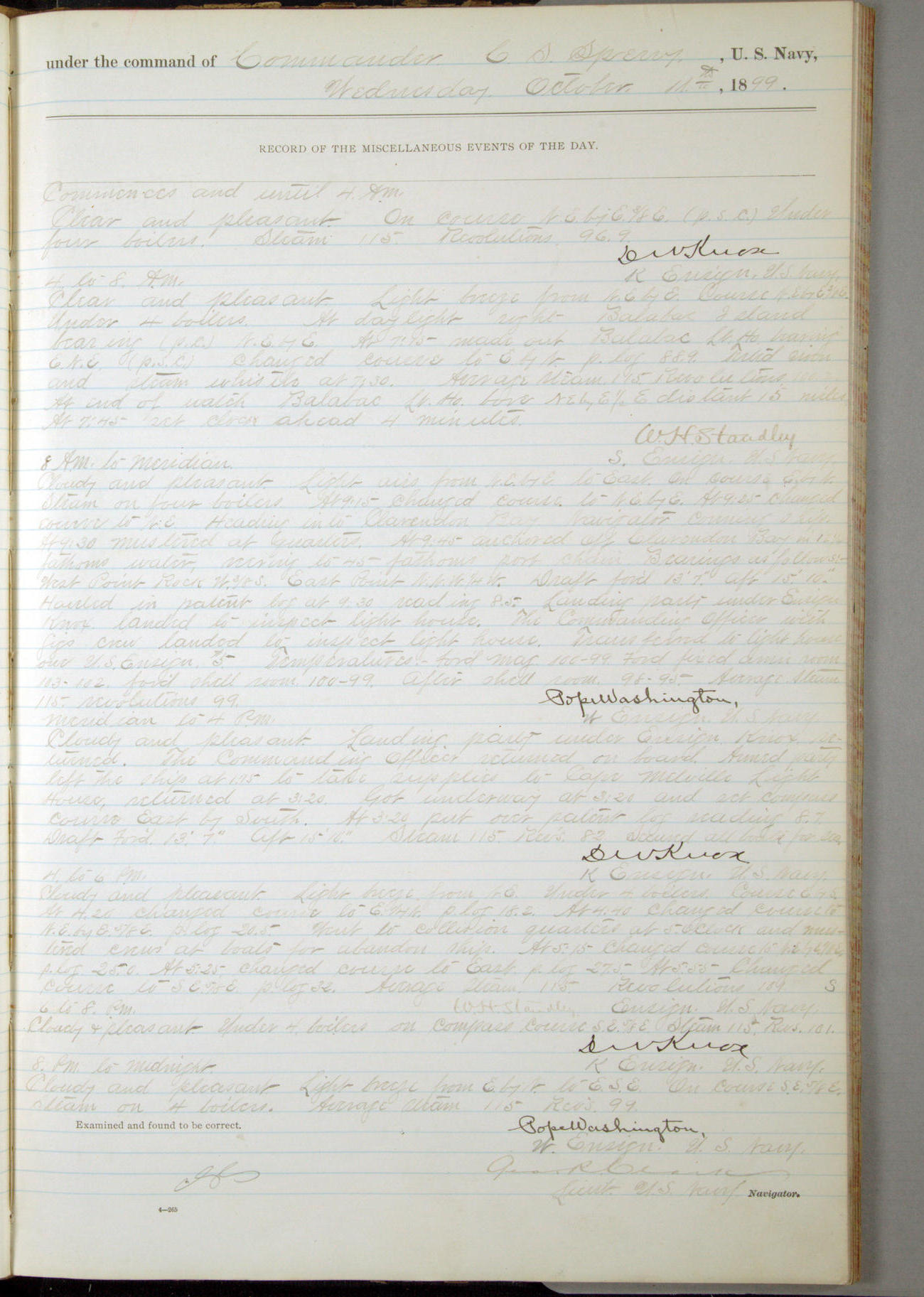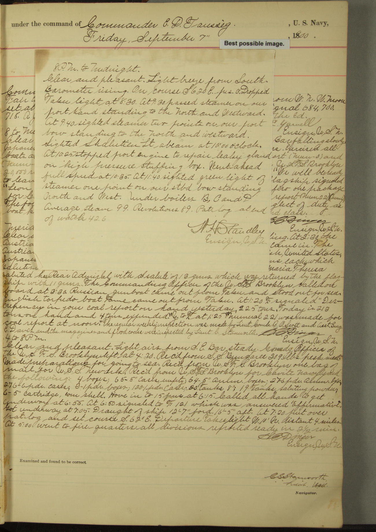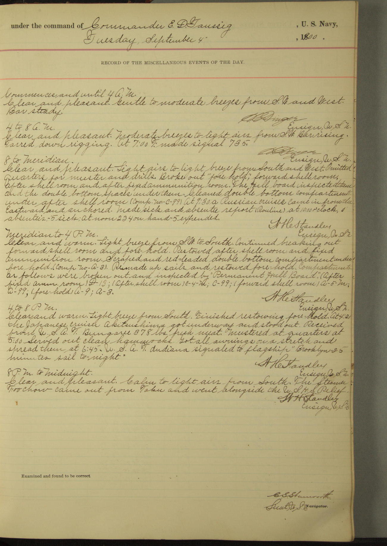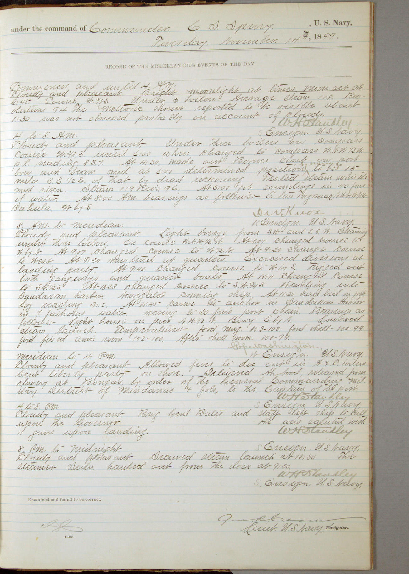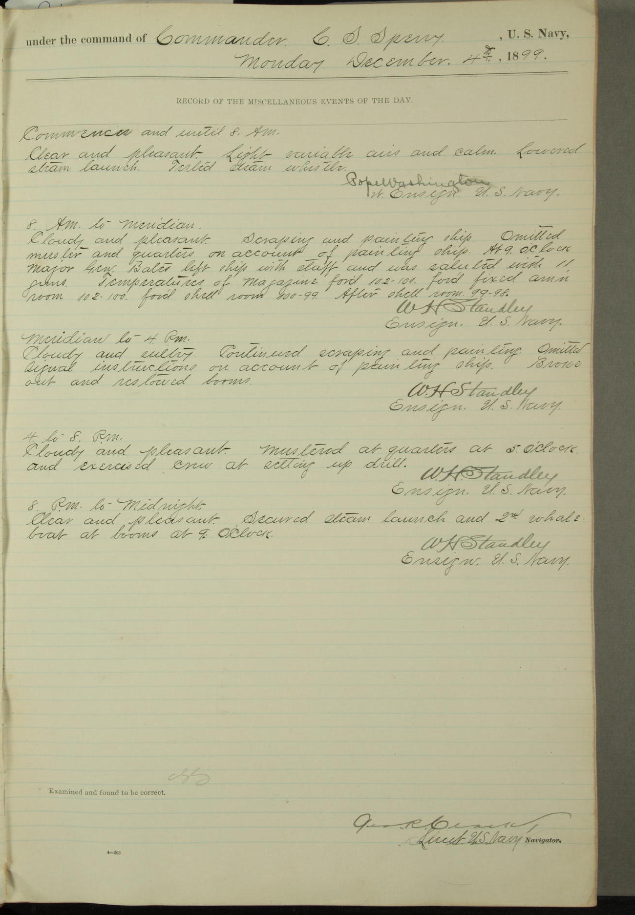 Passed Assistant Surgeon G.D. Costigan, U.S. Navy, made the usual sanitary inspection of holds, storerooms and living spaces, and found them in good sanitary condition.