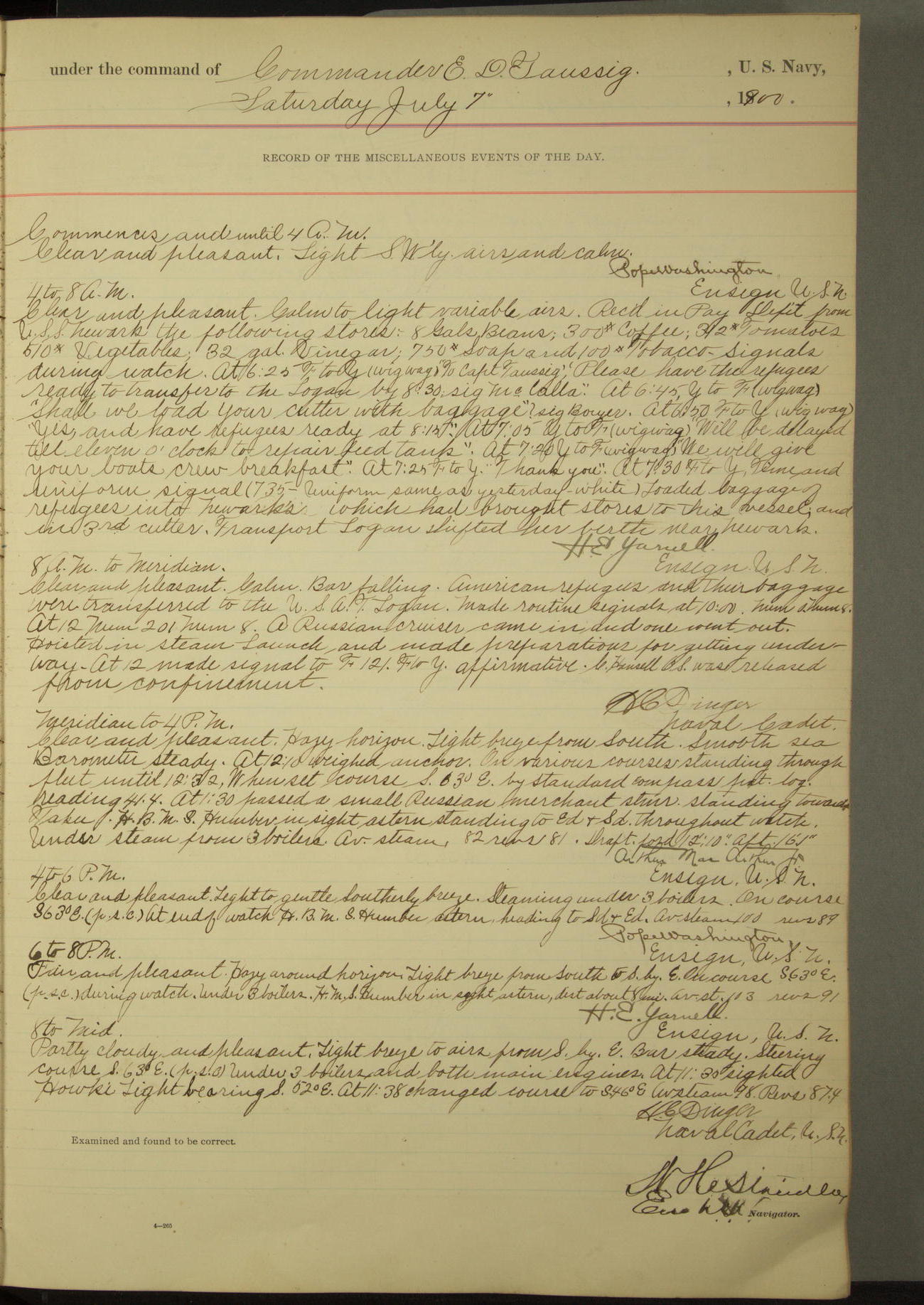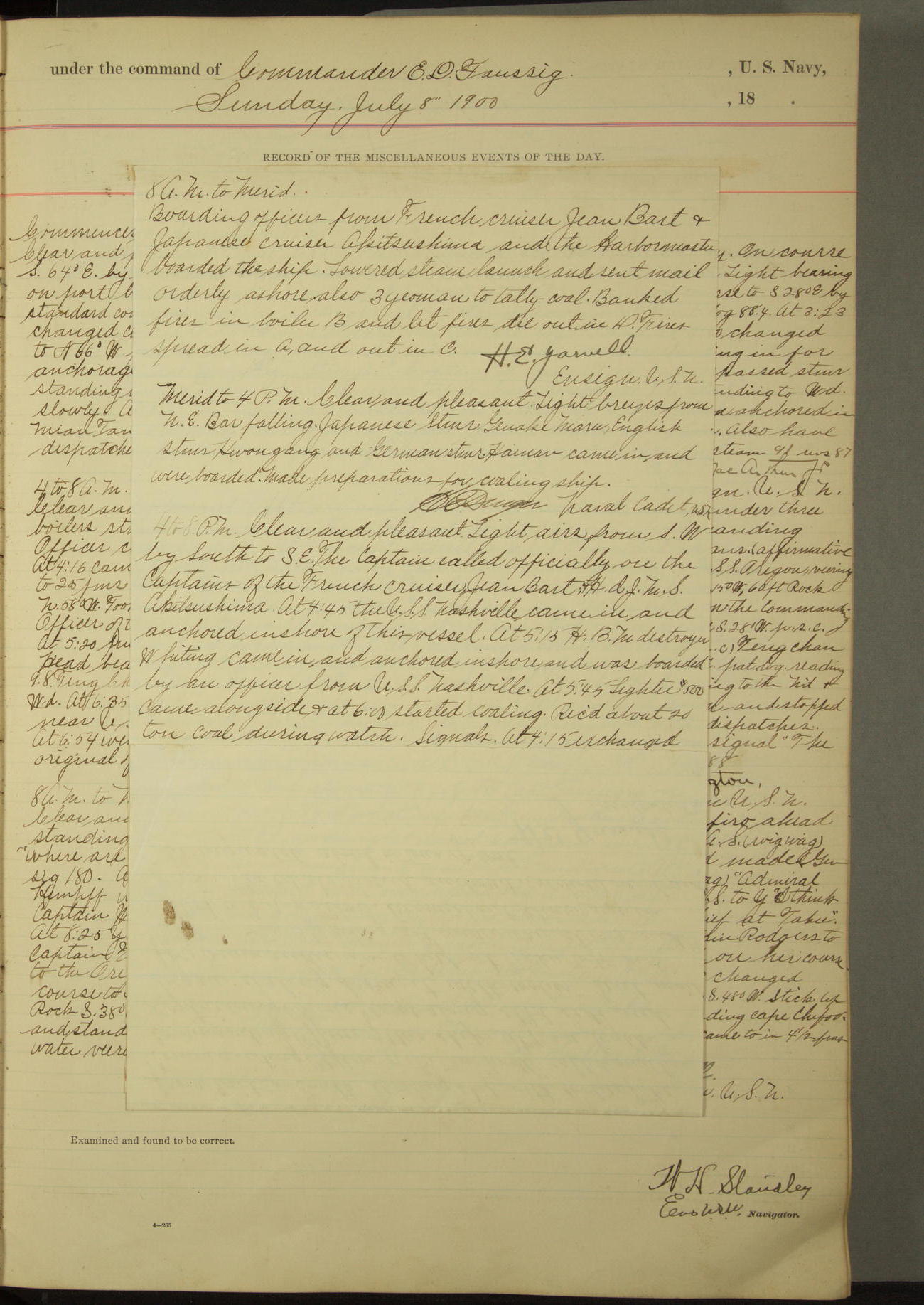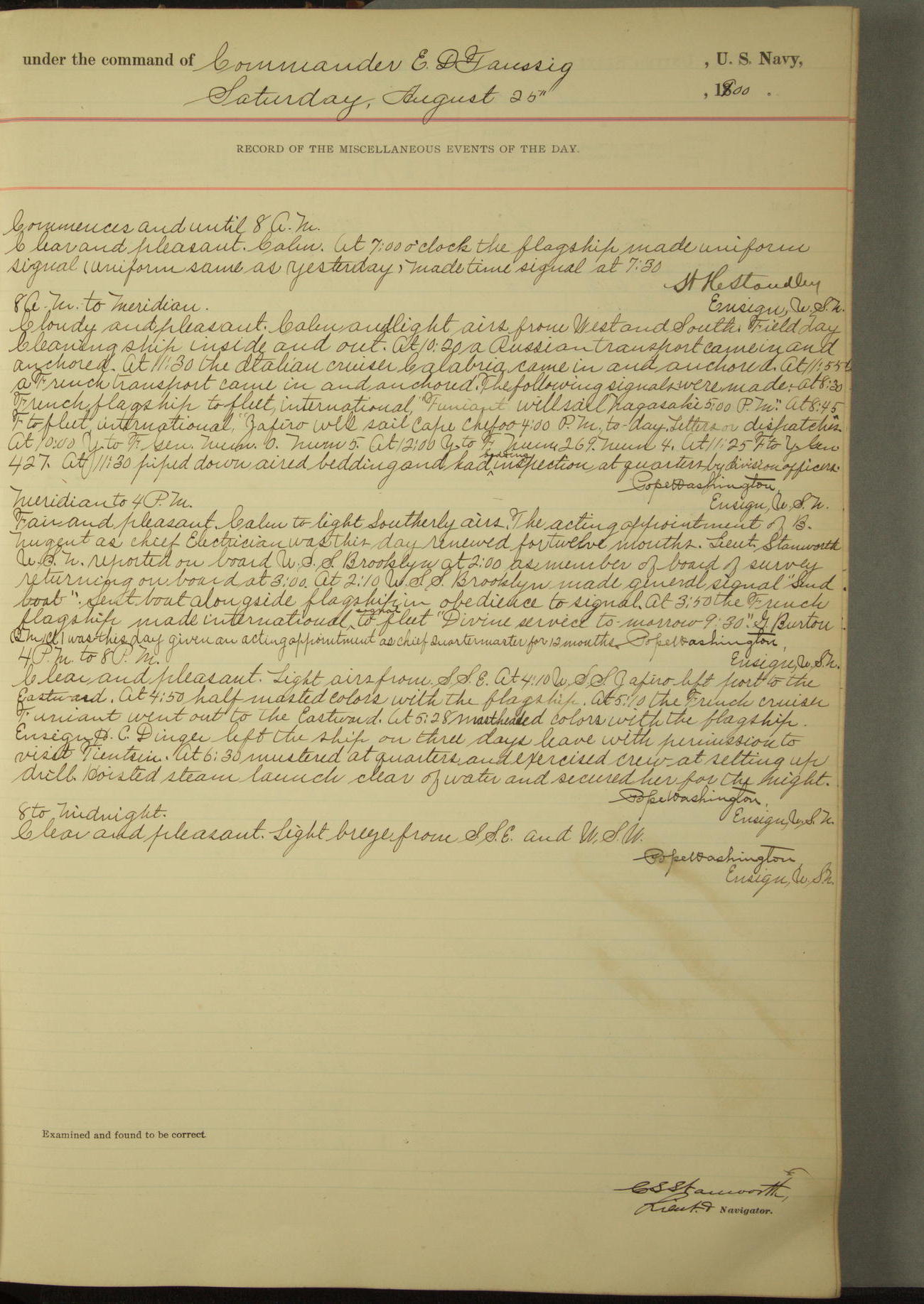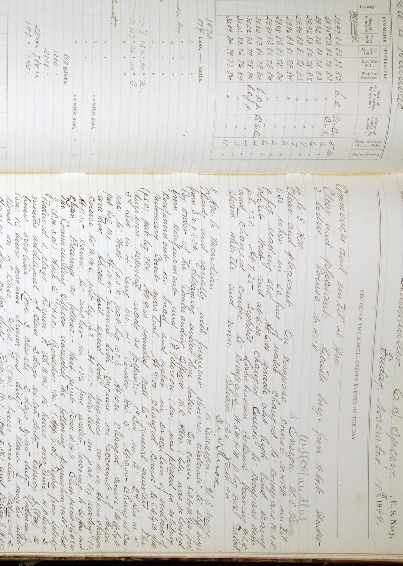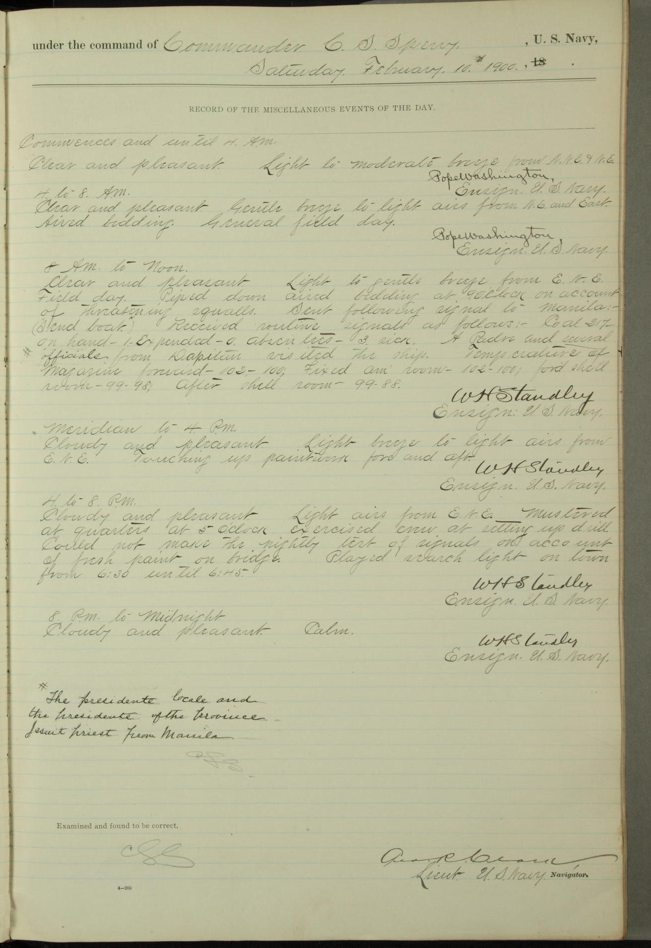 Passed Assistant Surgeon G.D. Costigan, U.S. Navy, made the usual sanitary inspection of holds, storerooms and living spaces, and found them in good sanitary condition.