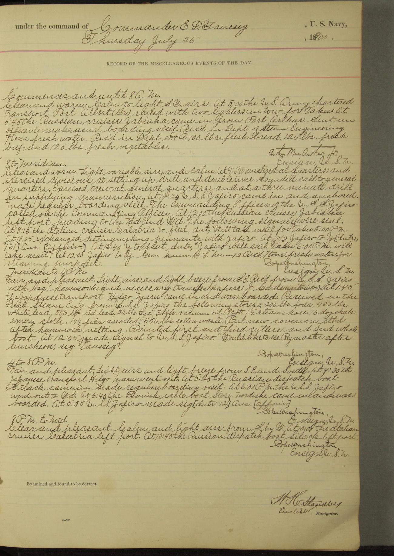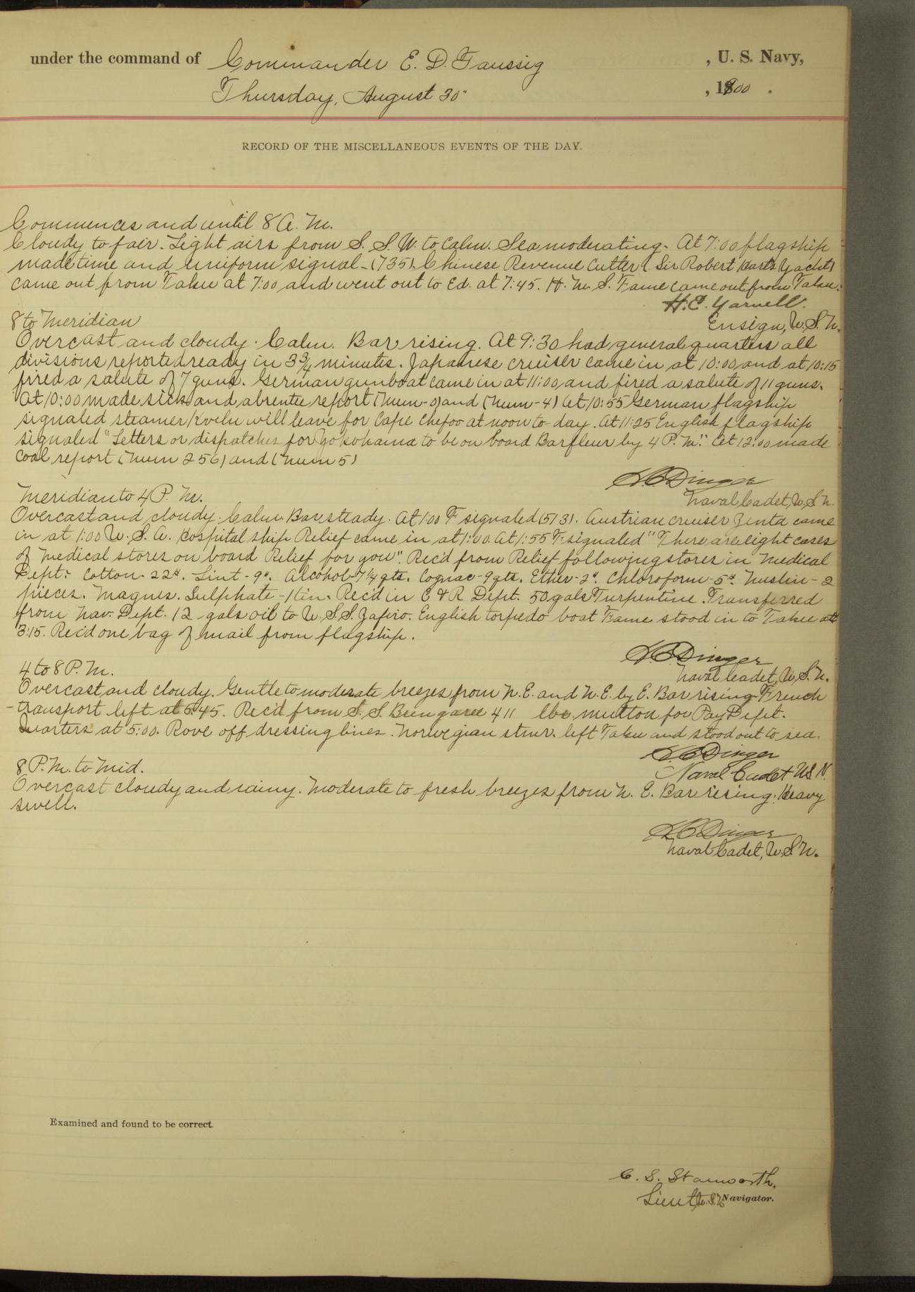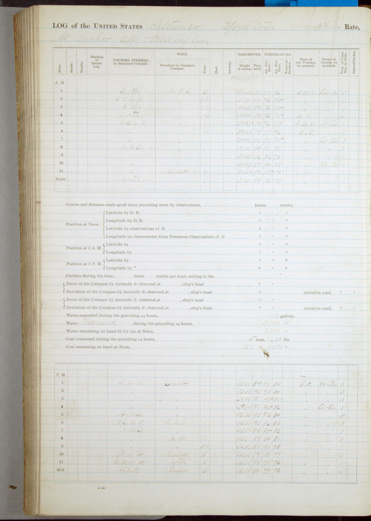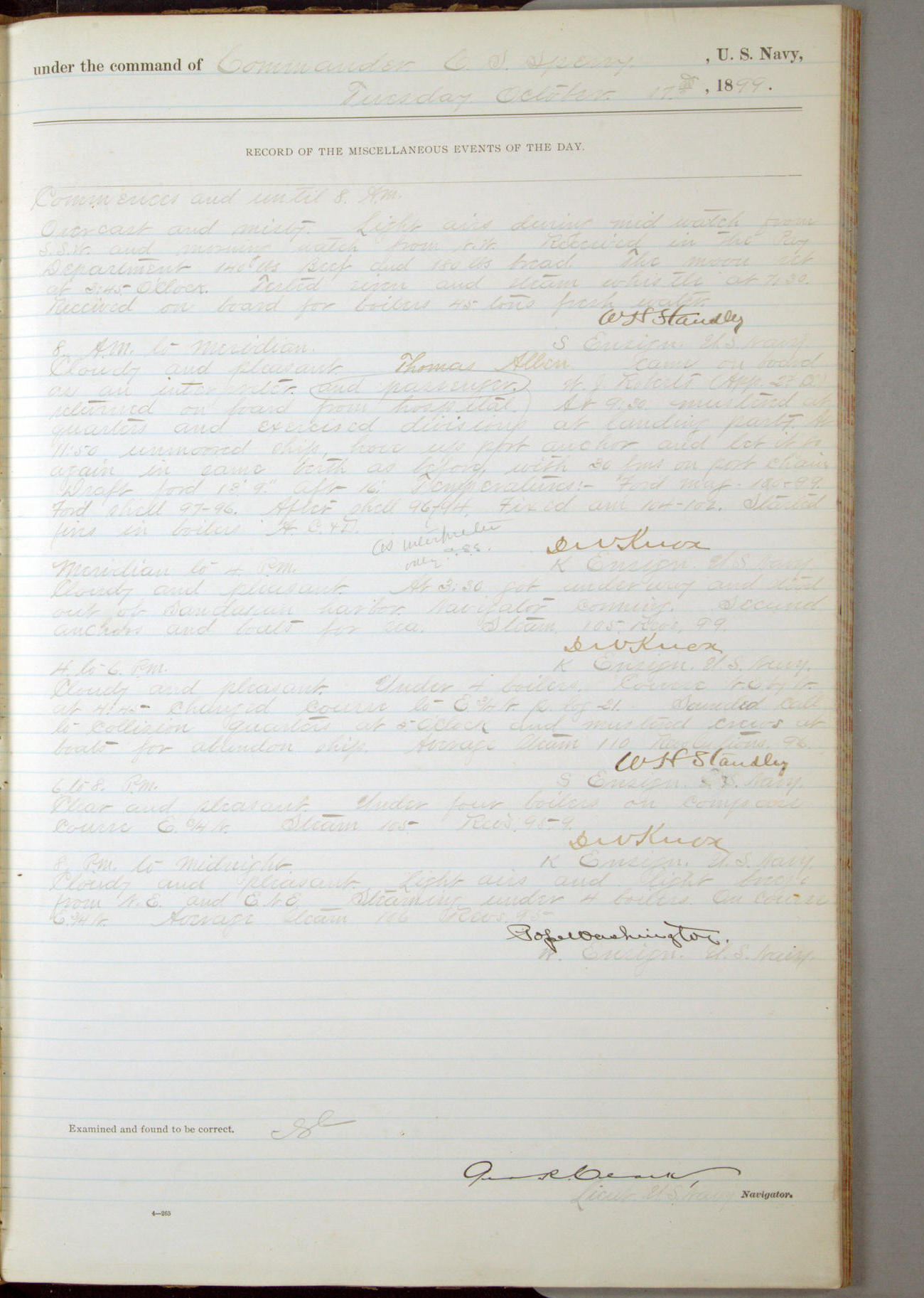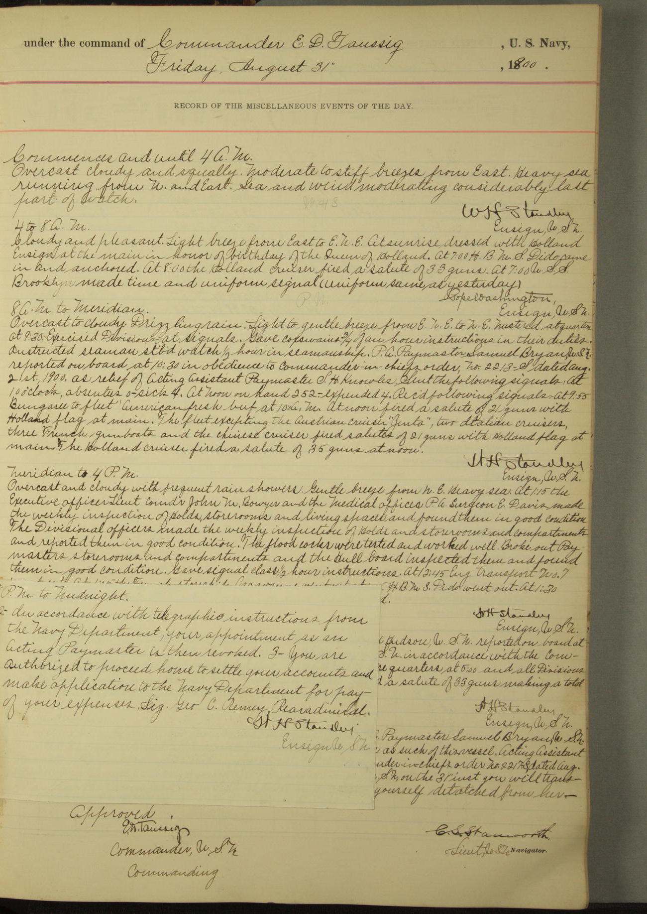 Passed Assistant Surgeon G.D. Costigan, U.S. Navy, made the usual sanitary inspection of holds, storerooms and living spaces, and found them in good sanitary condition.