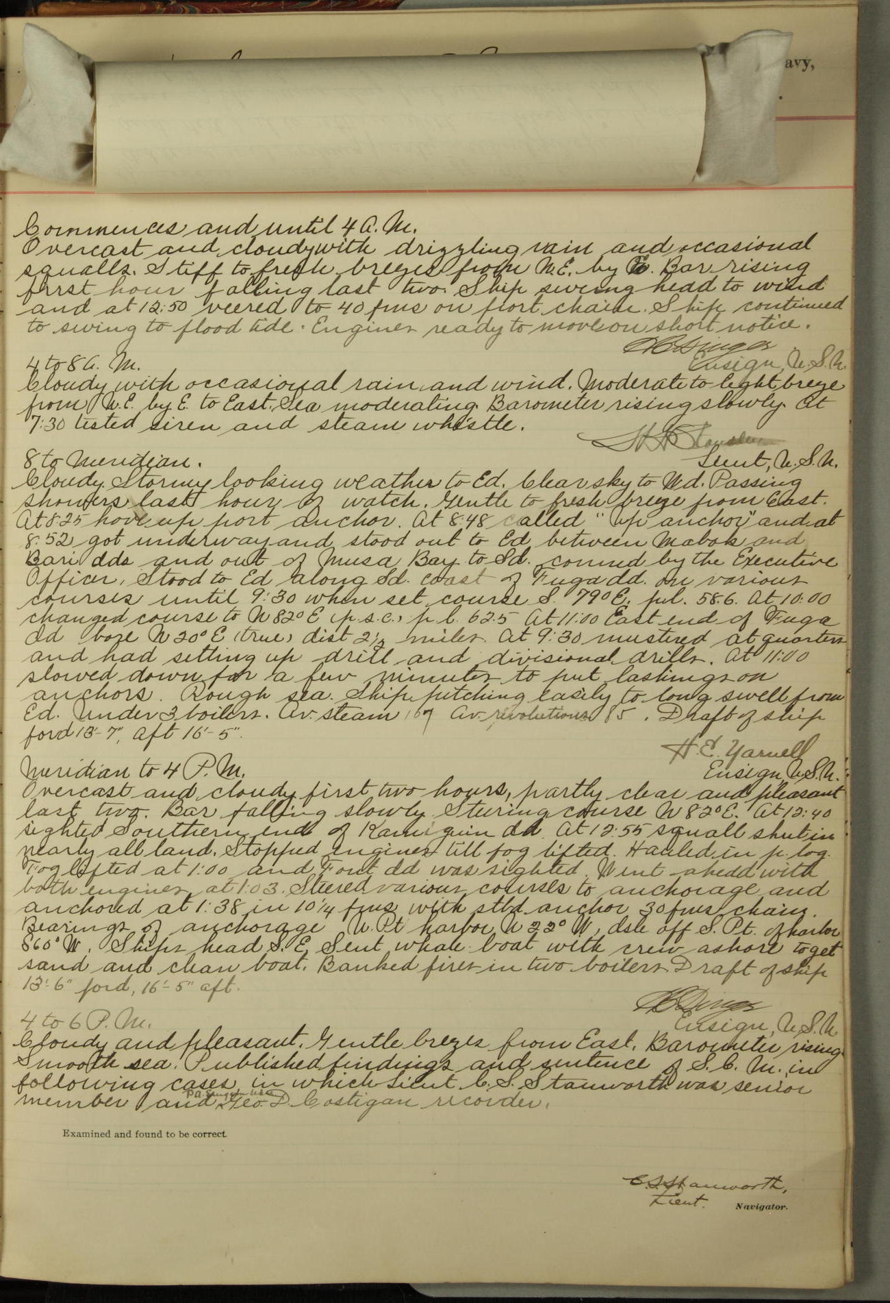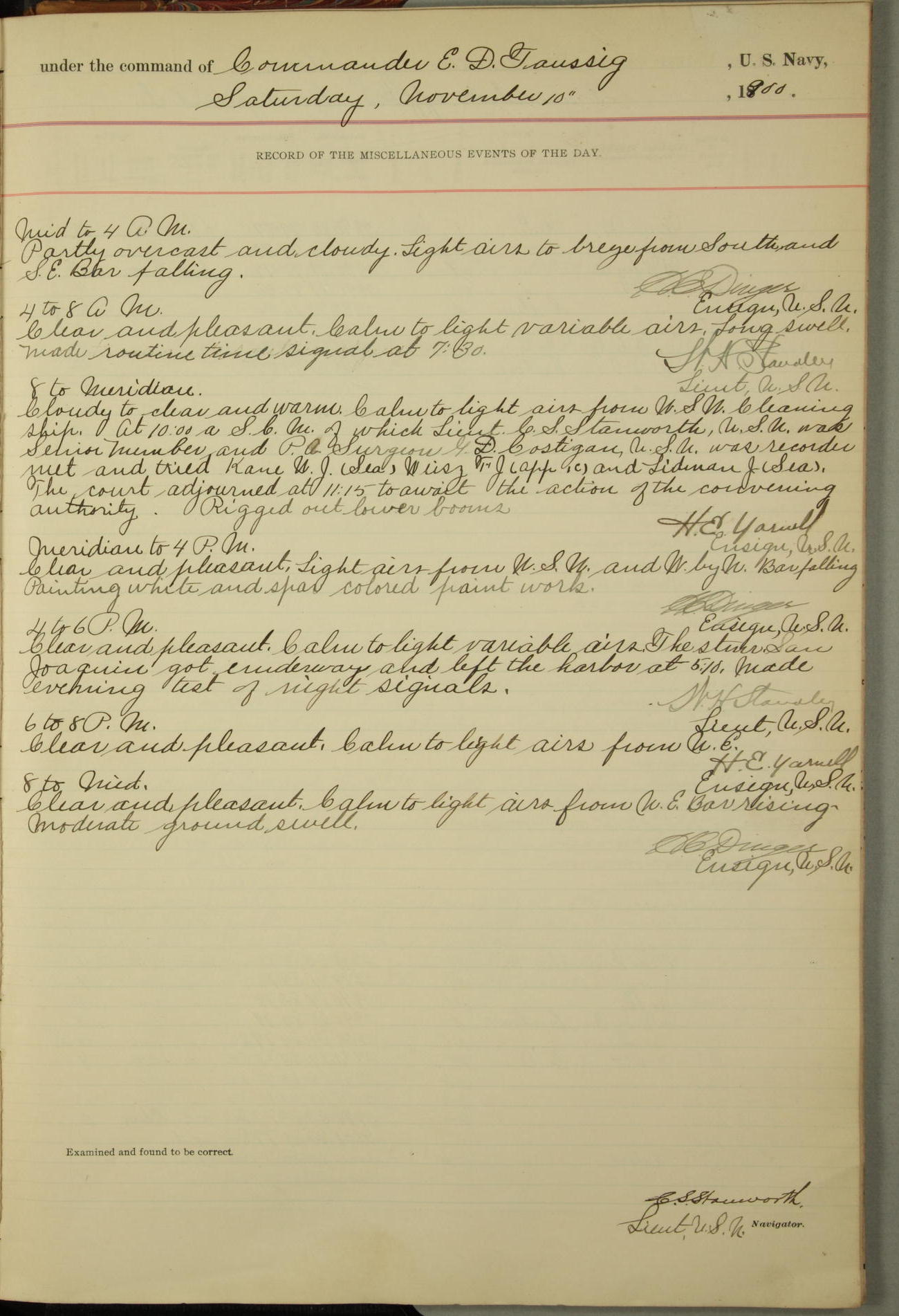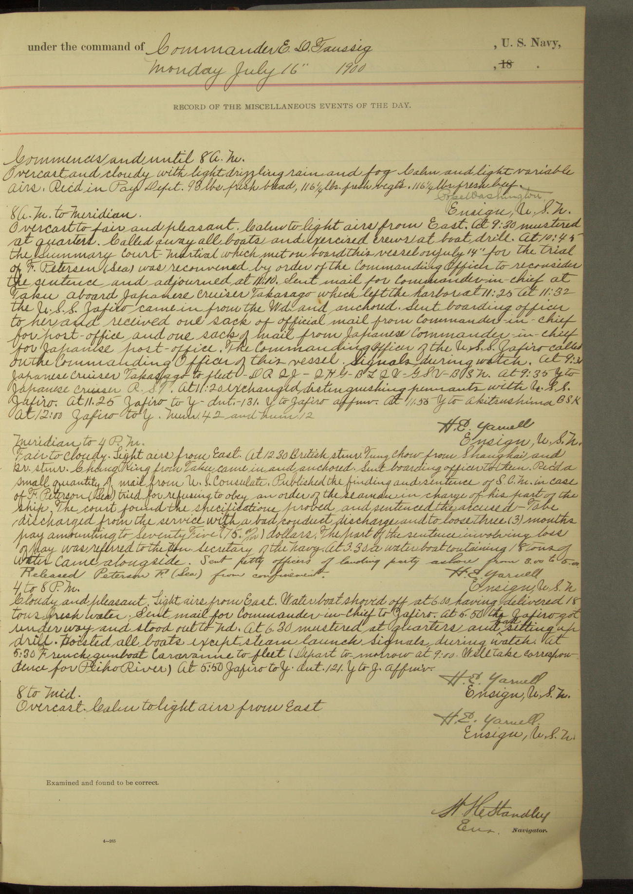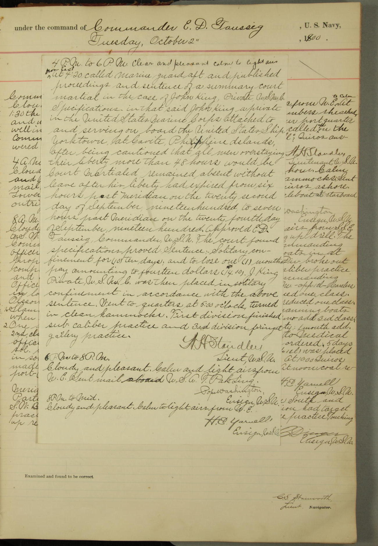 At 10.00am the Summary Court Martial, of which Lieutenant Howard Gage, U.S. Navy, was senior member, met for the trial of John Dowd, Second-class Fireman, U.S. Navy, and adjourned at 11.00am to await the action of the convening authority.