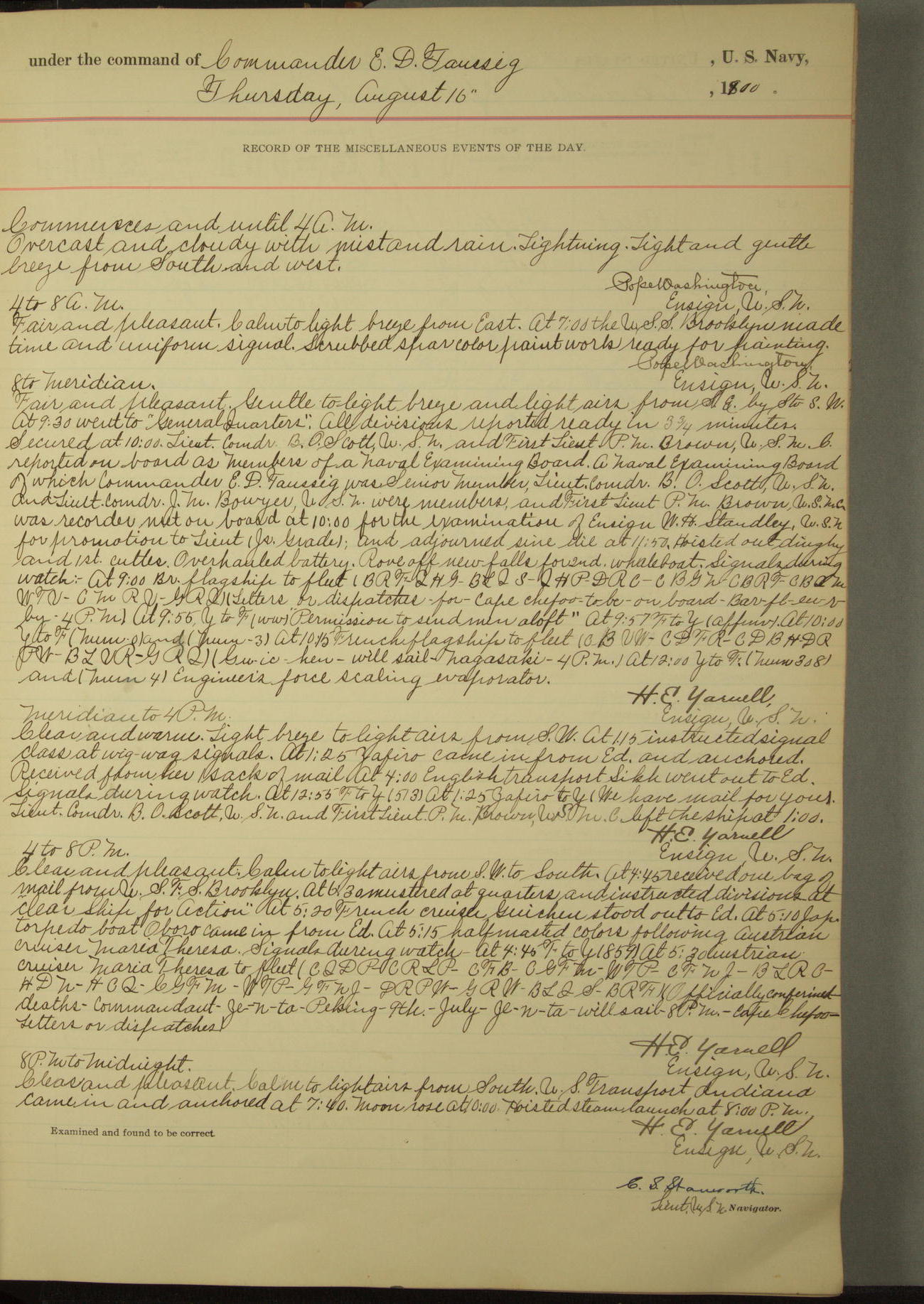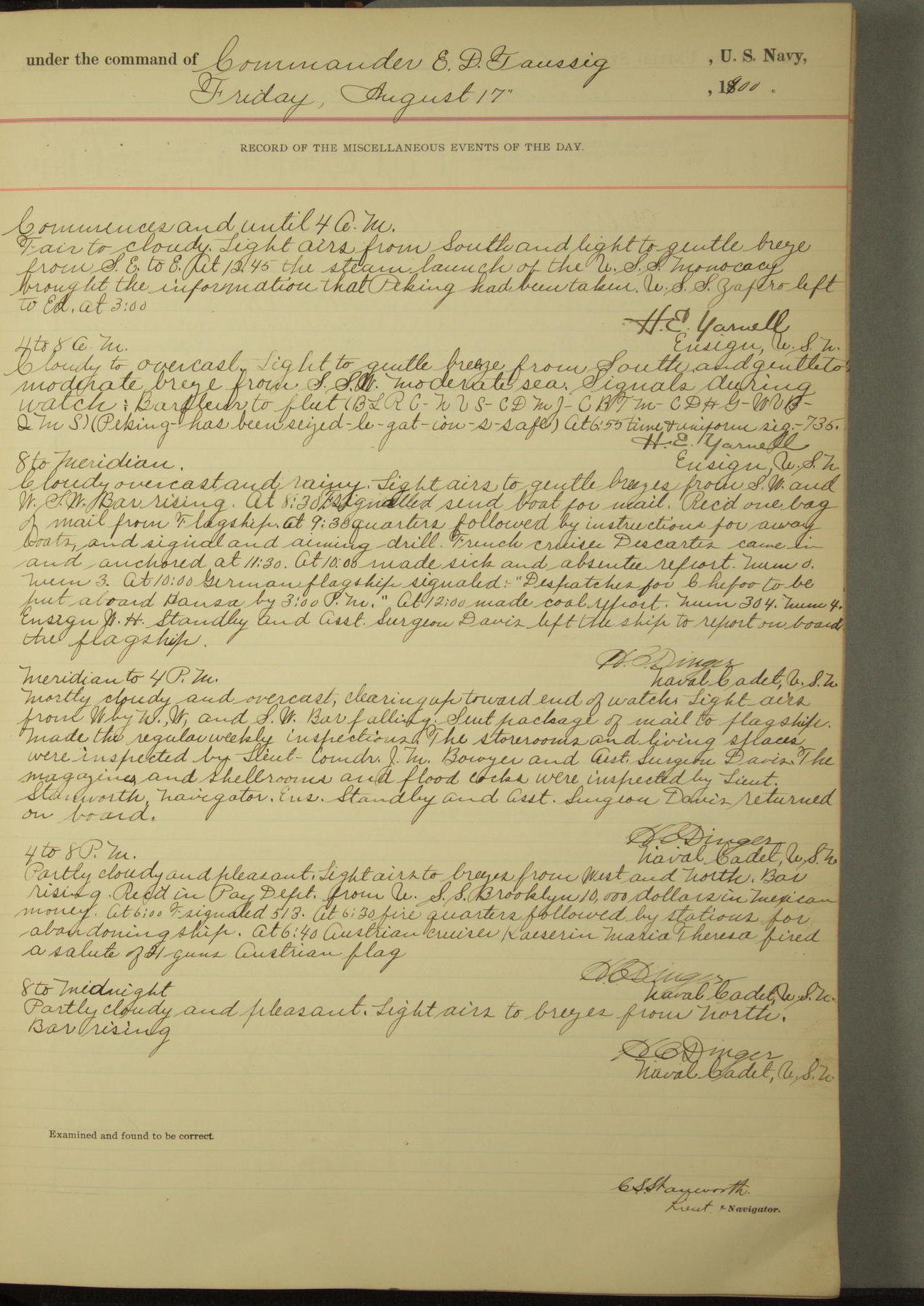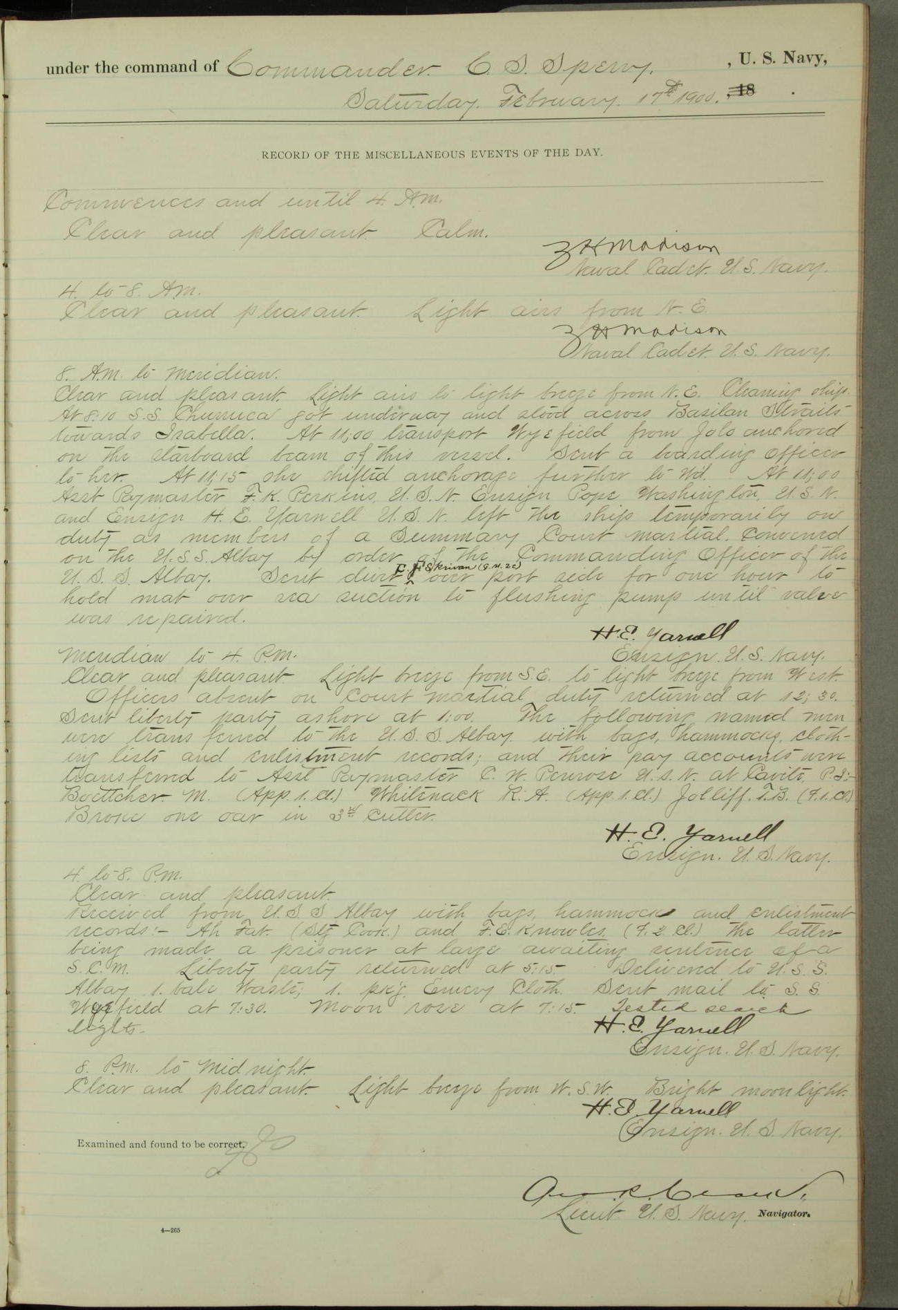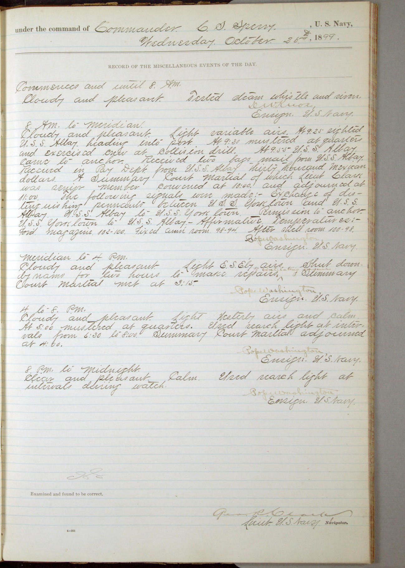 At 10.00am the Summary Court Martial, of which Lieutenant Howard Gage, U.S. Navy, was senior member, met for the trial of John Dowd, Second-class Fireman, U.S. Navy, and adjourned at 11.00am to await the action of the convening authority.