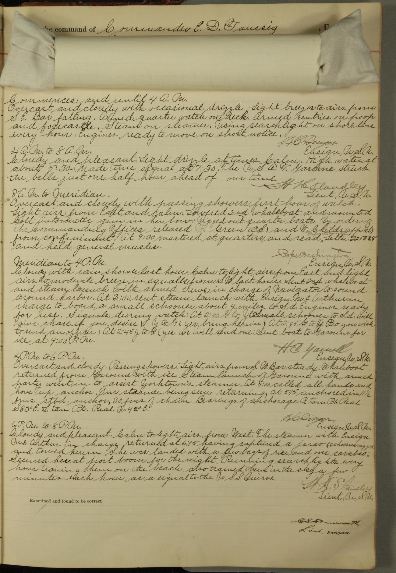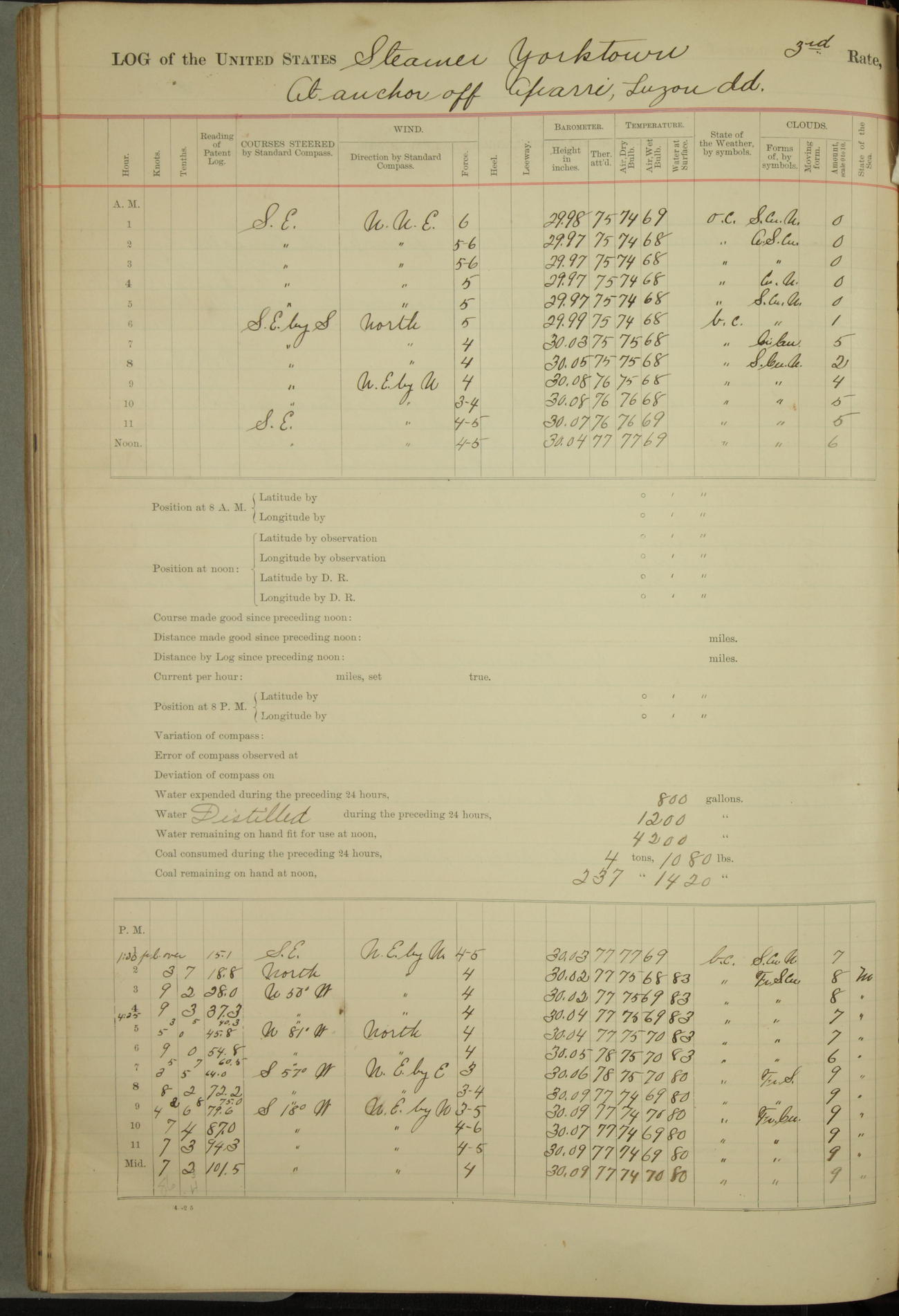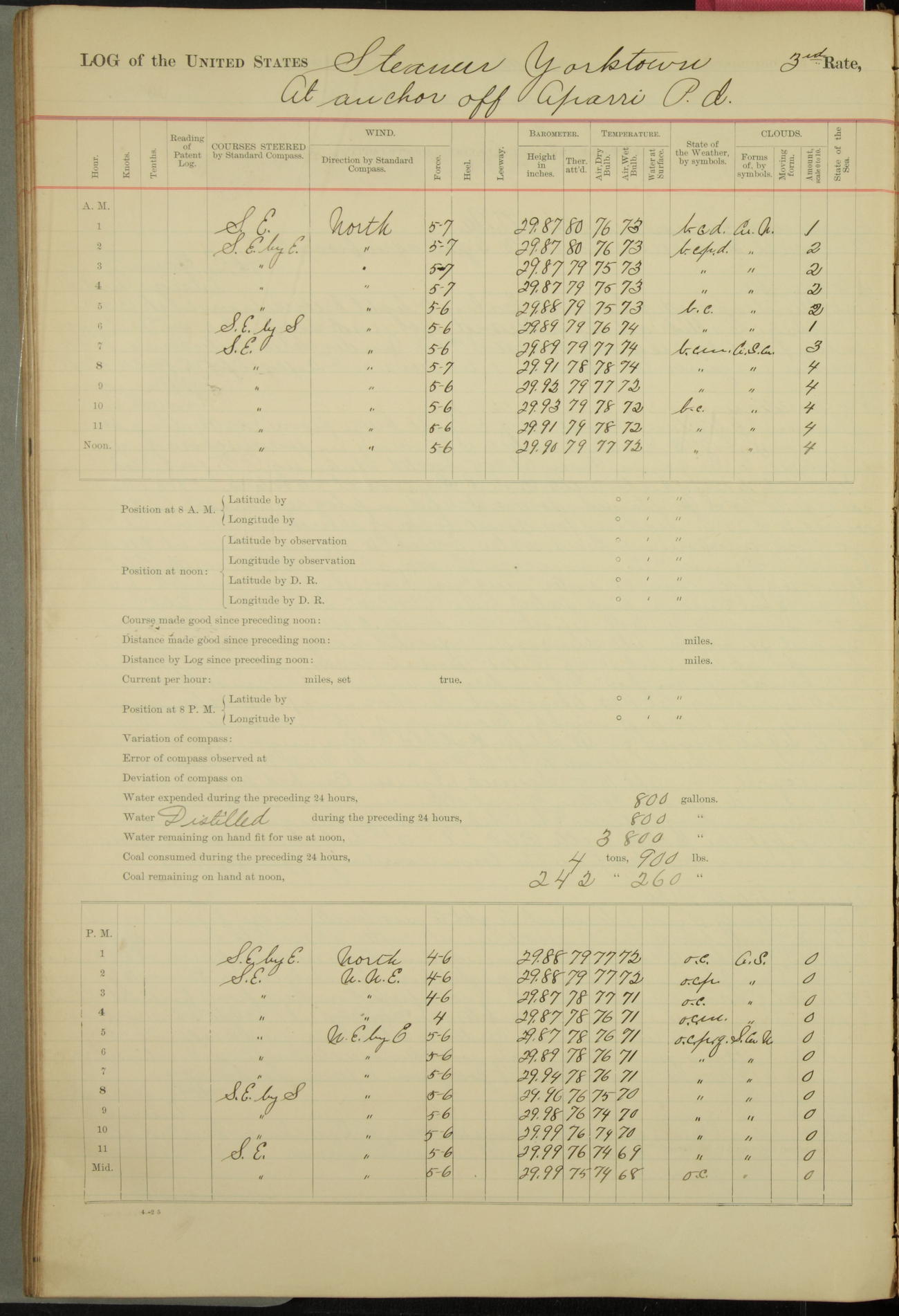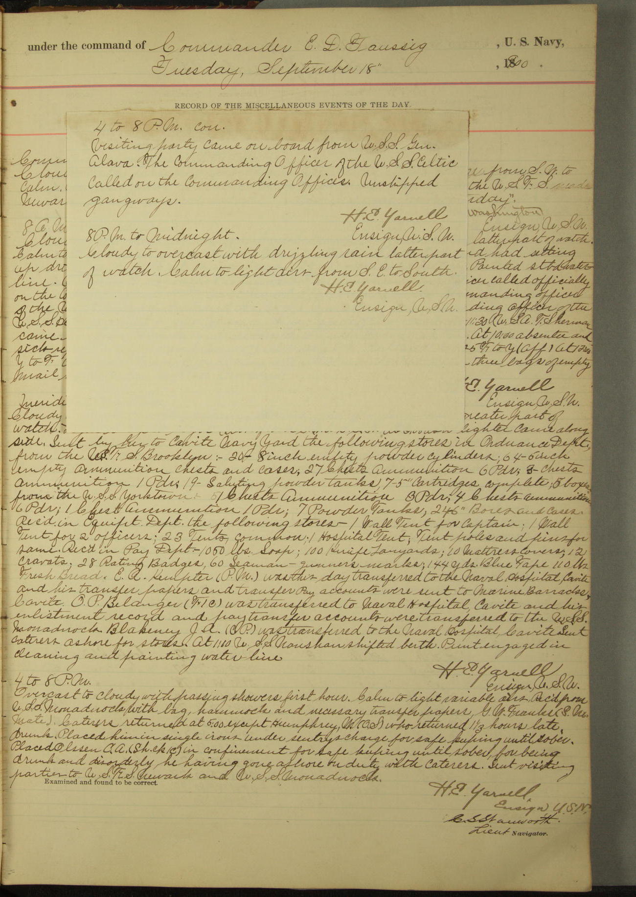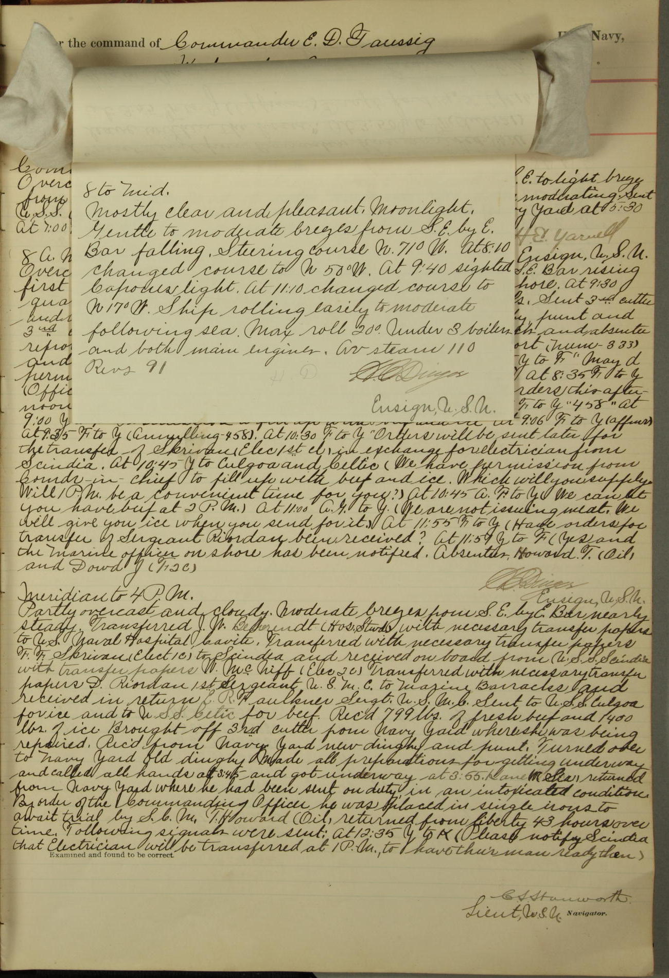 Absentees same as at morning quarters, with exception of W.H. Rynders, Coxswain.