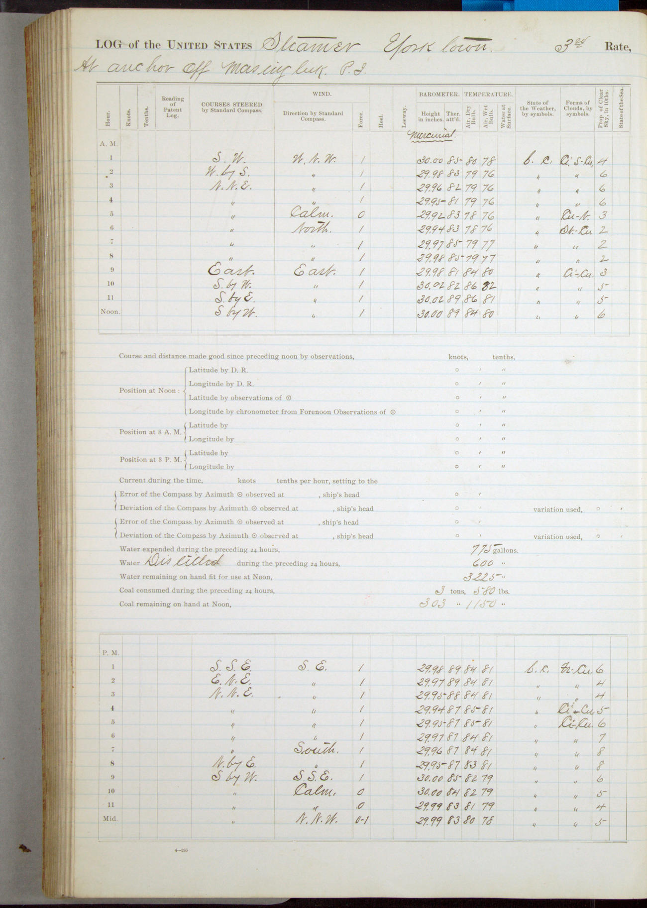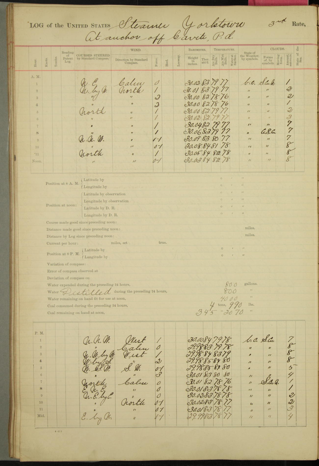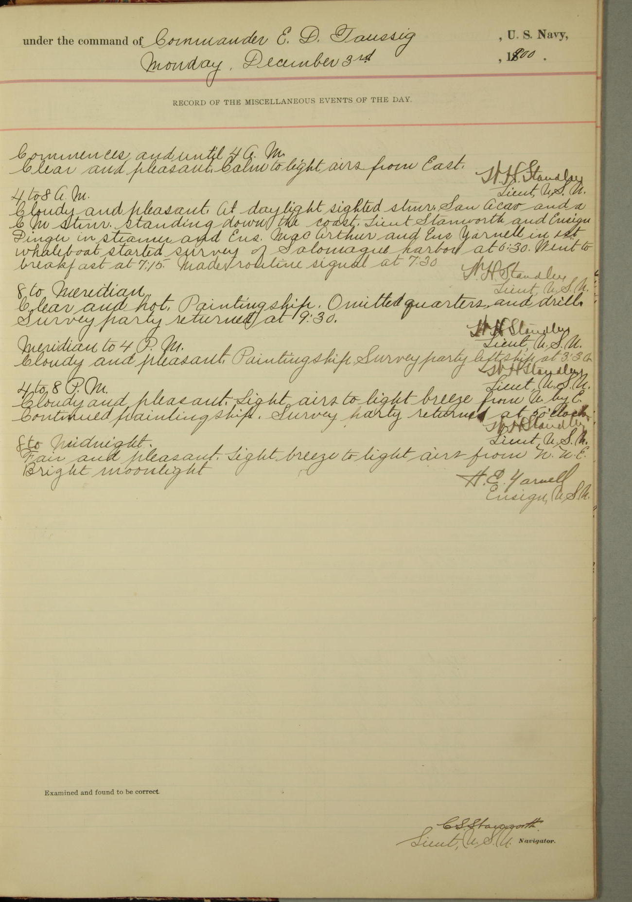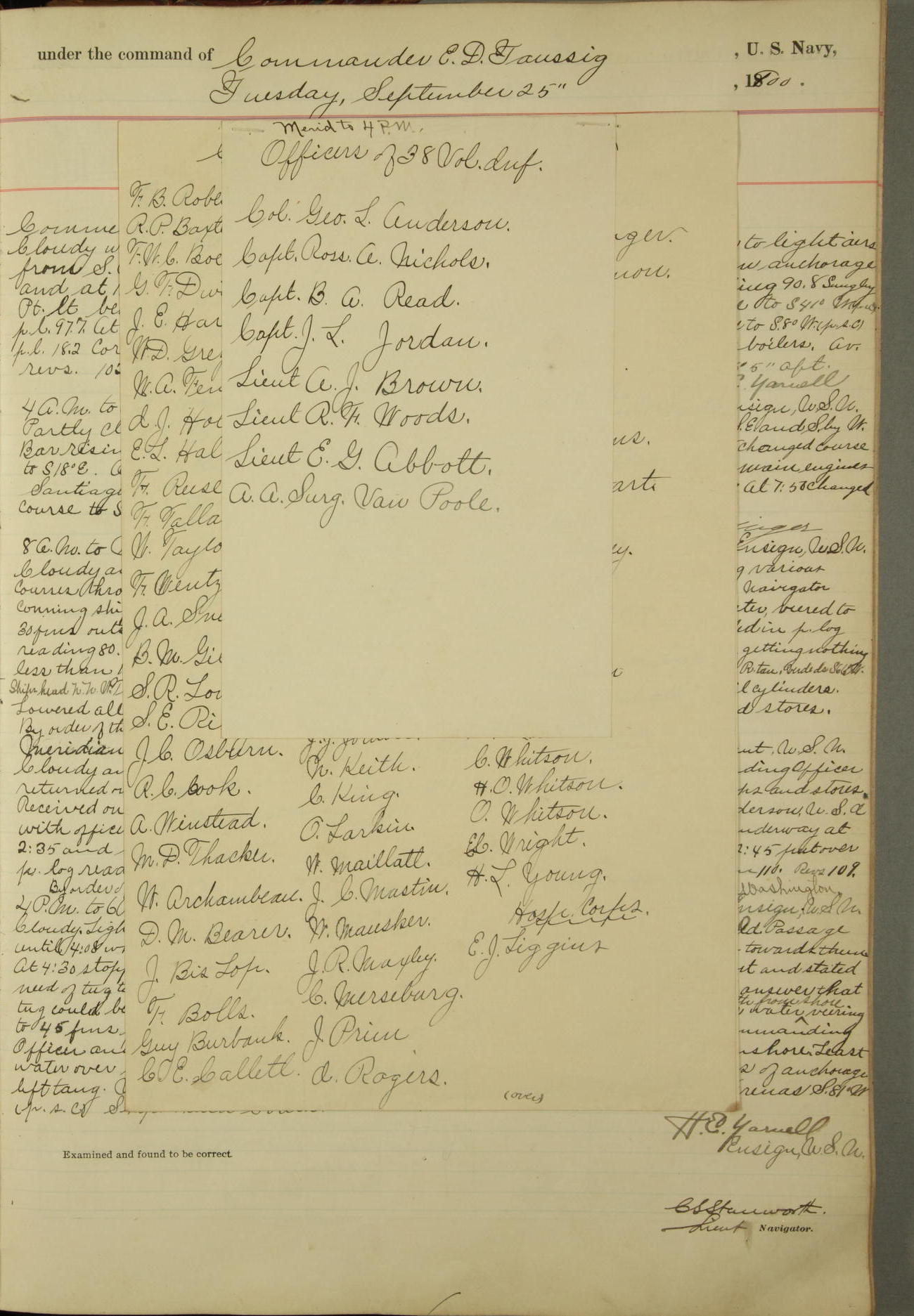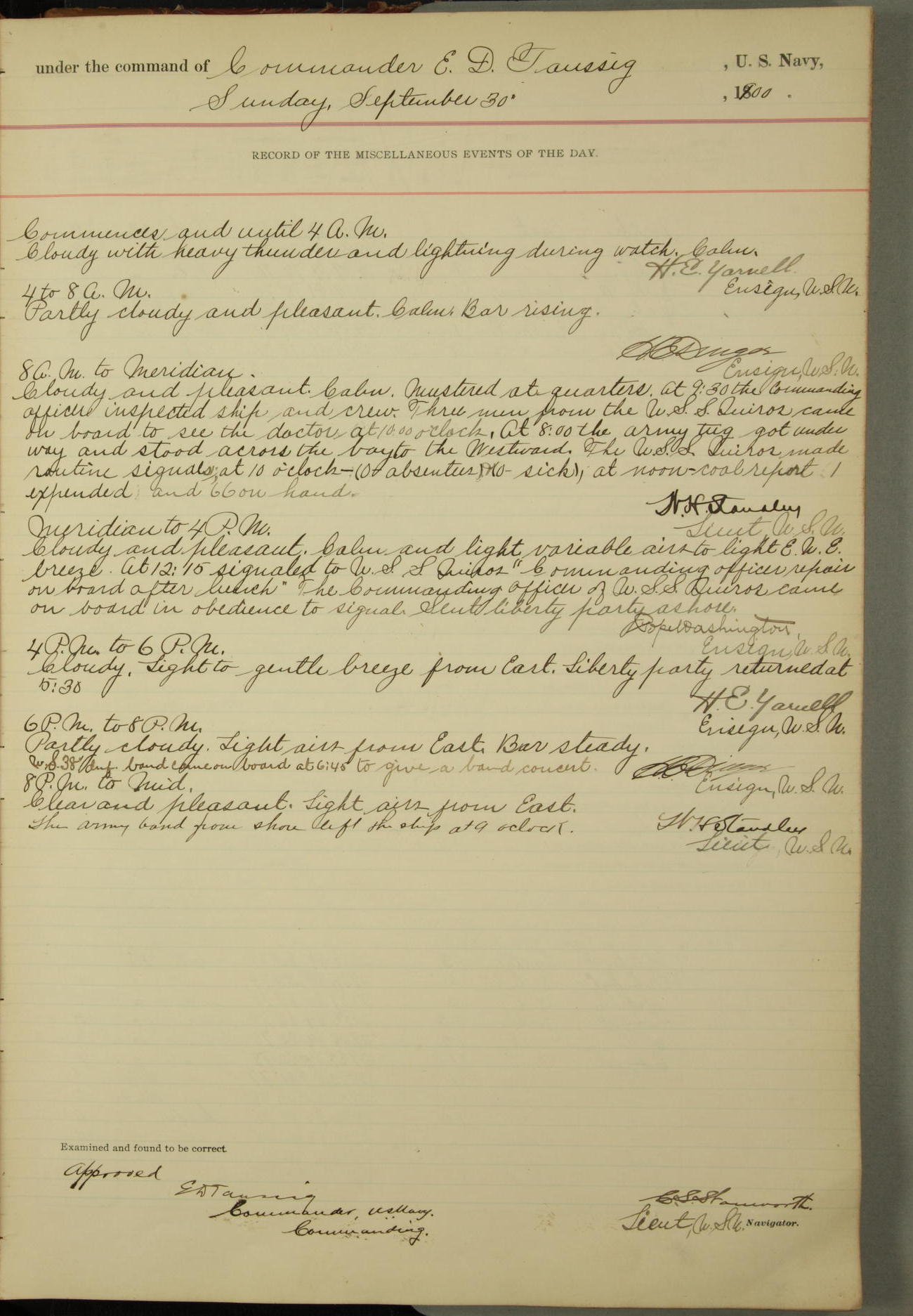 Absentees same as at morning quarters, with exception of W.H. Rynders, Coxswain.